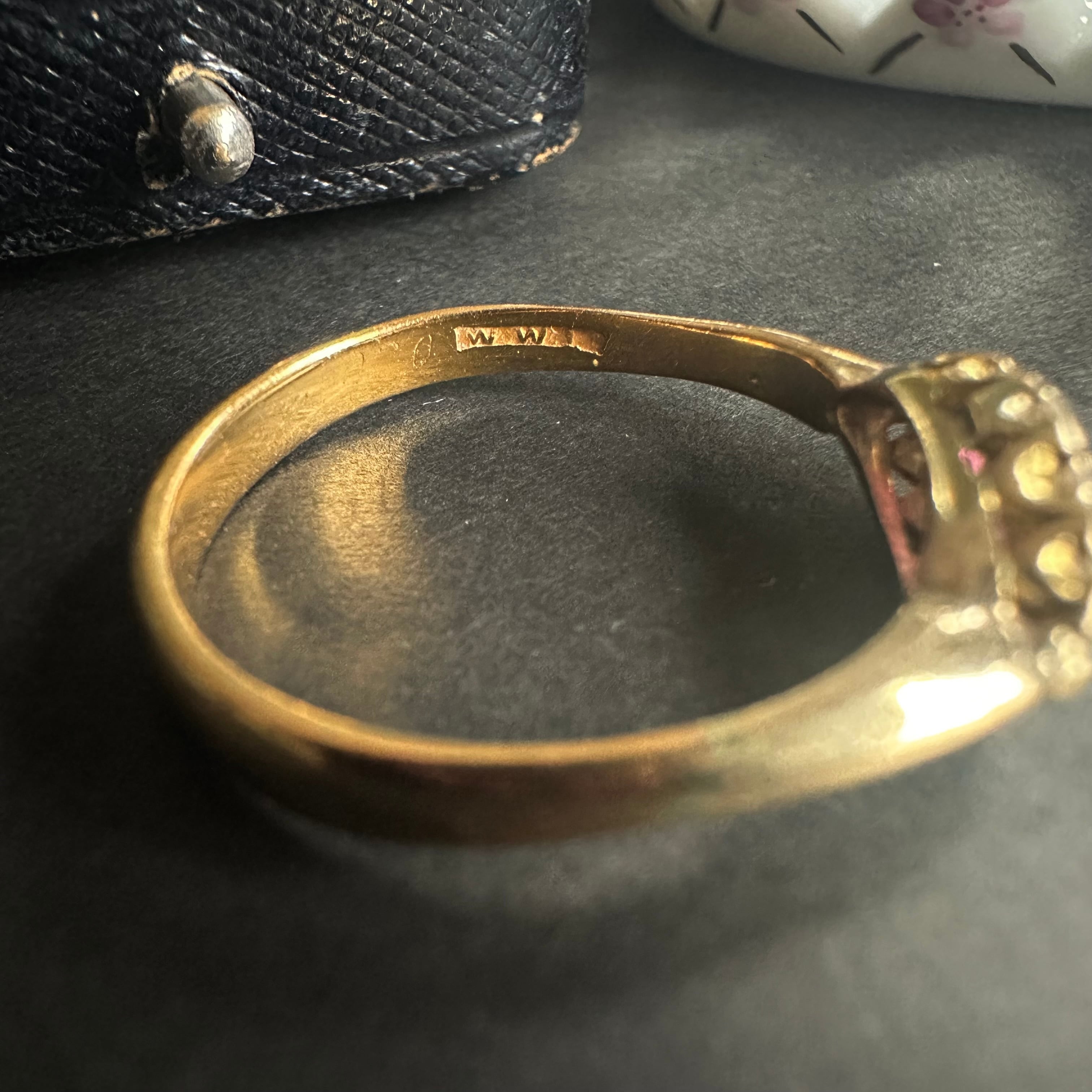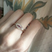 ダイヤモンドはオールドシングルカットで、現代の鋭いファセットとは違う“時間を経た光”を放ち、ルビーの色をより一層引き立てます。