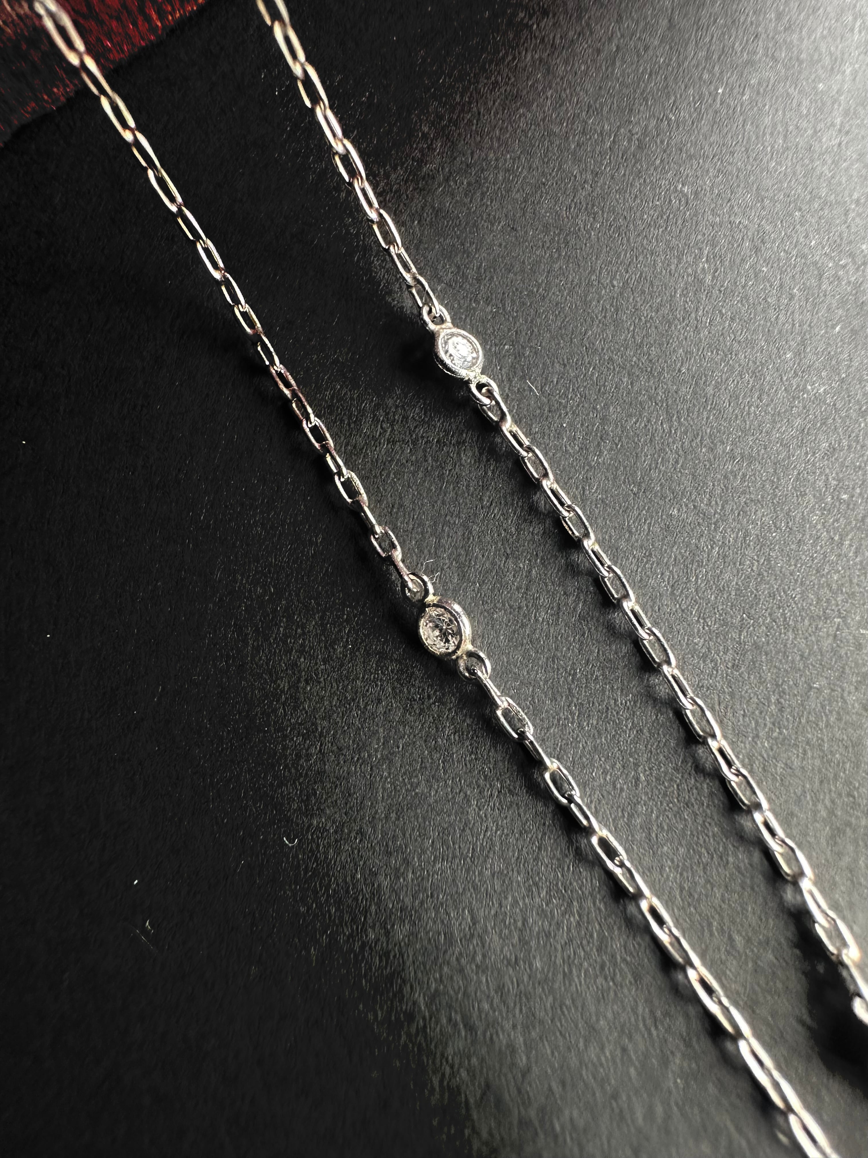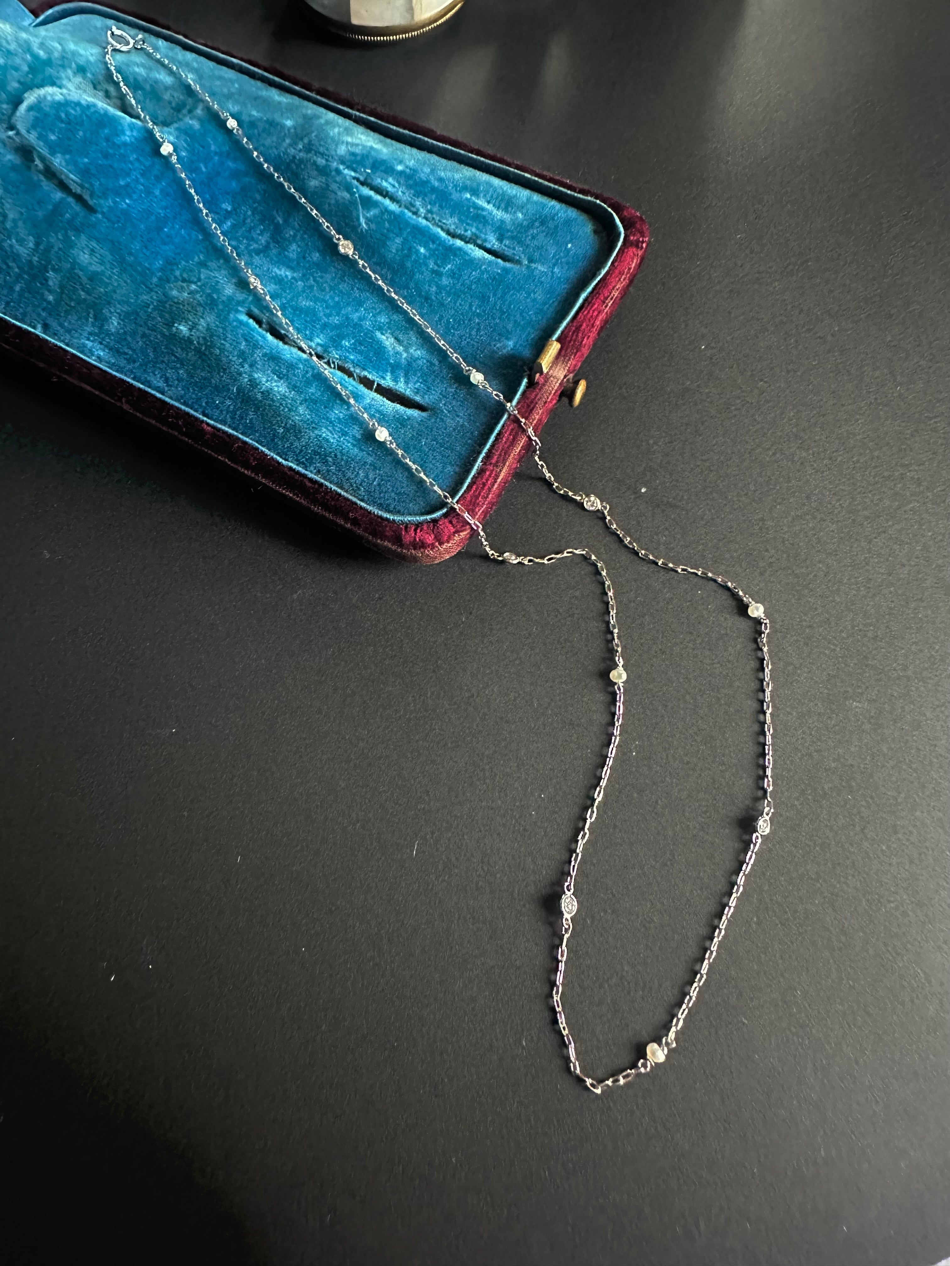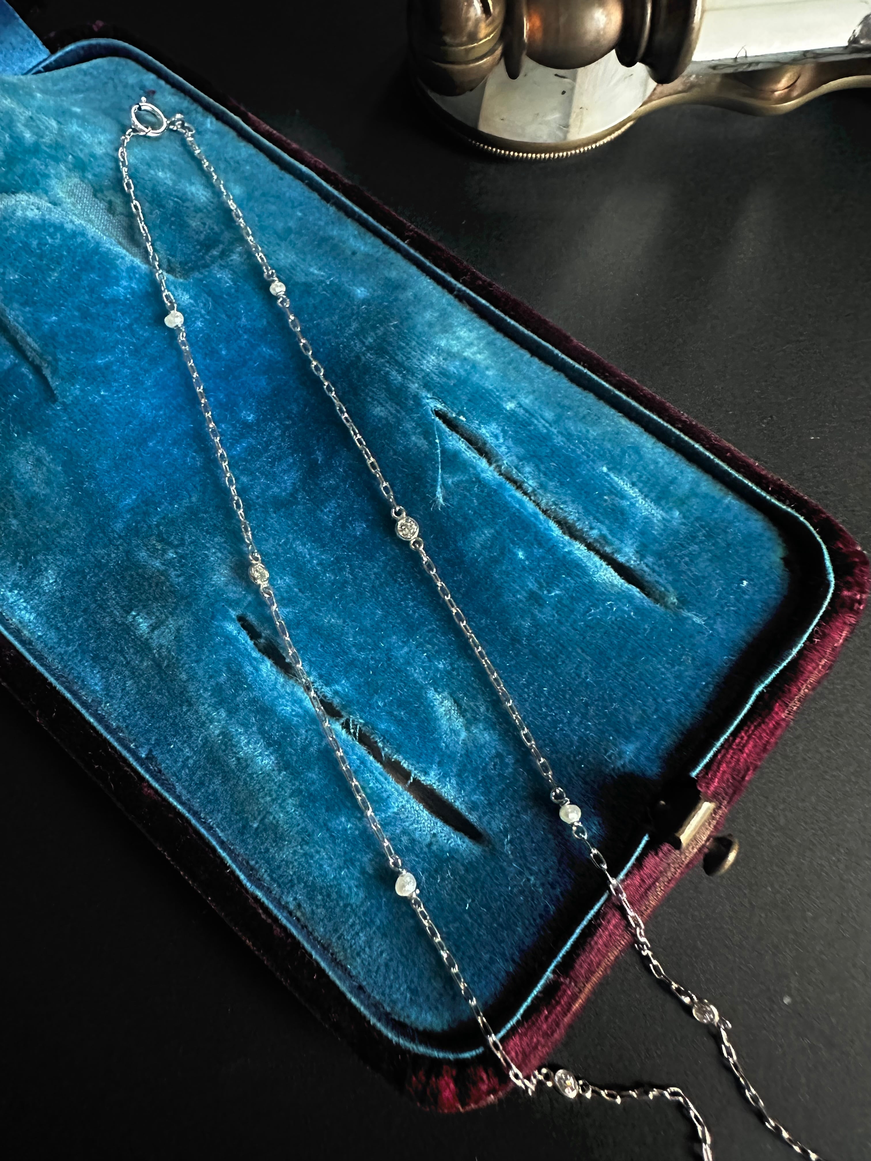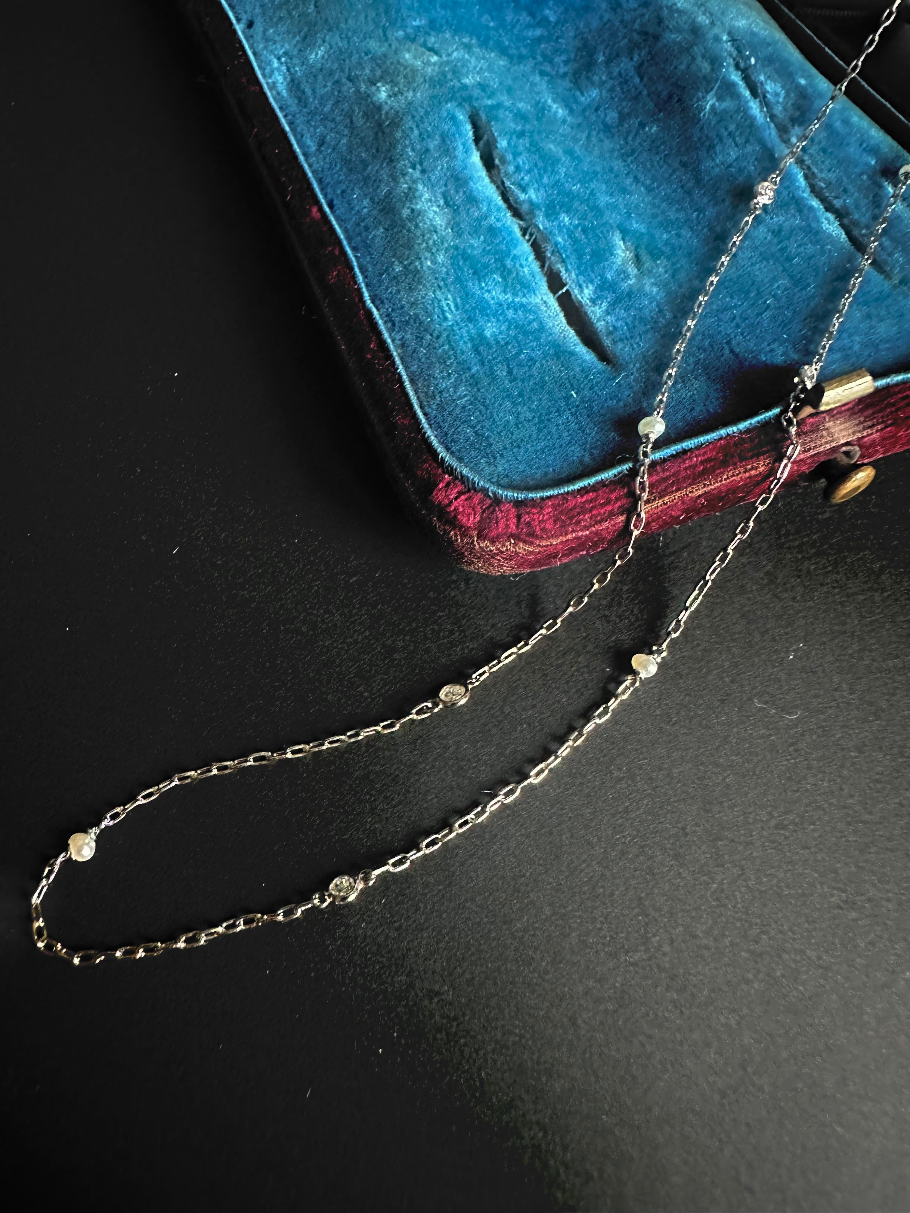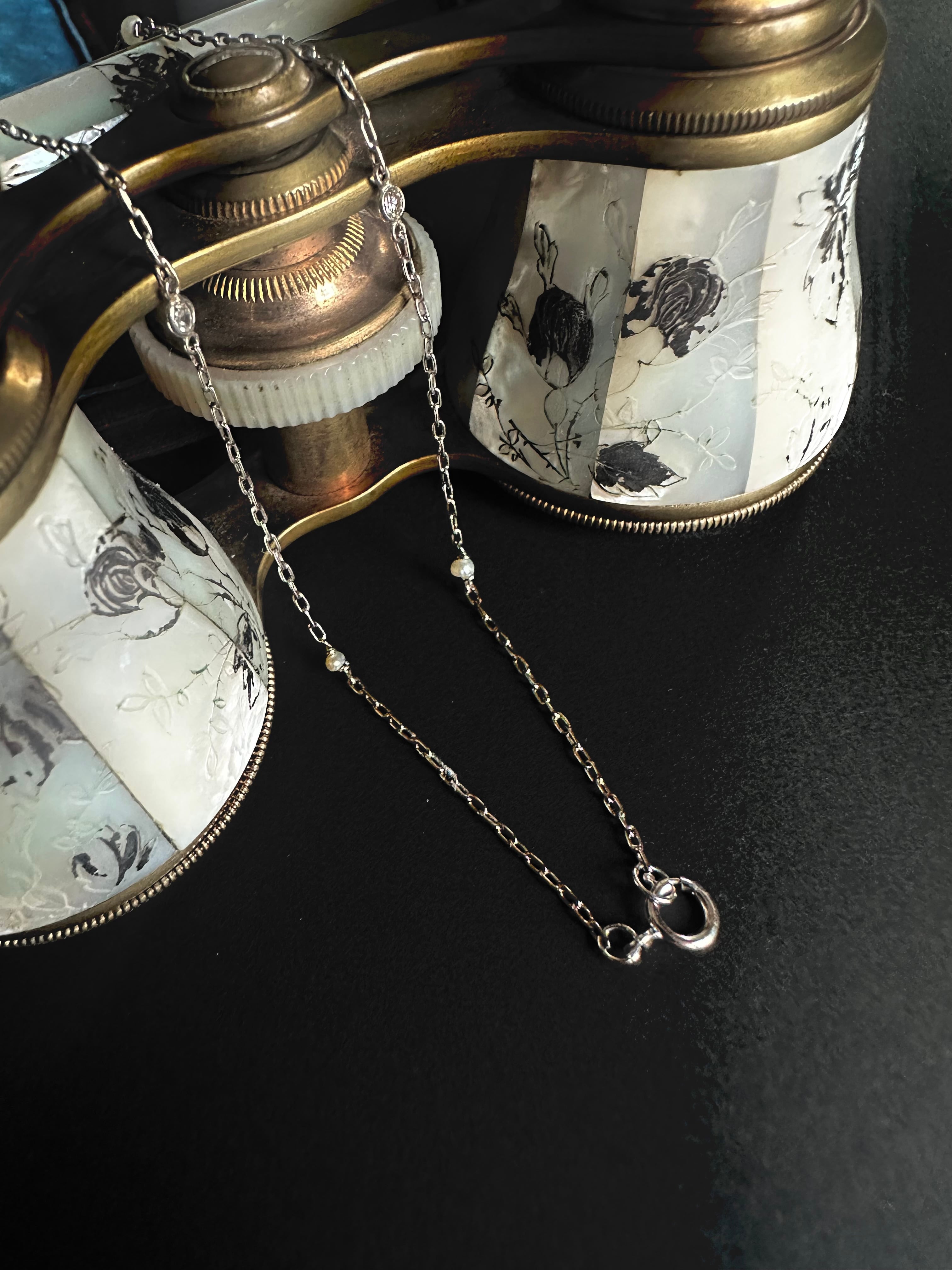 チェーンには、6石の小さなダイヤモンドと7粒のナチュラルパールが、ひとつずつ交互に配されています。