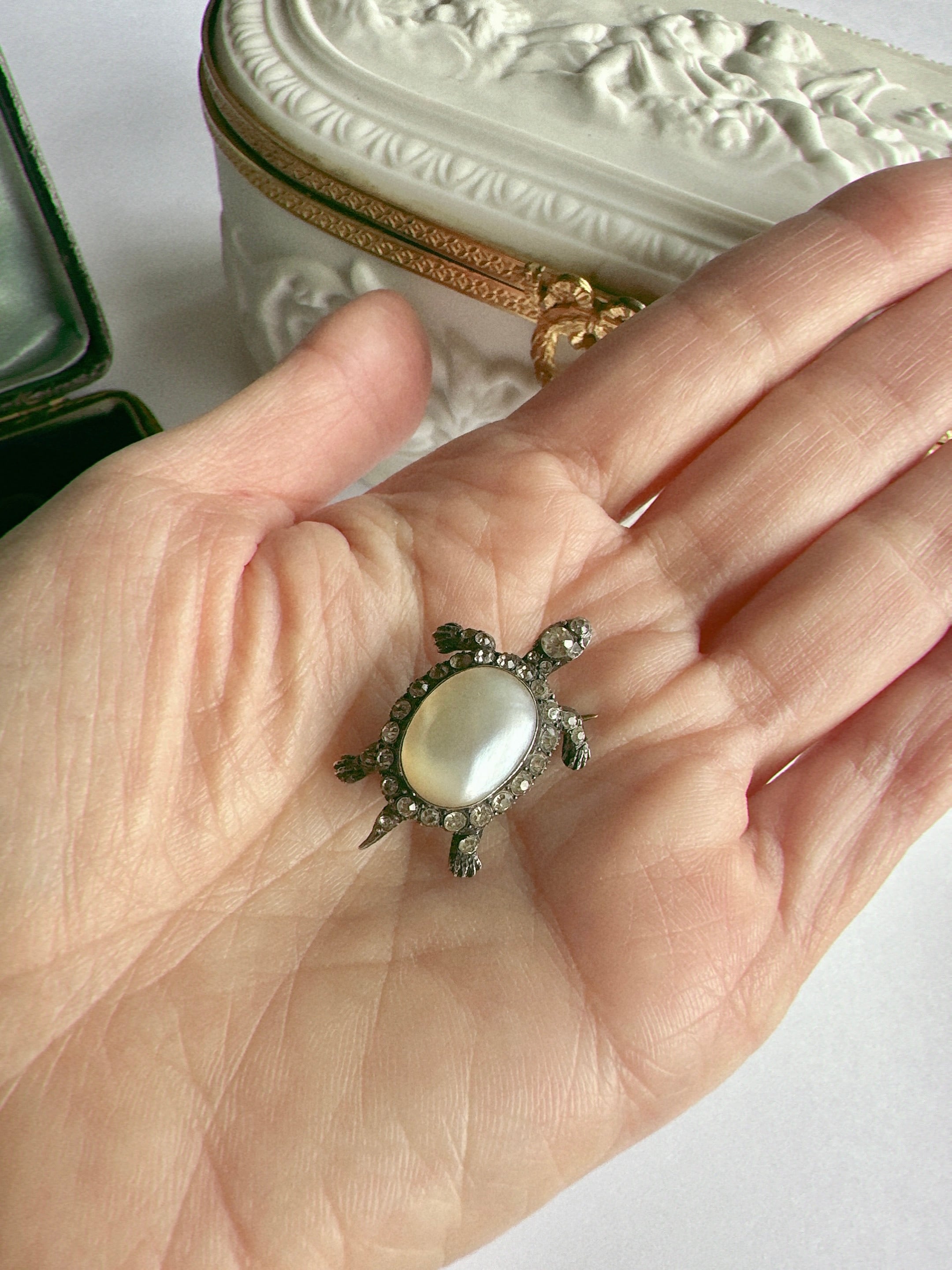 柔らかな光を宿すマザーオブパールの甲羅を中心に、周囲には繊細なペーストガラスが丁寧にセットされています。金属部分はシルバー製で、しっとりとした古銀の輝きが、ヴィクトリアンジュエリーならではの趣を醸しています。