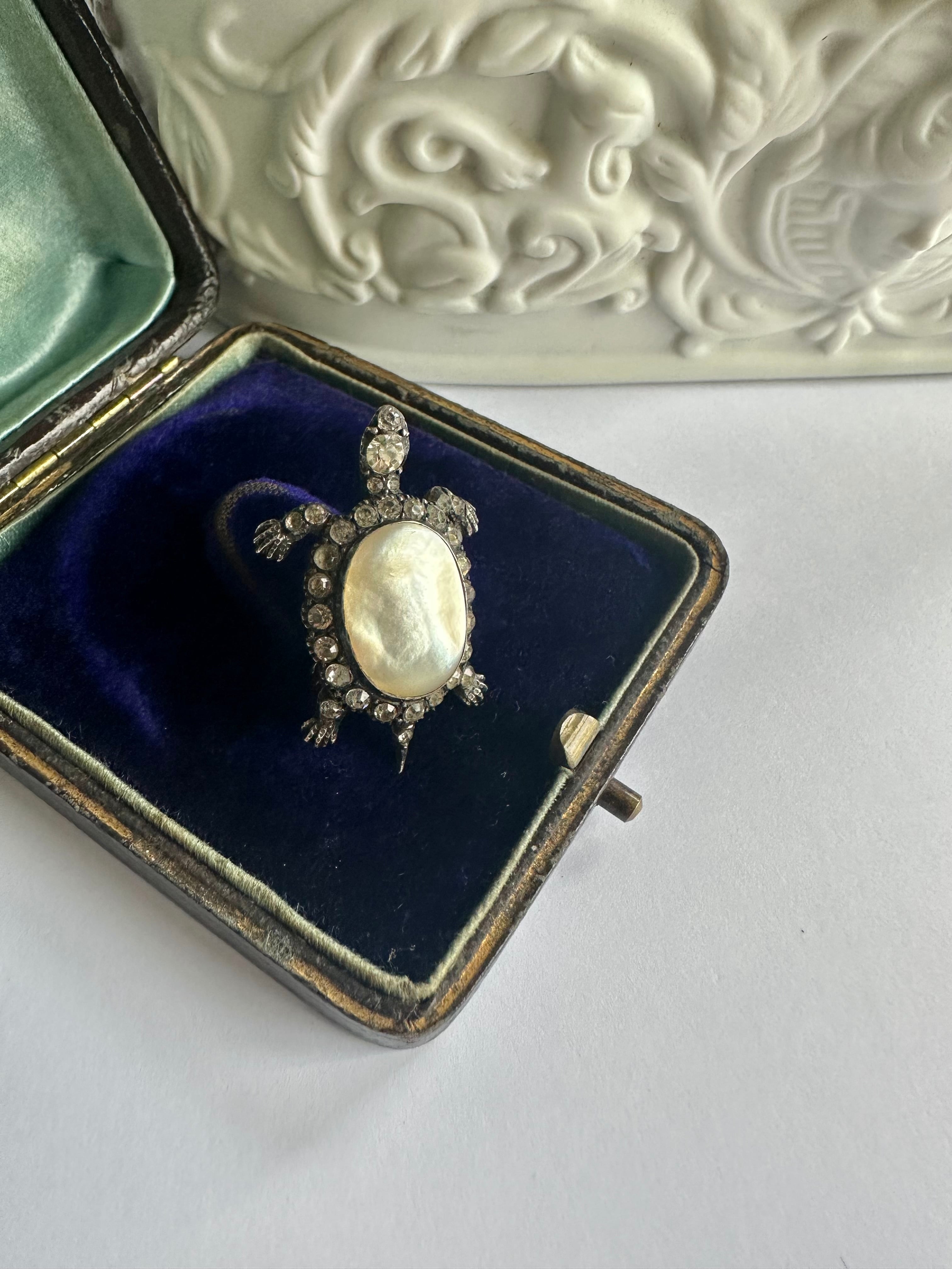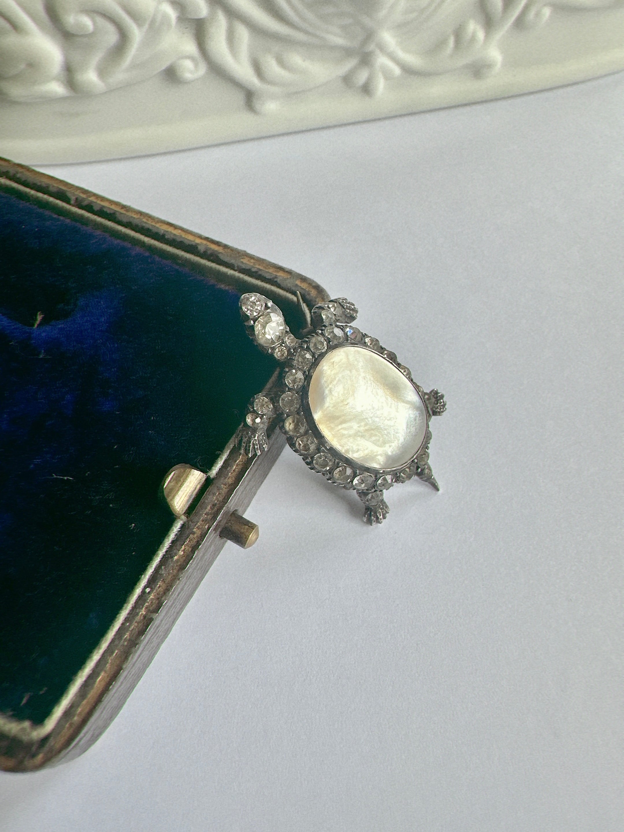 ヴィクトリアン期(1837–1901)は、自然や動物をモチーフとしたジュエリーが多く作られた時代。中でもタートルはゆっくりと着実に前へ進む姿から「安定」や「家庭の守護」を意味するとも言われ、贈り物としても人気の高いモチーフでした。