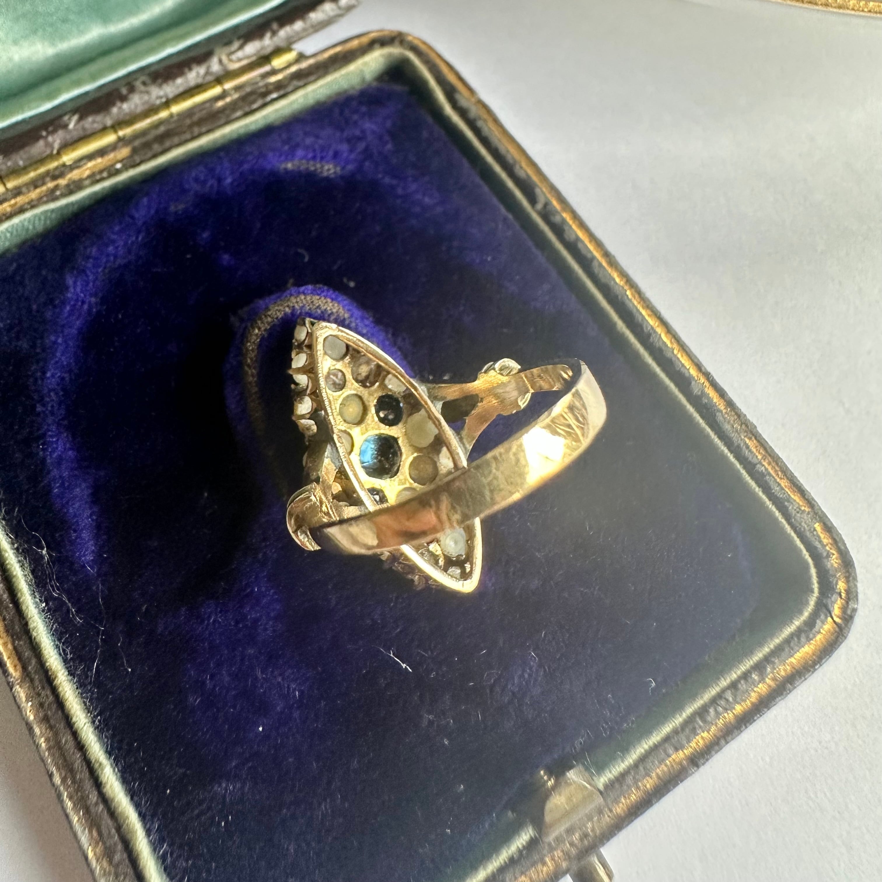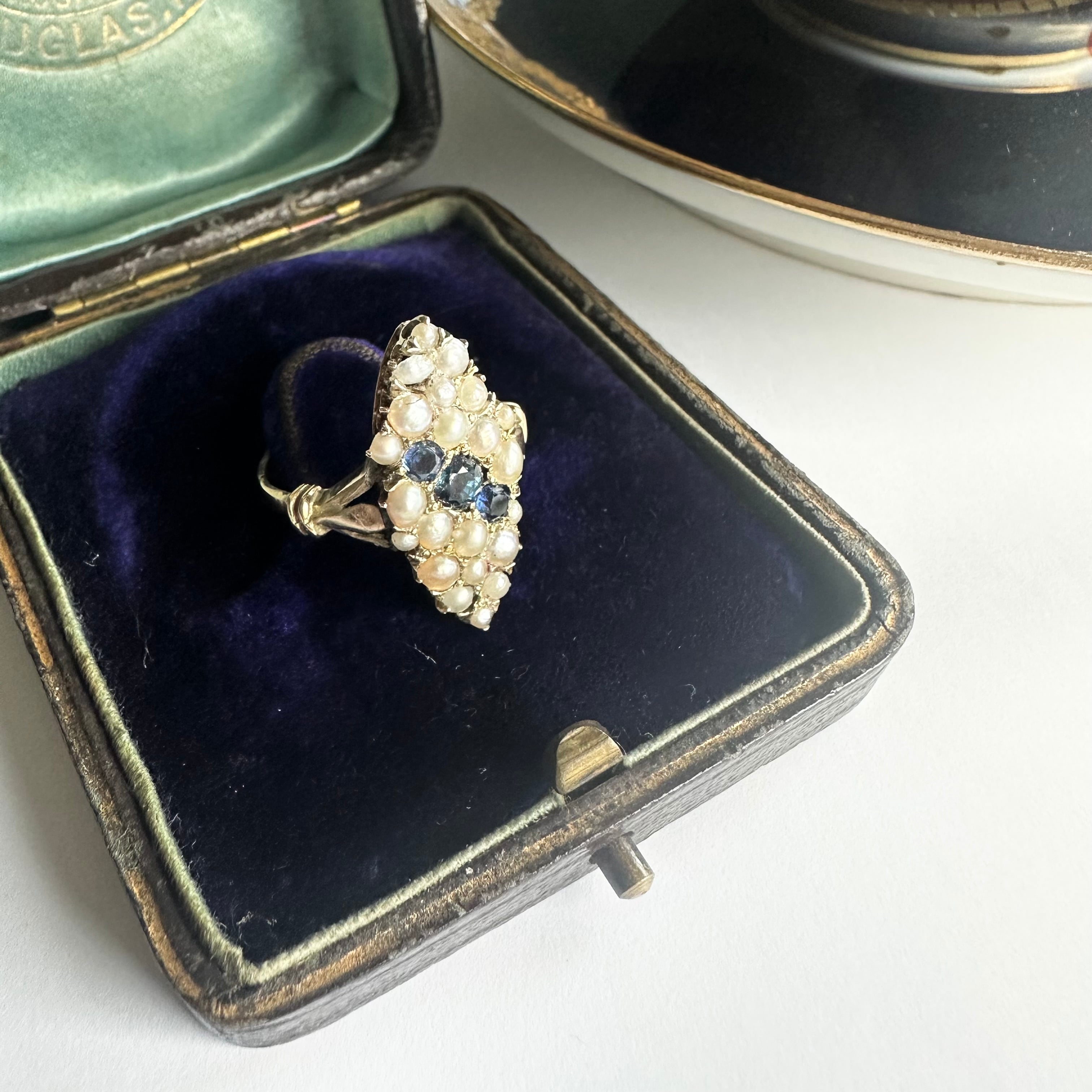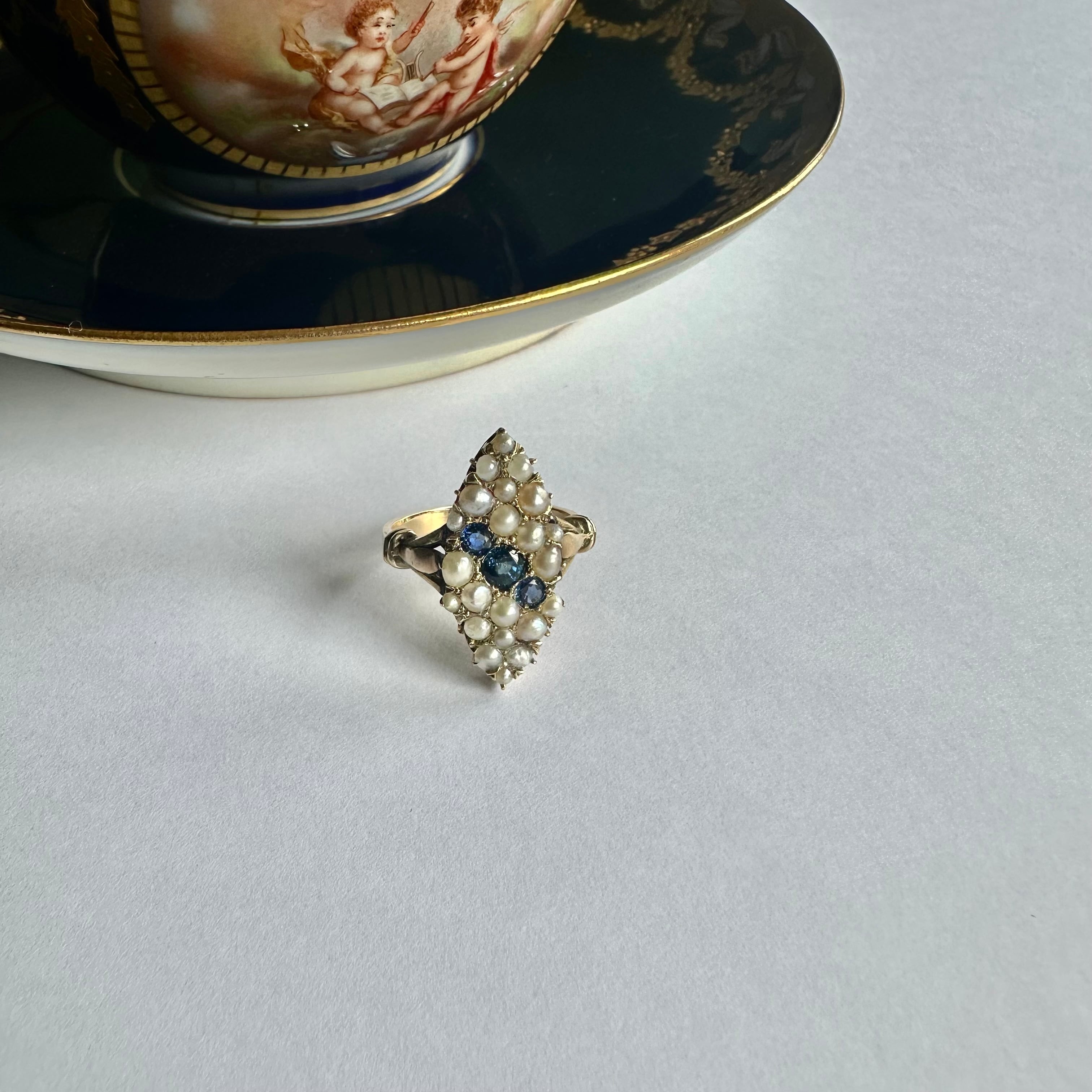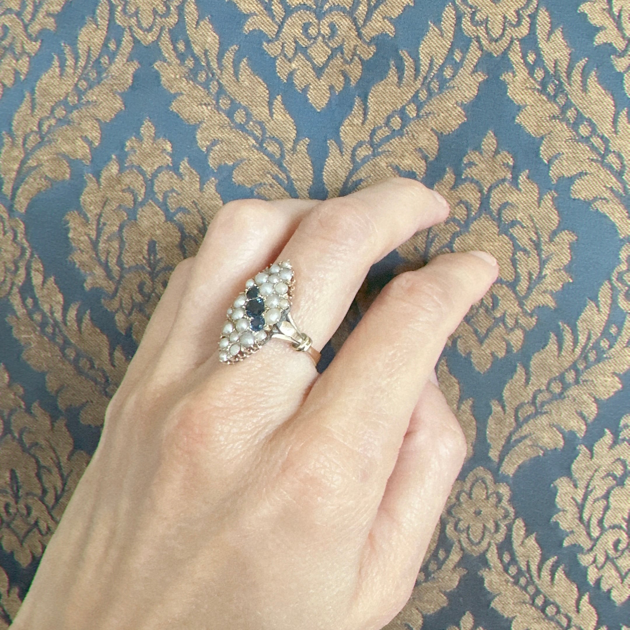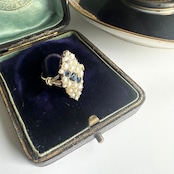 ※ 100年以上前の古いお品になりますので、経年によるアンティーク品特有の微小なスレなどルーペで見てわかる程度にございます。サファイアはルーペでのぞくと内包物はありますが、肉眼でみえるものではなく、瑞々しい輝きを楽しませてくれます。目立つキズやカケはございません。パールは150年ほどの時間の経過があり、ルーペでのぞくとキズなどありますが、肉眼で気になるような大きなキズなどはございません。