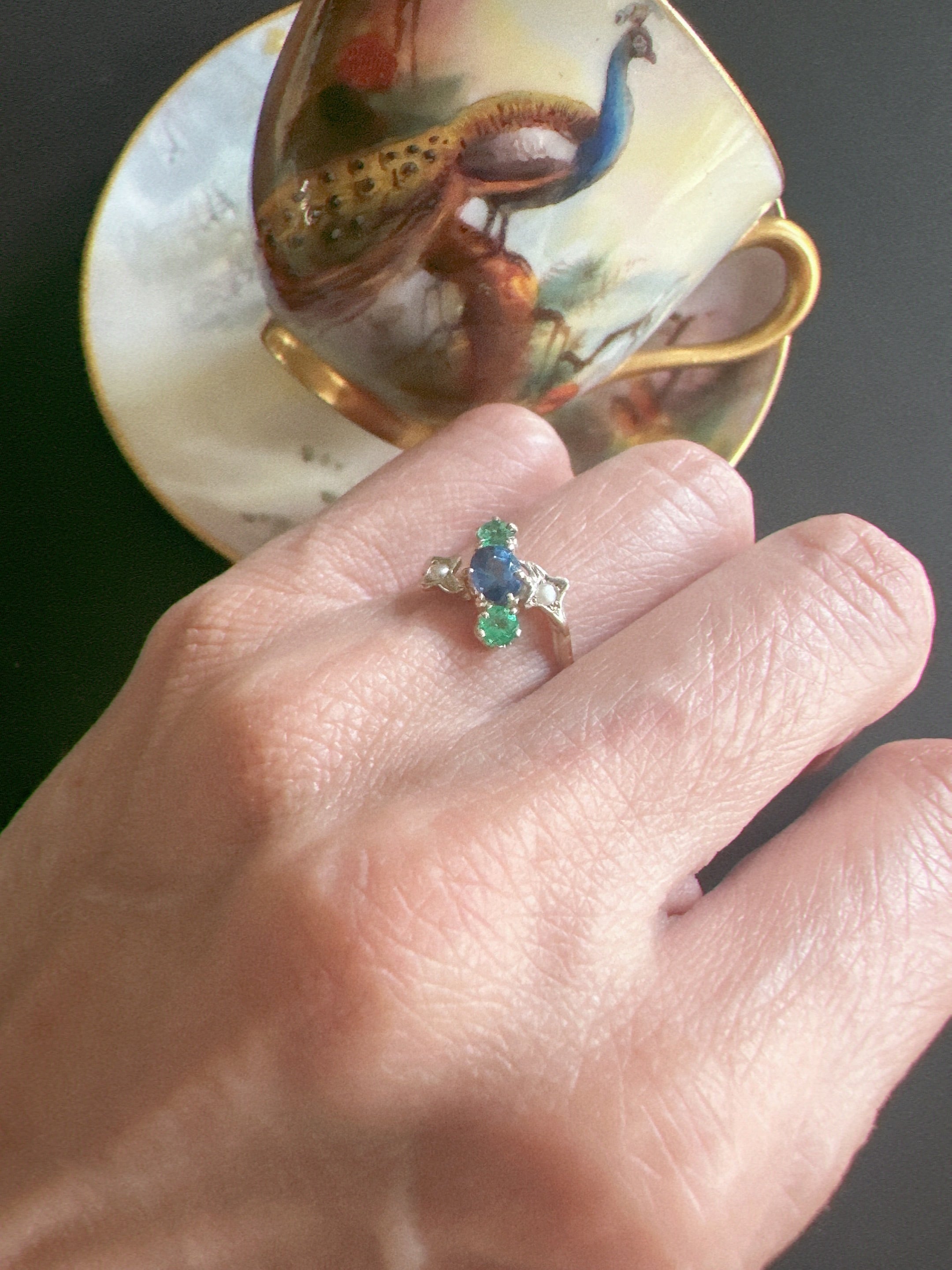 中央のオーバルカットサファイアは深い青に少し温かみを含み、両脇のラウンドカットのエメラルドが鮮やかな緑の光で寄り添います。