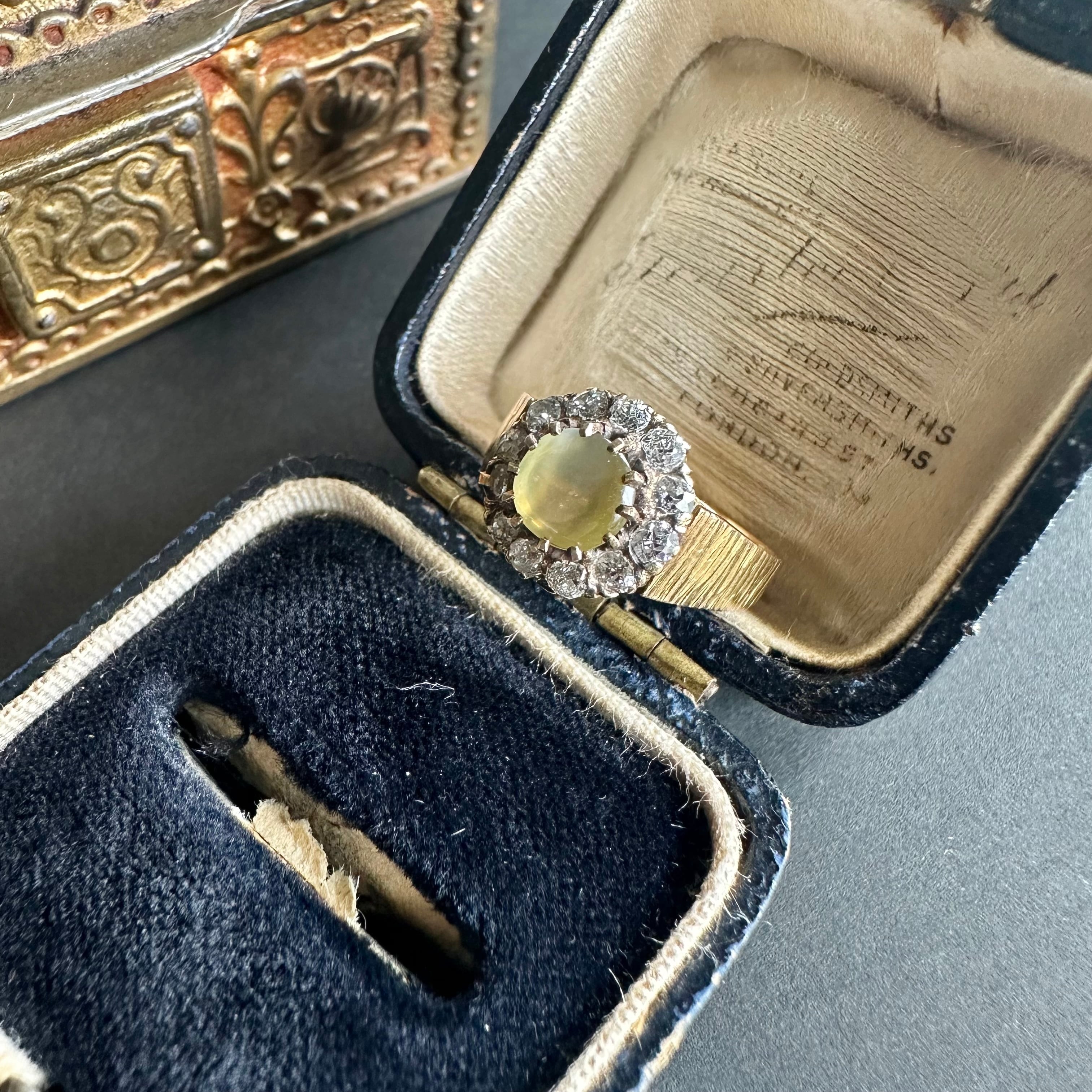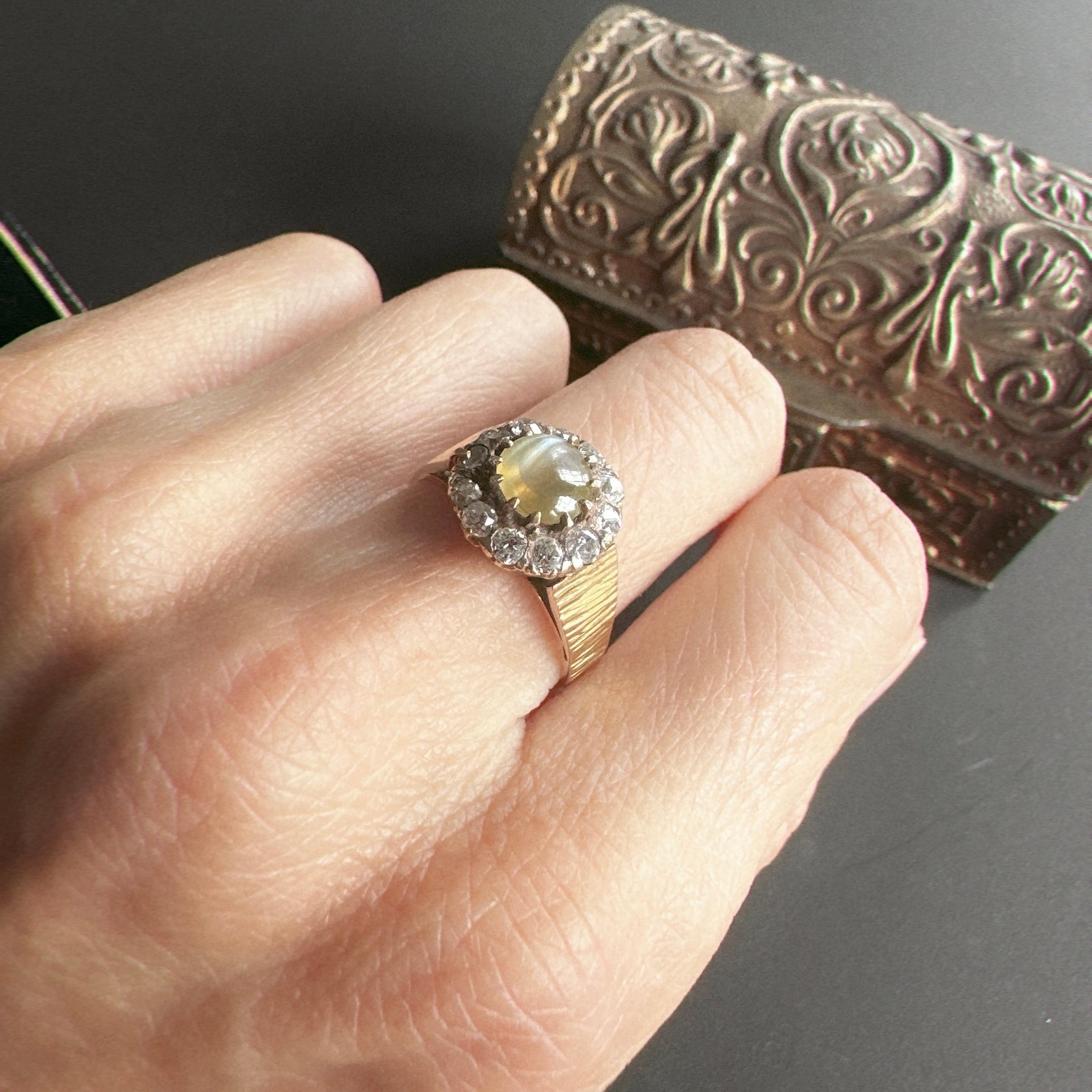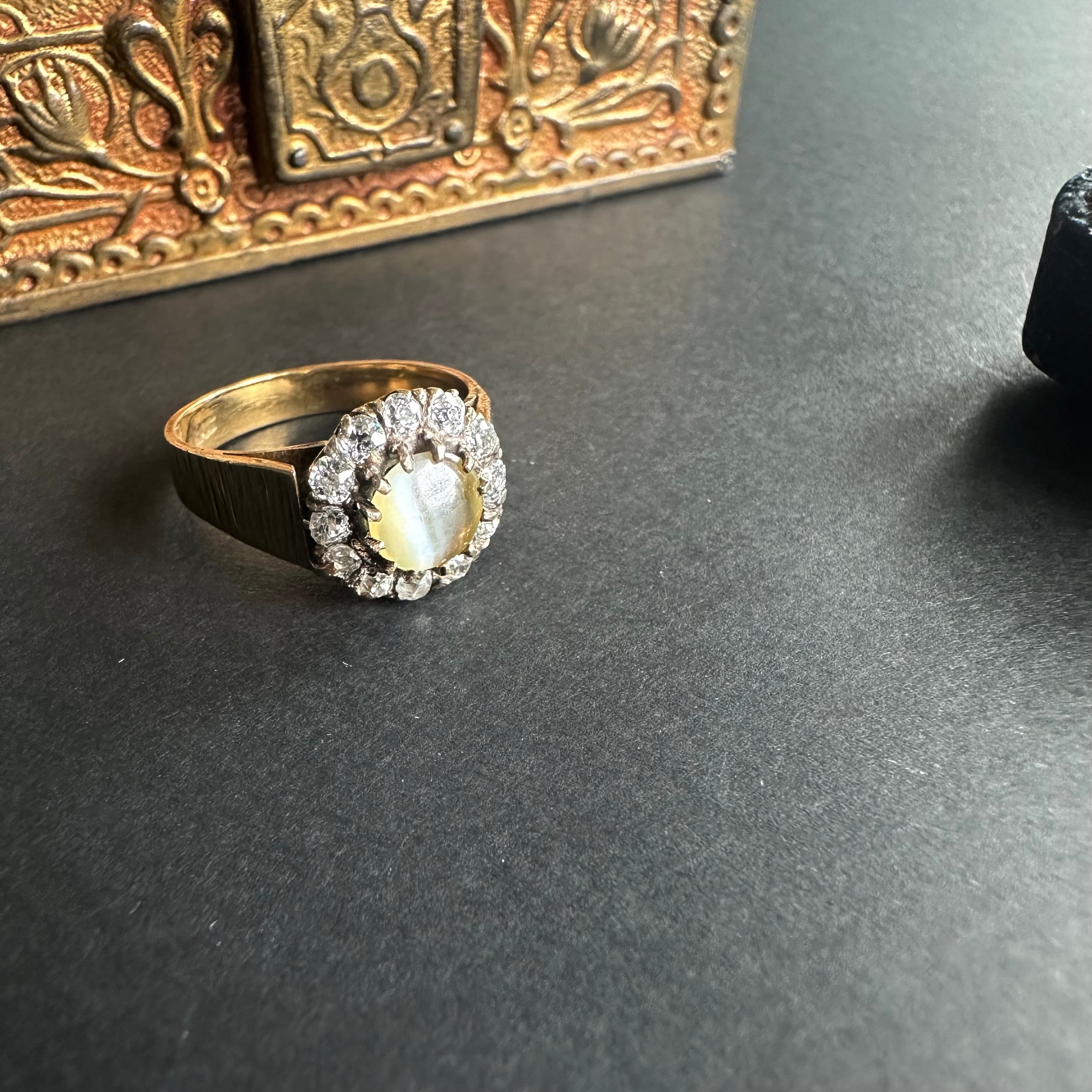 中央にそっと光るクリソベリルキャッツアイを、オープンキュレットのゴツゴツとしたオールドマインカットダイヤモンドがぐるりと囲んだ、とても表情のあるリングです。