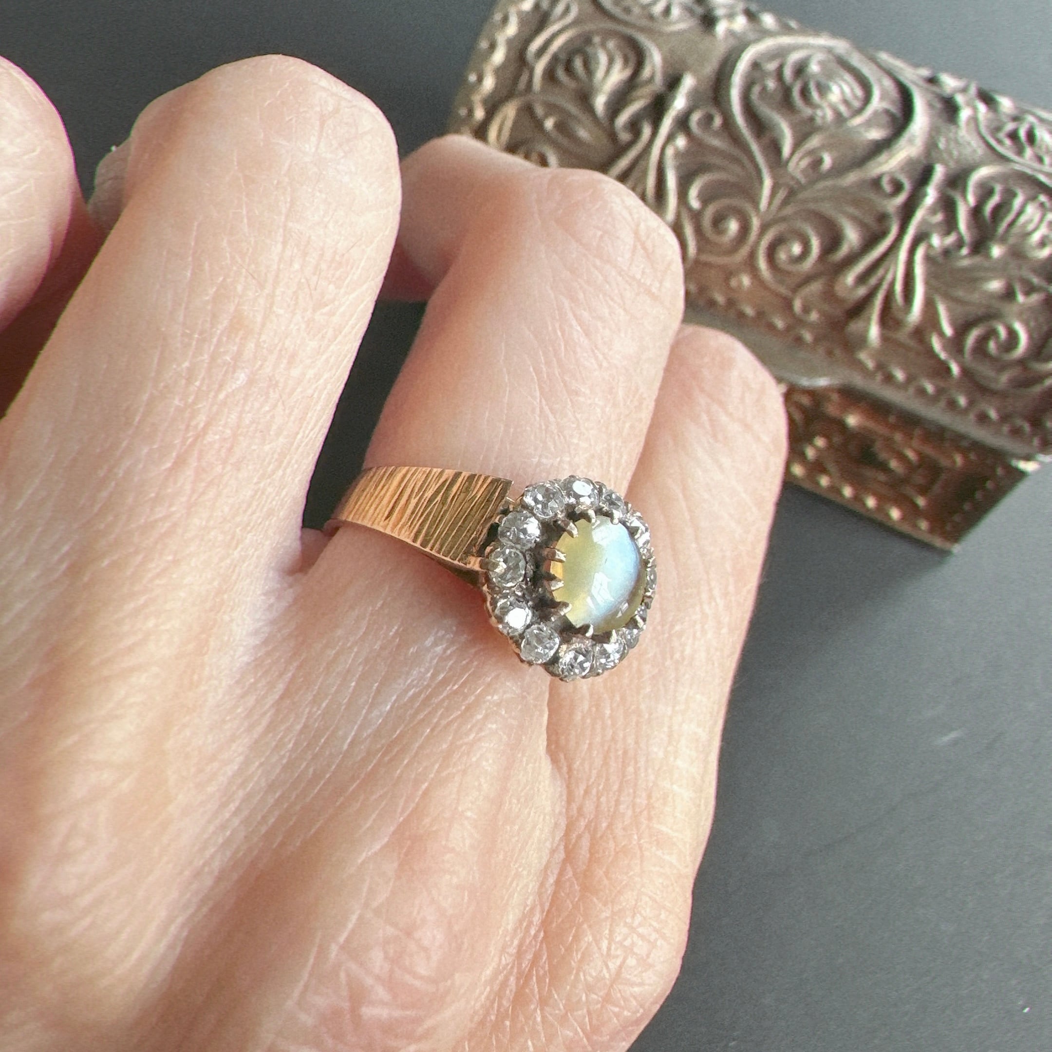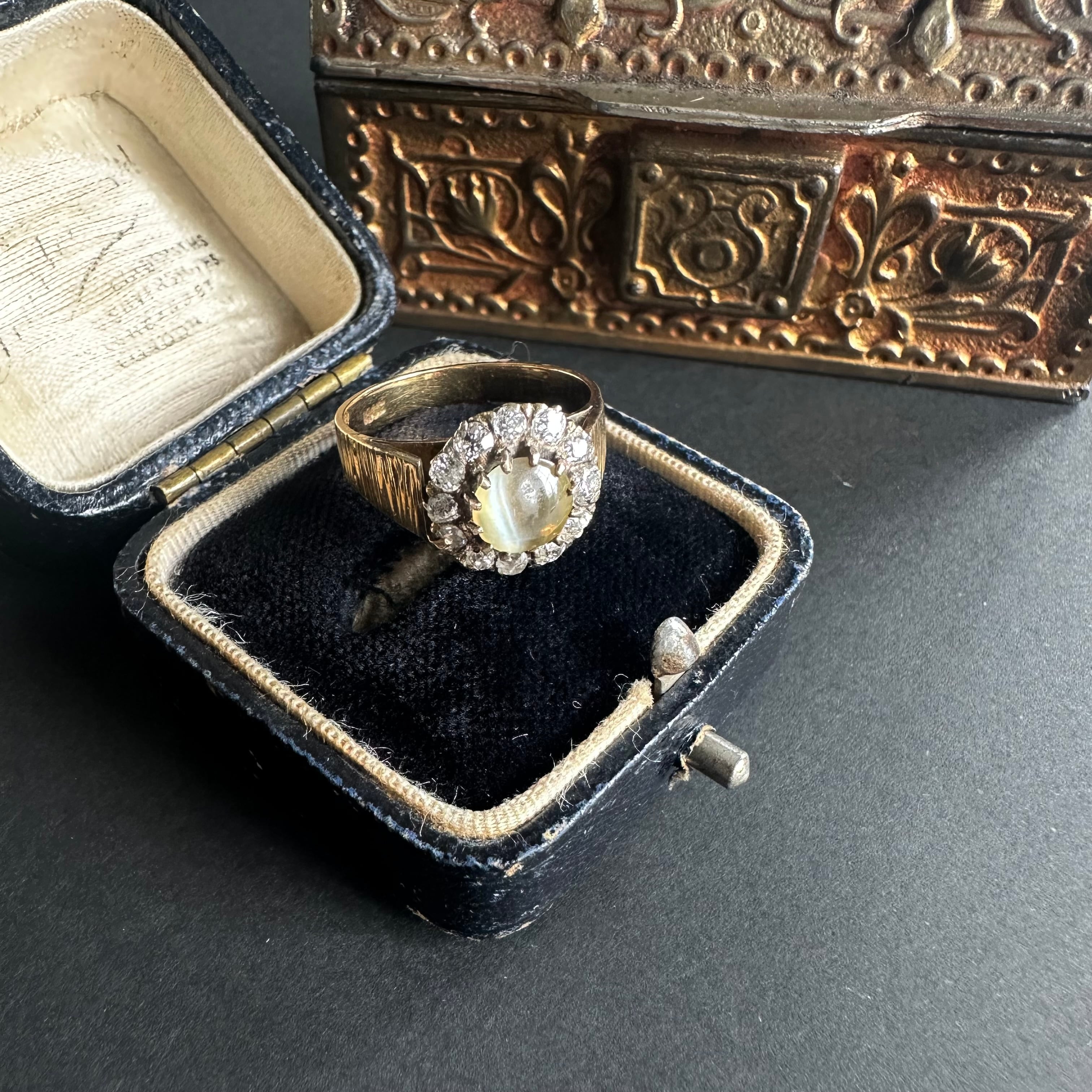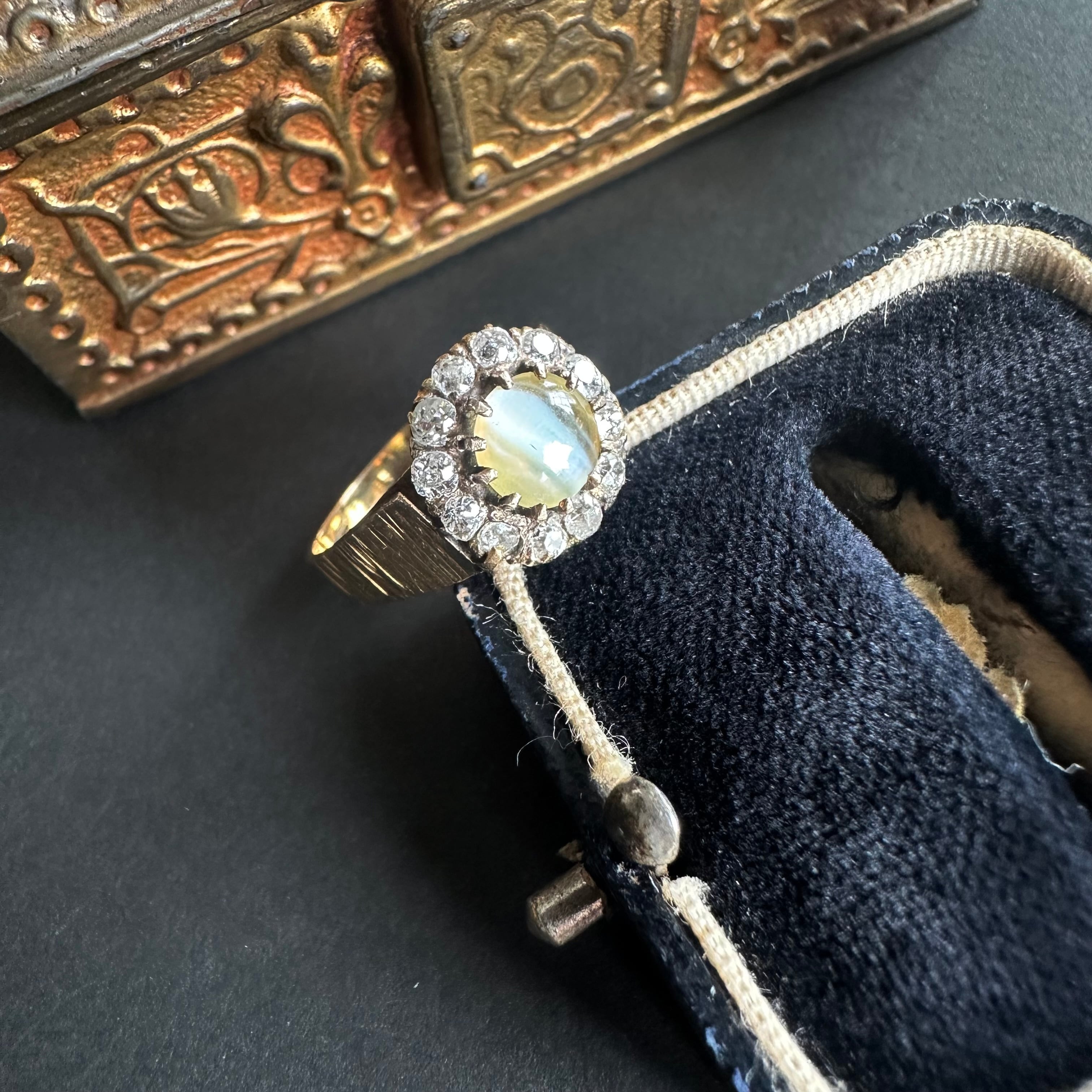まわりのダイヤモンドはオープンキュレットのオールドカットダイヤモンド、ブリリアントの整った輝きとは違っていて、その不ぞろいな光が星のきらめきのようで、中央のキャッツアイの“月の光”をそっと引き立てています。