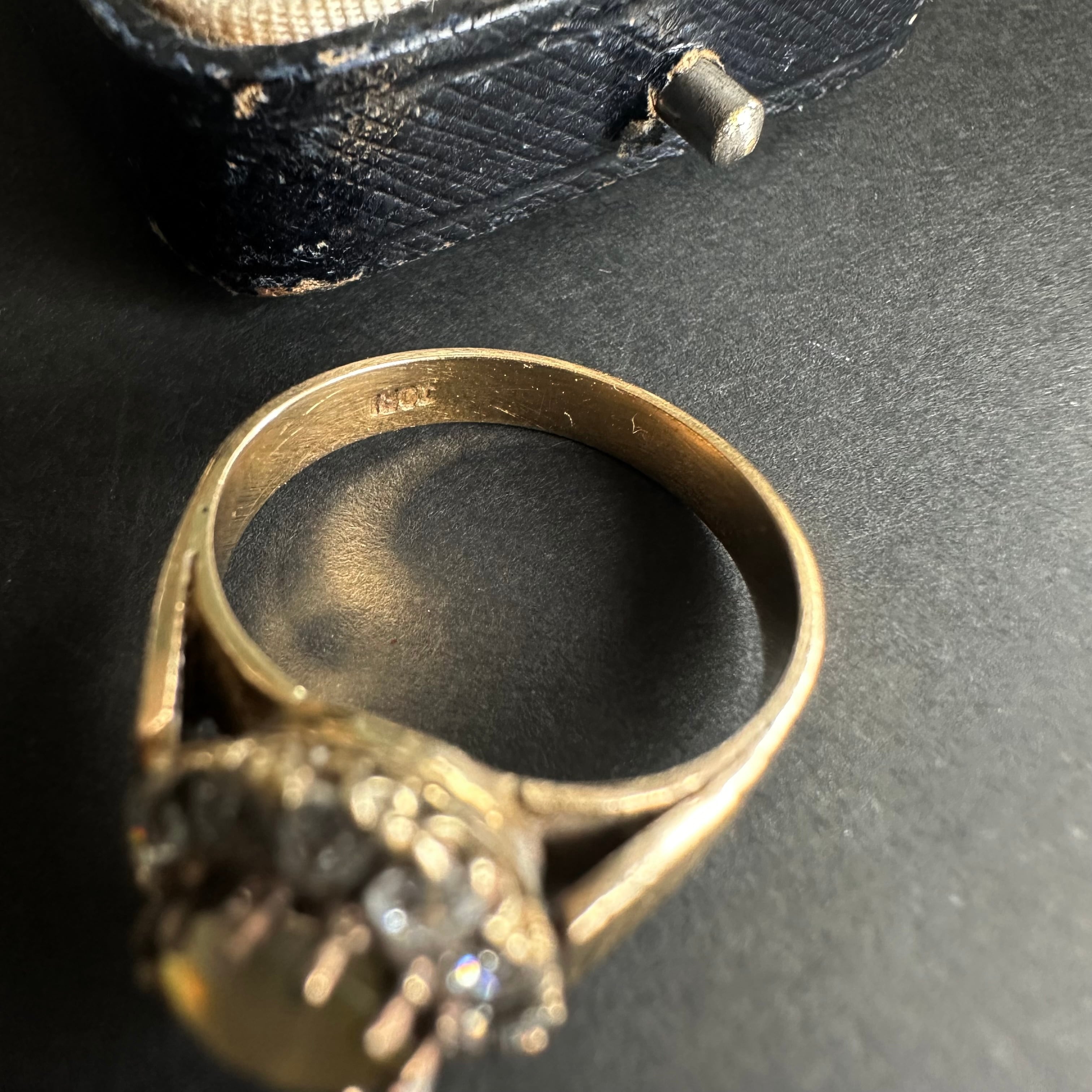 アームの形や地金の雰囲気から、リング全体は1930年代の後半ごろにつくられたものと思われます。アールデコのすっきりした雰囲気を残しつつ、少し強さのあるつくりがこの頃らしい特徴です。