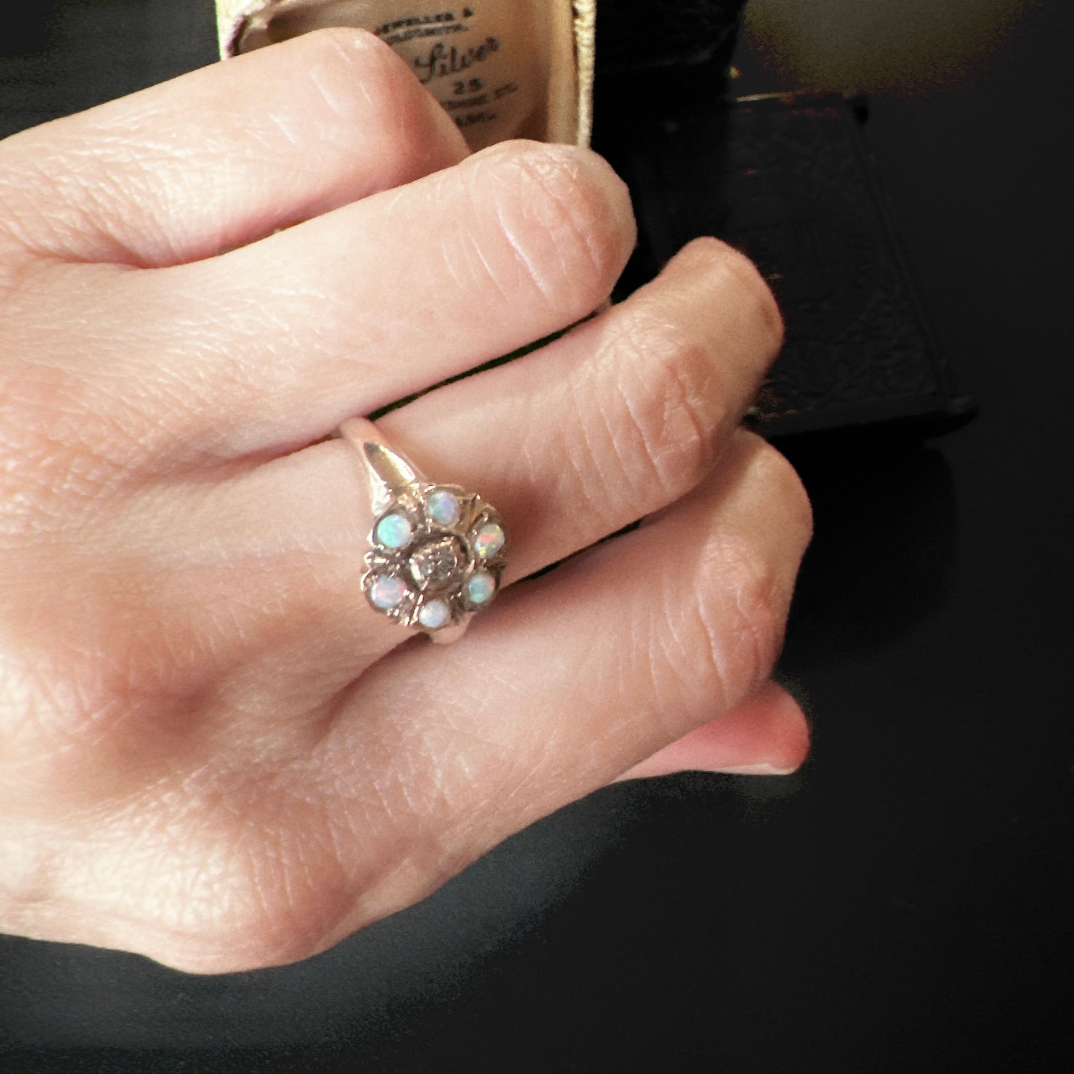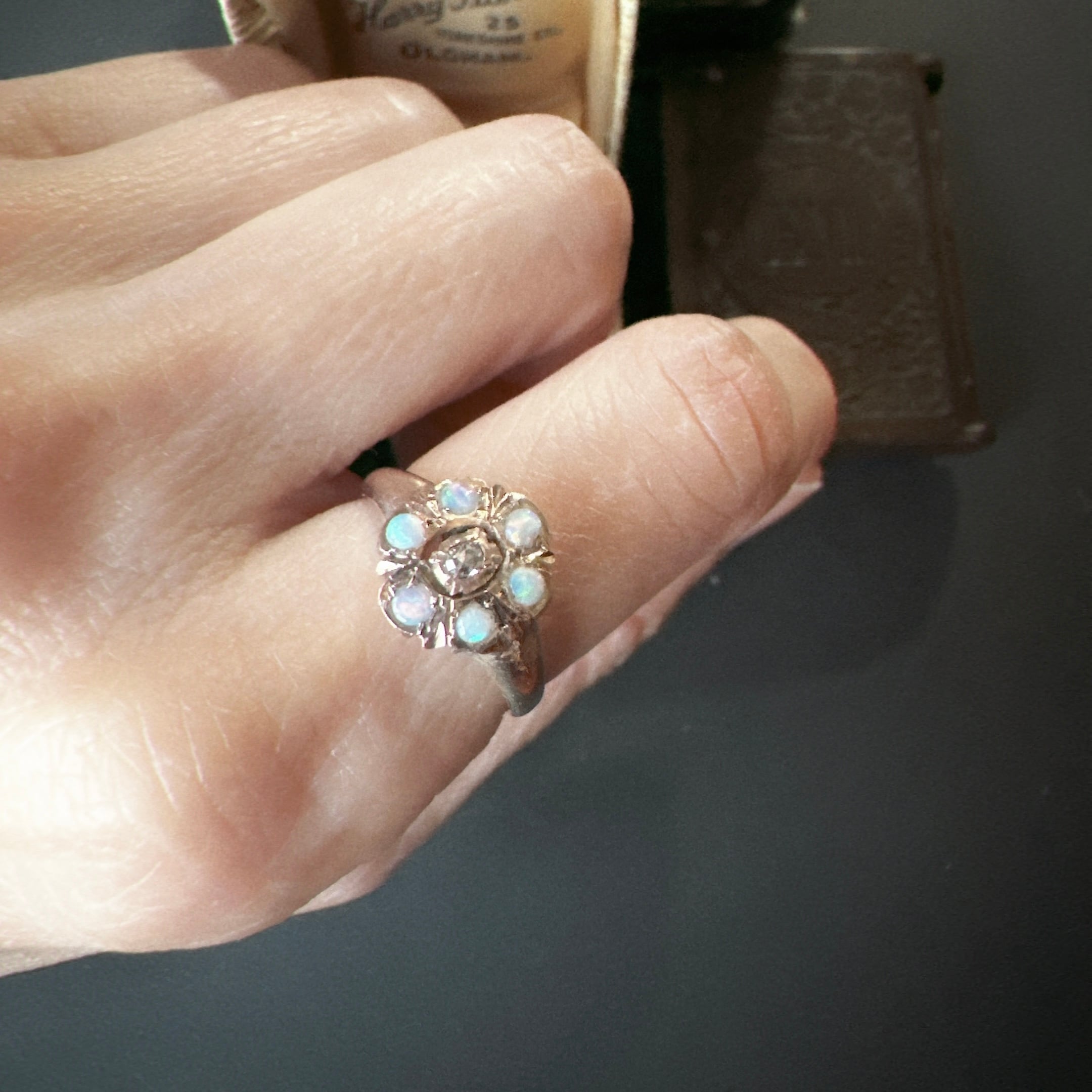 ※ 100年以上前の古いお品になりますので、経年によるアンティーク品特有の微小なスレなどルーペで見てわかる程度にございます。ダイヤモンドは内包物はありますが、アンティークならではの輝きを楽しませてくれます。カケはございません。オパールも浮遊色をお楽しみ頂けます。カケはございません。