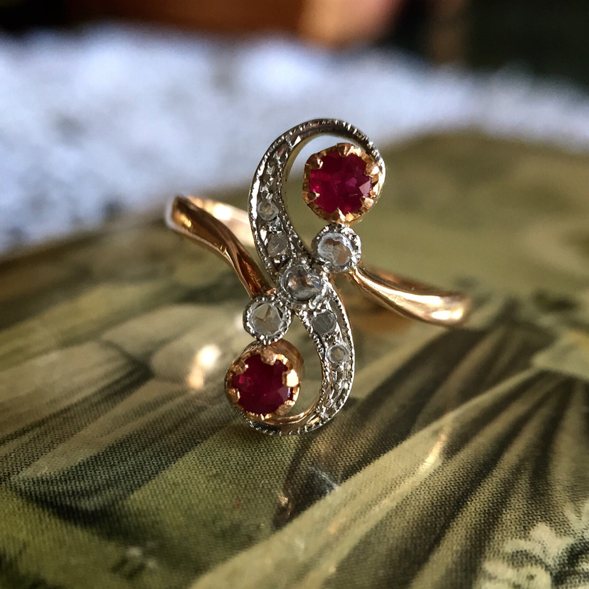 そよ風に吹かれてなびくリボンのような柔らかな曲線が美しいクロスオーバーリングは1900年前後に流行したデザインです。