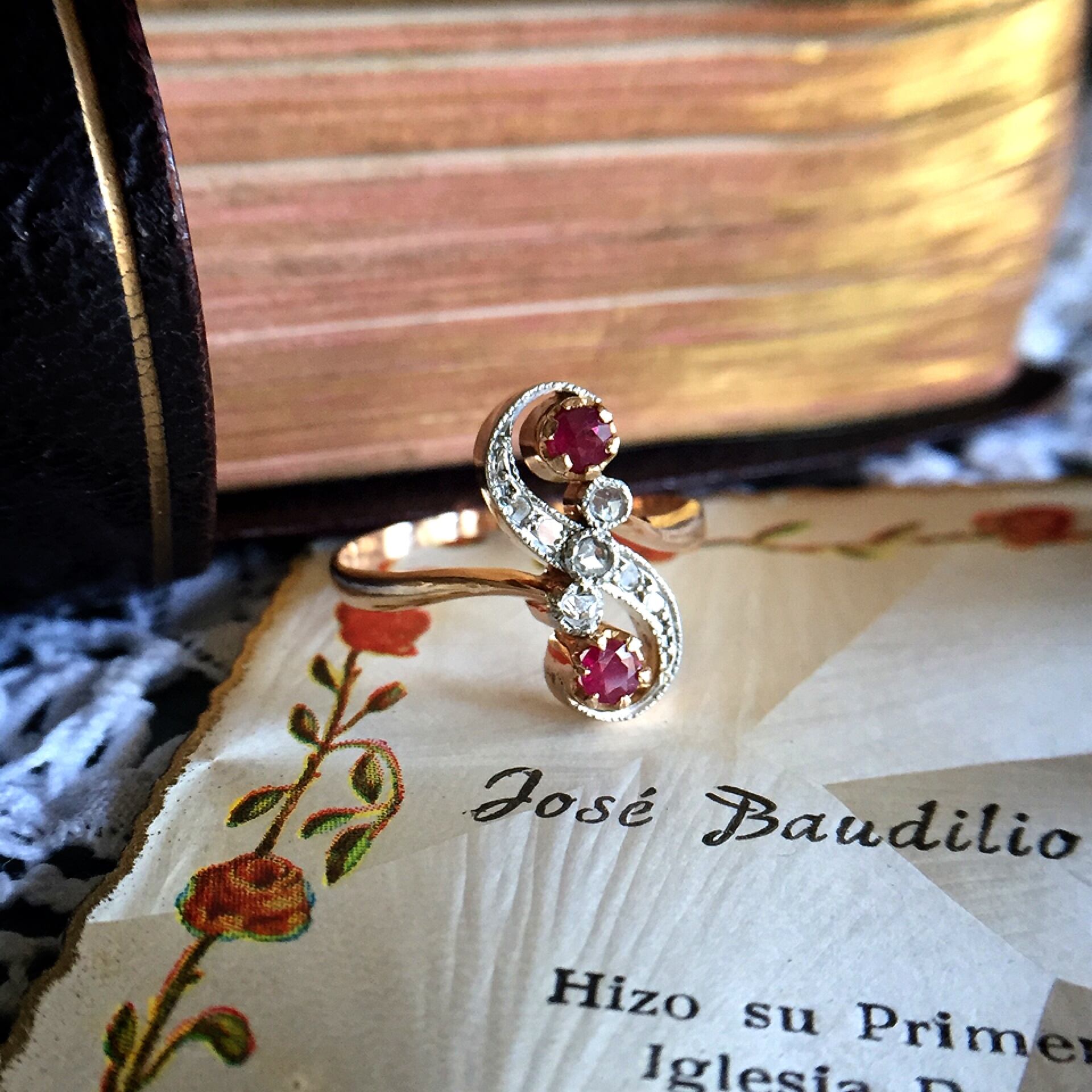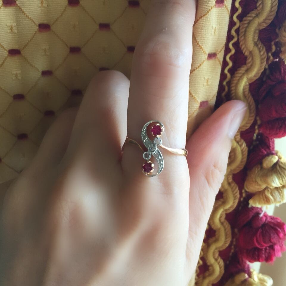 絶妙なカーブを描き、まるでチェリーのようなルビーをそれぞれ囲い込んだ曲線と中央の斜めのサークルに直線的にセットされたカチカチとし光を放つローズカットダイヤモンドの組み合わせが美しいデザインです。