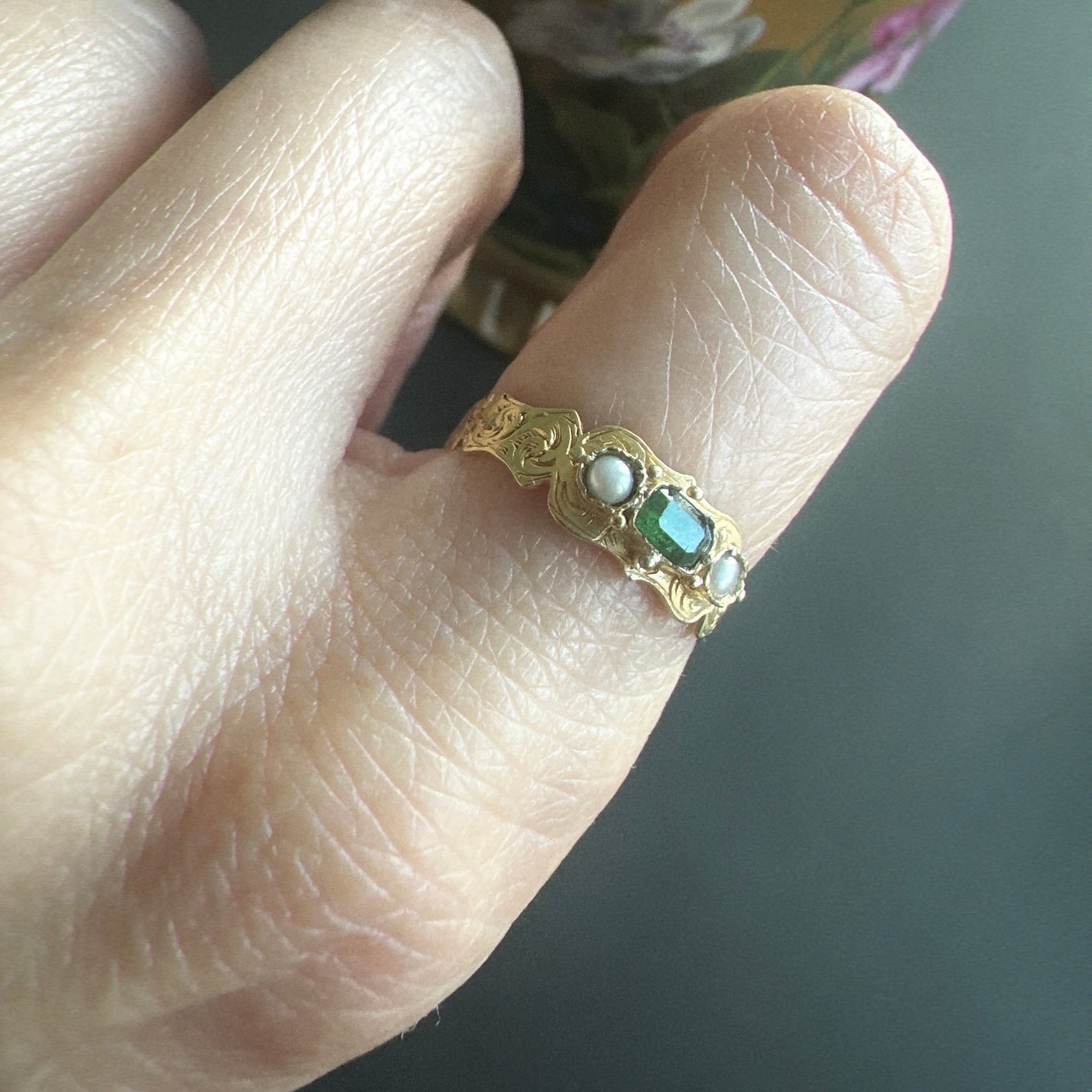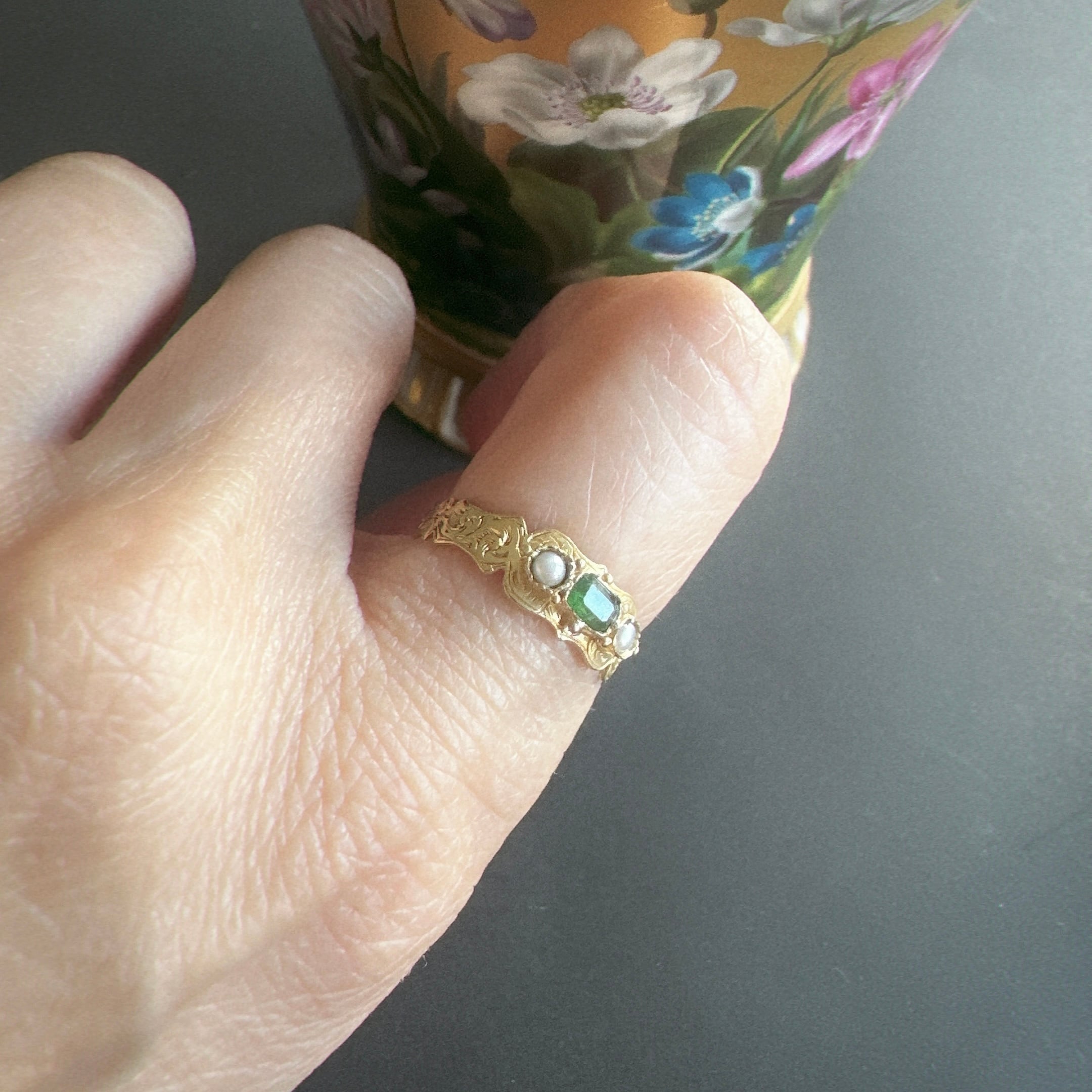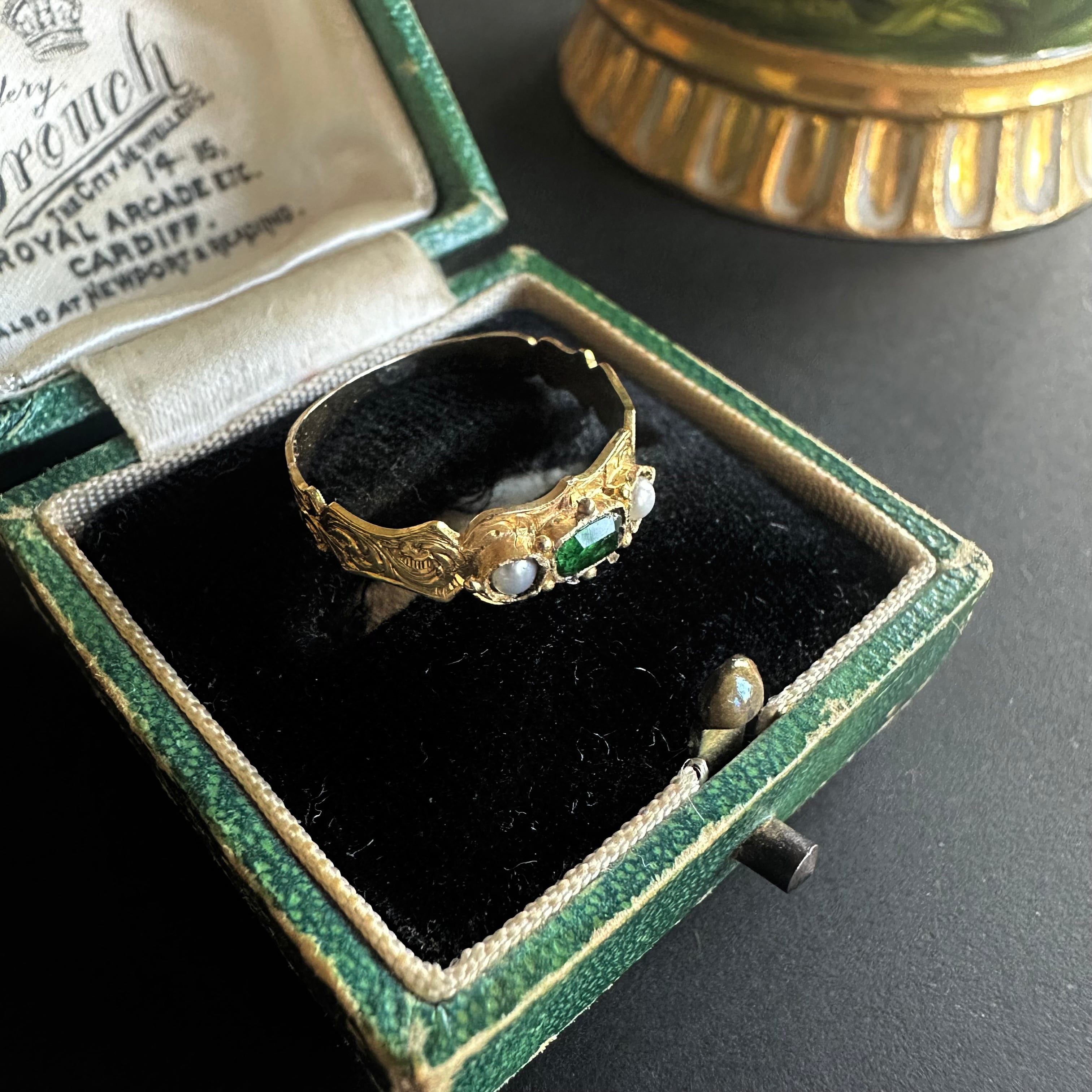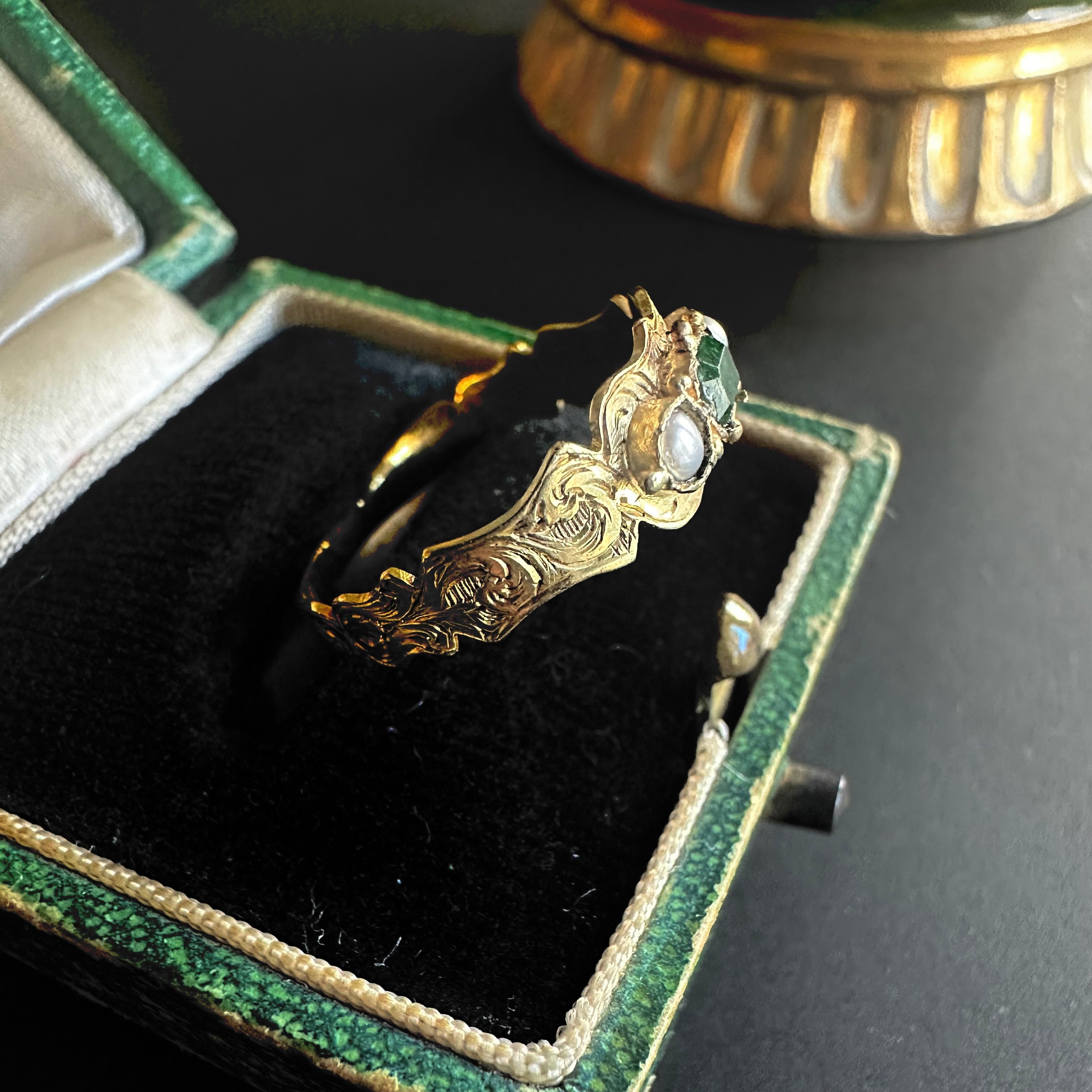 中央のエメラルドは、当時“再生・幸福・忠誠”を意味し、愛の誓いや深い情緒を込めて贈られた宝石。