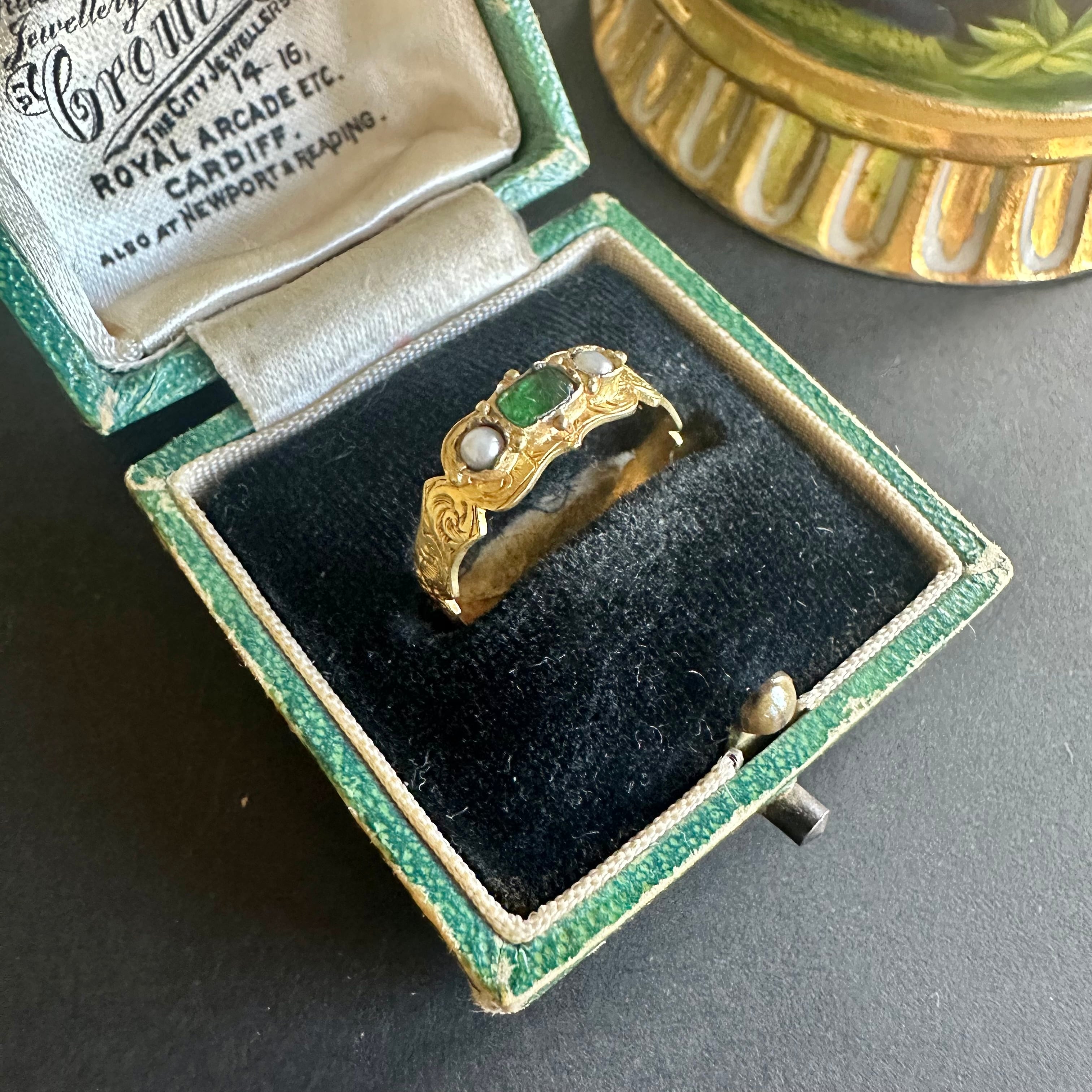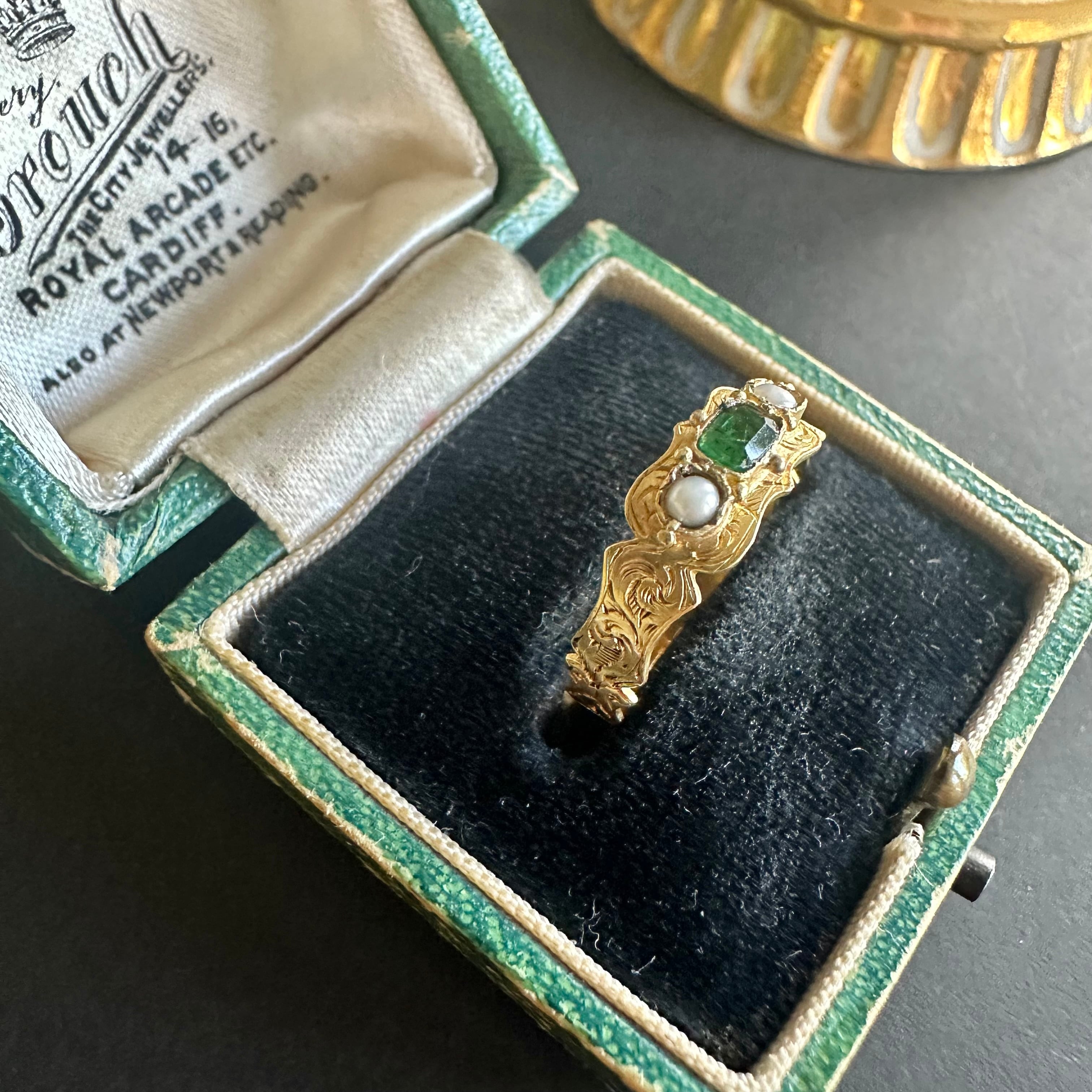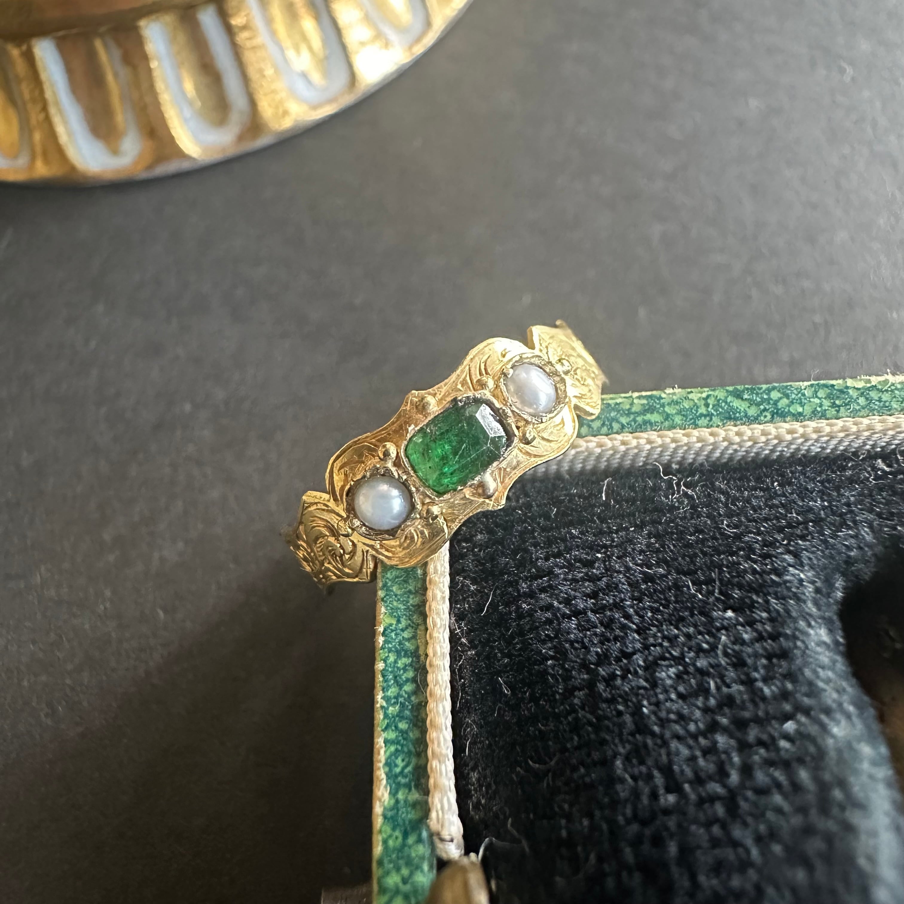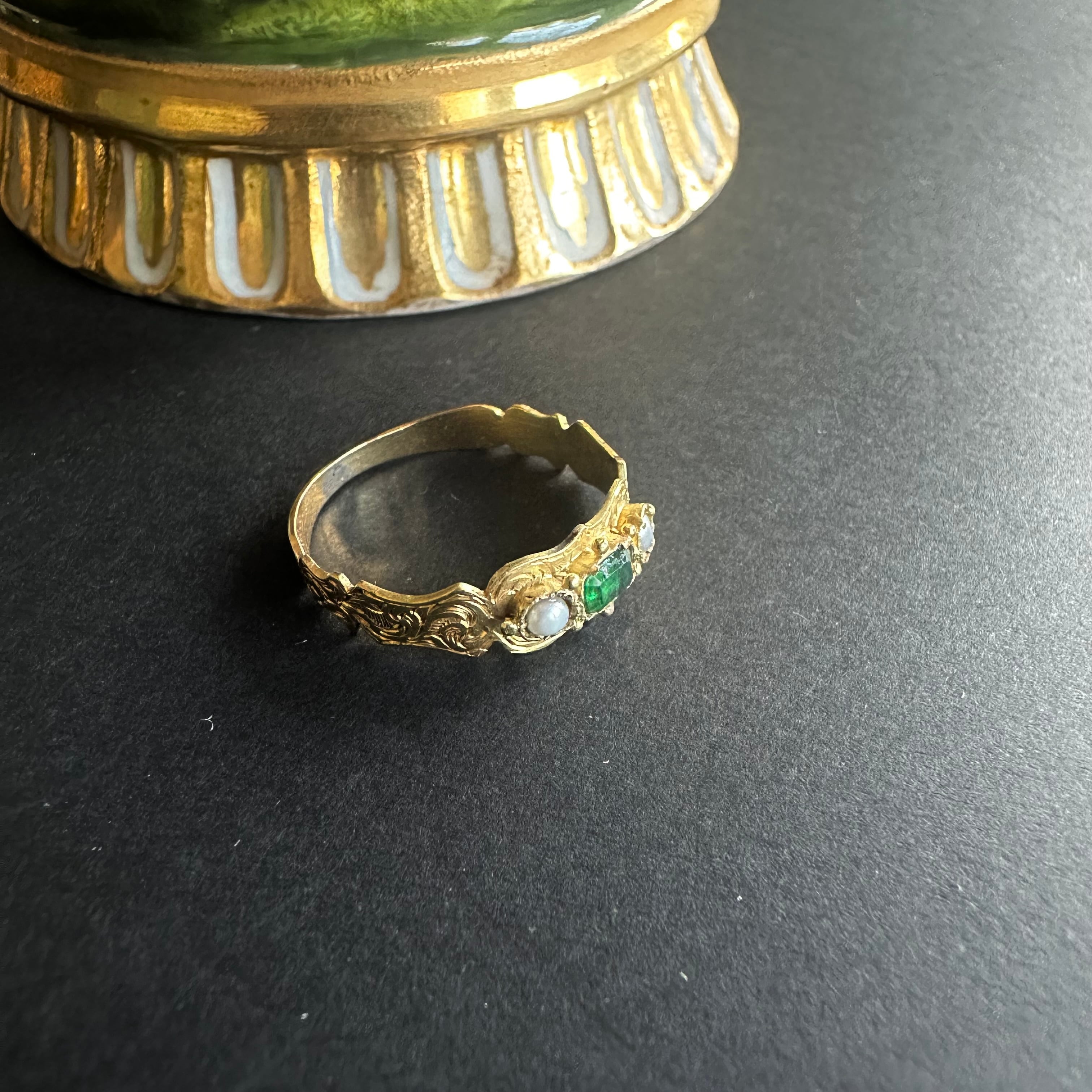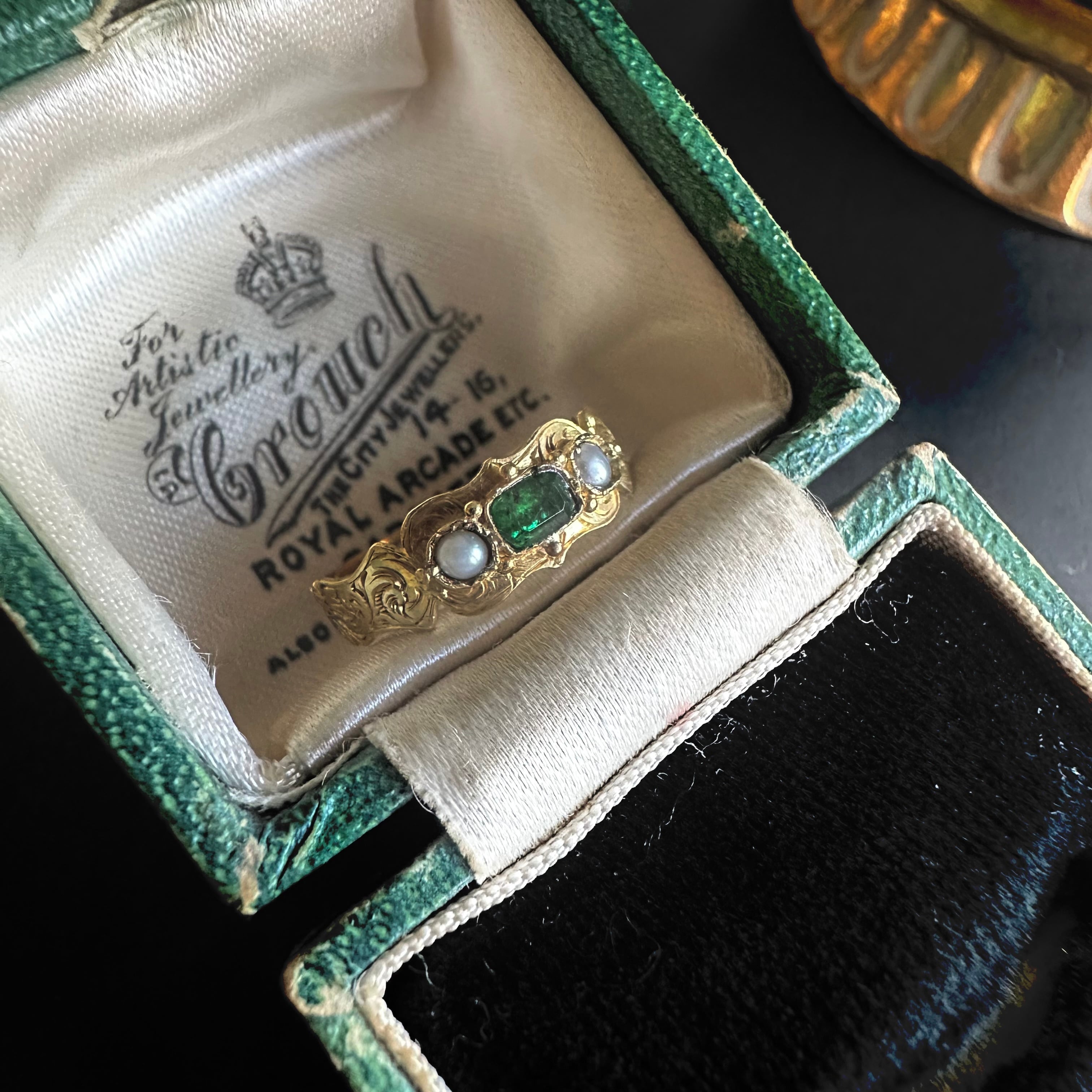 ※ 150年程前の古いお品になりますので、経年によるアンティーク品特有の微小なスレなどルーペで見てわかる程度にございます。エメラルドはルーペでのぞくと内包物はありますが、瑞々しい輝きを楽しませてくれます。パールも状態がよく残ってます。カケ、目立つキズ、ございません。