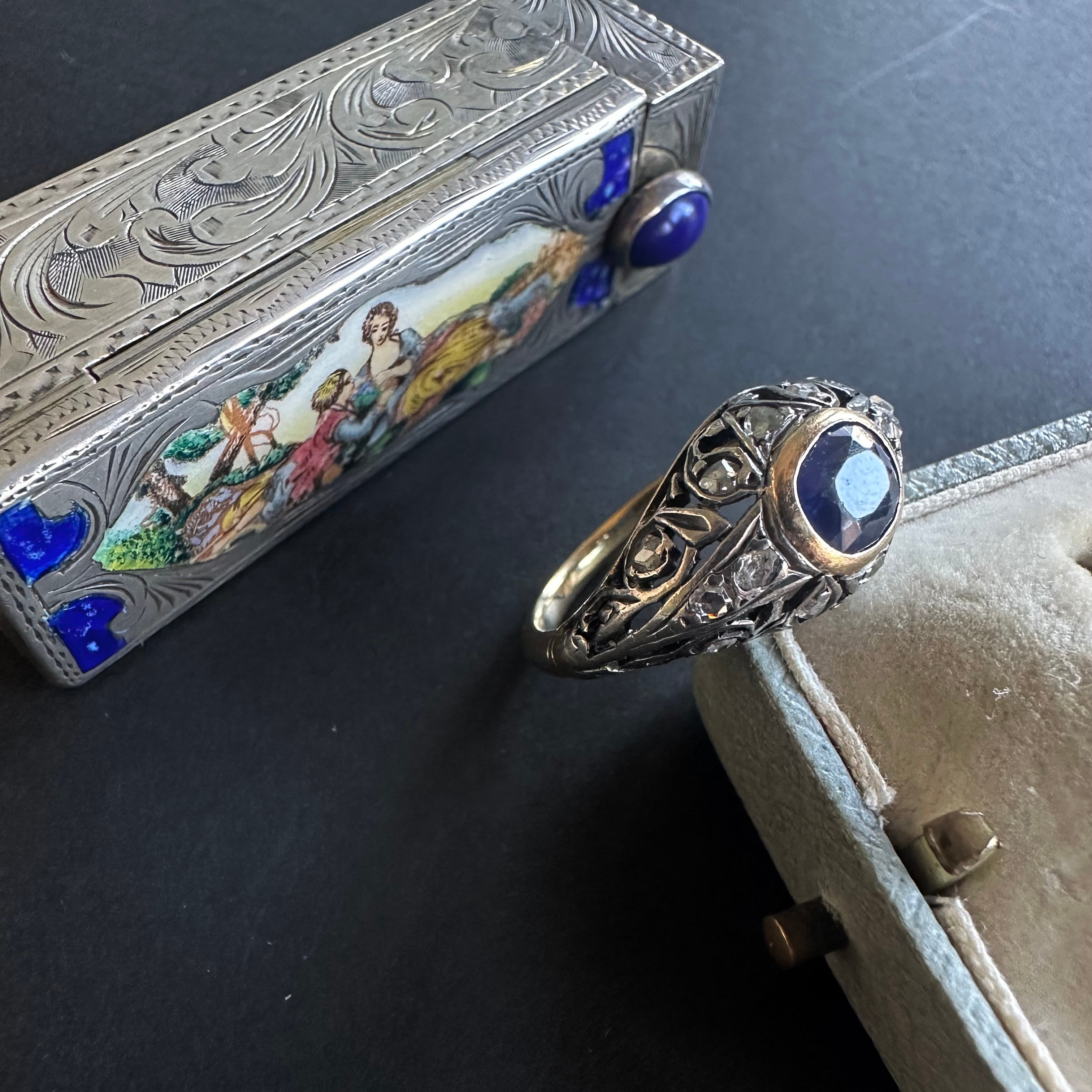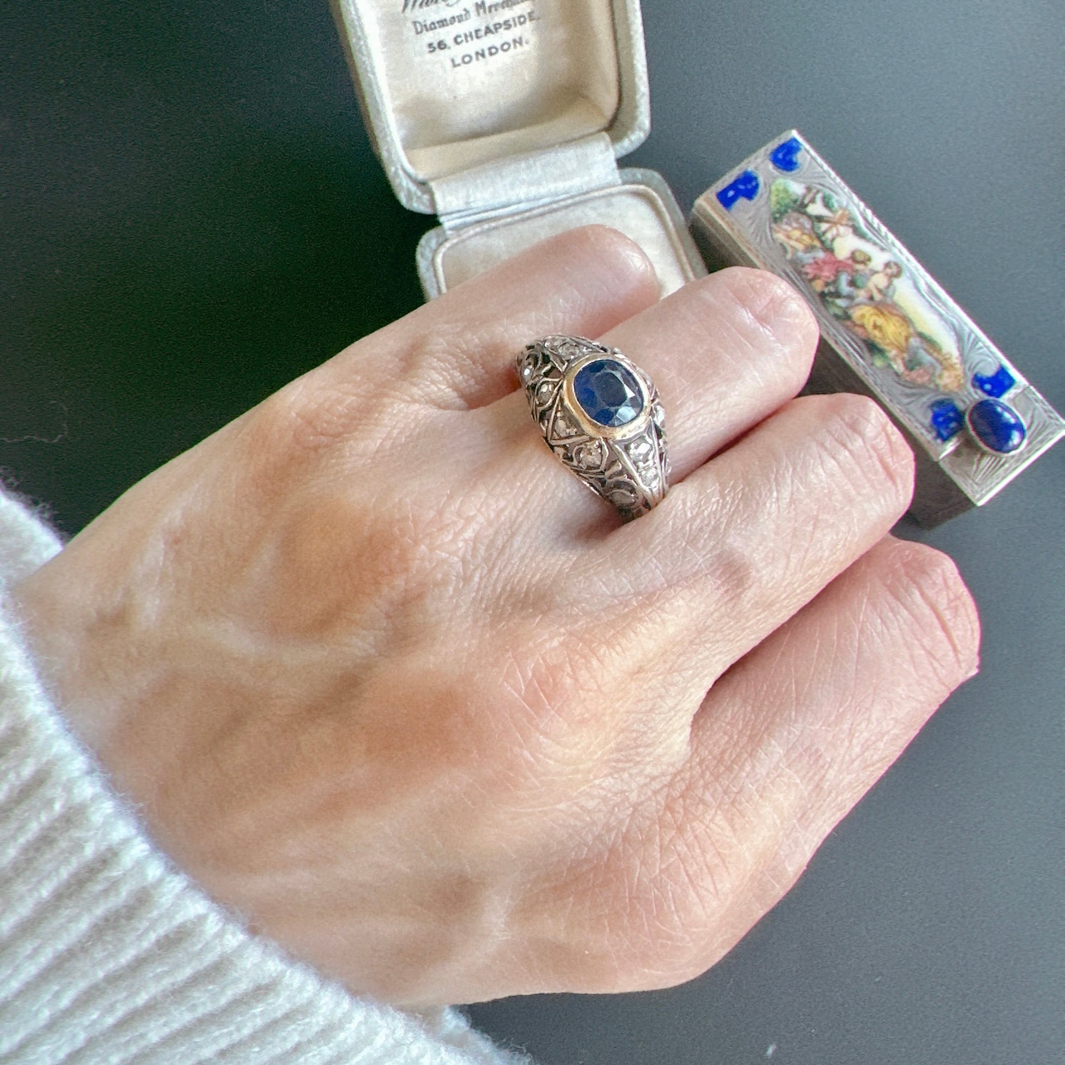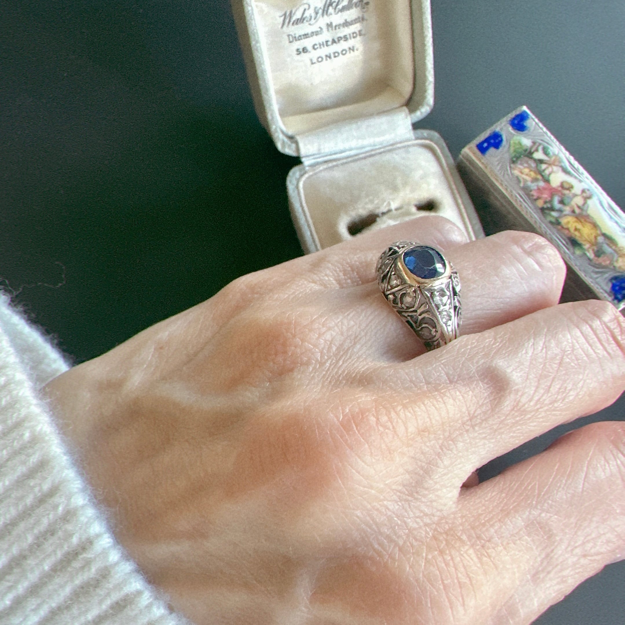 深く澄んだブルーのサファイアを、コレットセッティングで包んだアンティークリングは、光を内側に包み込むようなセッティングによって、サファイアの青は落ち着いた色味に深まり、光が入ると静かな揺らぎを感じさせます。