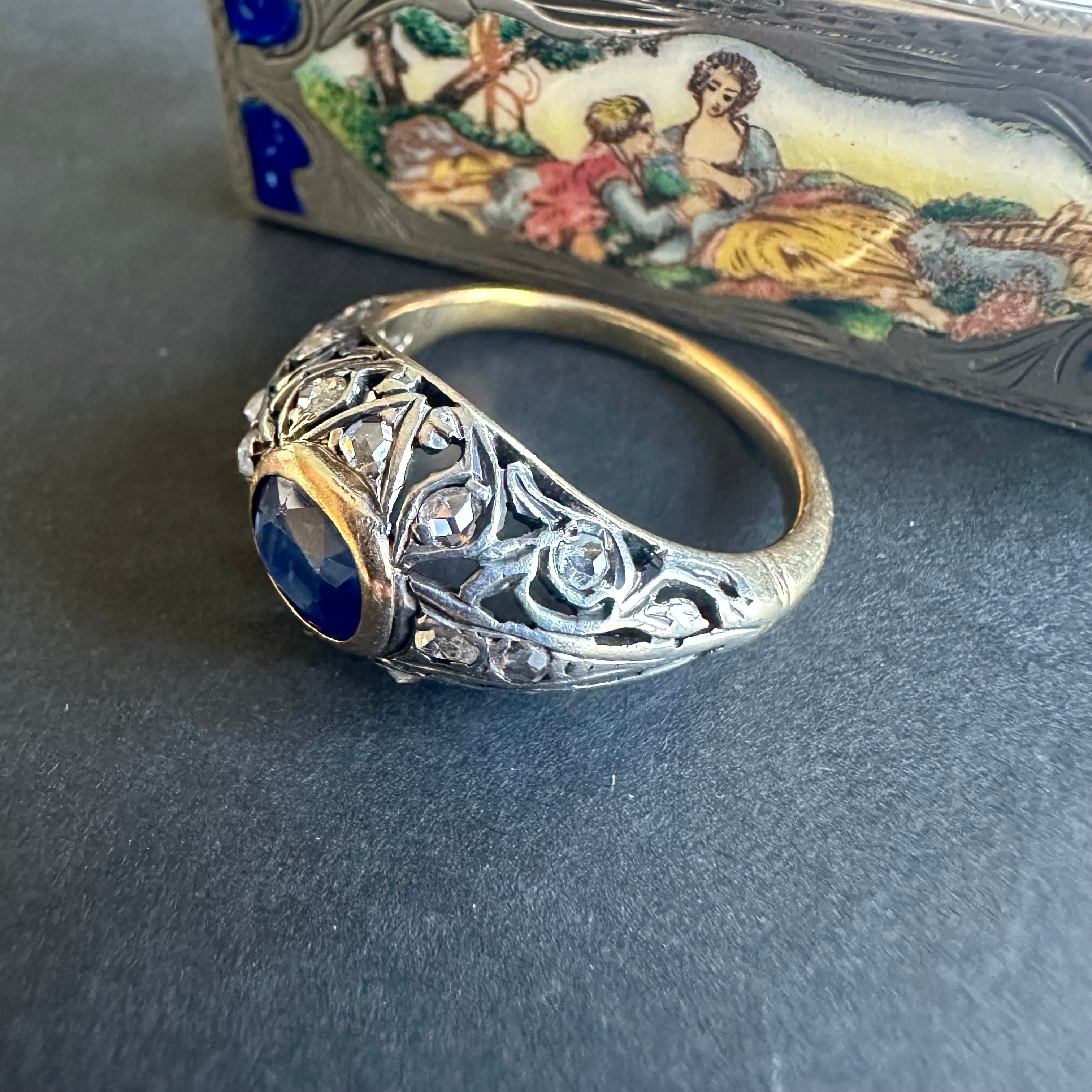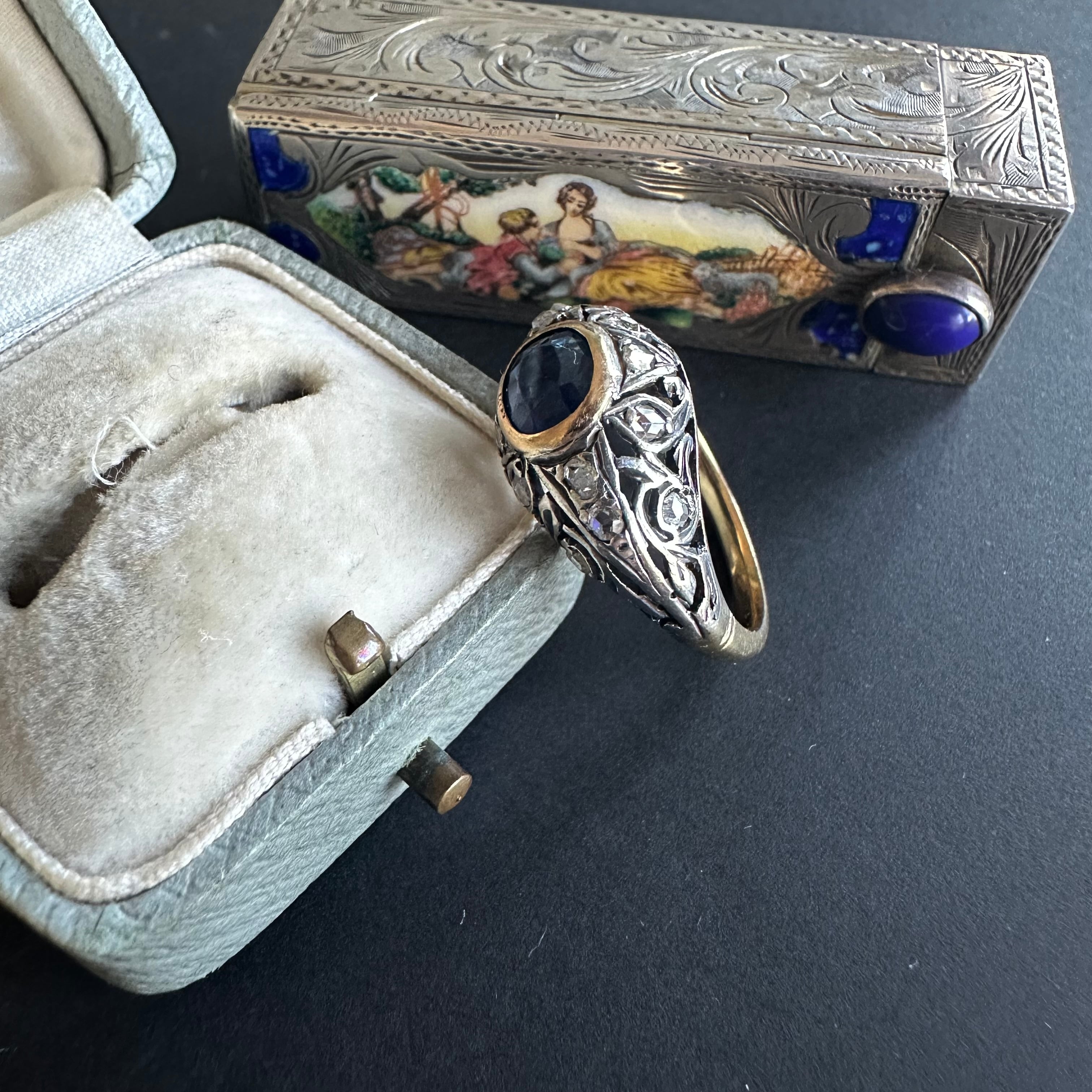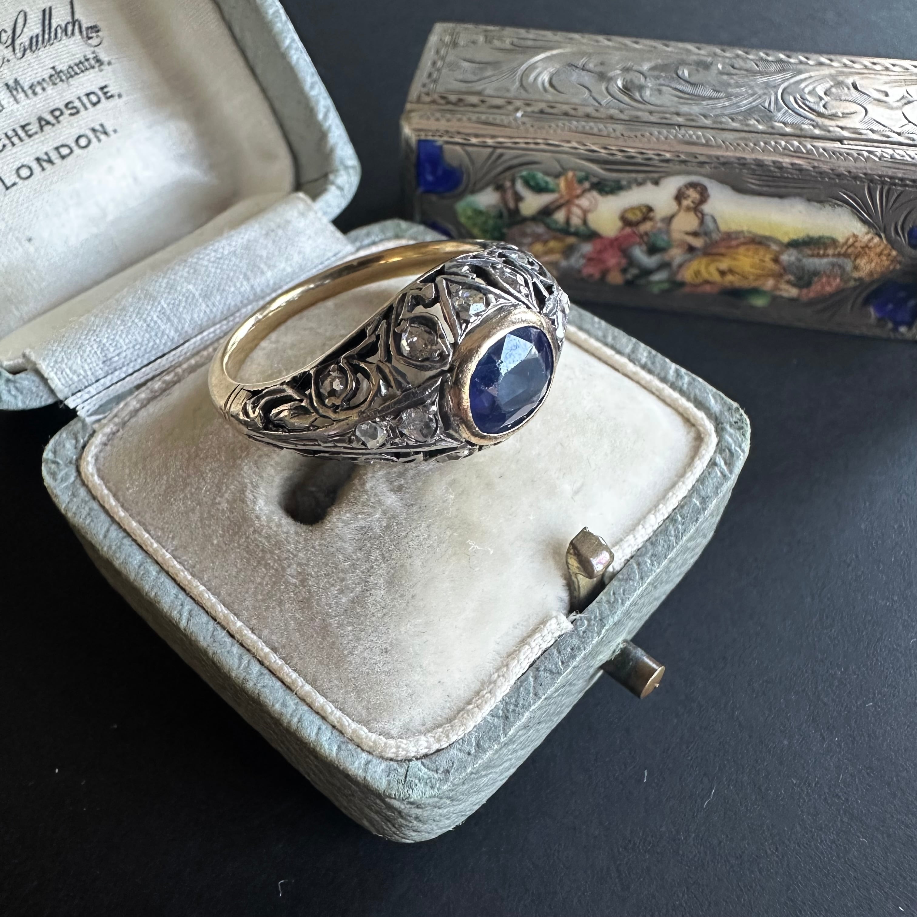 深く澄んだブルーのサファイアを、コレットセッティングで包んだアンティークリングは、光を内側に包み込むようなセッティングによって、サファイアの青は落ち着いた色味に深まり、光が入ると静かな揺らぎを感じさせます。