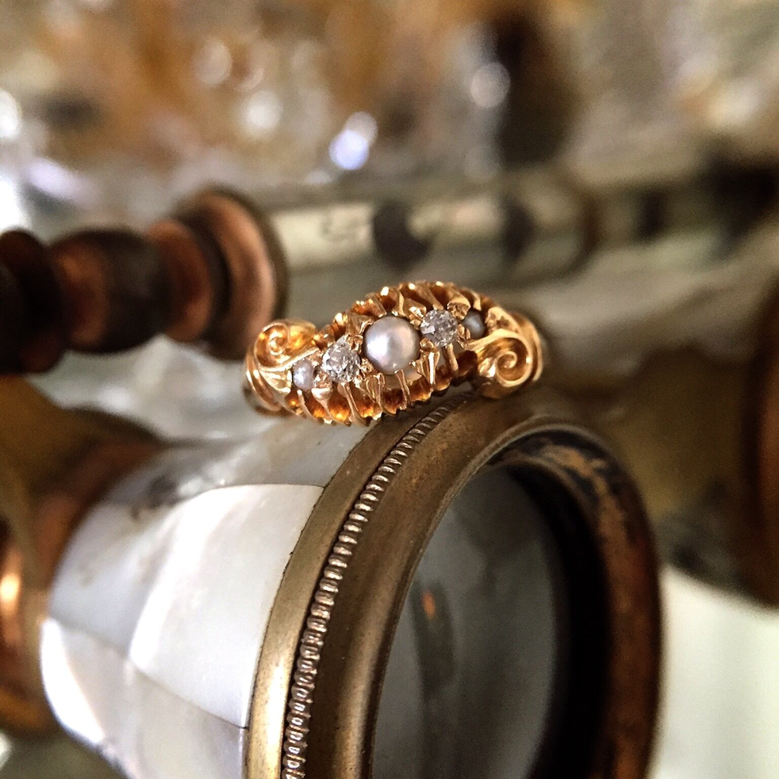穏やかに流れる川のような美しいイエローゴールドの台座に2粒のダイヤモンドと3粒のナチュラルパールがセットされたアール・ヌーヴォー期のリングです。
