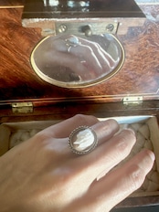 細かな彫りの表情と温かなシェルの色合い、そして時を経た金属の落ち着きが美しく調和し、指にのせるとどこか静けさのある優雅さがそっと寄り添ってくれるようです。