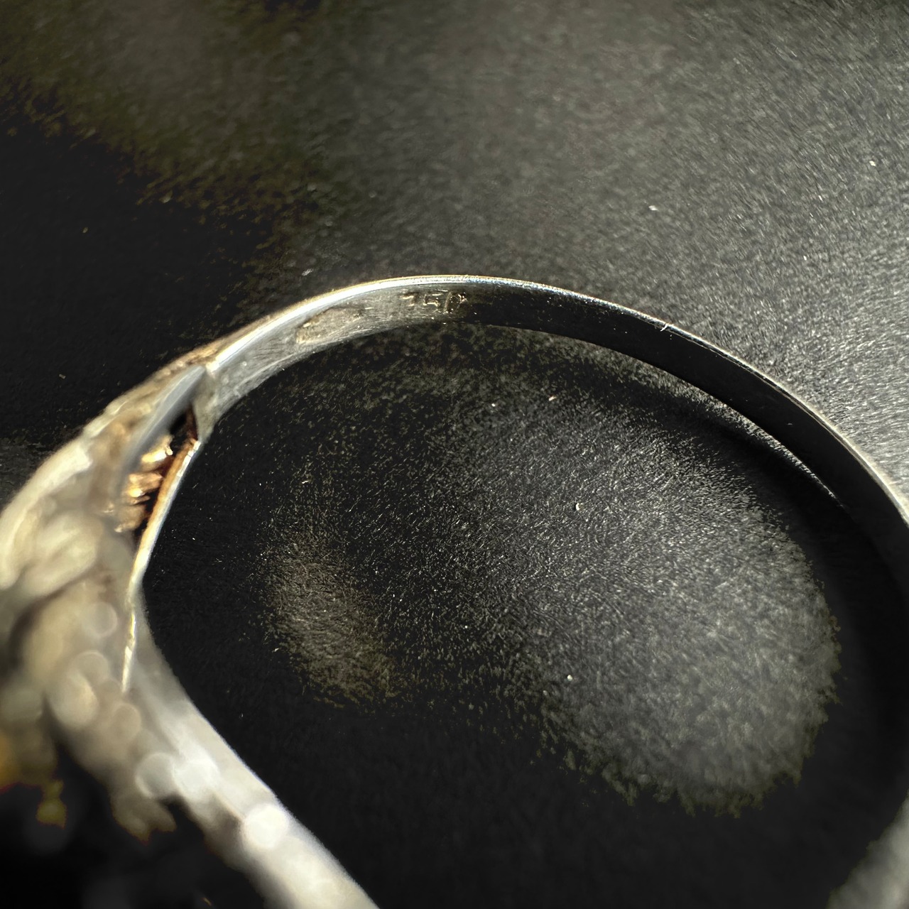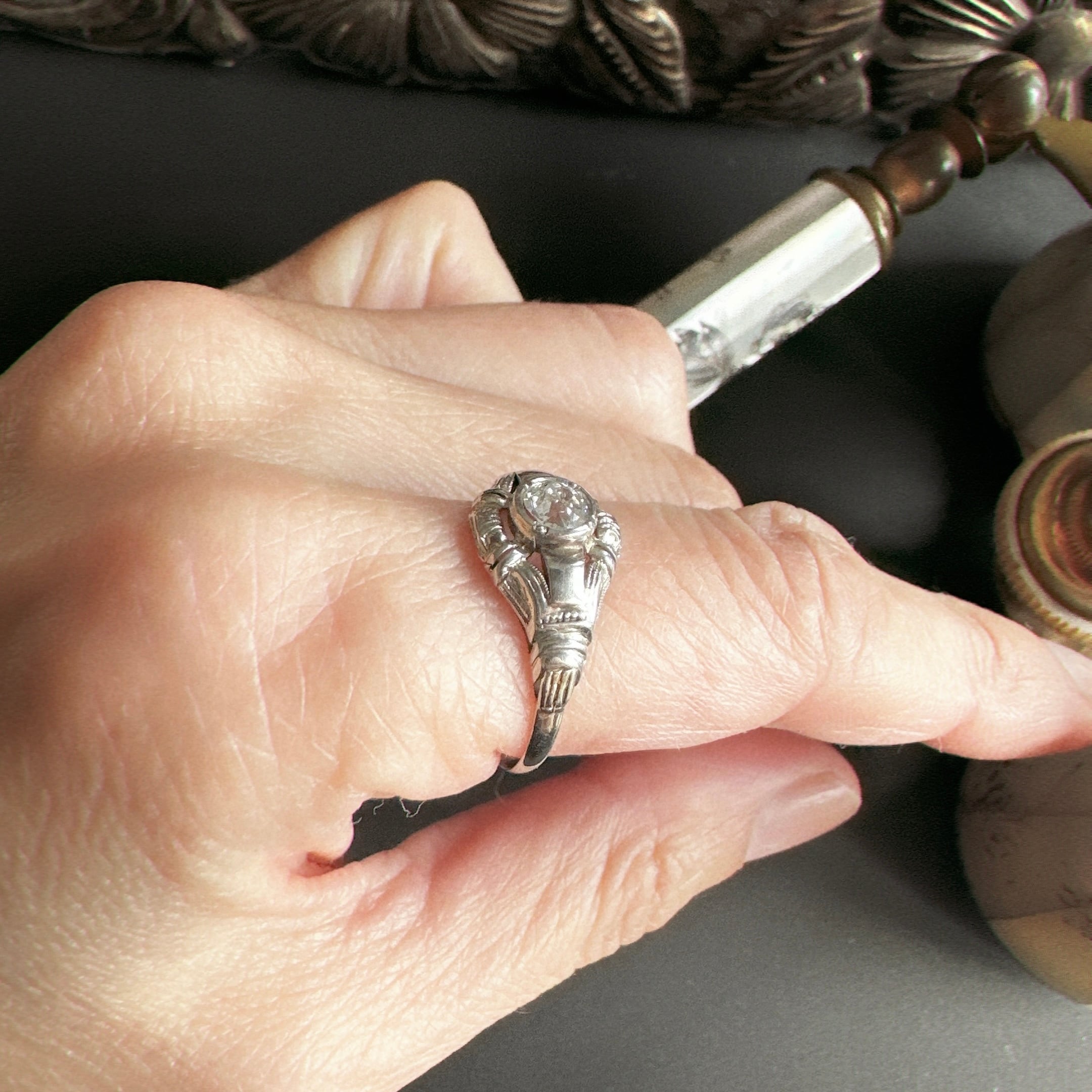 アールデコの特徴は、装飾性よりもまず「構築美」に重きを置く点にあります。このリングでも、台座は低く、そして合理的に設計されています。
