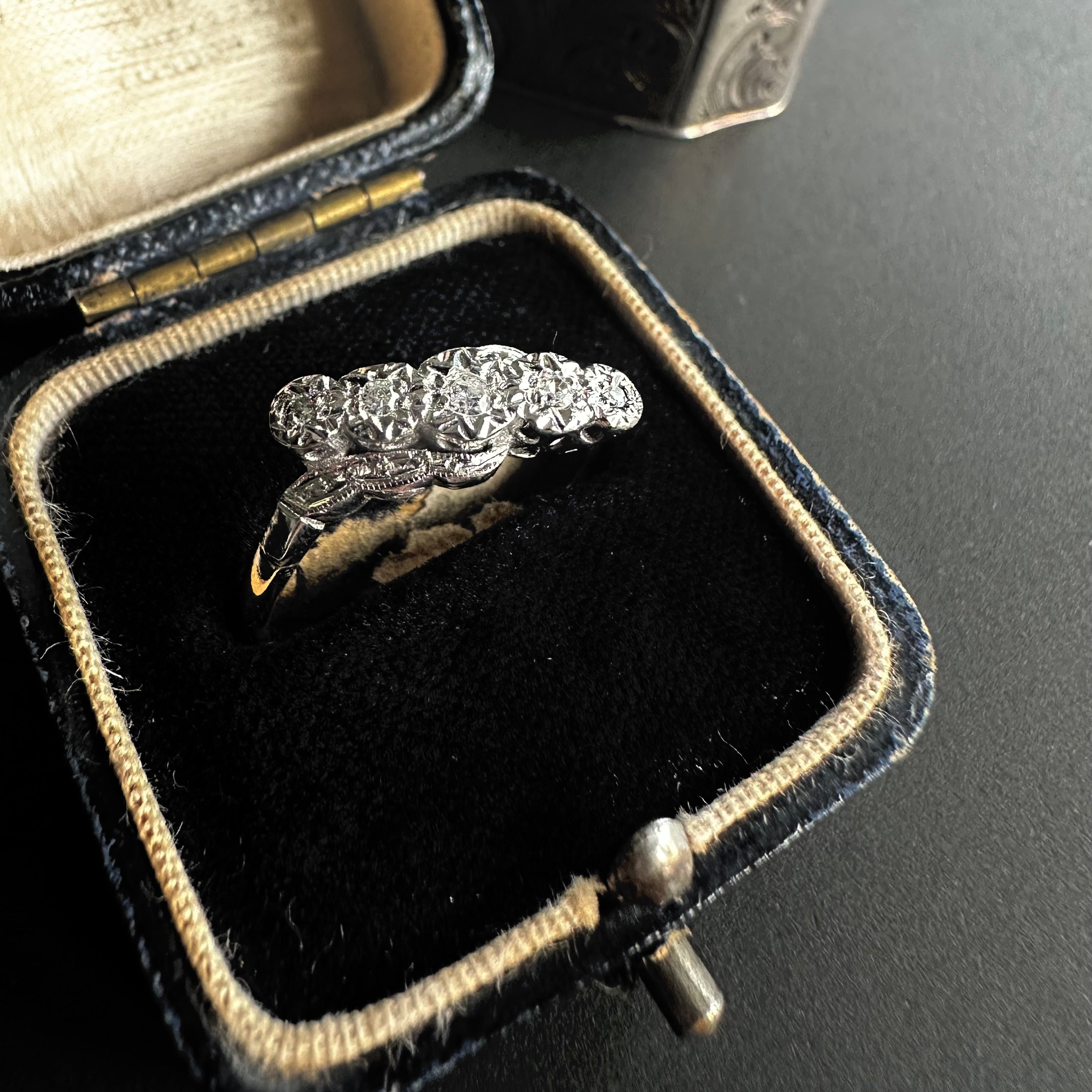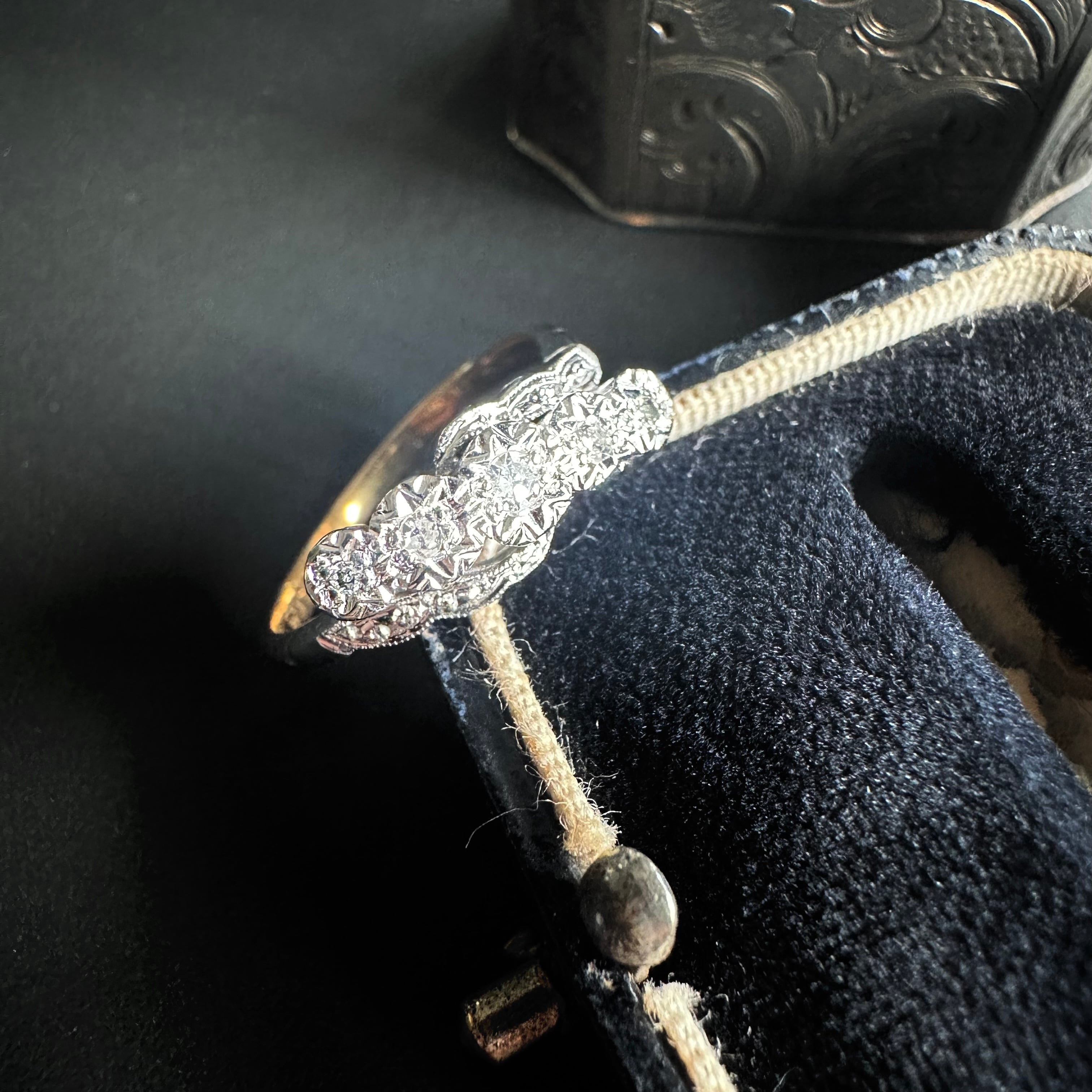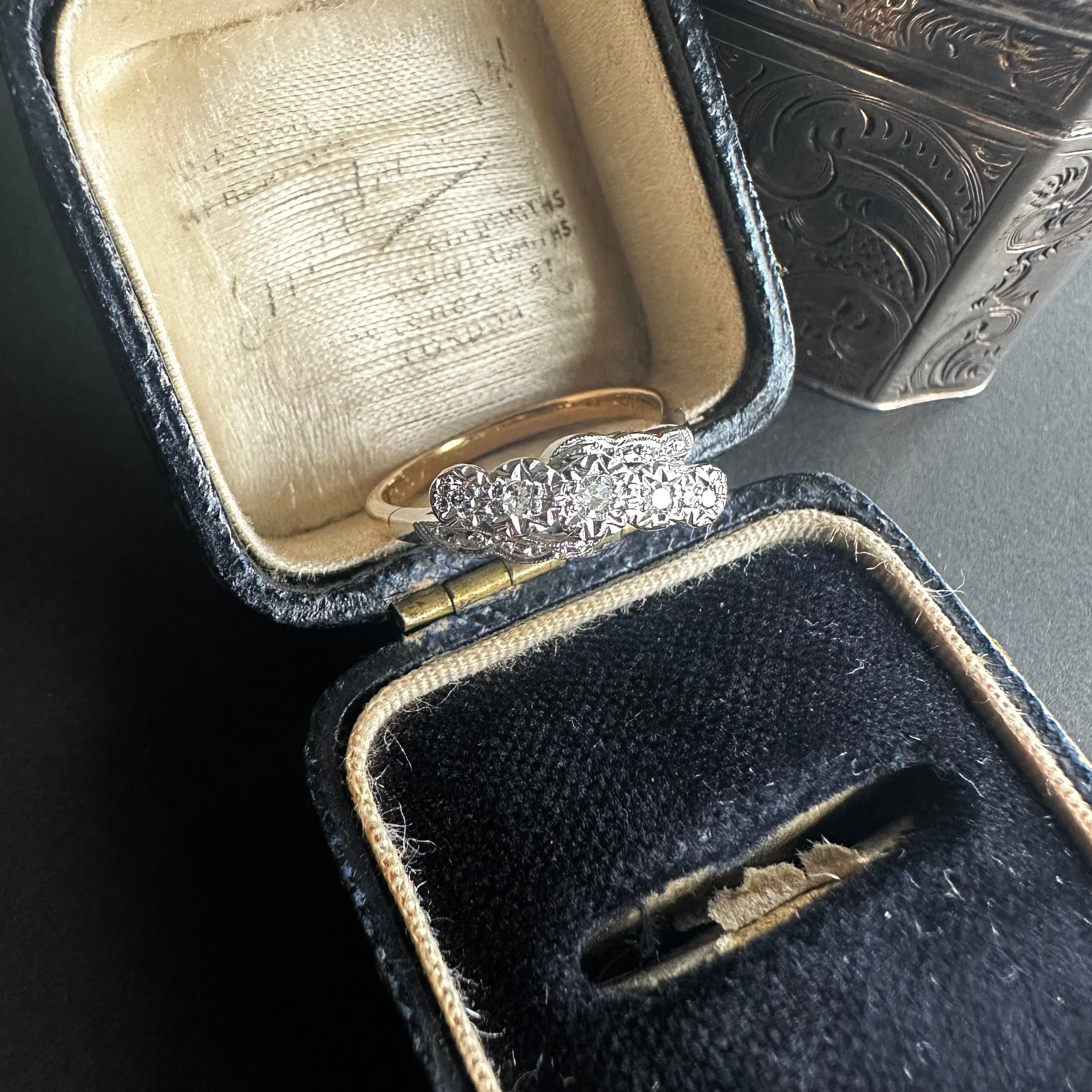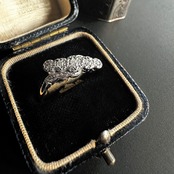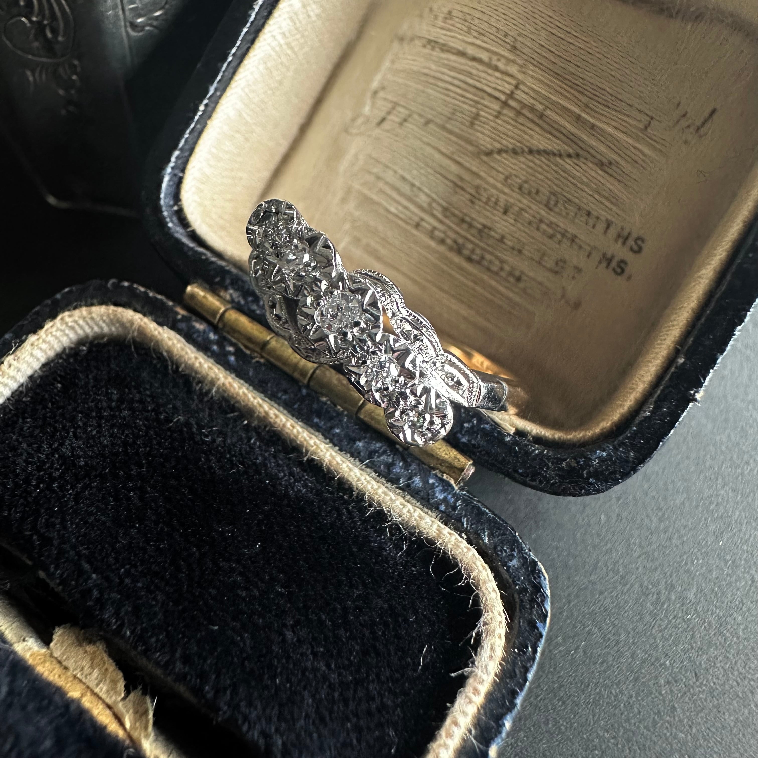 18金イエローゴールドのシャンクに、プラチナで仕立てられたフェイスを組み合わせた、流れ星のような佇まいを持つアンティークリングです。