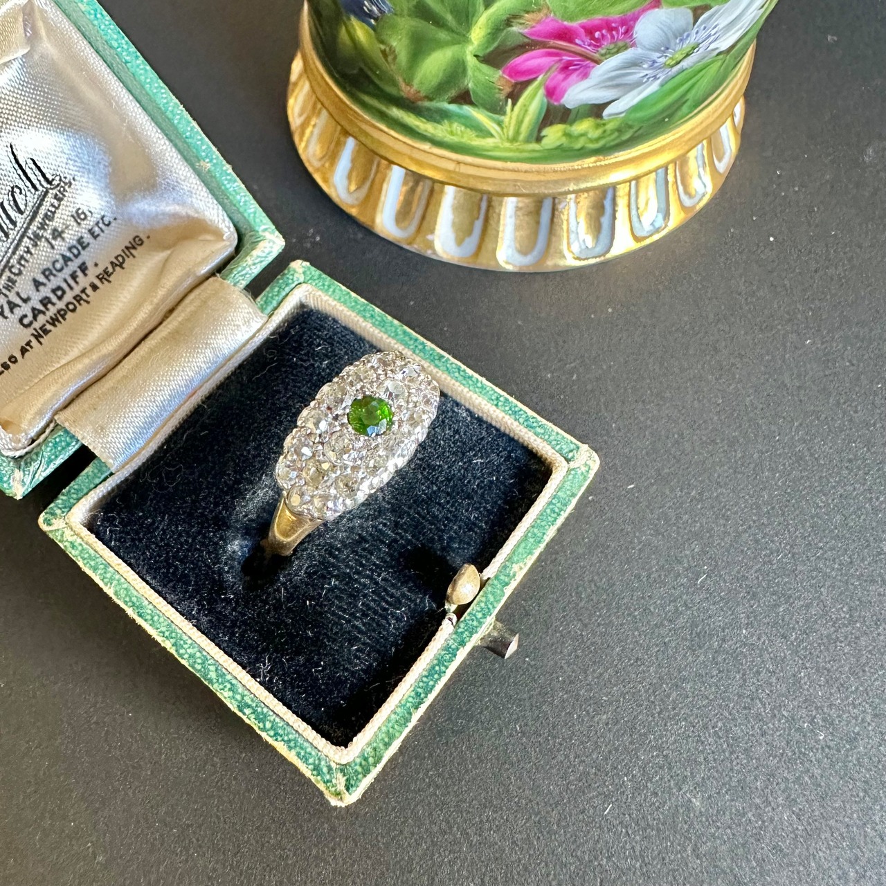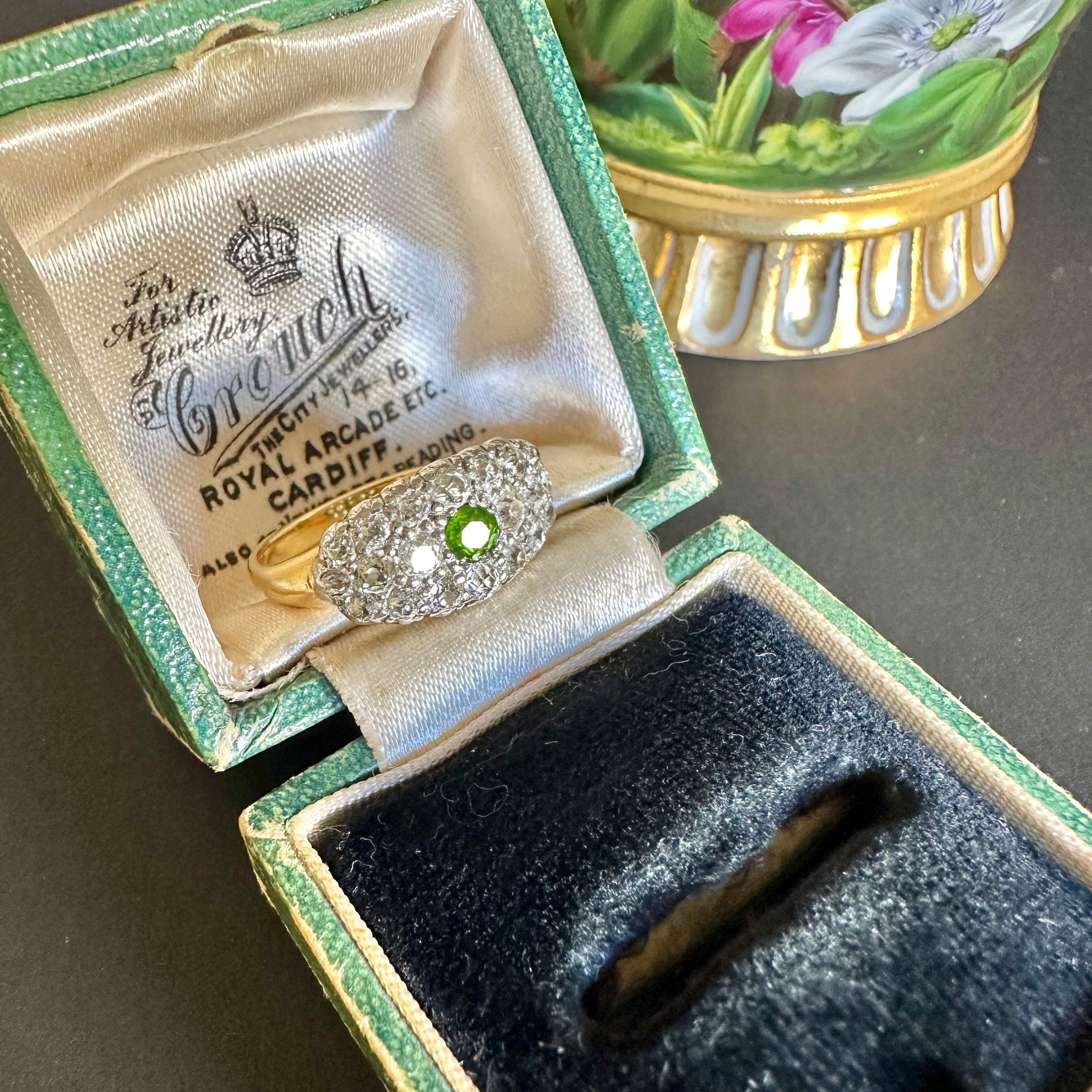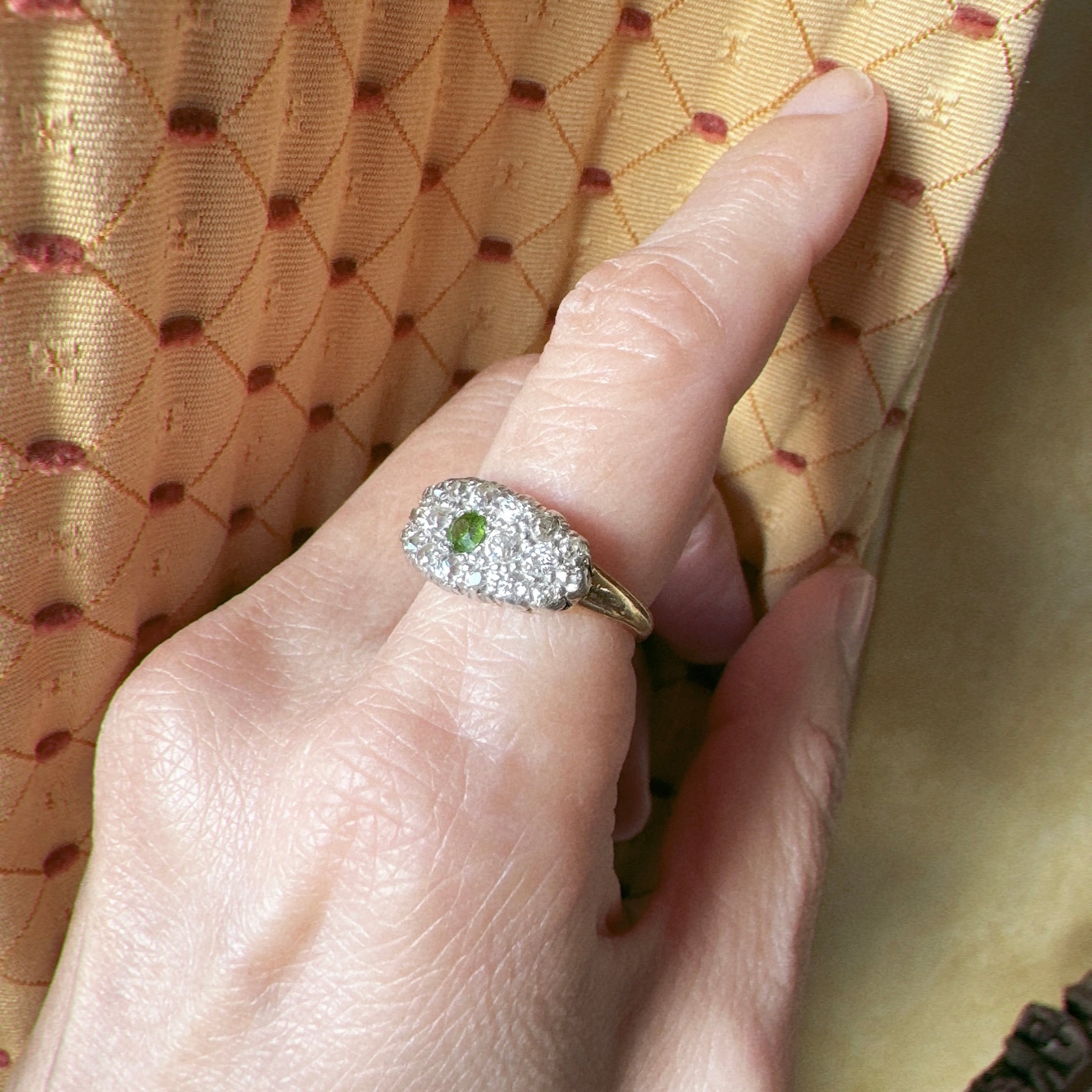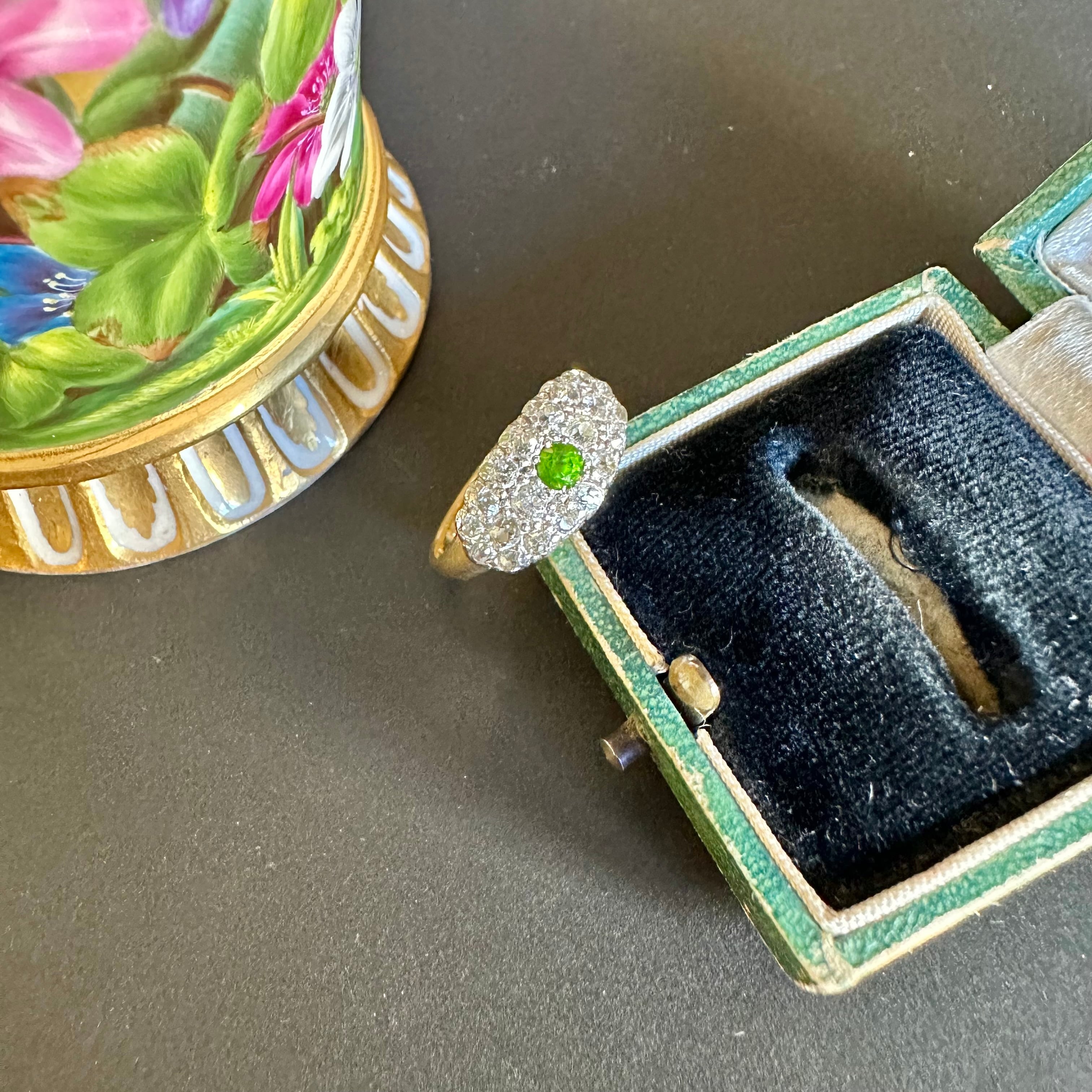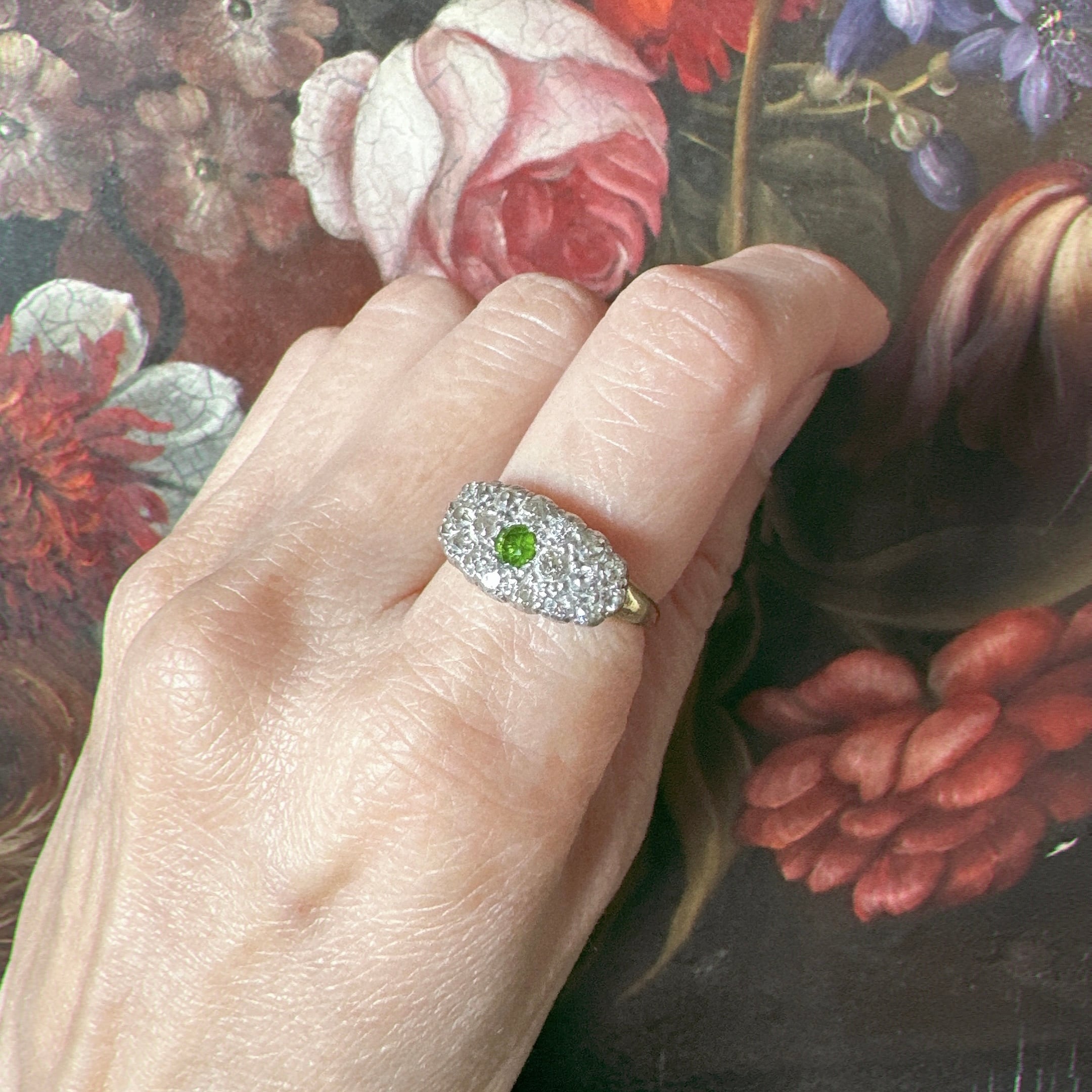 18金ゴールドとプラチナで仕立てられた、オープンキュレットのオールドカットダイヤモンドと、デマントイドガーネットを組み合わせたリング。