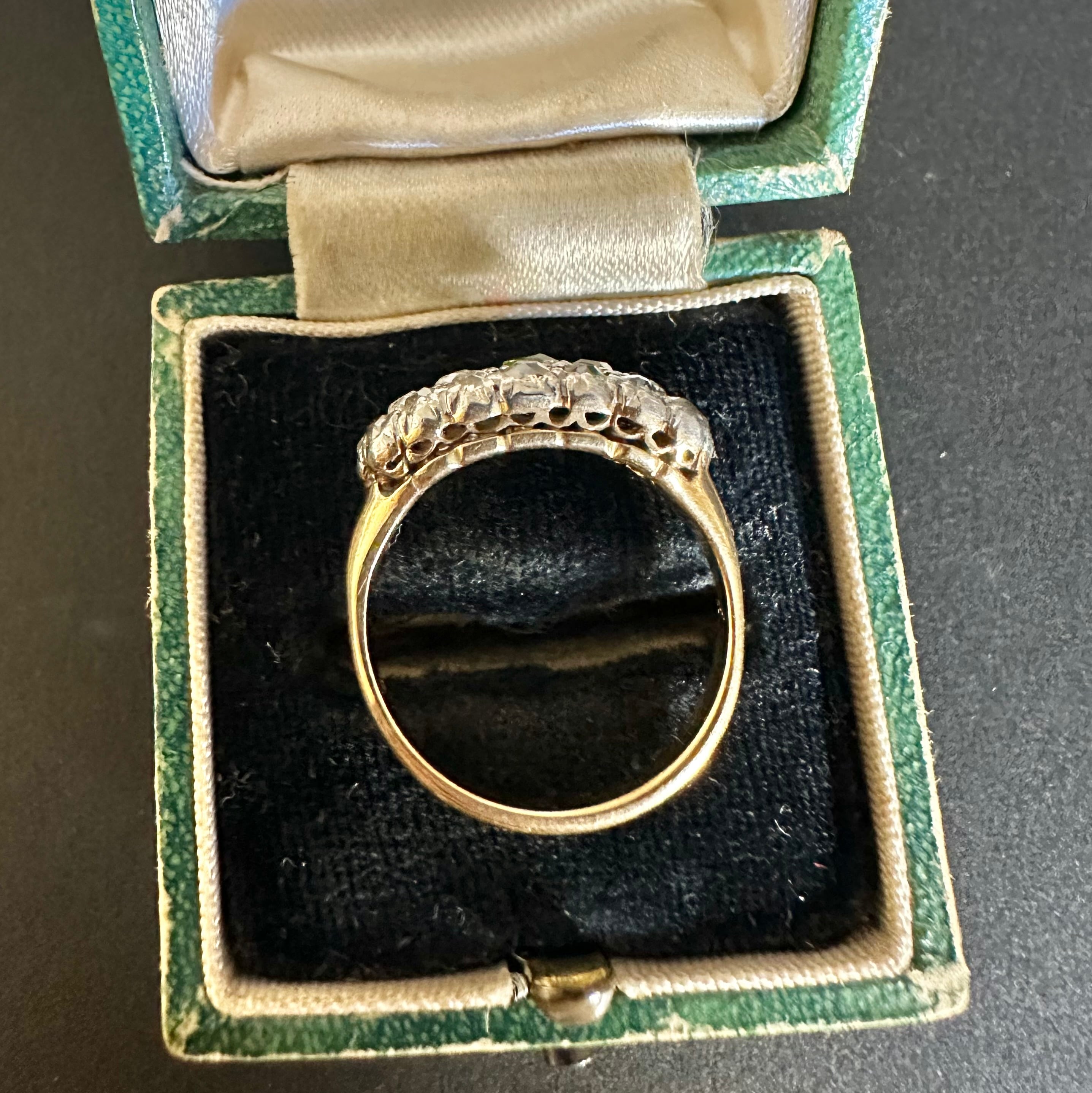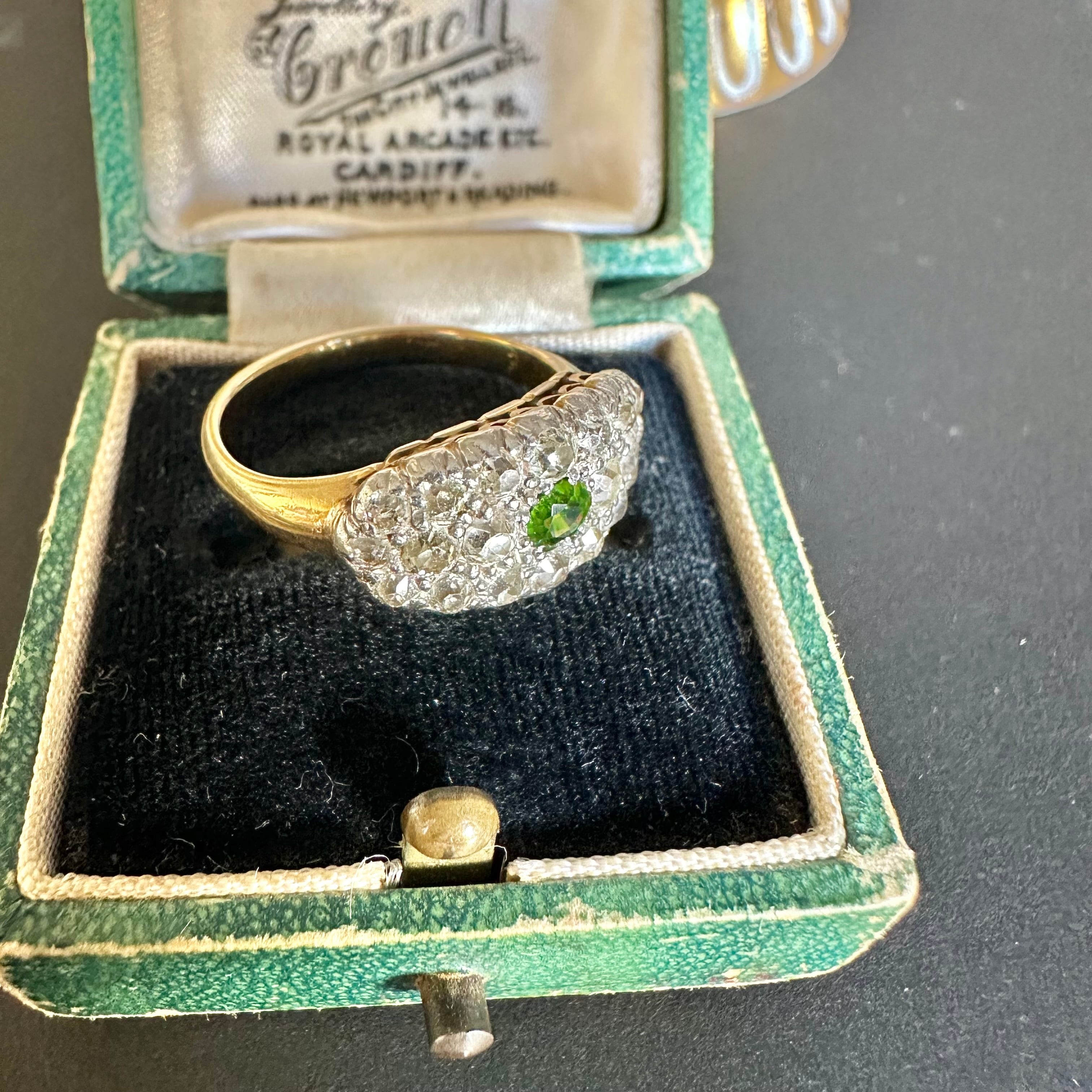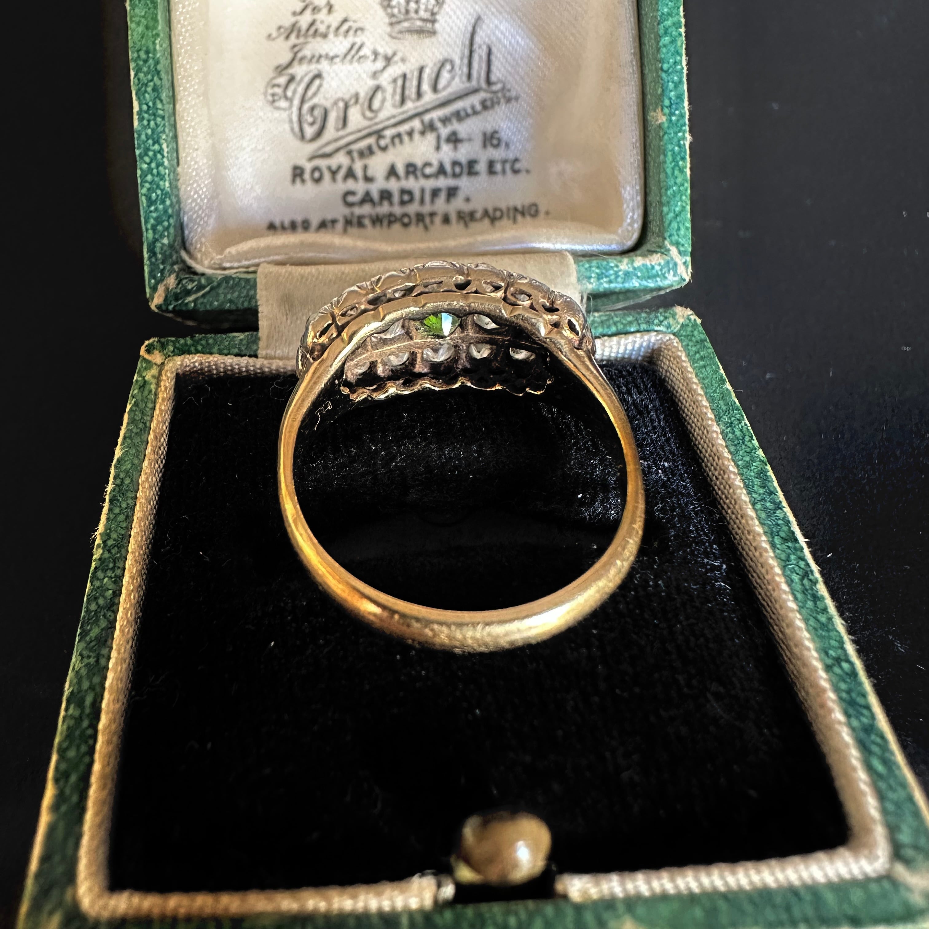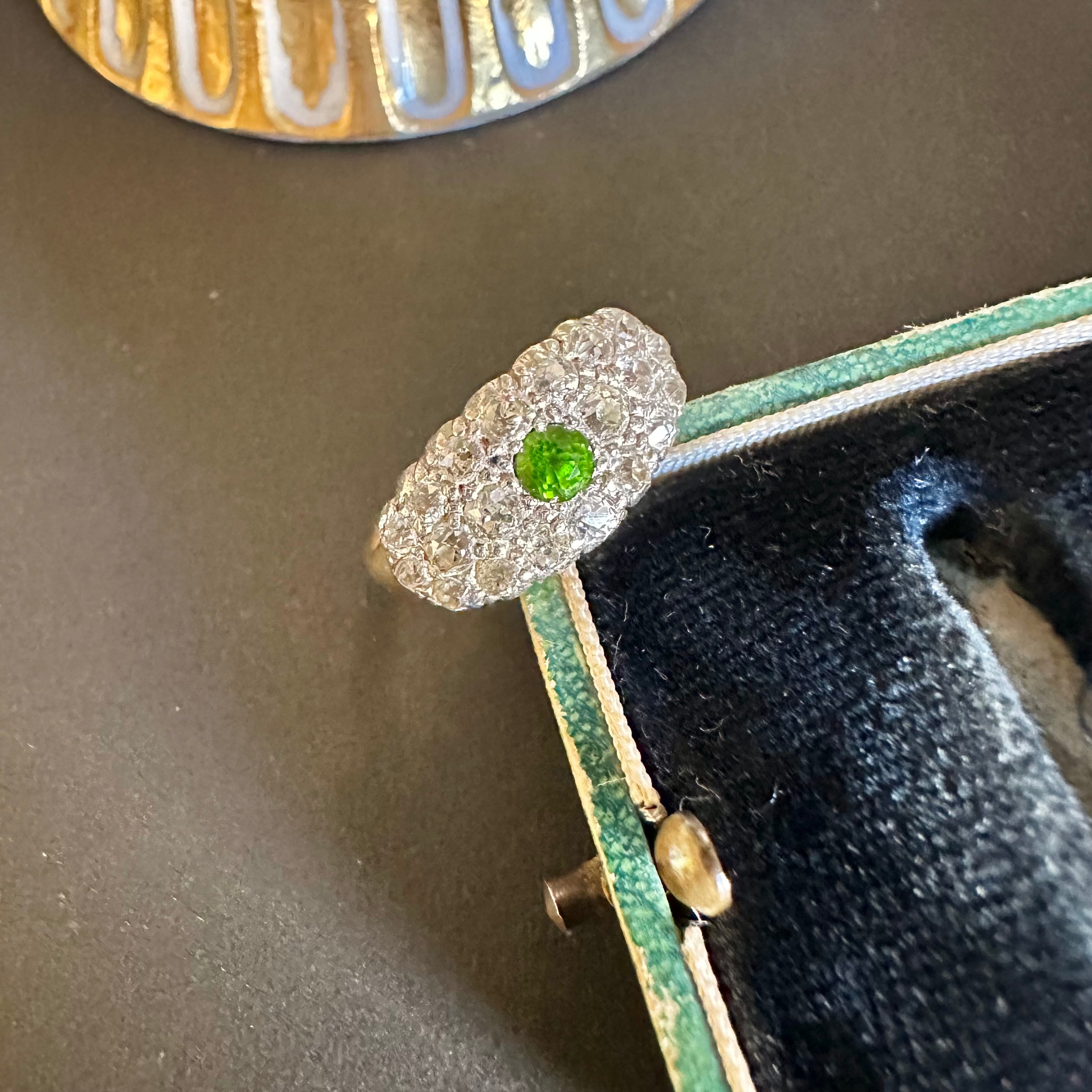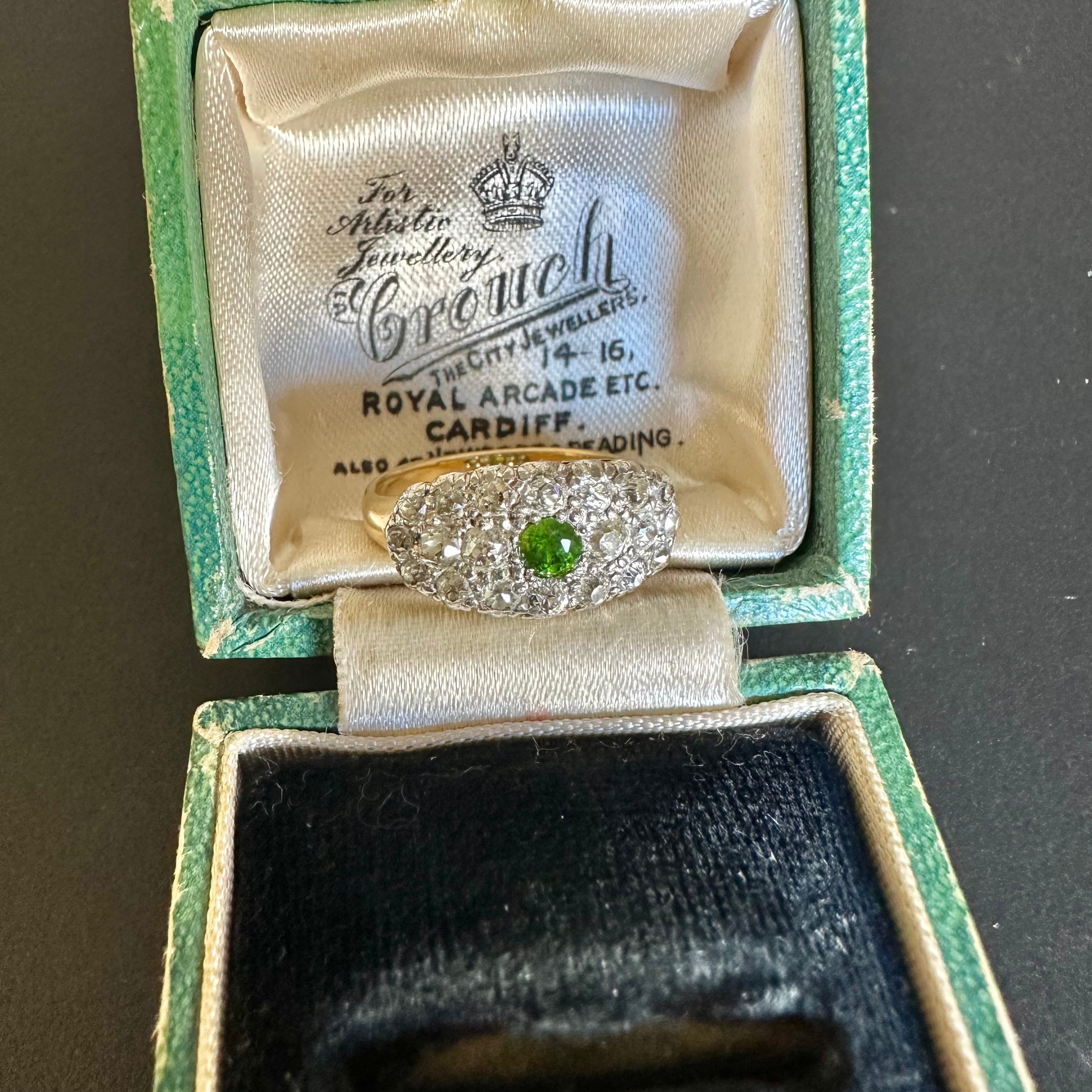 18金ゴールドとプラチナで仕立てられた、オープンキュレットのオールドカットダイヤモンドと、デマントイドガーネットを組み合わせたリング。