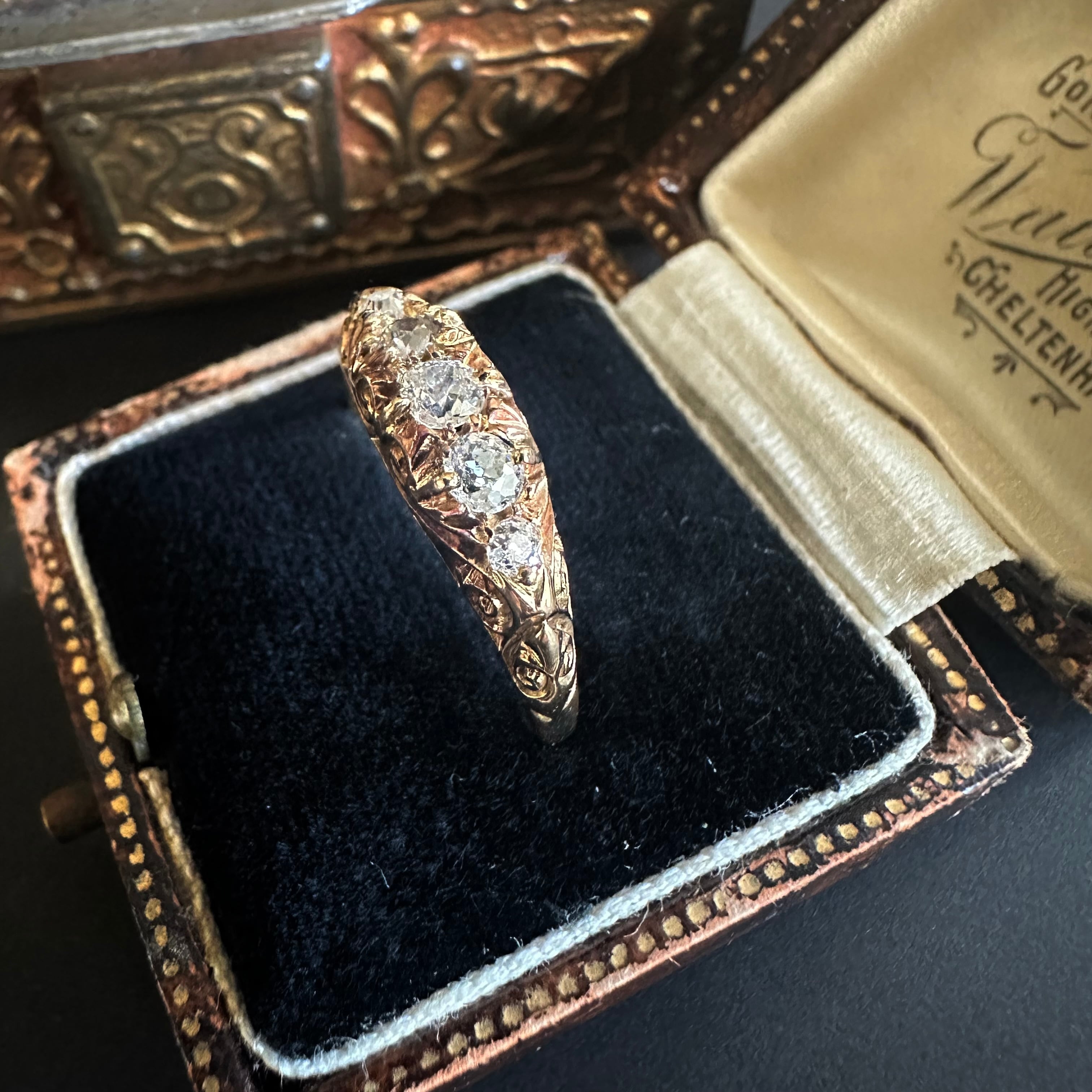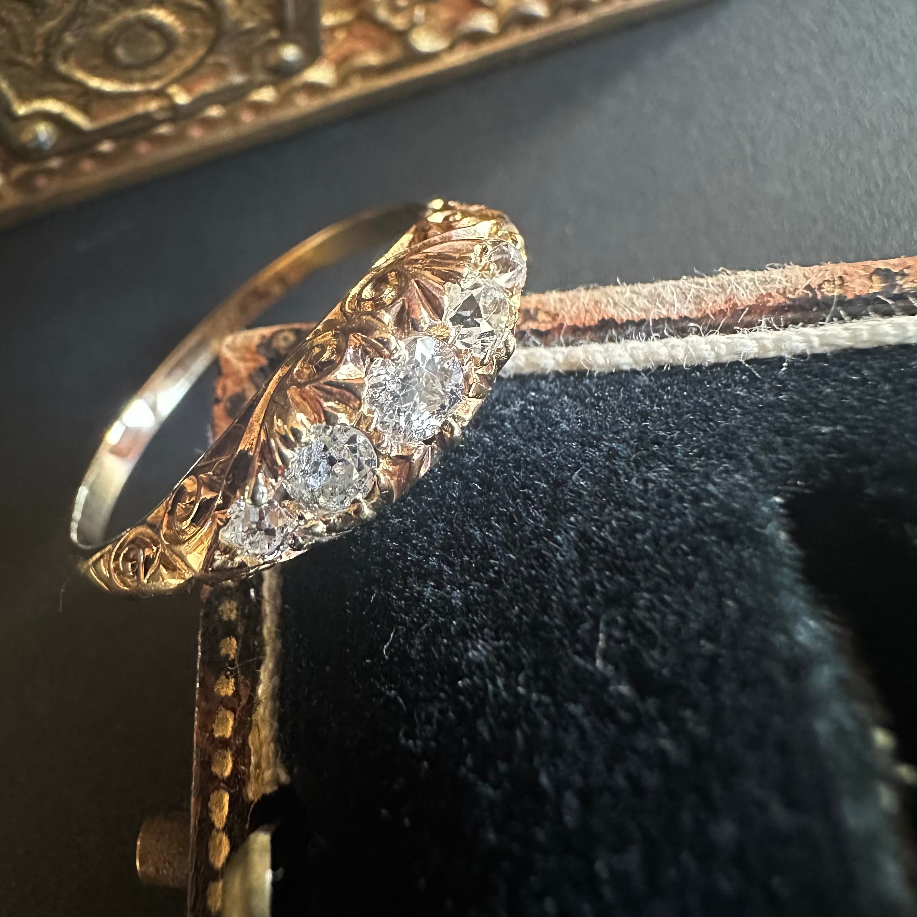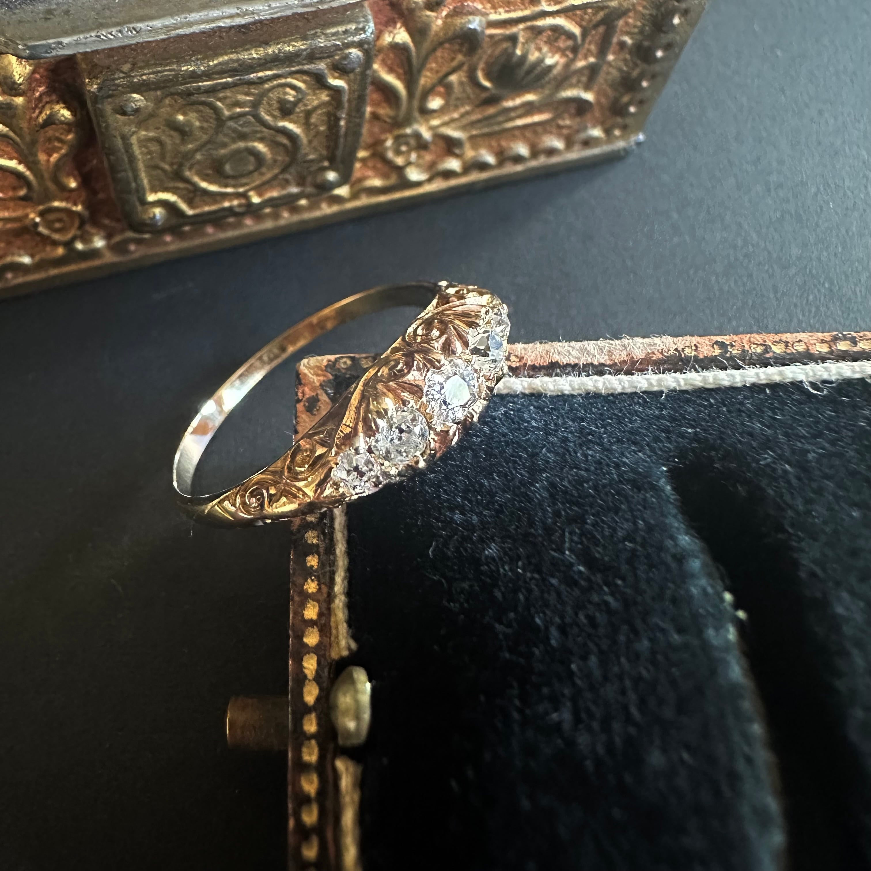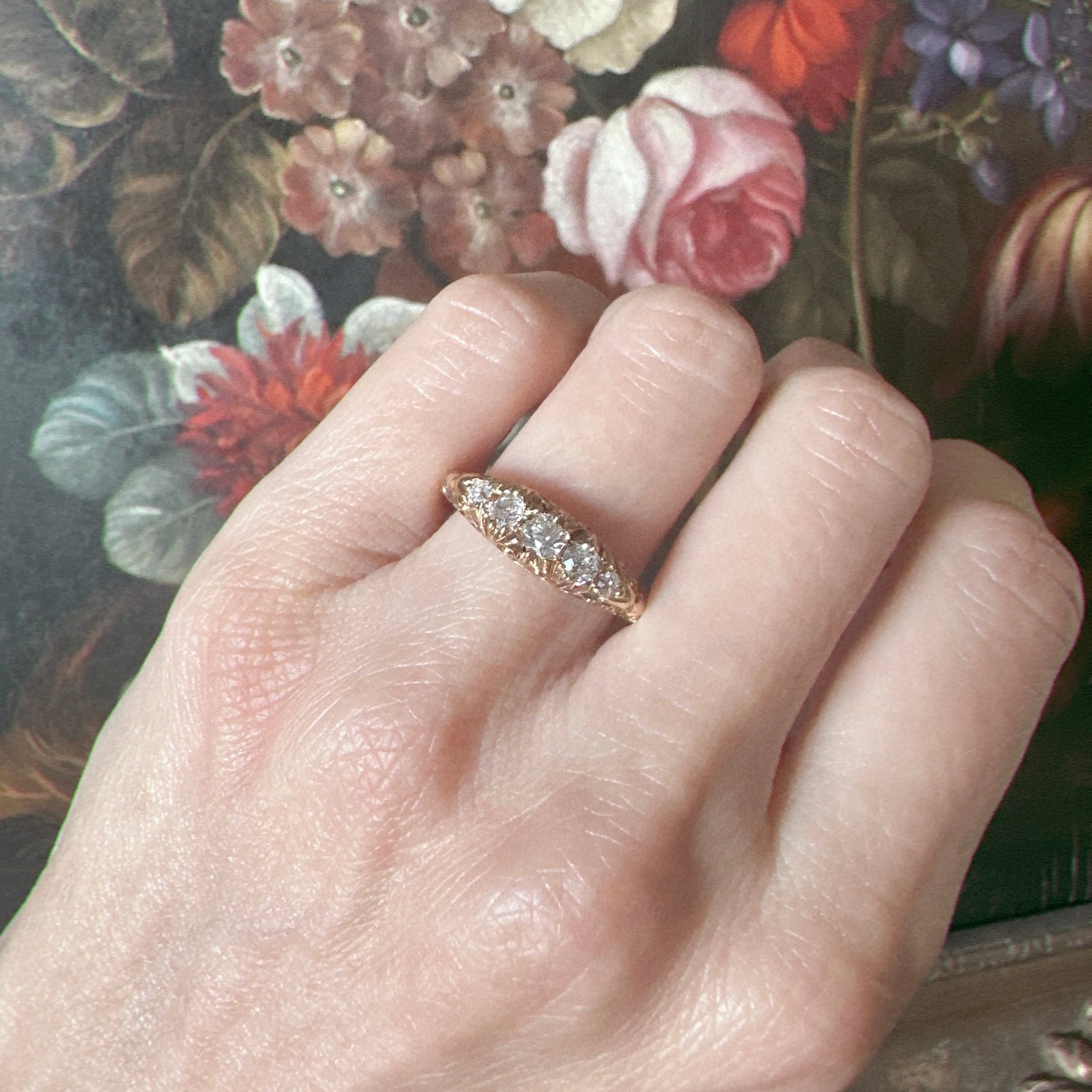 ファイブストーンリングという形式自体は19世紀後半から20世紀初頭にかけて記念や節目の贈り物として数多く作られた当時の定番で、現在も比較的多く残されています。おそらく、それと同じ感じなのでは?と思いますよね。でもその多くが量産を意識した均整の取れた石合わせや完璧に近い作りであるのに対し、このリングにはそうした規格化の気配がそこまで感じられず、むしろ機械化が進み始めた時代にあってなお手仕事の価値が色濃く残っていた、ヴィクトリアン後期からエドワーディアン初期という過渡期の美意識が凝縮されているように思えるのです。