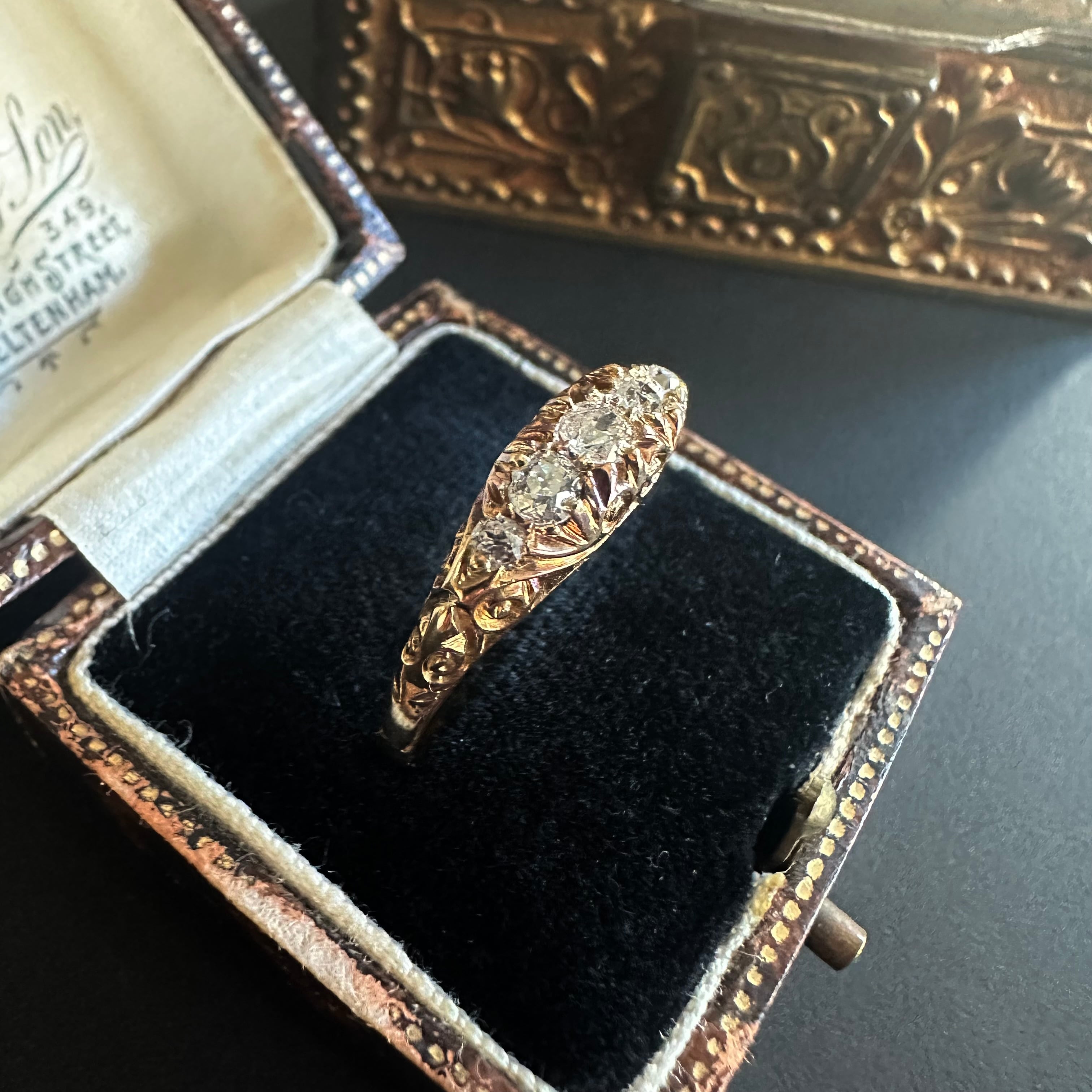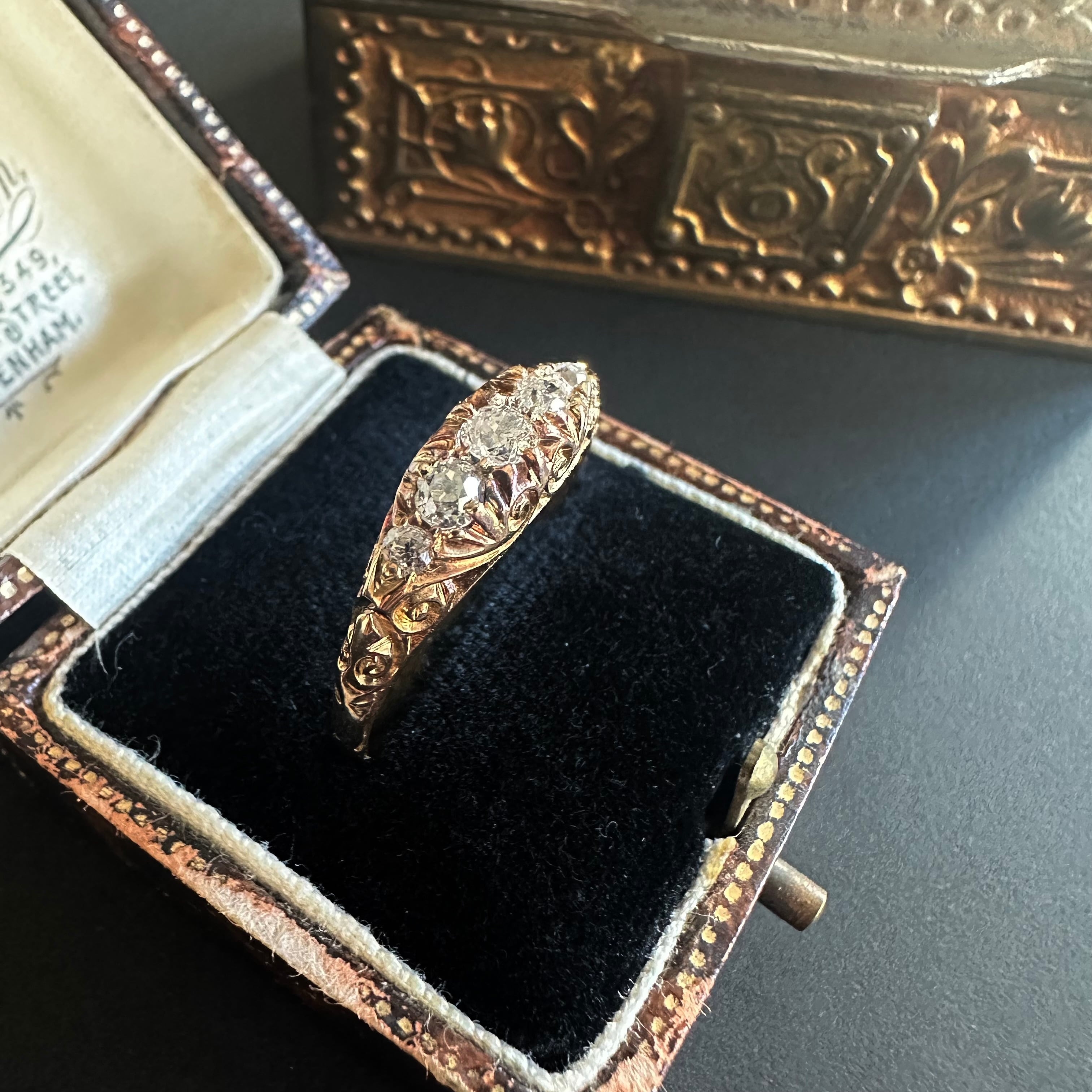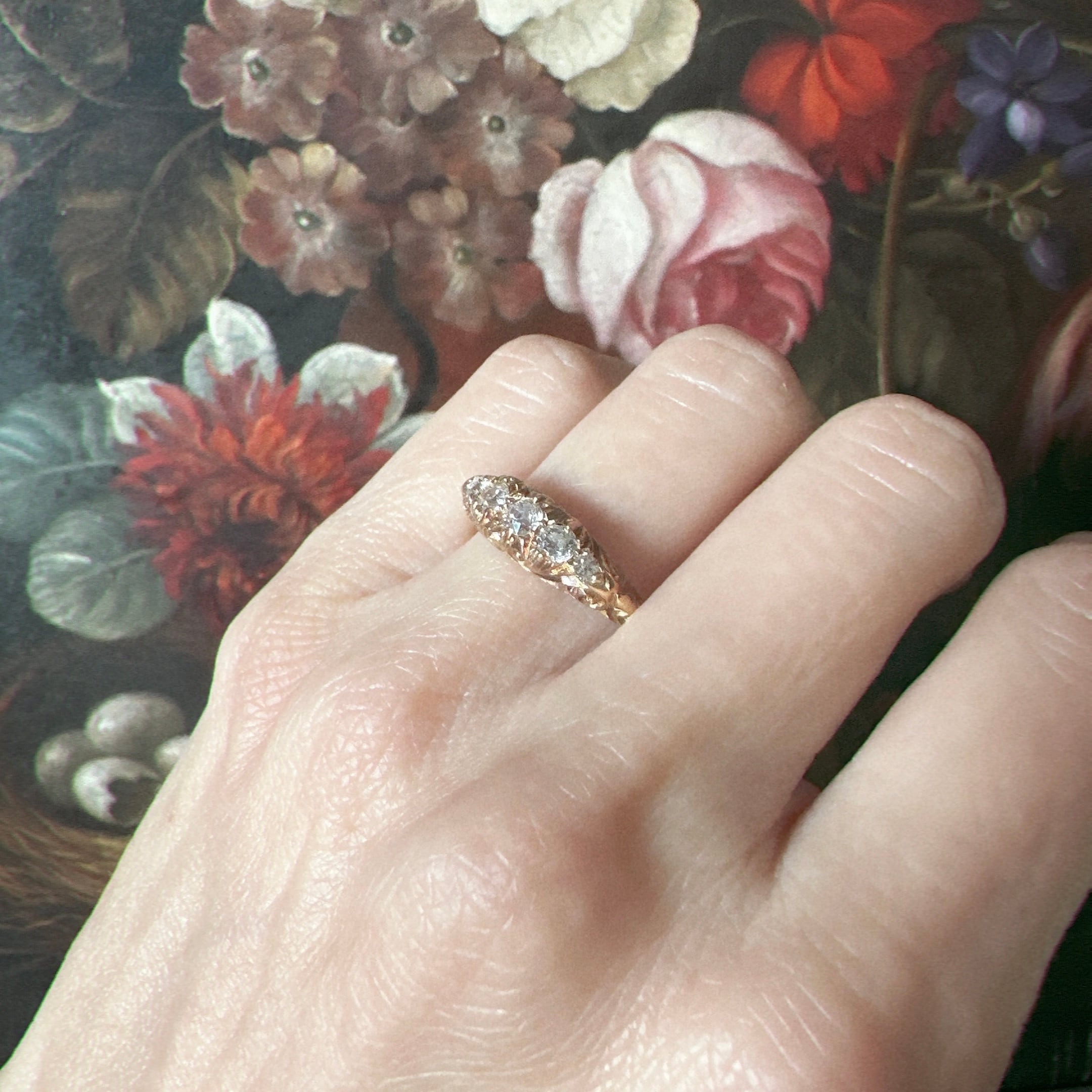 ファイブストーンリングという形式自体は19世紀後半から20世紀初頭にかけて記念や節目の贈り物として数多く作られた当時の定番で、現在も比較的多く残されています。おそらく、それと同じ感じなのでは?と思いますよね。でもその多くが量産を意識した均整の取れた石合わせや完璧に近い作りであるのに対し、このリングにはそうした規格化の気配がそこまで感じられず、むしろ機械化が進み始めた時代にあってなお手仕事の価値が色濃く残っていた、ヴィクトリアン後期からエドワーディアン初期という過渡期の美意識が凝縮されているように思えるのです。