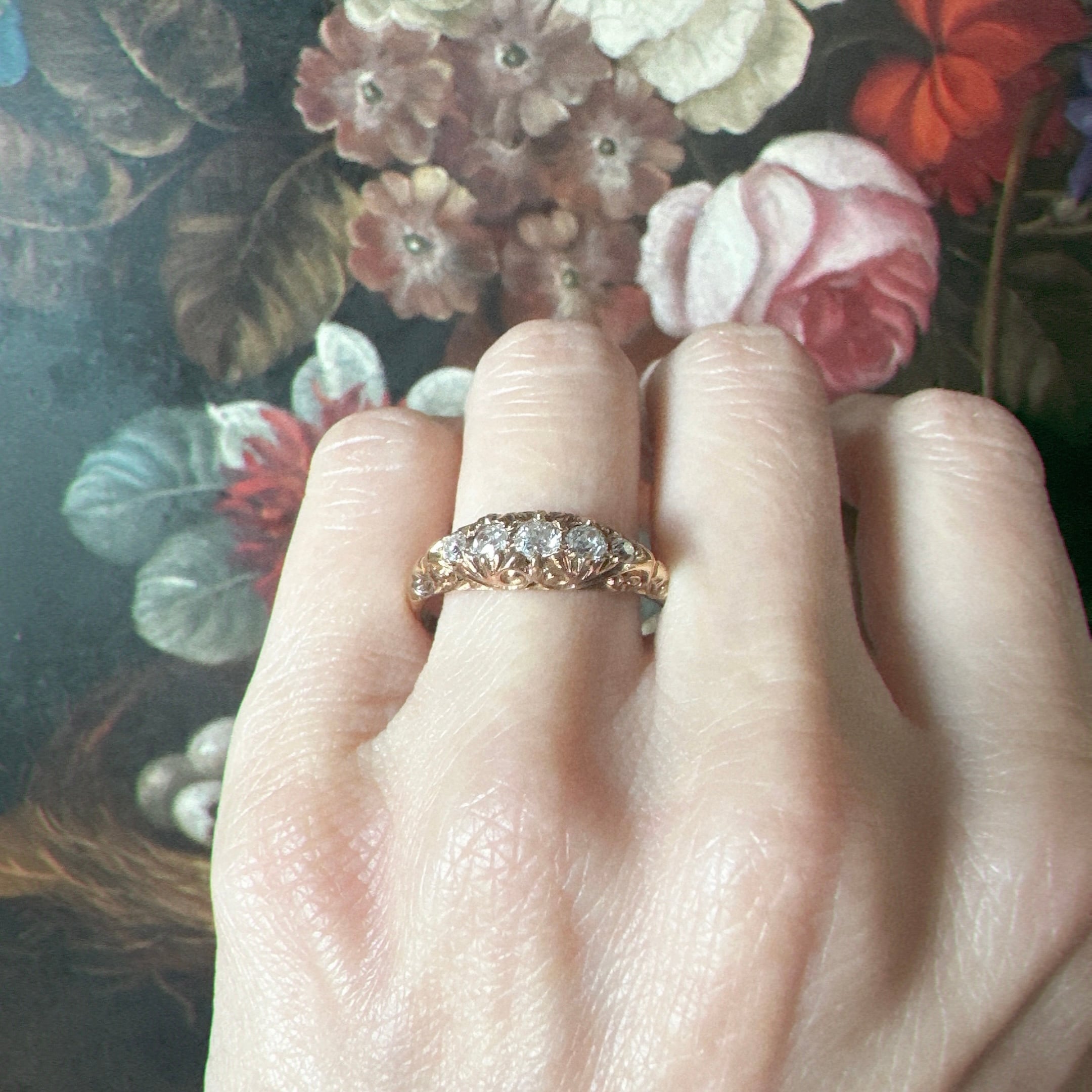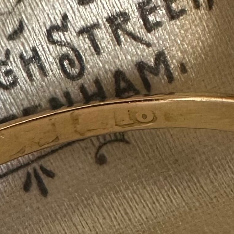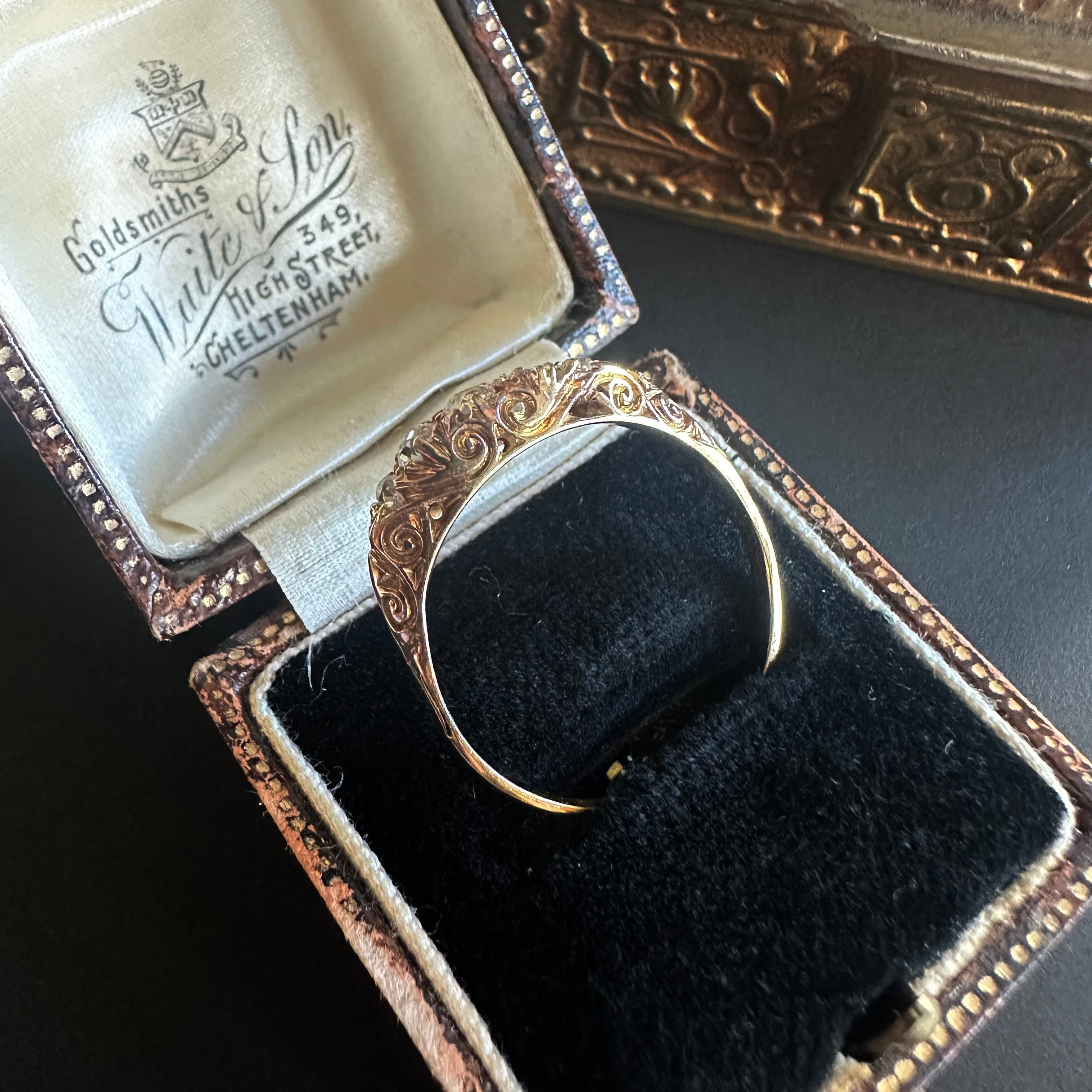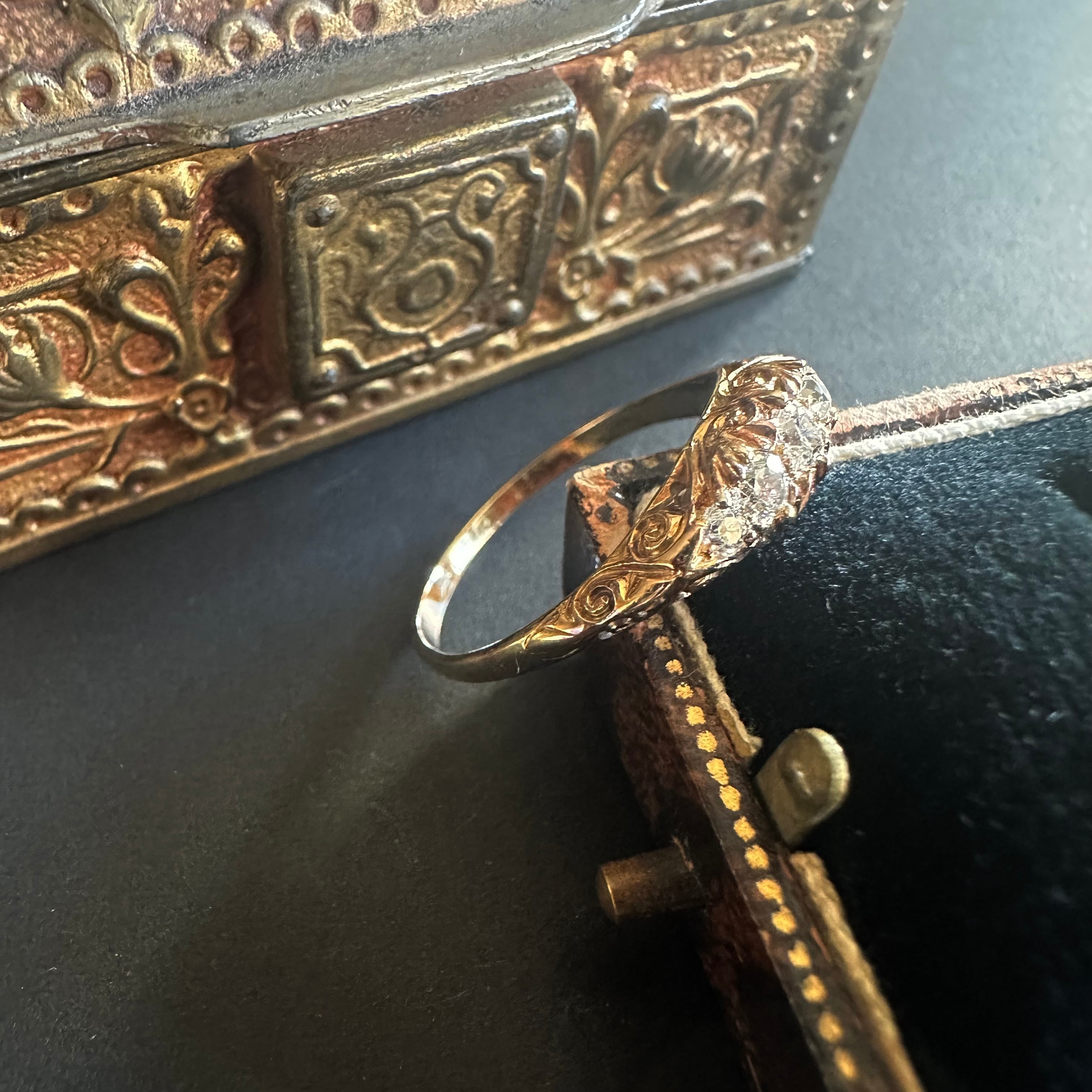 ファイブストーンリングという形式自体は19世紀後半から20世紀初頭にかけて記念や節目の贈り物として数多く作られた当時の定番で、現在も比較的多く残されています。おそらく、それと同じ感じなのでは?と思いますよね。でもその多くが量産を意識した均整の取れた石合わせや完璧に近い作りであるのに対し、このリングにはそうした規格化の気配がそこまで感じられず、むしろ機械化が進み始めた時代にあってなお手仕事の価値が色濃く残っていた、ヴィクトリアン後期からエドワーディアン初期という過渡期の美意識が凝縮されているように思えるのです。