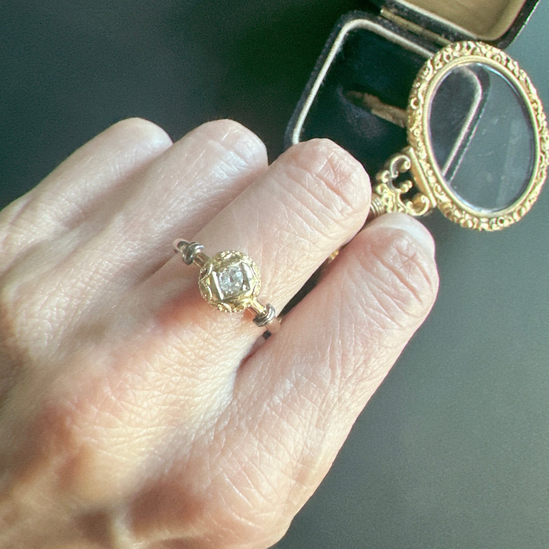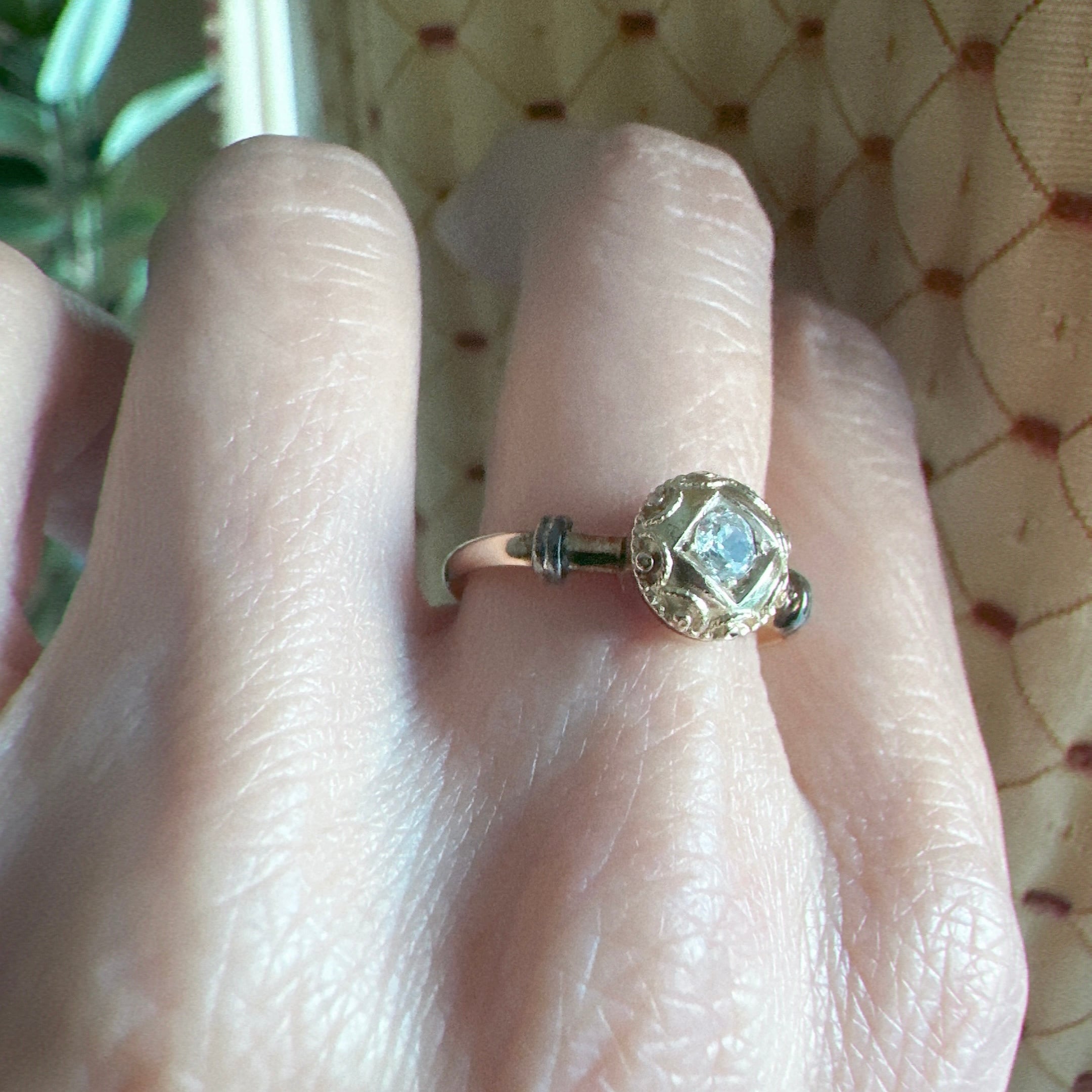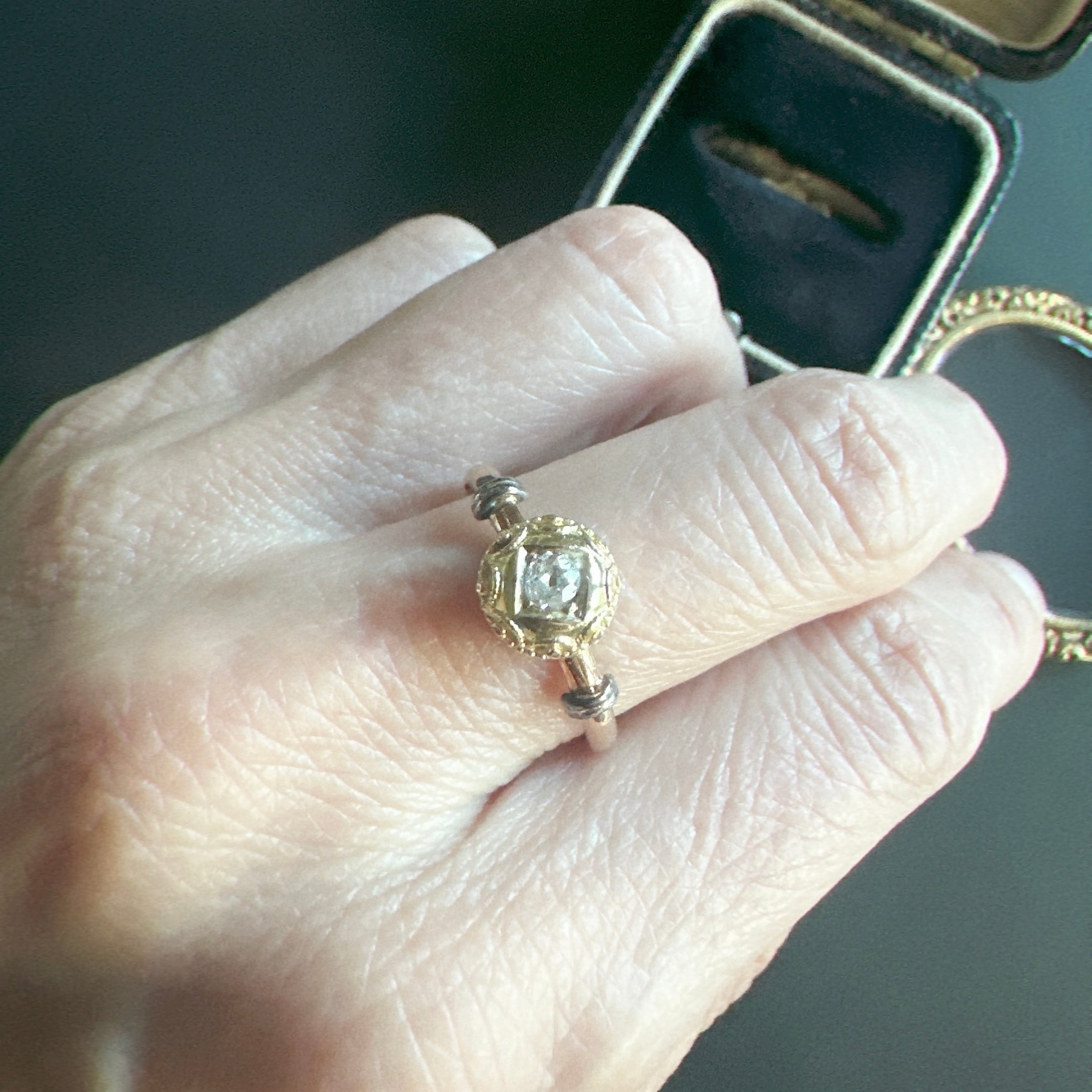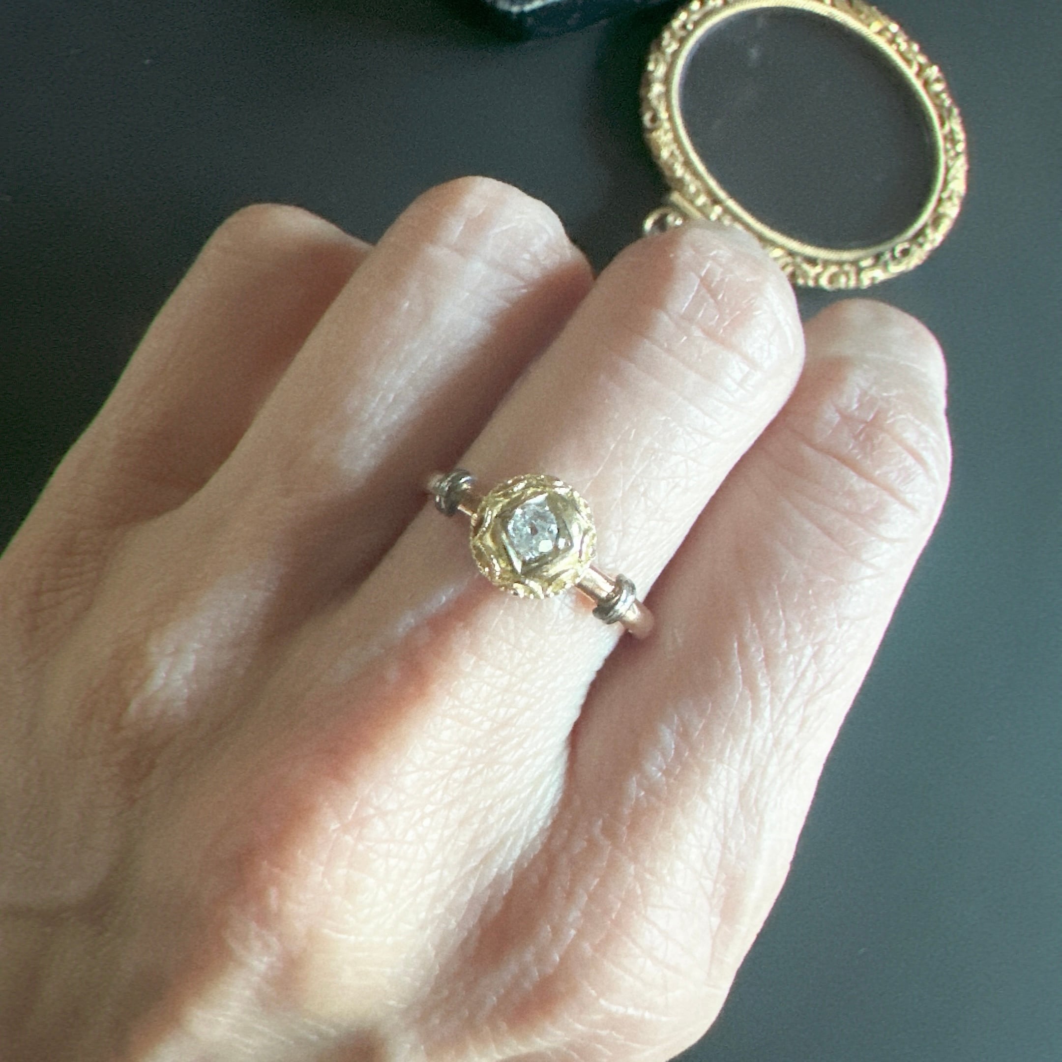 中心にセットされたオープンキュレットのオールドカットダイヤモンドは先にも述べたように、ブリリアントカットが主流だった時代に、用いられたその柔らかな輝きは、丸みのあるデザインと美しく調和し、どこか時代を超えた不思議な空気を漂わせています。アンティークではないけれど、過去への憧れとヴィンテージならではの美しさが共存した、魅力的なひと品に感じて買い付けました。共感頂けると嬉しいです。