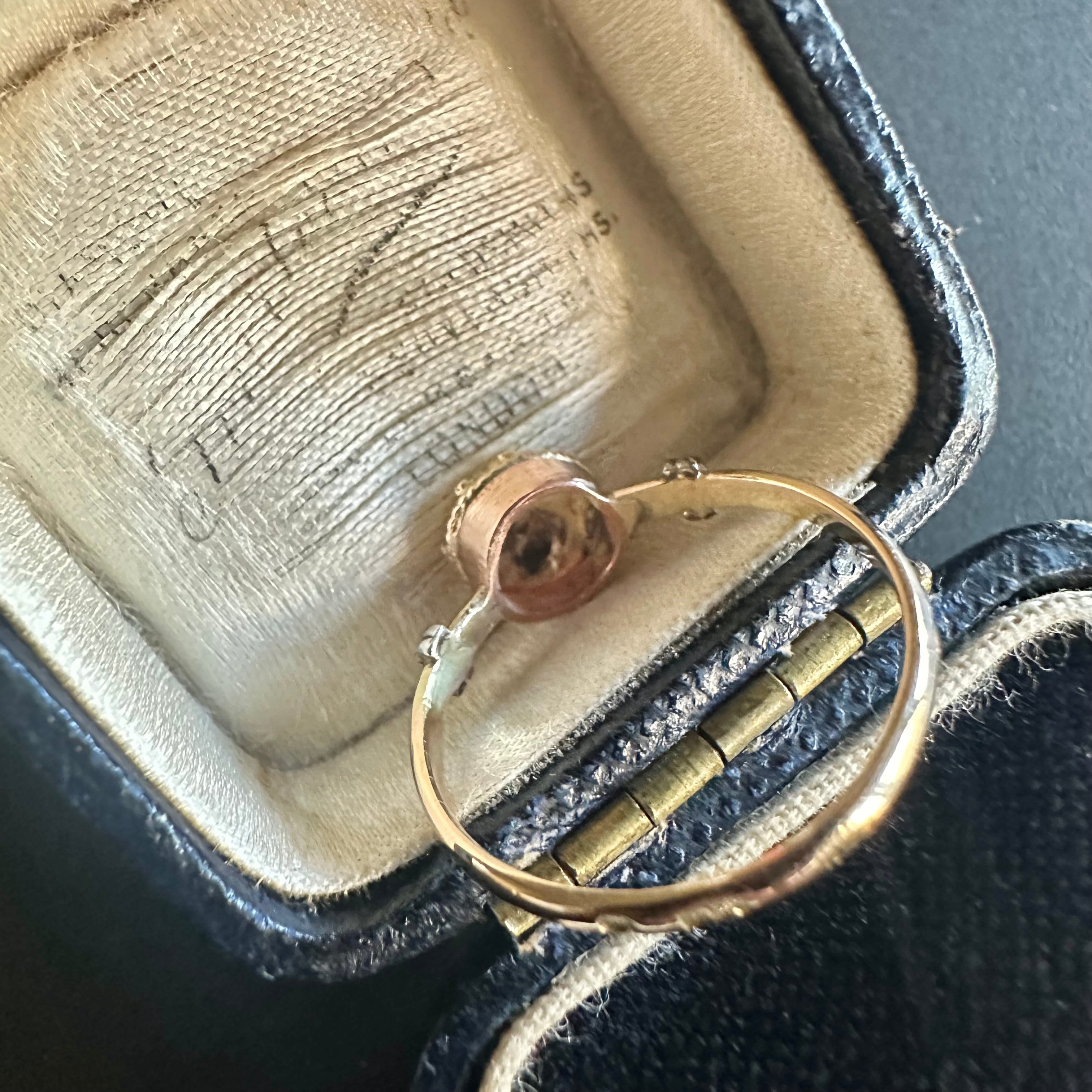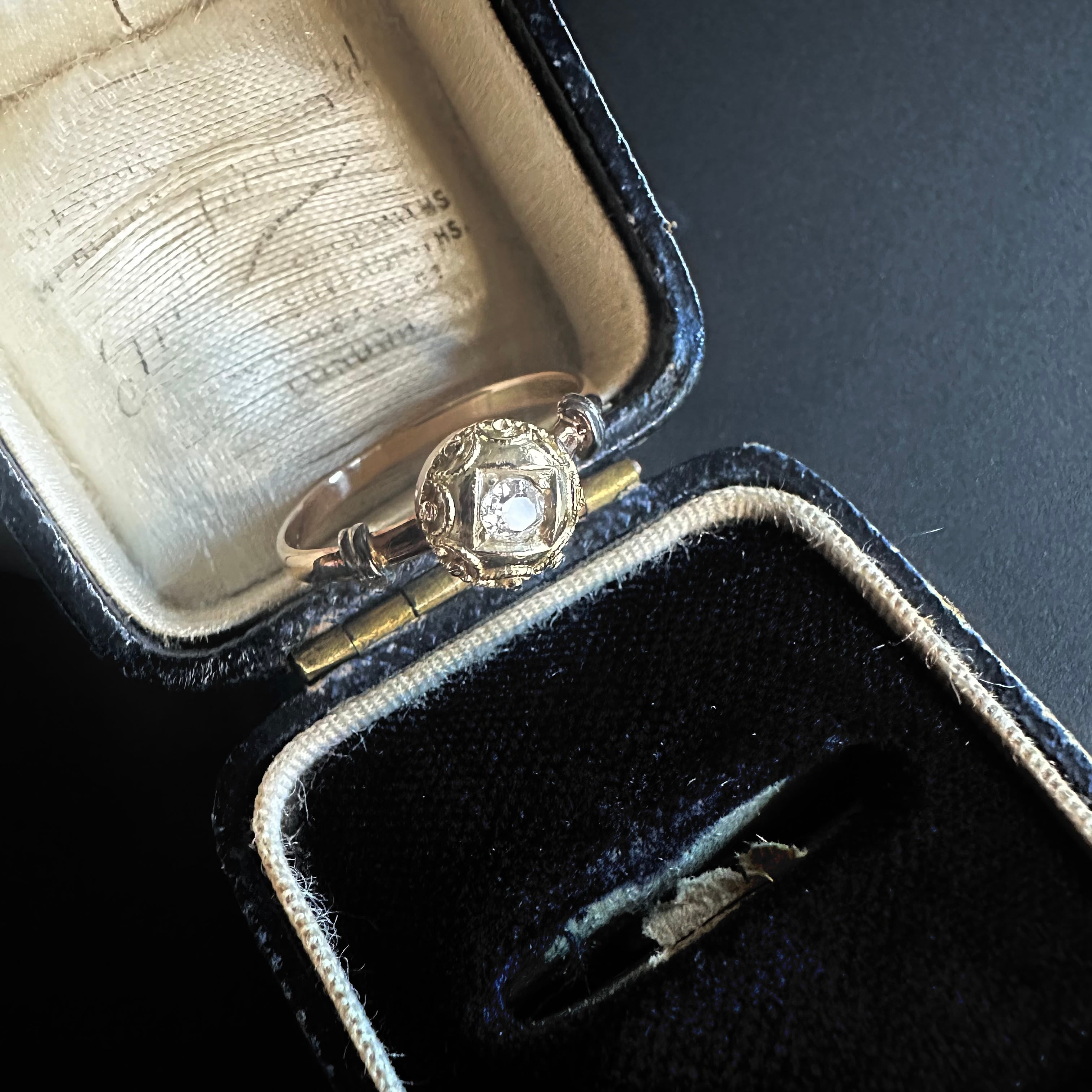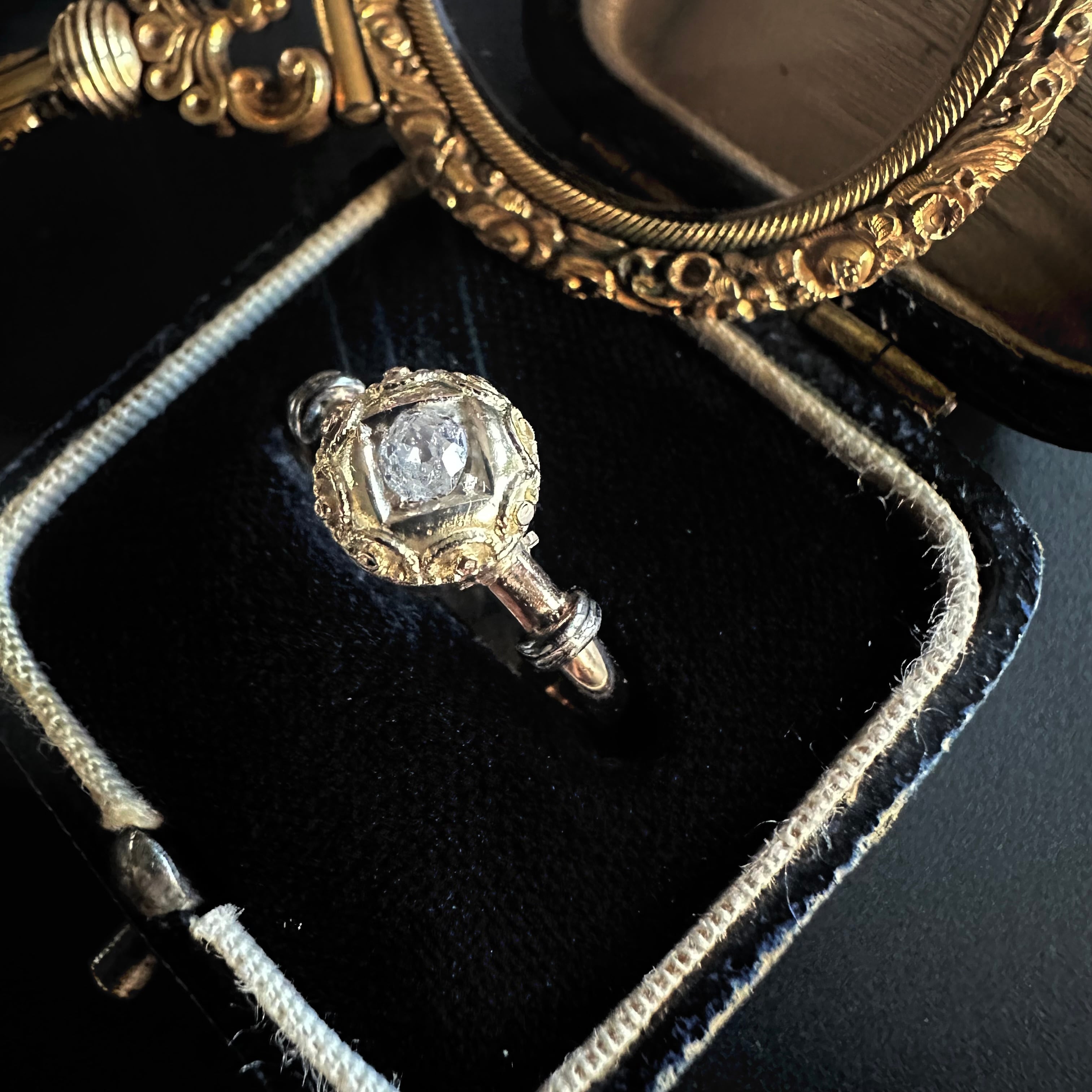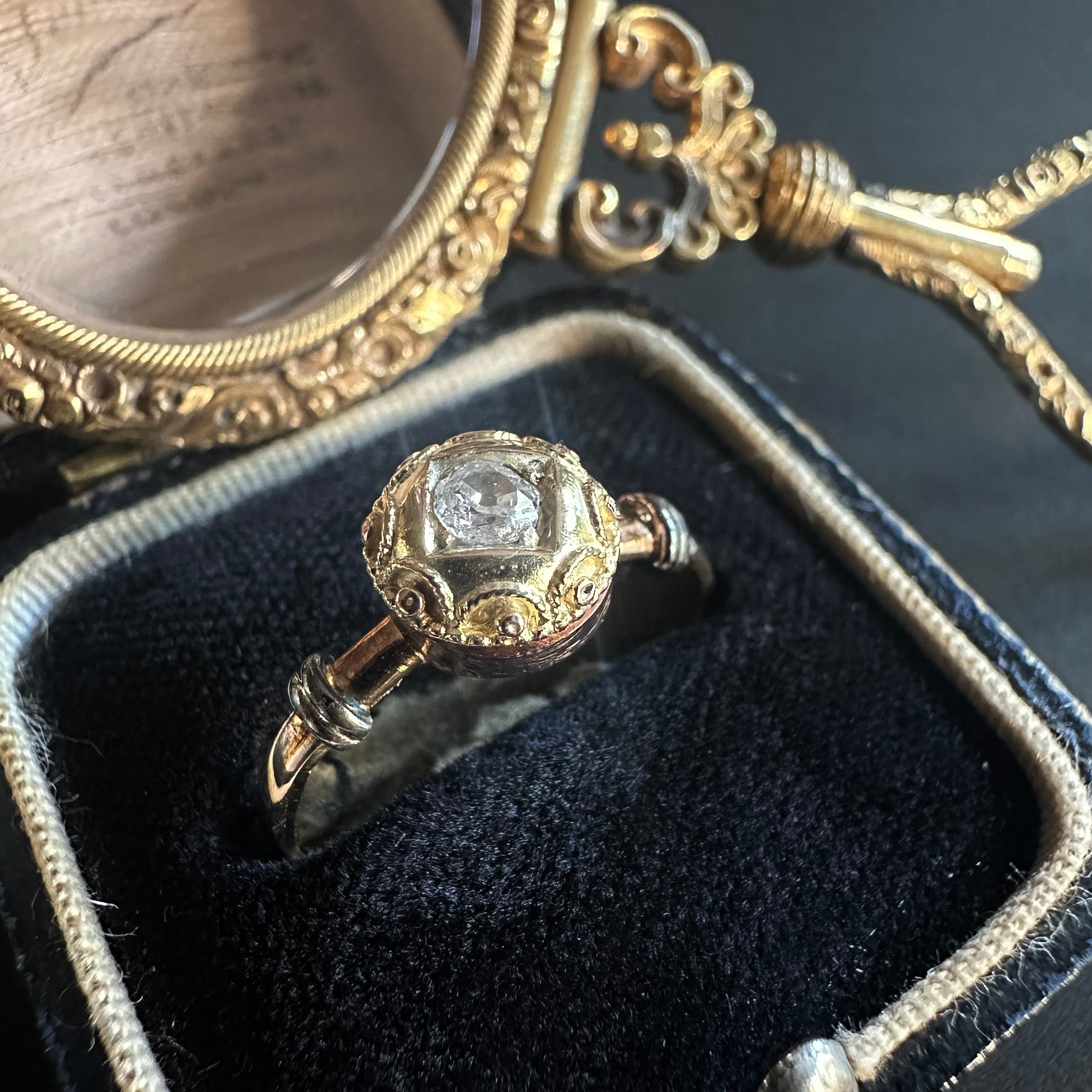 中心にセットされたオープンキュレットのオールドカットダイヤモンドは先にも述べたように、ブリリアントカットが主流だった時代に、用いられたその柔らかな輝きは、丸みのあるデザインと美しく調和し、どこか時代を超えた不思議な空気を漂わせています。アンティークではないけれど、過去への憧れとヴィンテージならではの美しさが共存した、魅力的なひと品に感じて買い付けました。共感頂けると嬉しいです。