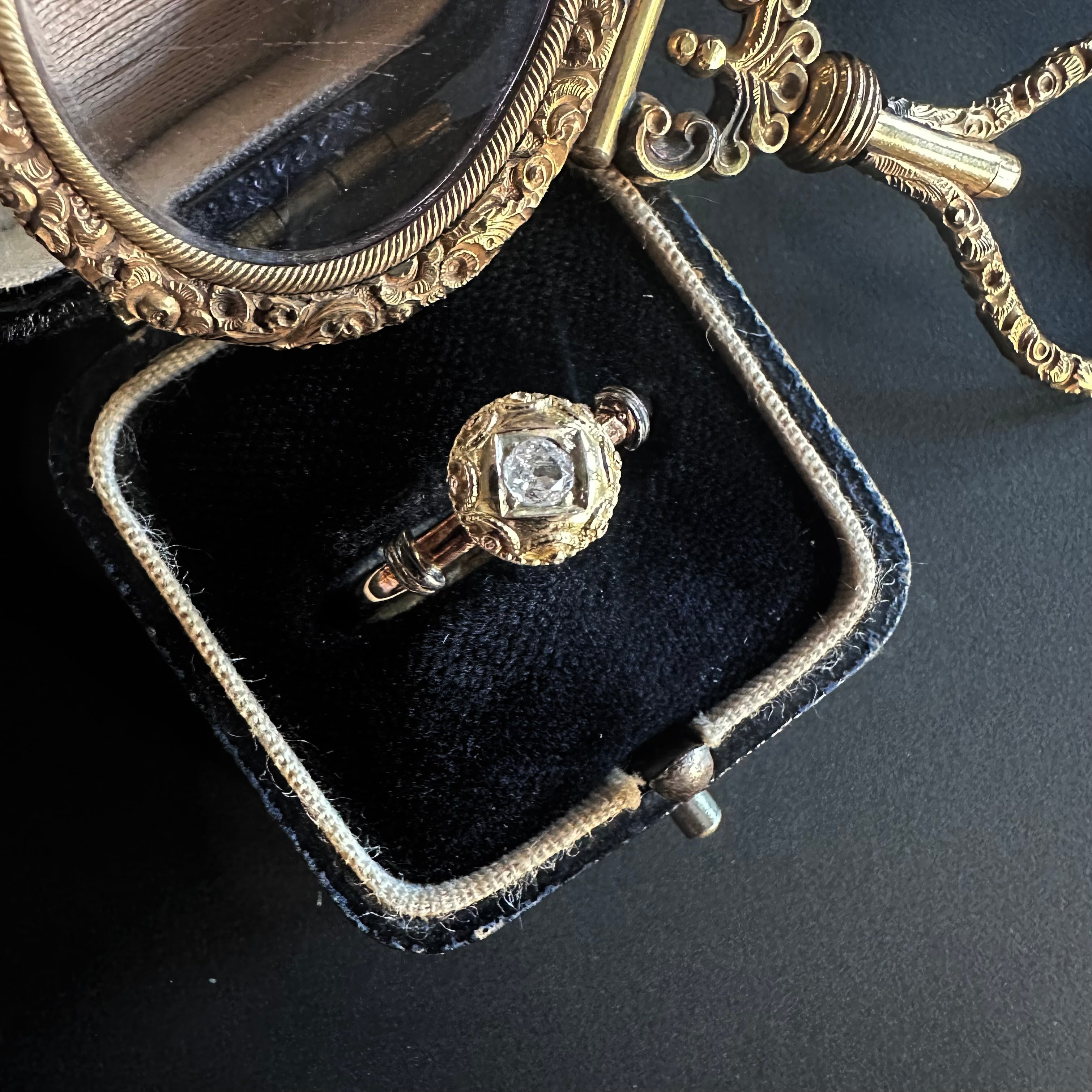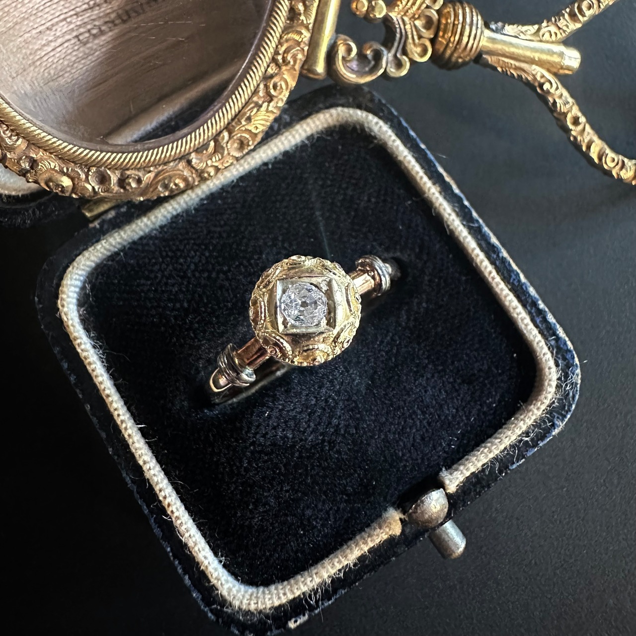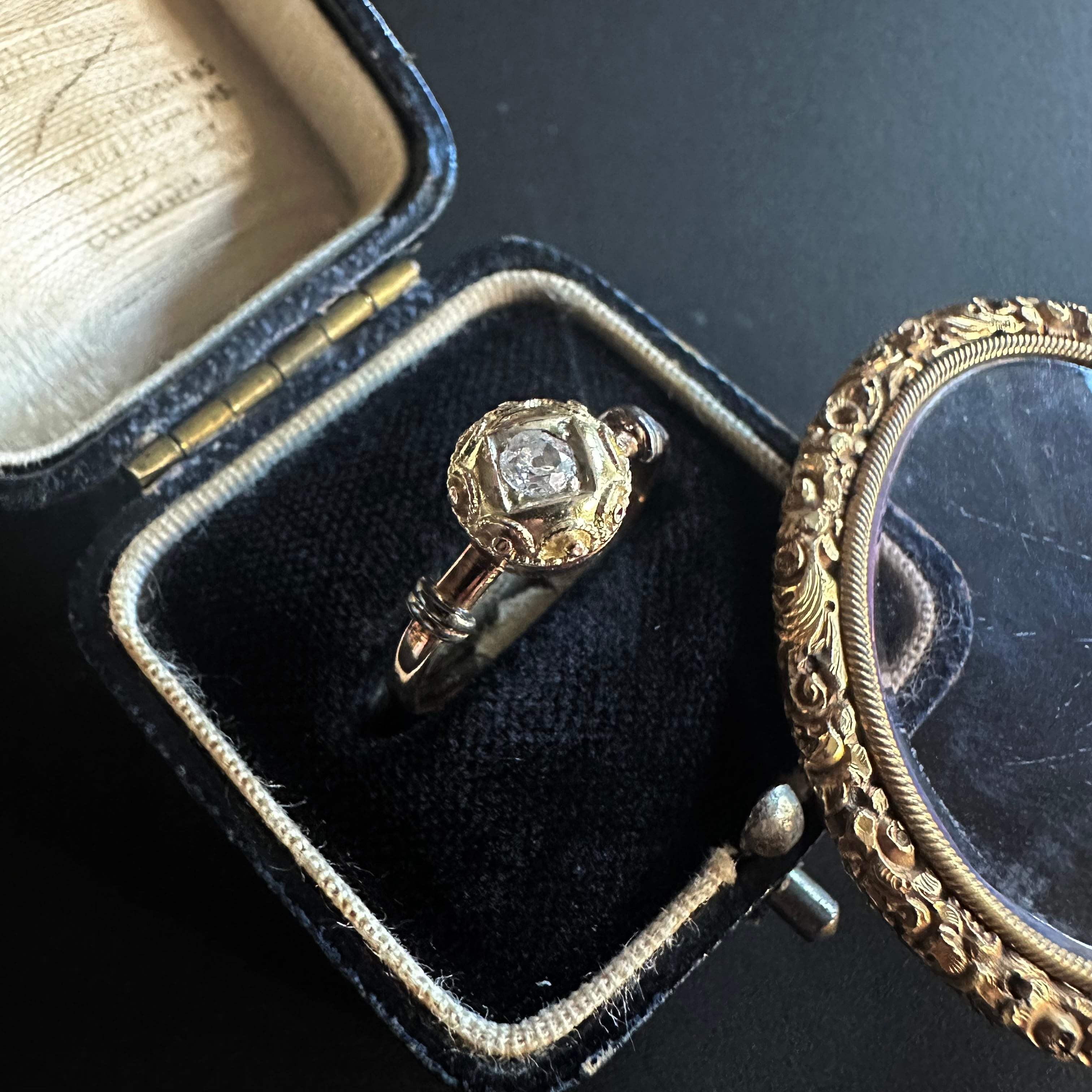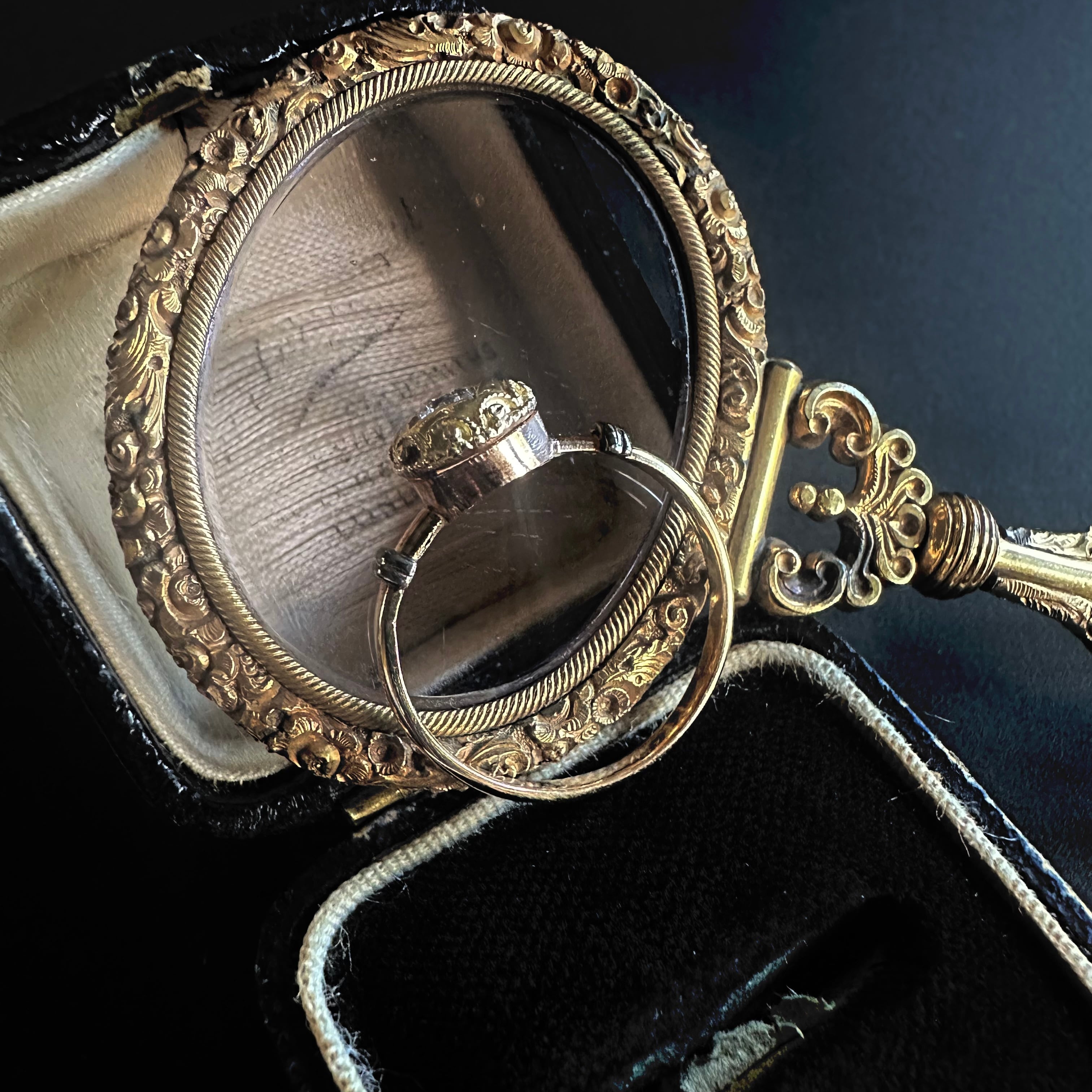 中心にセットされたオープンキュレットのオールドカットダイヤモンドは先にも述べたように、ブリリアントカットが主流だった時代に、用いられたその柔らかな輝きは、丸みのあるデザインと美しく調和し、どこか時代を超えた不思議な空気を漂わせています。アンティークではないけれど、過去への憧れとヴィンテージならではの美しさが共存した、魅力的なひと品に感じて買い付けました。共感頂けると嬉しいです。