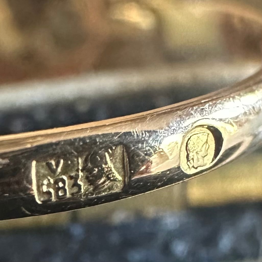 刻印から1960年代以降の物と考えられ、戦後の制約の多い時代に、職人が工夫を凝らして生み出したことがうかがえます。第二次世界大戦後、ポーランドは社会主義体制で、政治的にも経済的にも大きな制約を受けていました。物資は不足し、贅沢品とされるジュエリーの制作も自由ではありませんでした。新しいブリリアントカットのダイヤモンドが簡単に手に入らない状況で、過去の石を大切に使い、そこに新たなデザインを与える。華美ではないけれど、どこか詩的。そうしたところが、このリングの不思議な雰囲気につながっています。