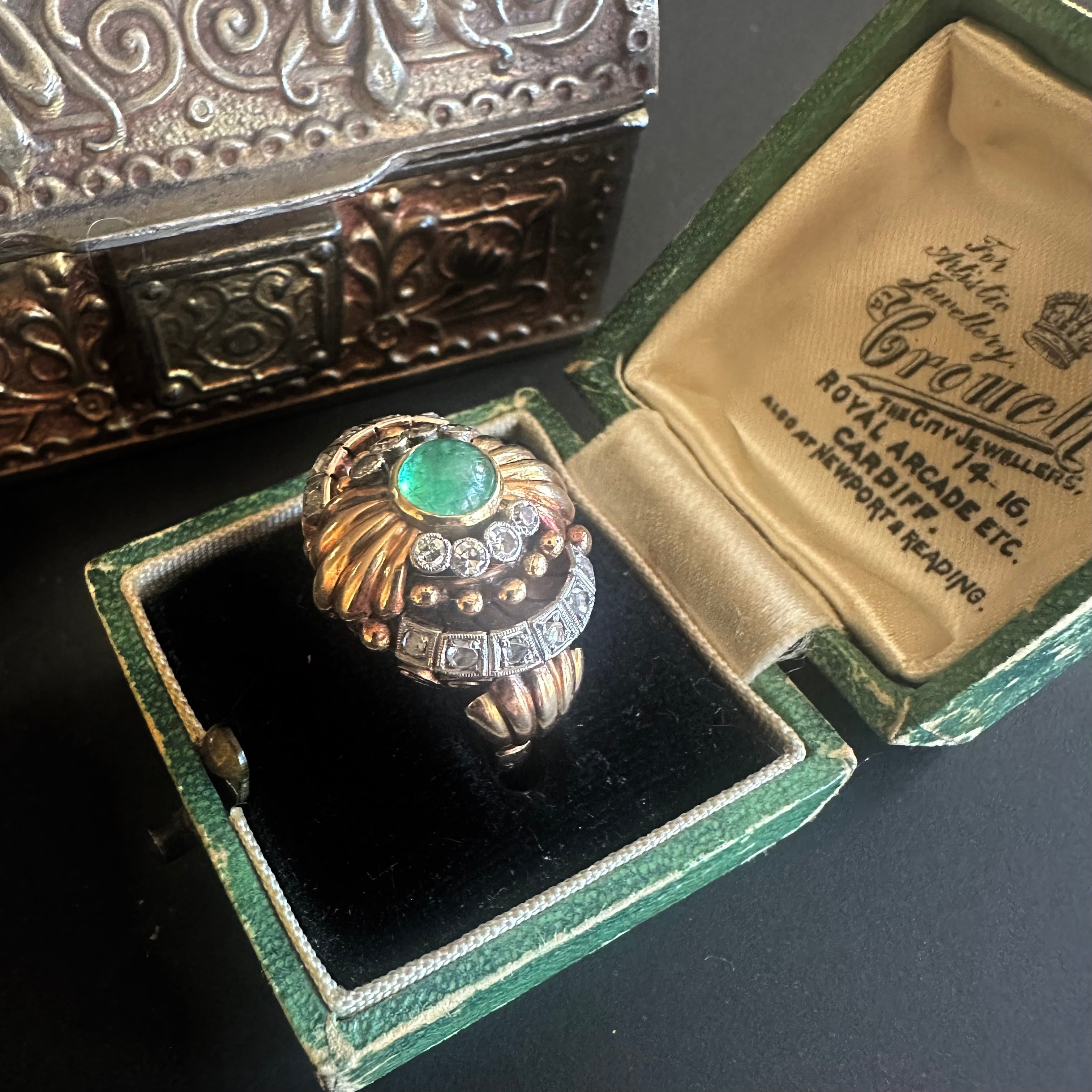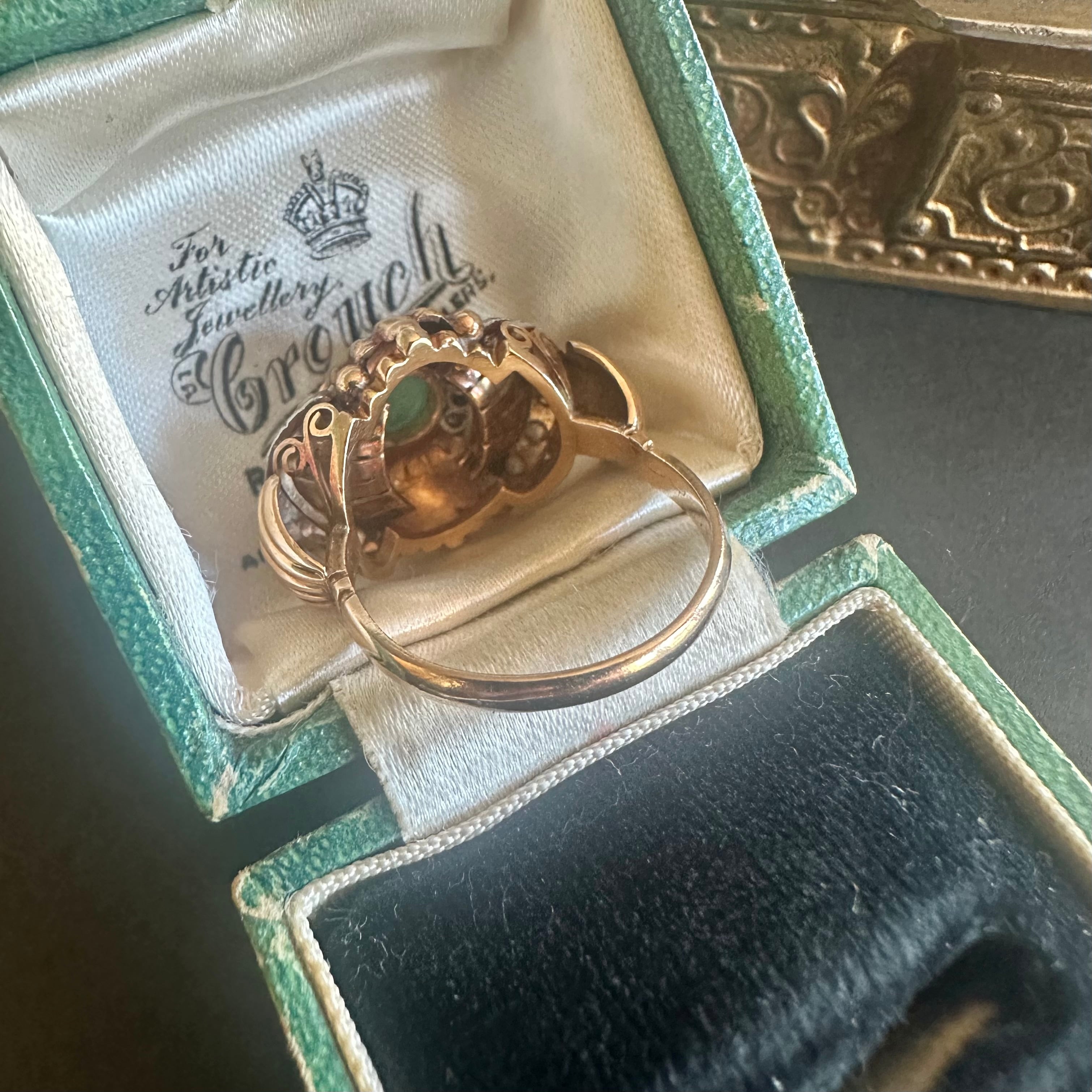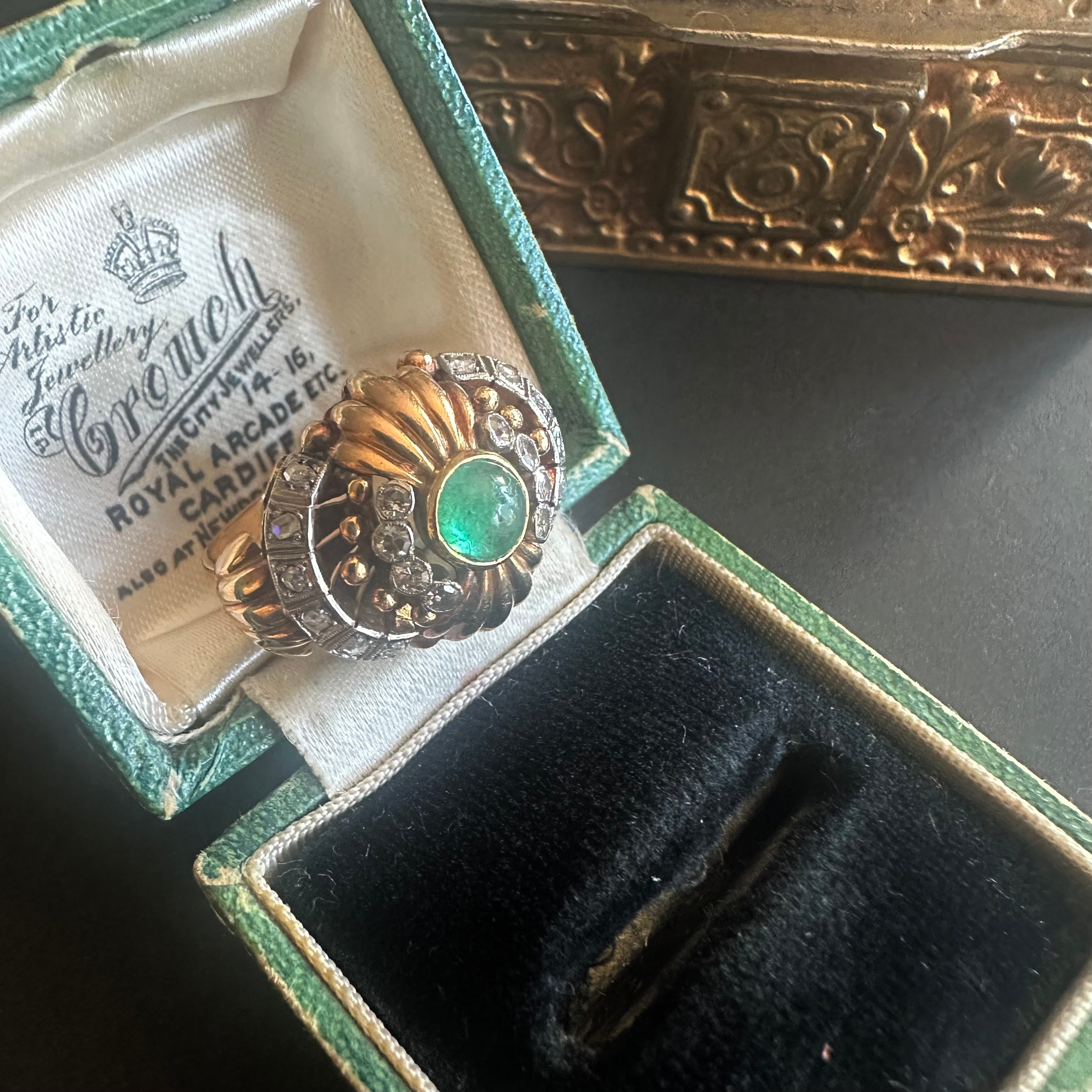 ※ 90年程前の古いお品になりますので、経年によるアンティーク品特有の微小なスレなどルーペで見てわかる程度にございます。エメラルドは内包物はありますが、エメラルド特有のものです。カケ、目立つキズはございません。
