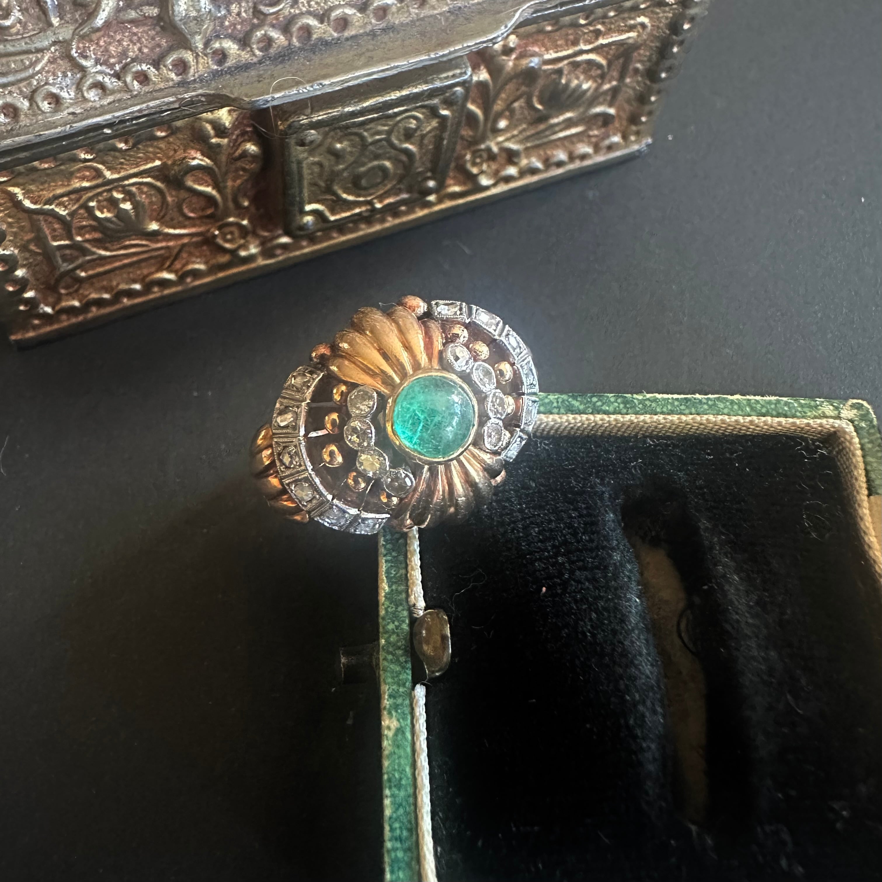 エメラルドのすぐ周囲にはシングルカットダイヤモンド。
