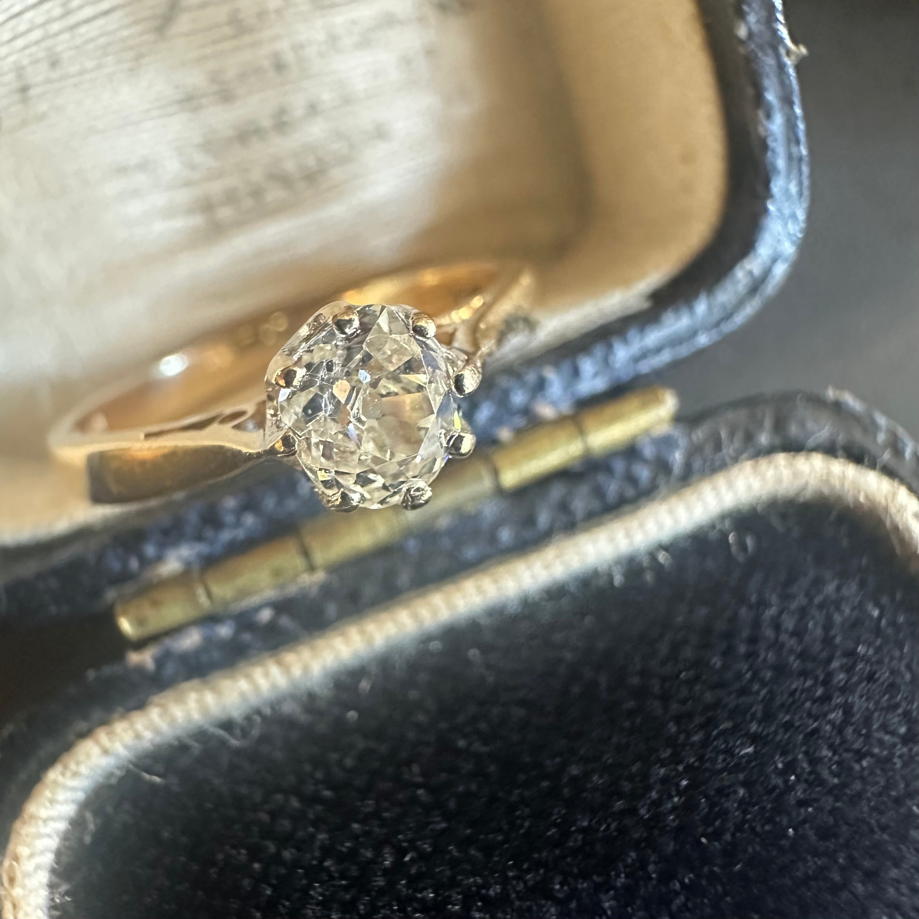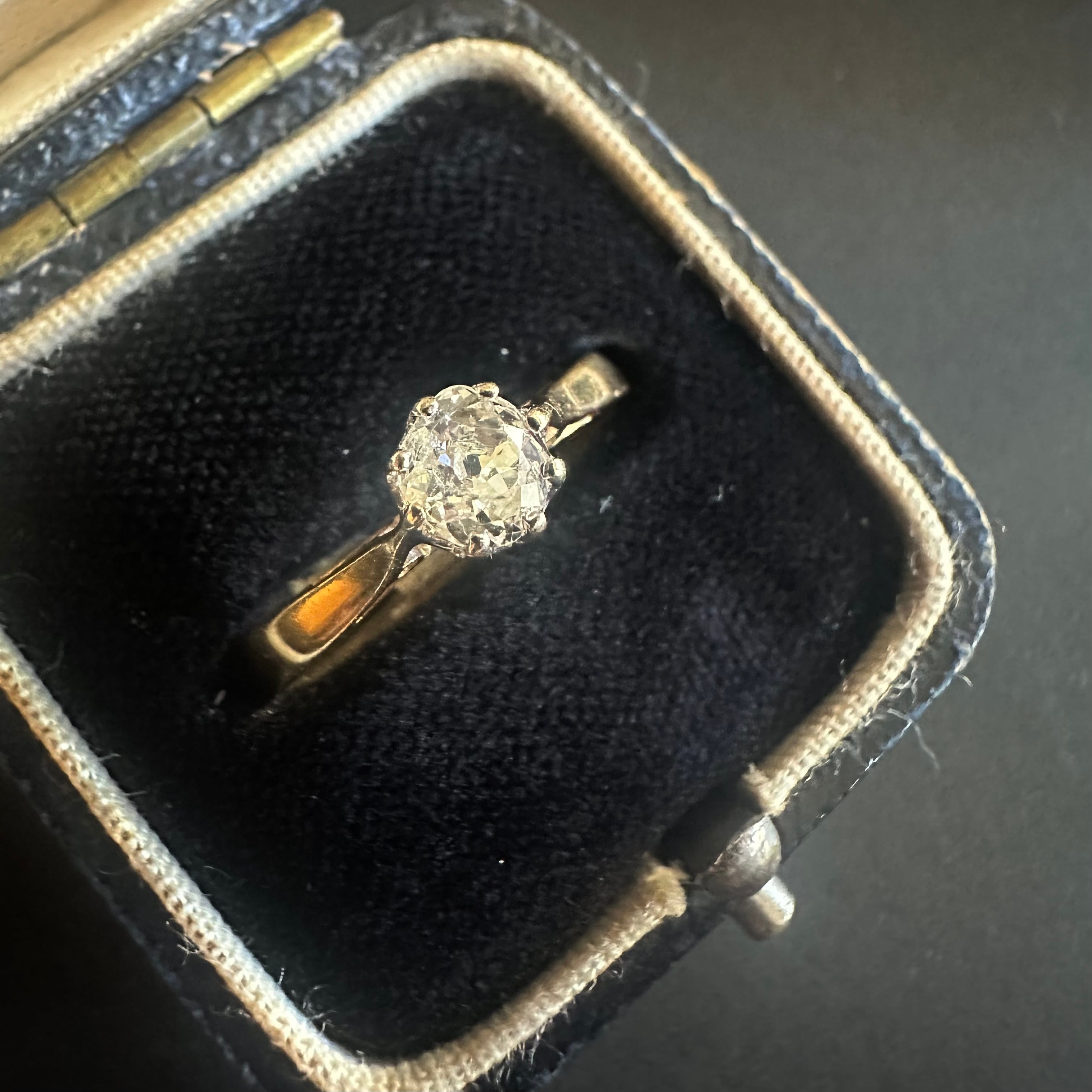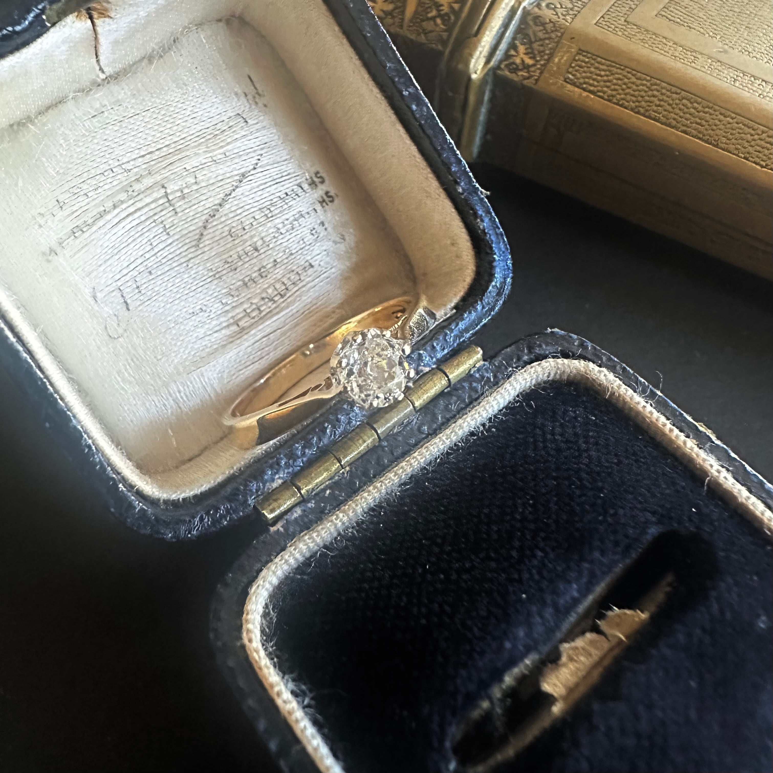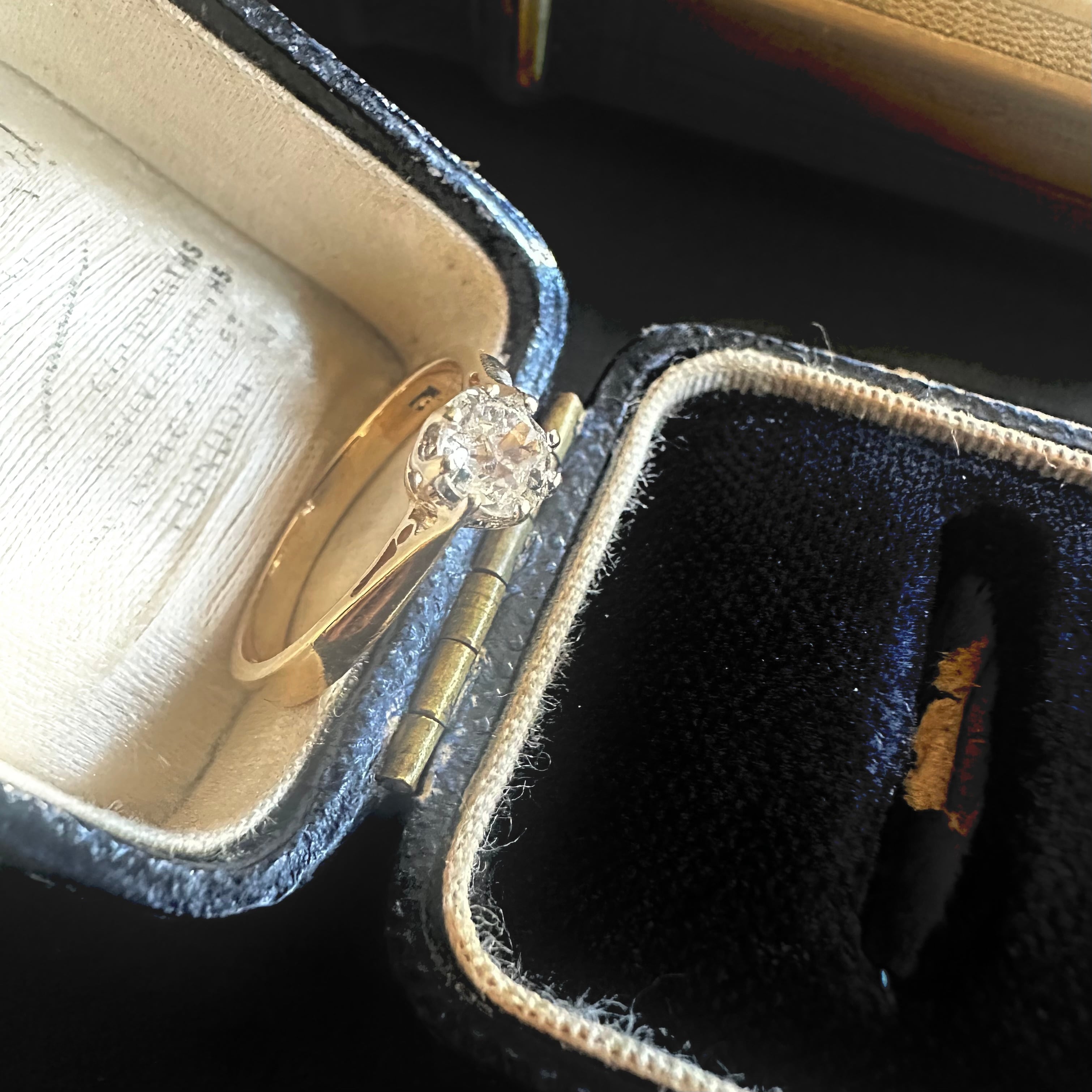 枠は20世紀半ば頃のもの。すでにブリリアントカットが主流となっていた時代に、あえてオールドマインカットを選び、シンプルな14金のソリテールに仕立てた背景も素敵てす。