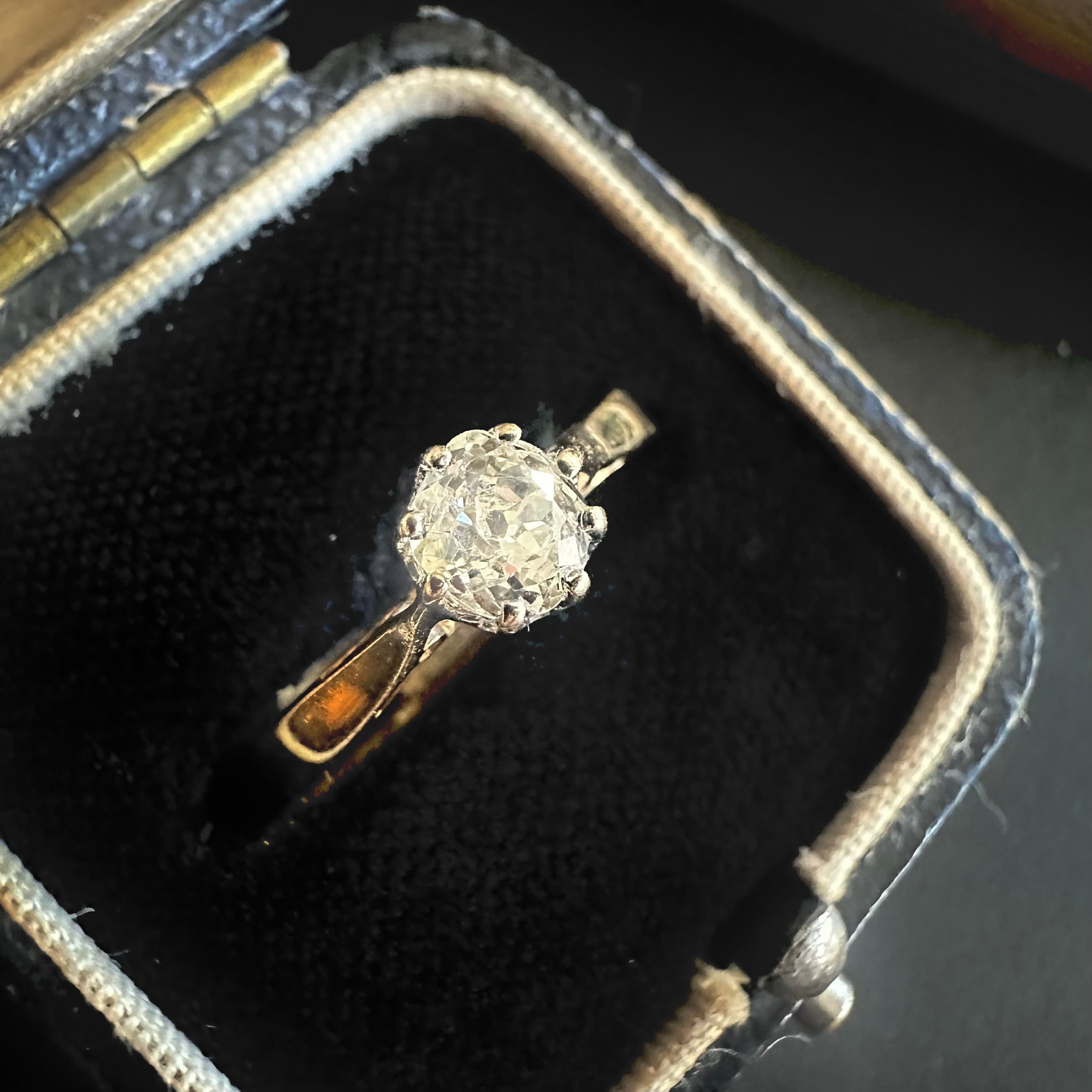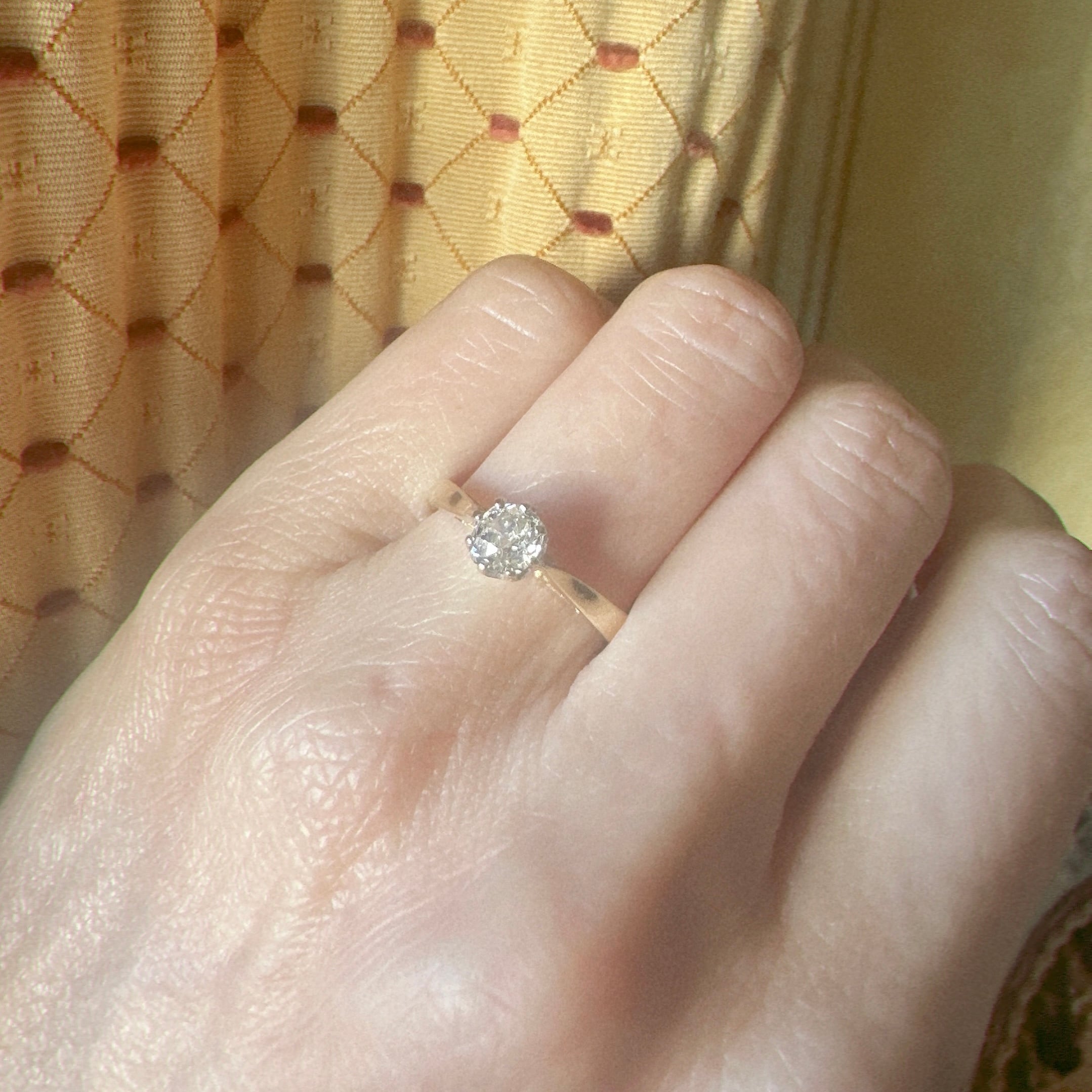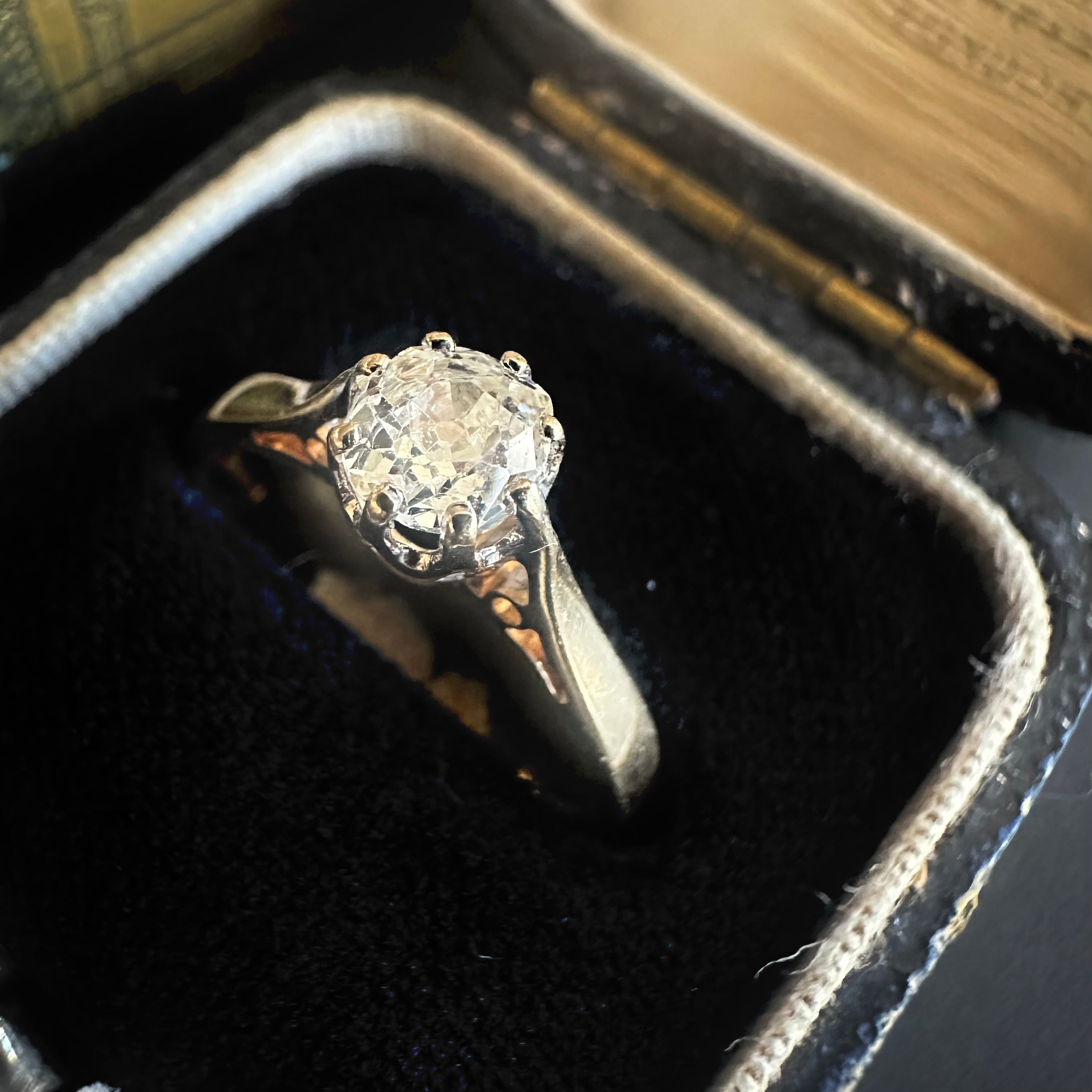 枠は20世紀半ば頃のもの。すでにブリリアントカットが主流となっていた時代に、あえてオールドマインカットを選び、シンプルな14金のソリテールに仕立てた背景も素敵てす。