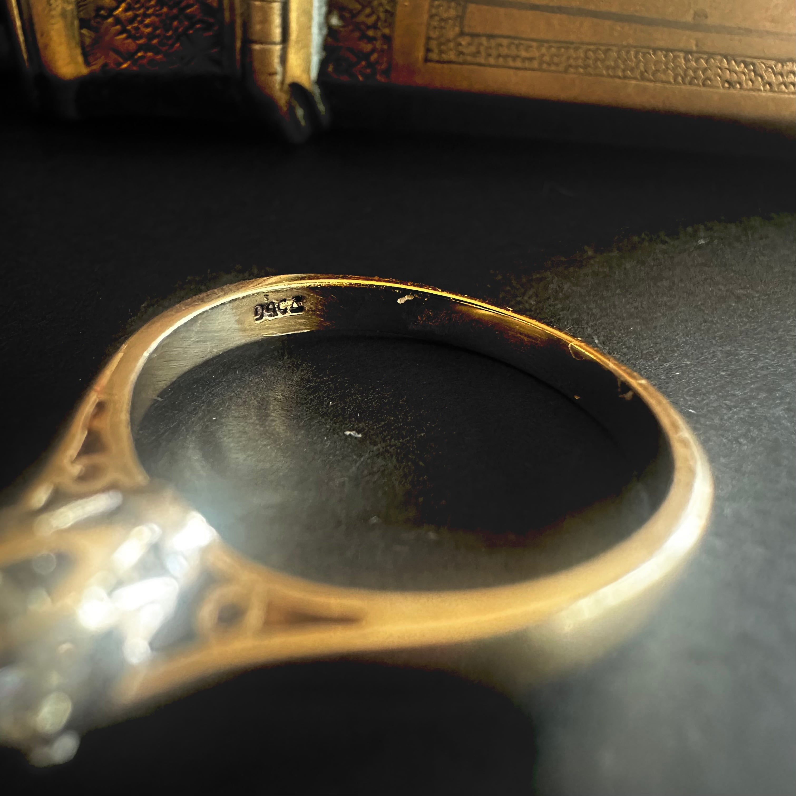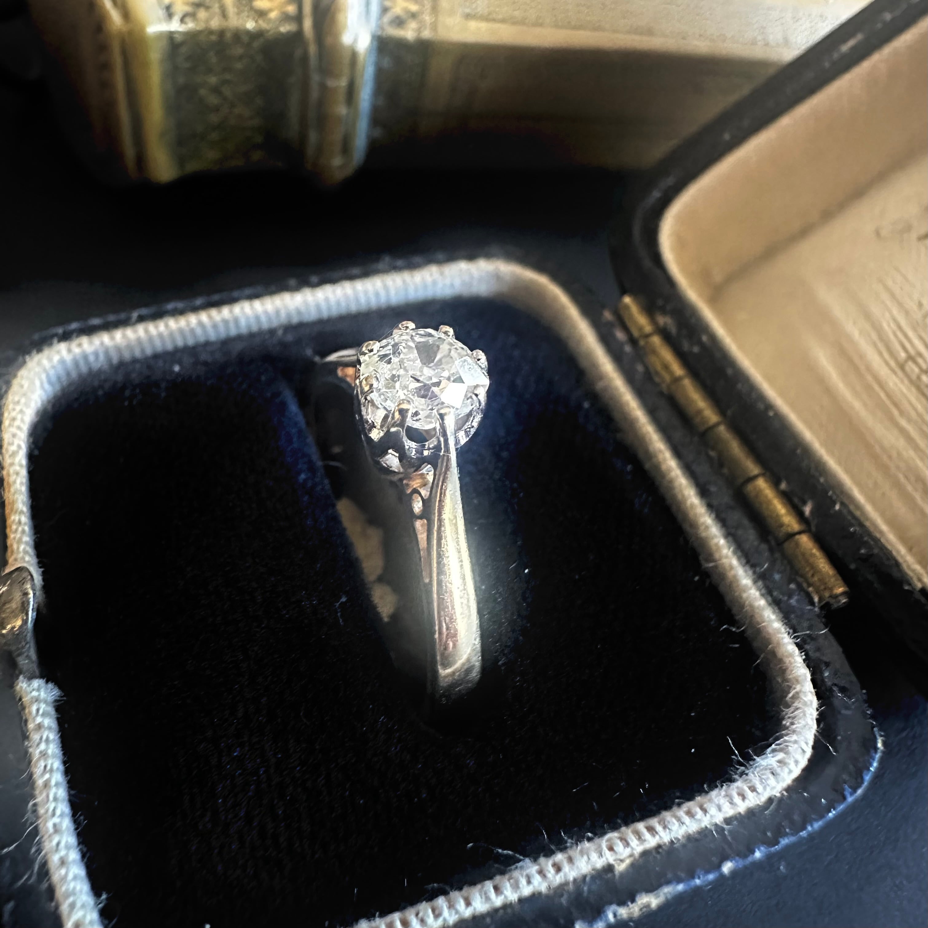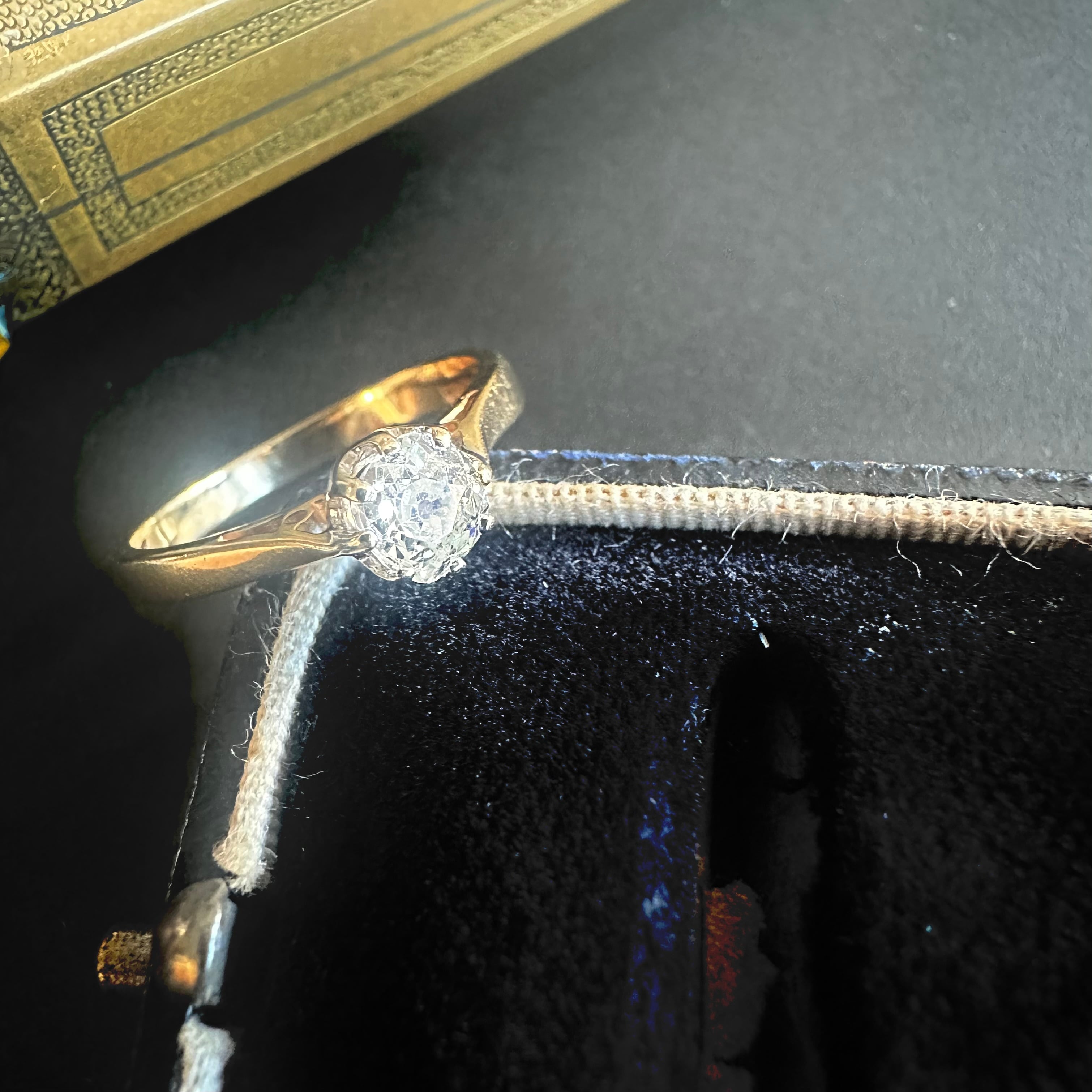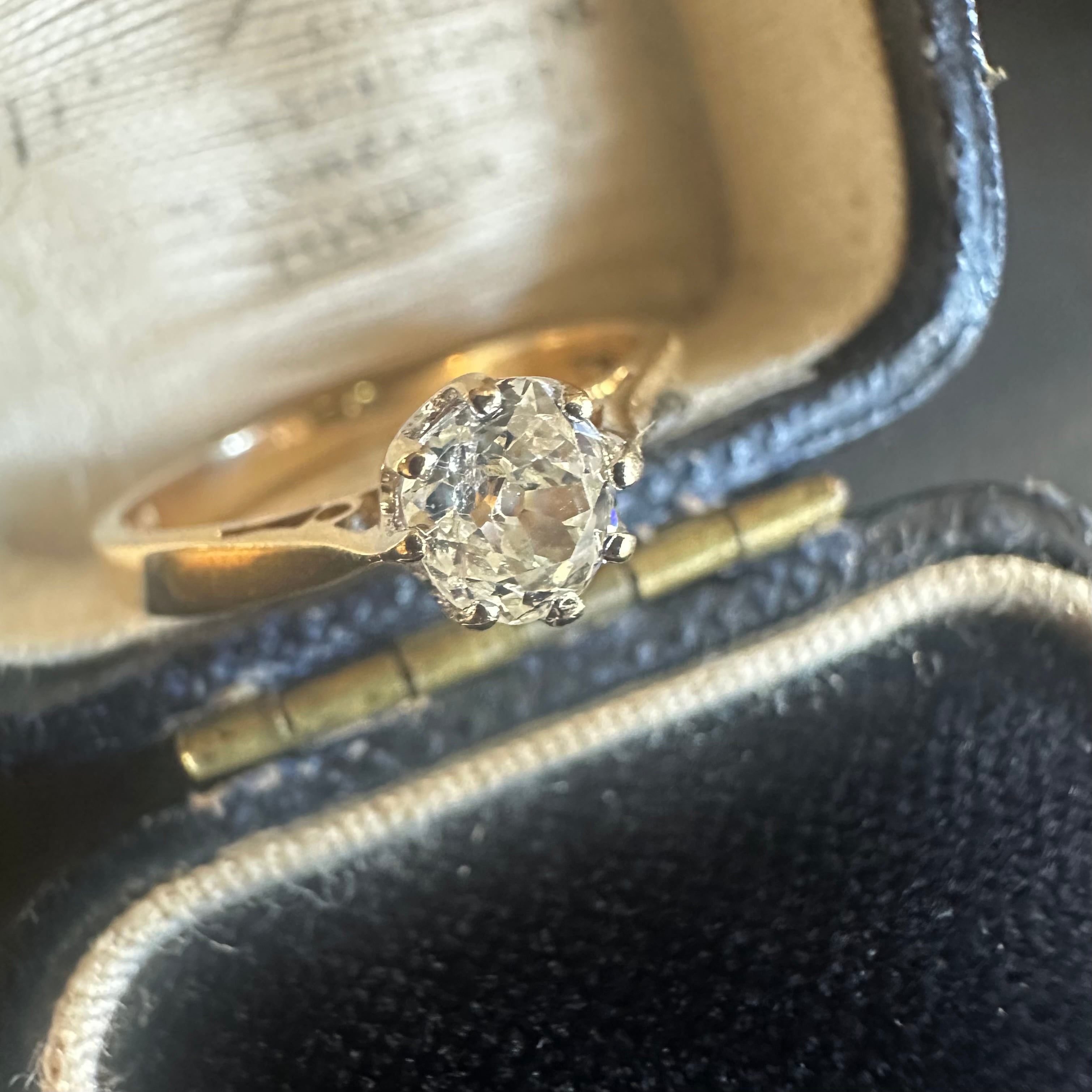 枠は20世紀半ば頃のもの。すでにブリリアントカットが主流となっていた時代に、あえてオールドマインカットを選び、シンプルな14金のソリテールに仕立てた背景も素敵てす。