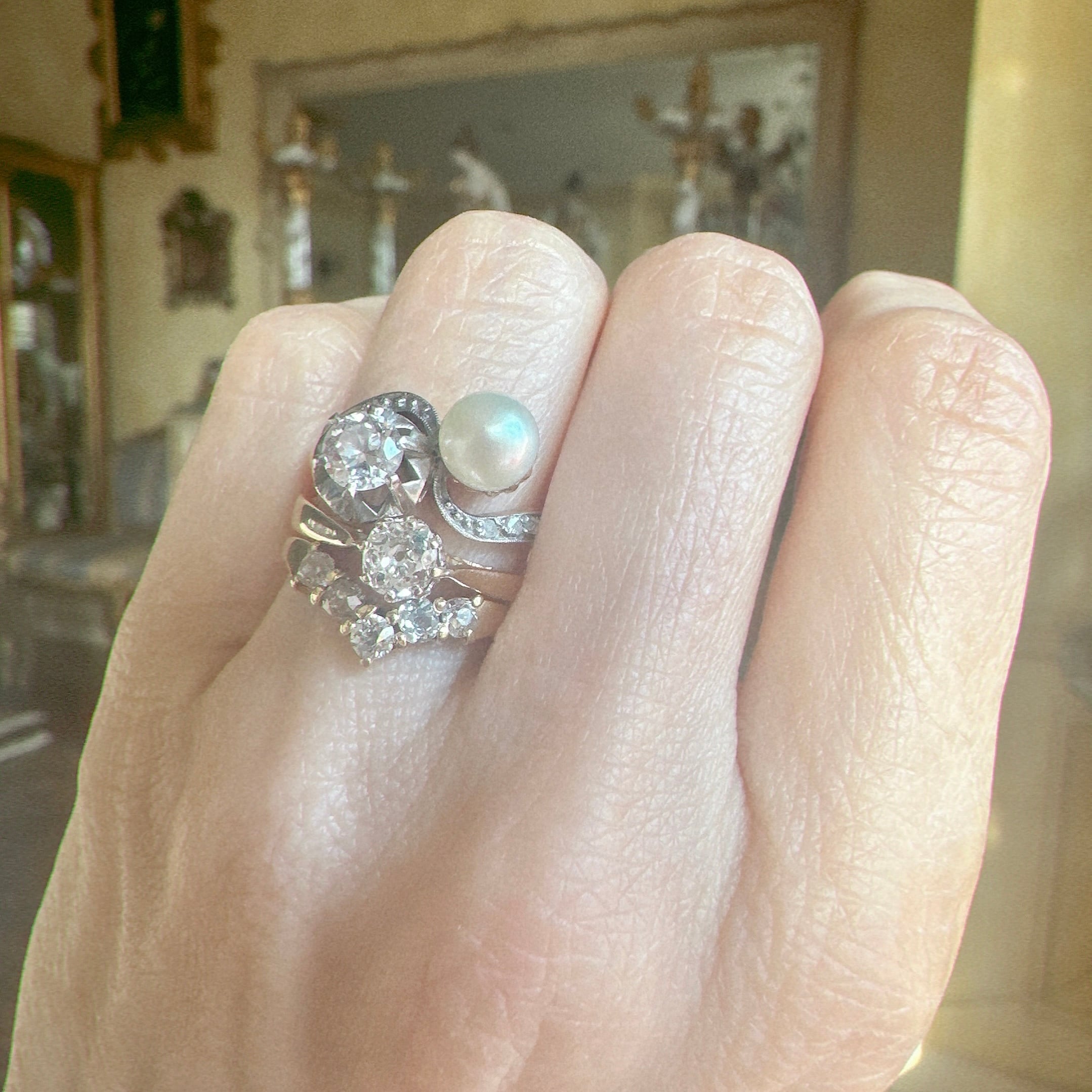 19世紀後半から20世紀初頭に生まれたオールドマインカットダイヤモンドを主役にしたソリテールリング。手作業で一石ずつ削られたこの時代のダイヤモンドは、整いすぎないからこそ、やわらかく奥行きのある輝きを放ちます。私はこのダイヤモンドに、どこか人の気配を感じるような「優しさ」と「ぬくもり」を感じ、買い付けを決めました。