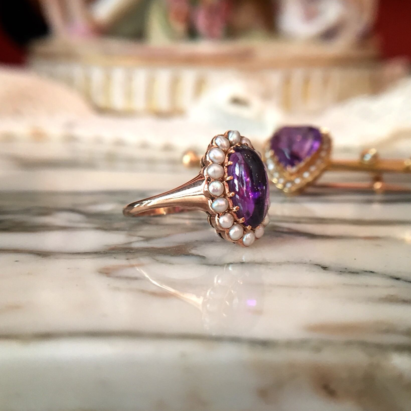ぷるんと艶めく透明感のある深い色味のカボションカットアメシストのクラスターリング。