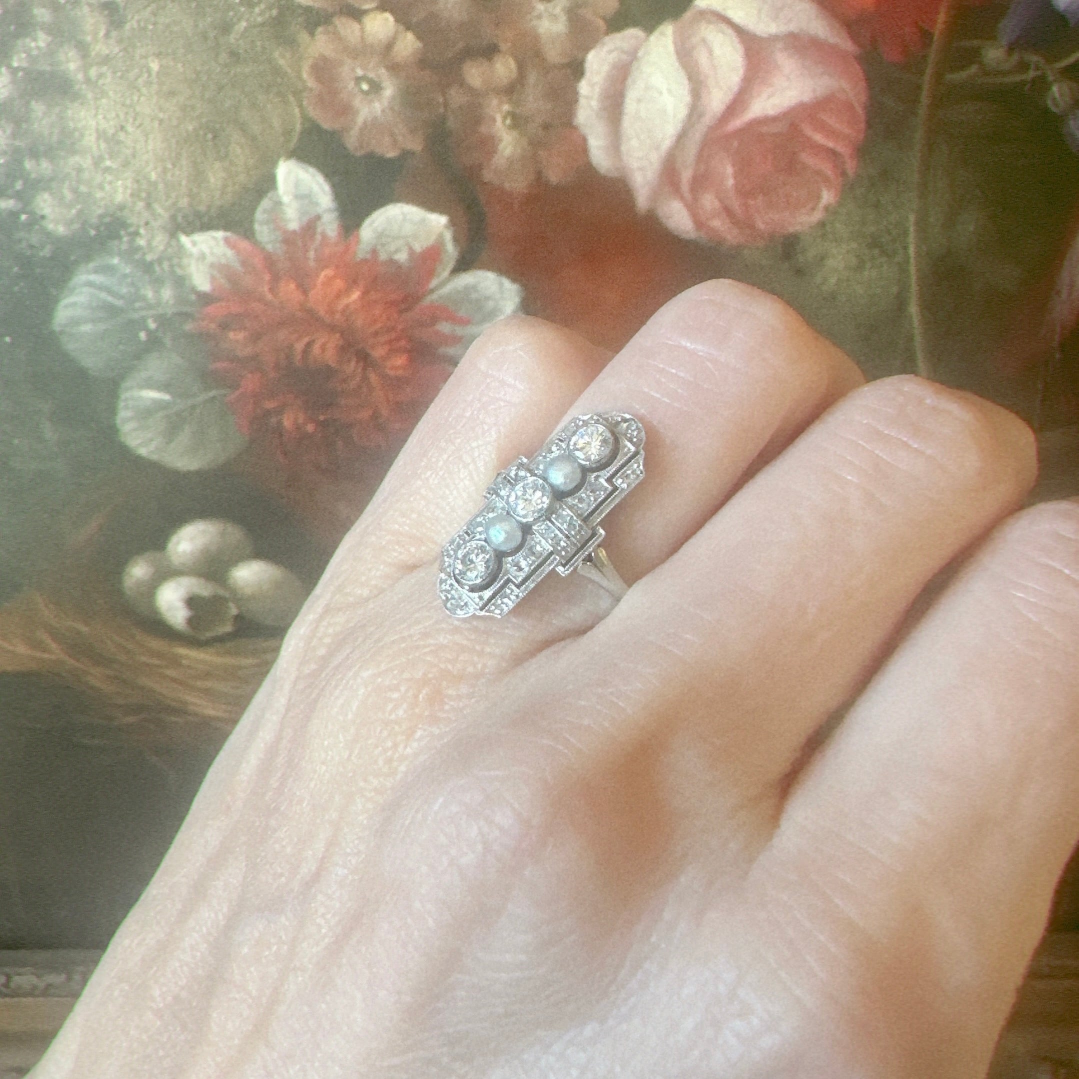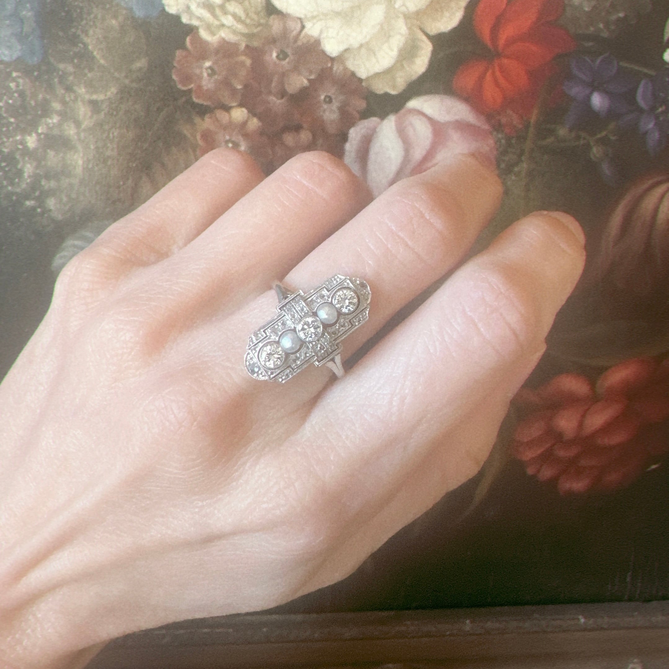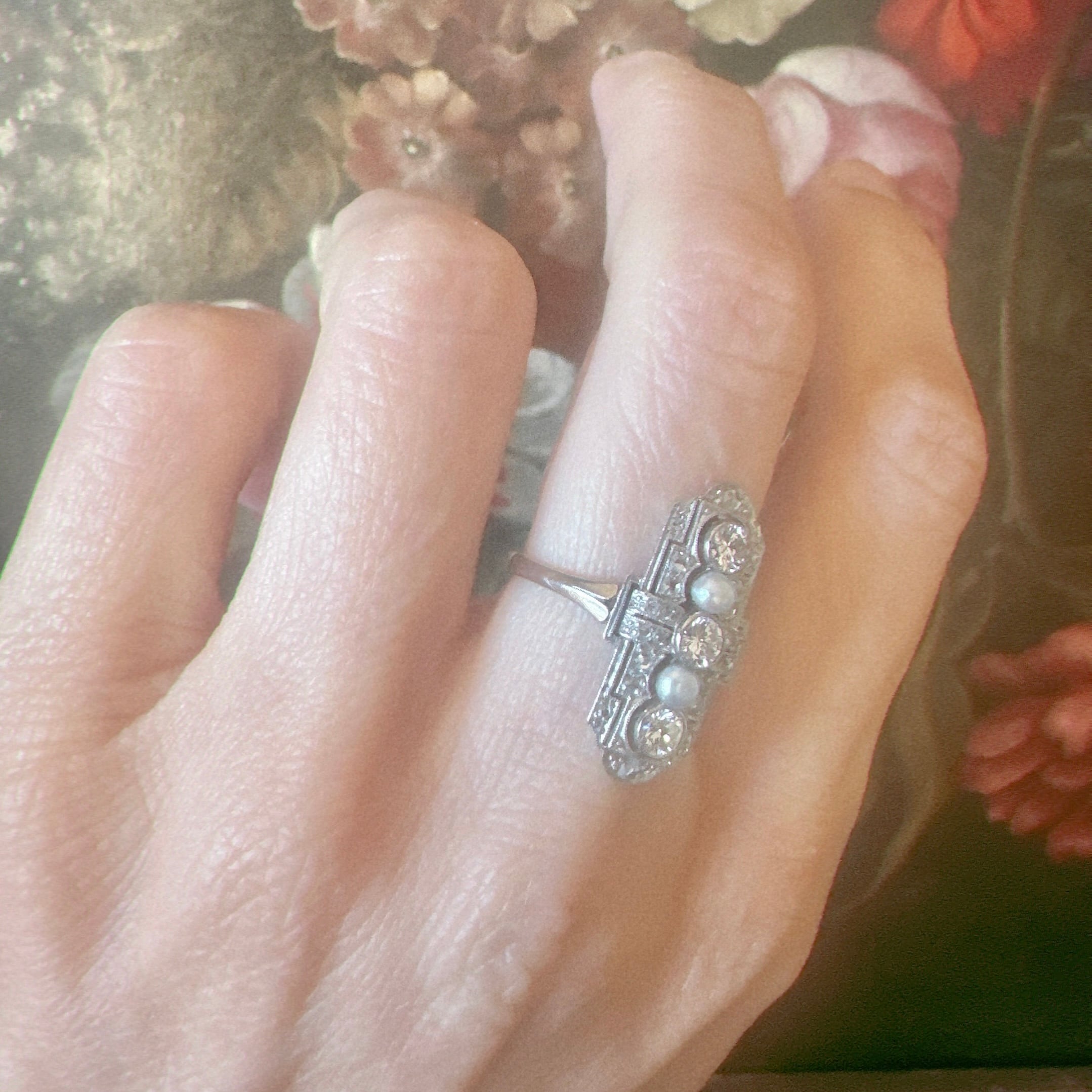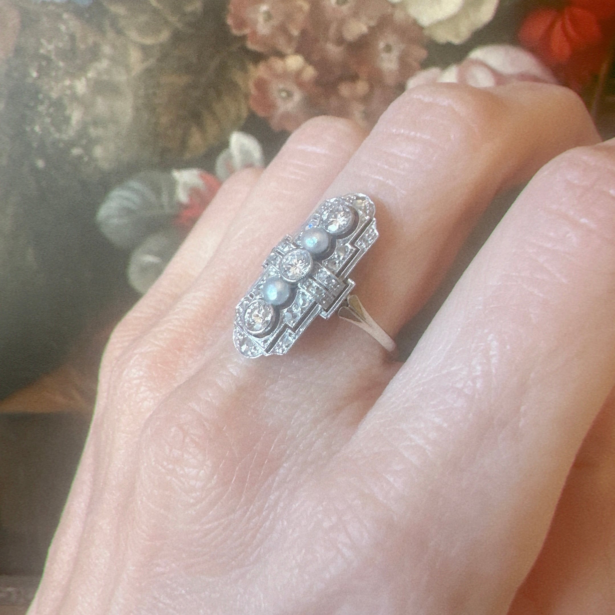トランジショナルカットダイヤモンド&ナチュラルパールの透し彫りリング