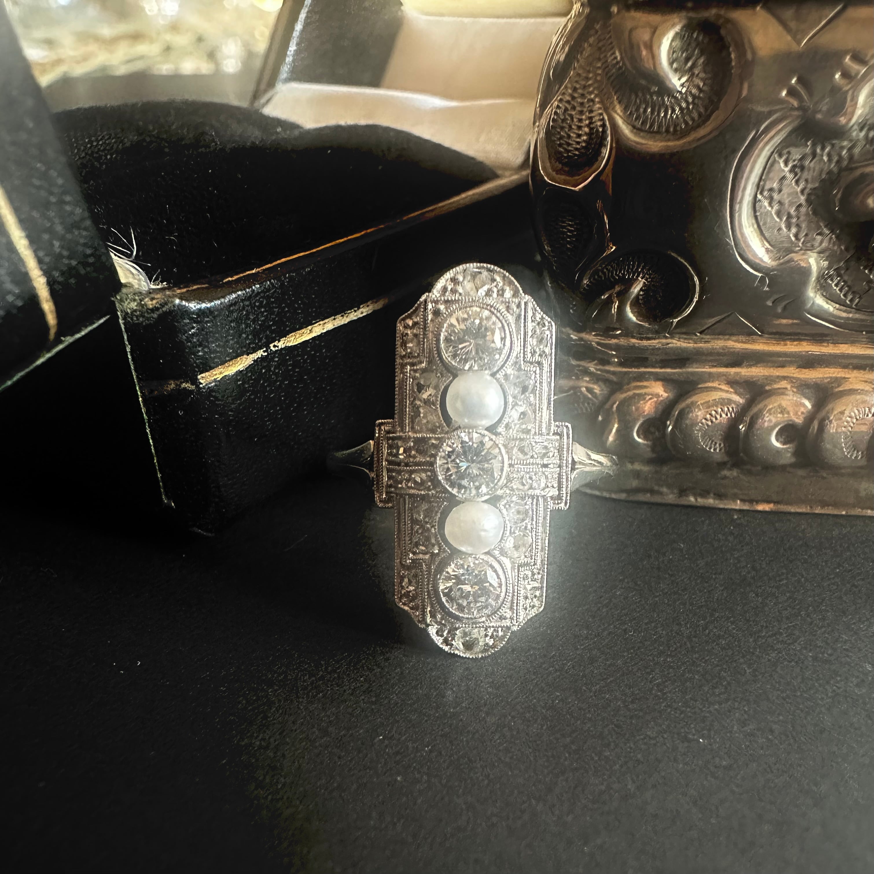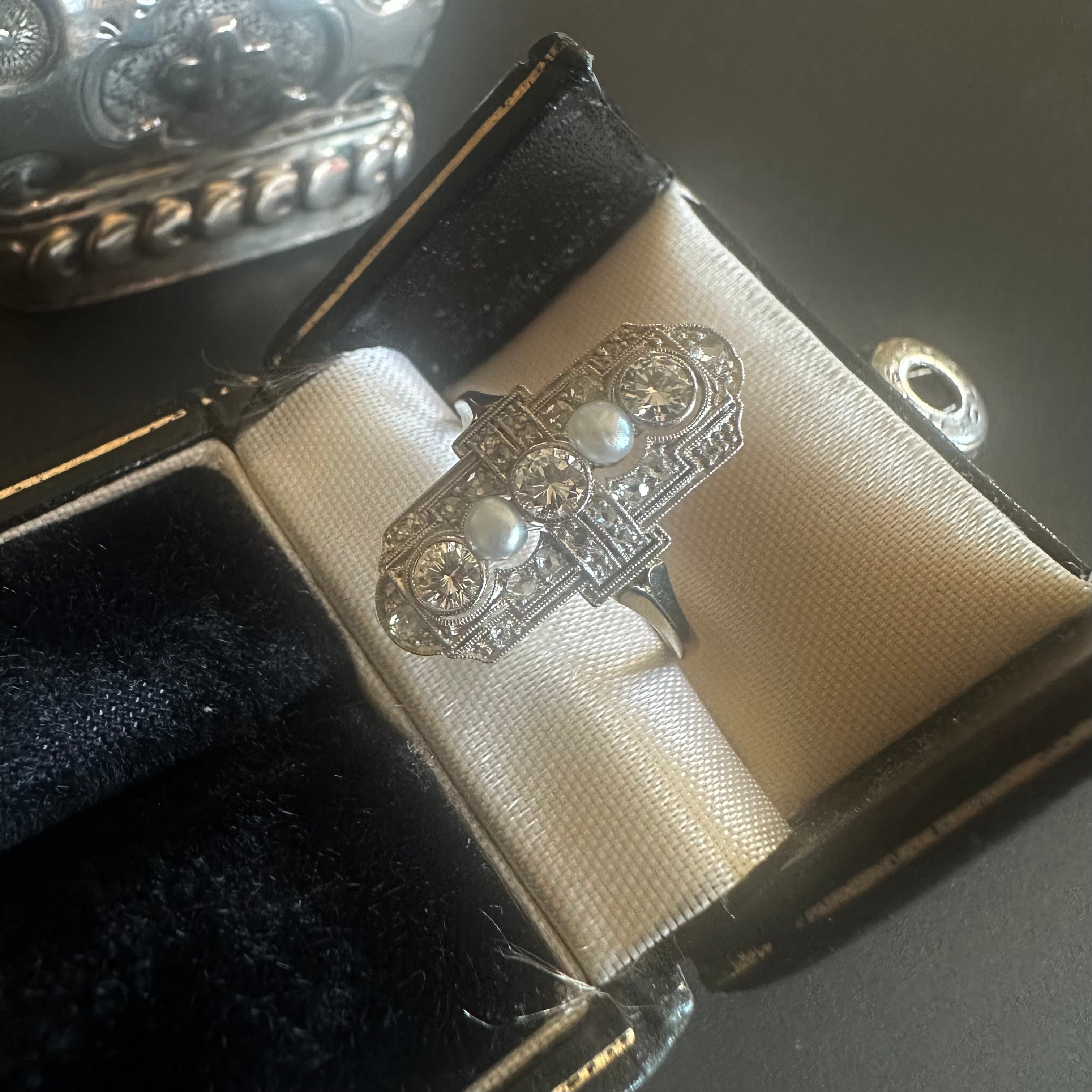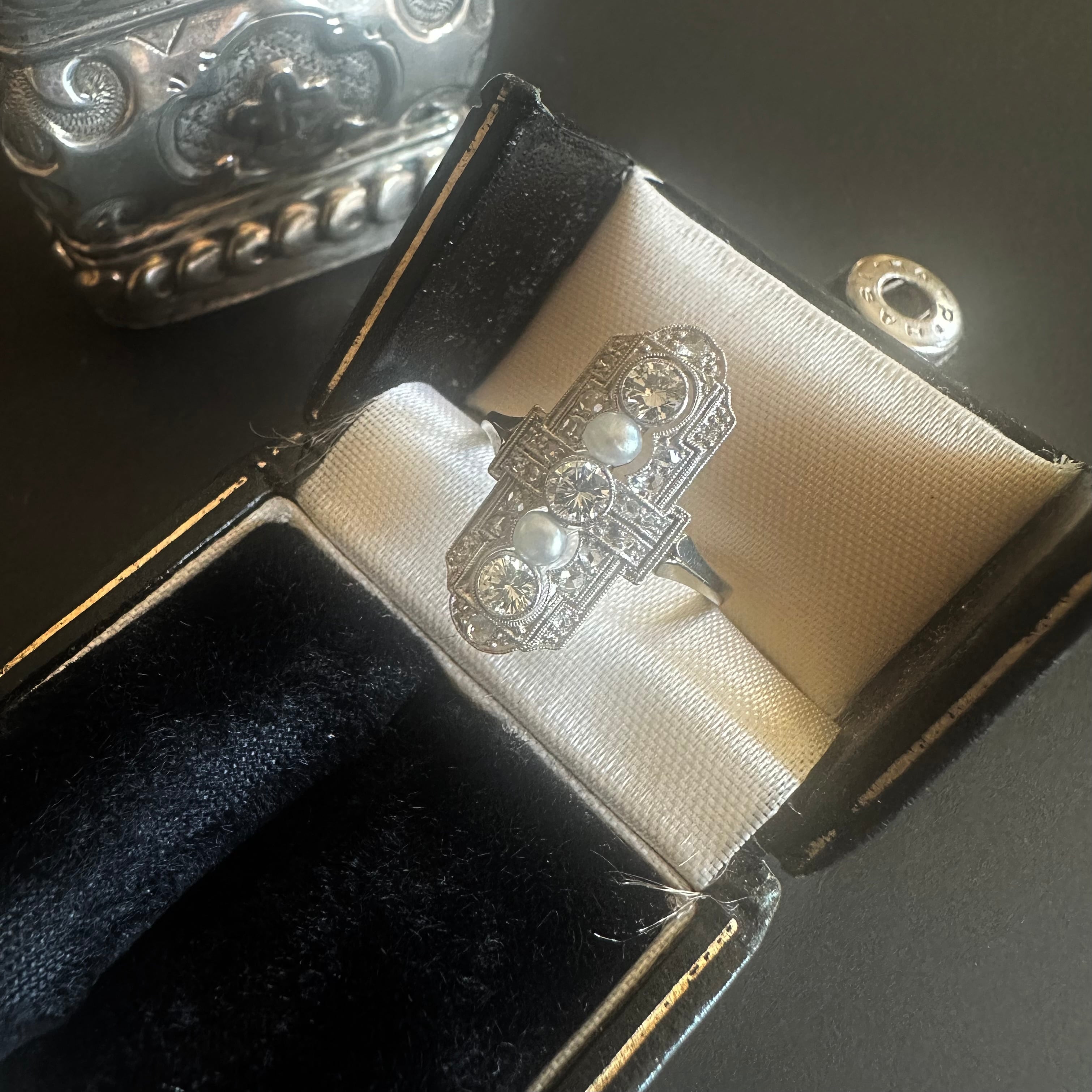 間にセットされたパールは、形状や質感から見て天然真珠である可能性が高いもの。