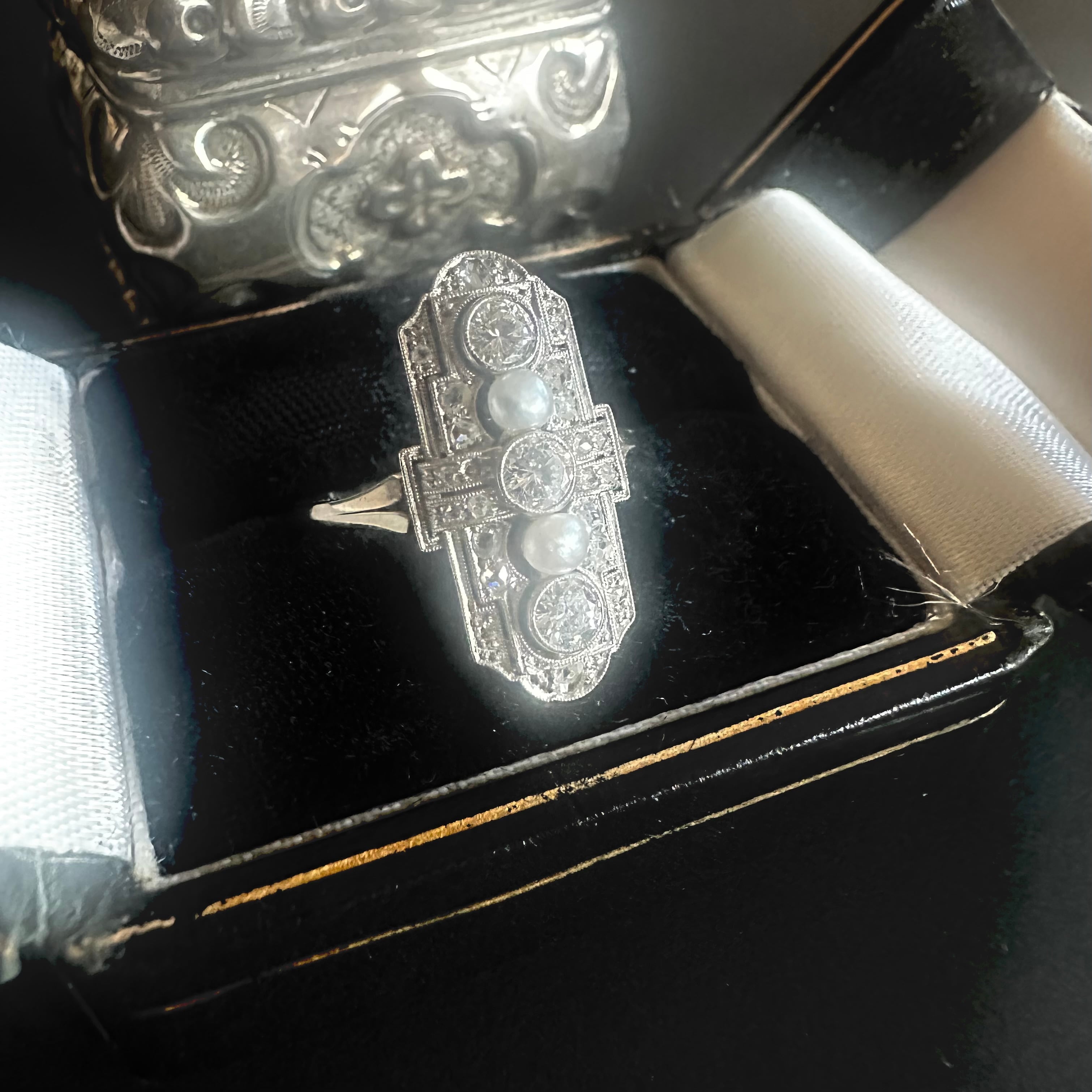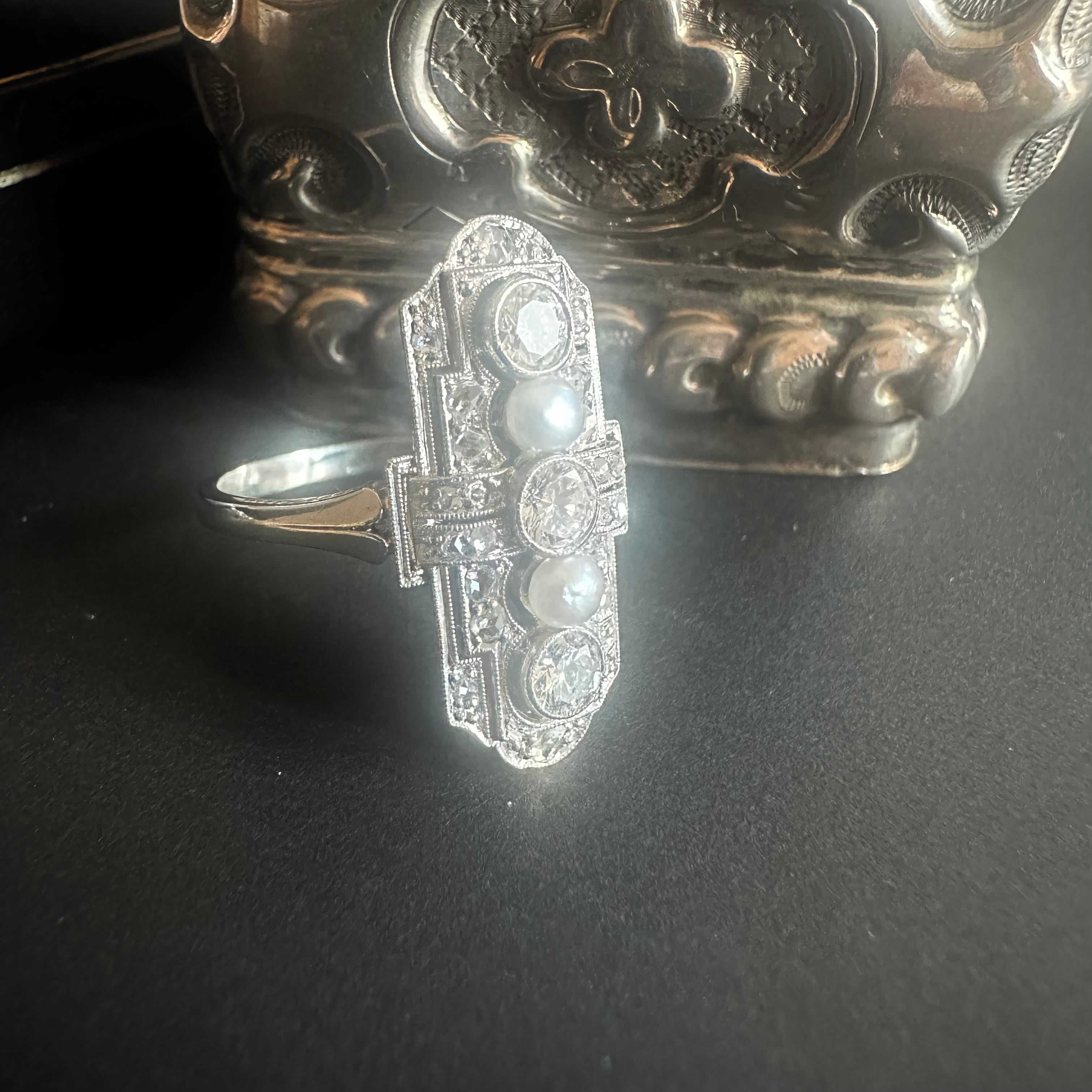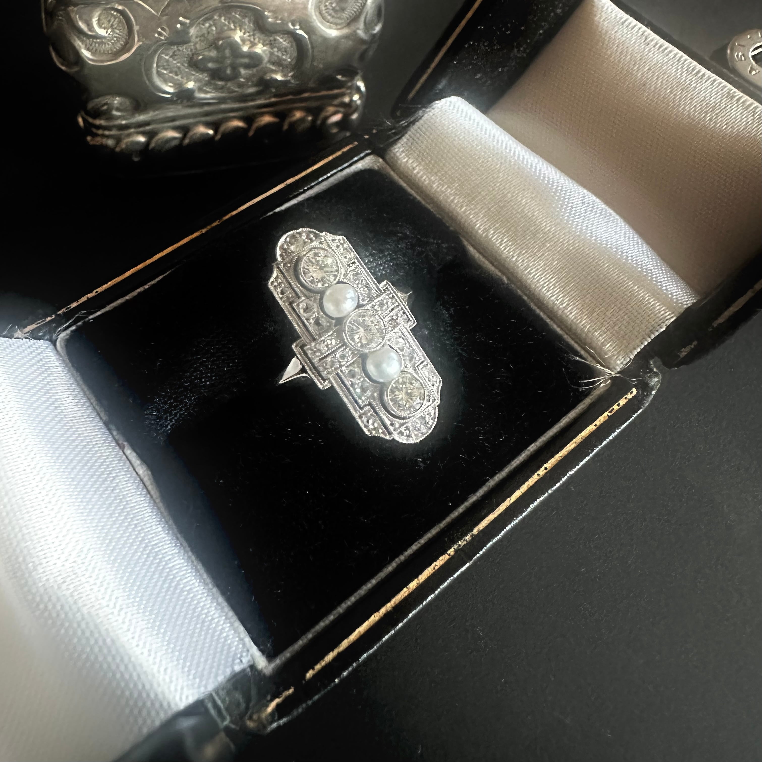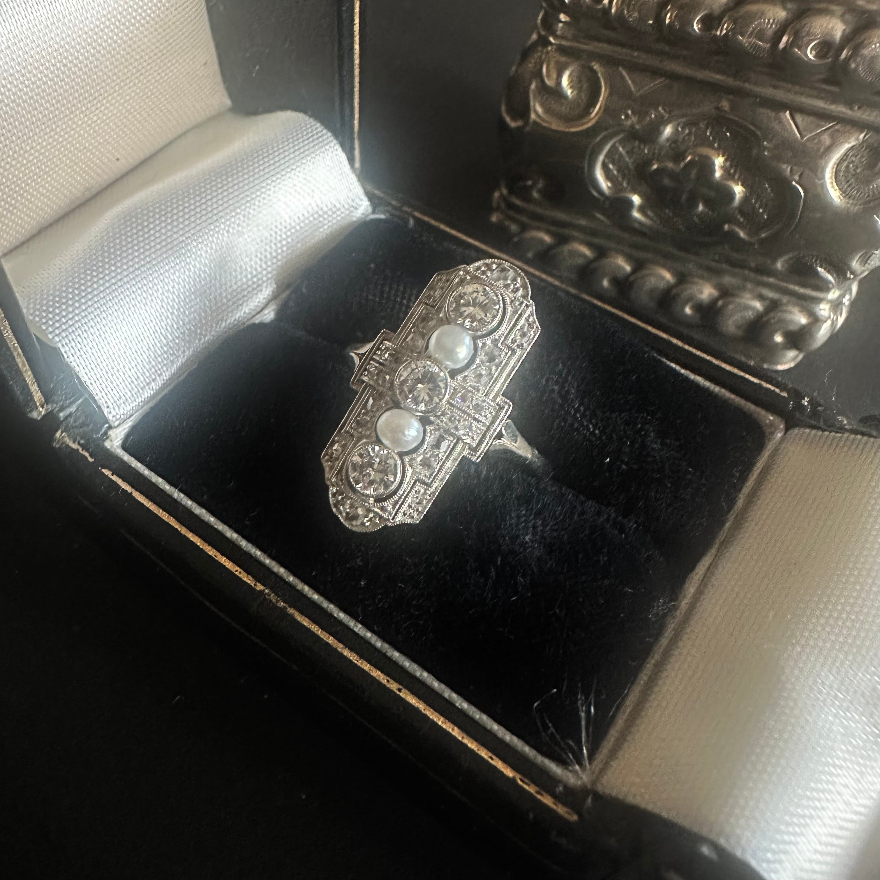 間にセットされたパールは、形状や質感から見て天然真珠である可能性が高いもの。