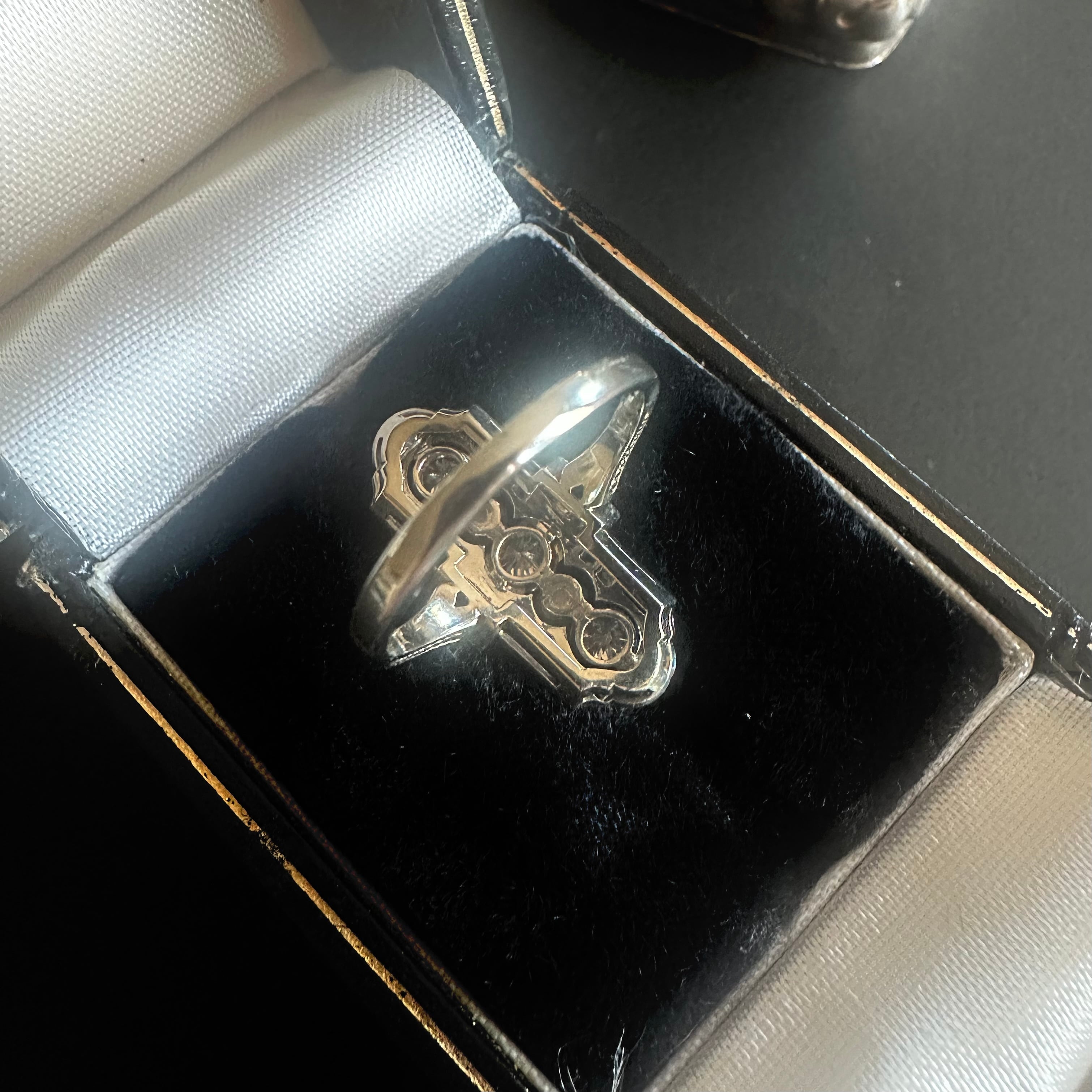 ※ 100年程前の古いお品になりますので、経年によるアンティーク品特有の微小なスレなどルーペで見てわかる程度にございます。ダイヤモンドはルーペでのぞくと内包物はありますが、肉眼でみえるものではなく、瑞々しい輝きを楽しませてくれます。カケはございません。