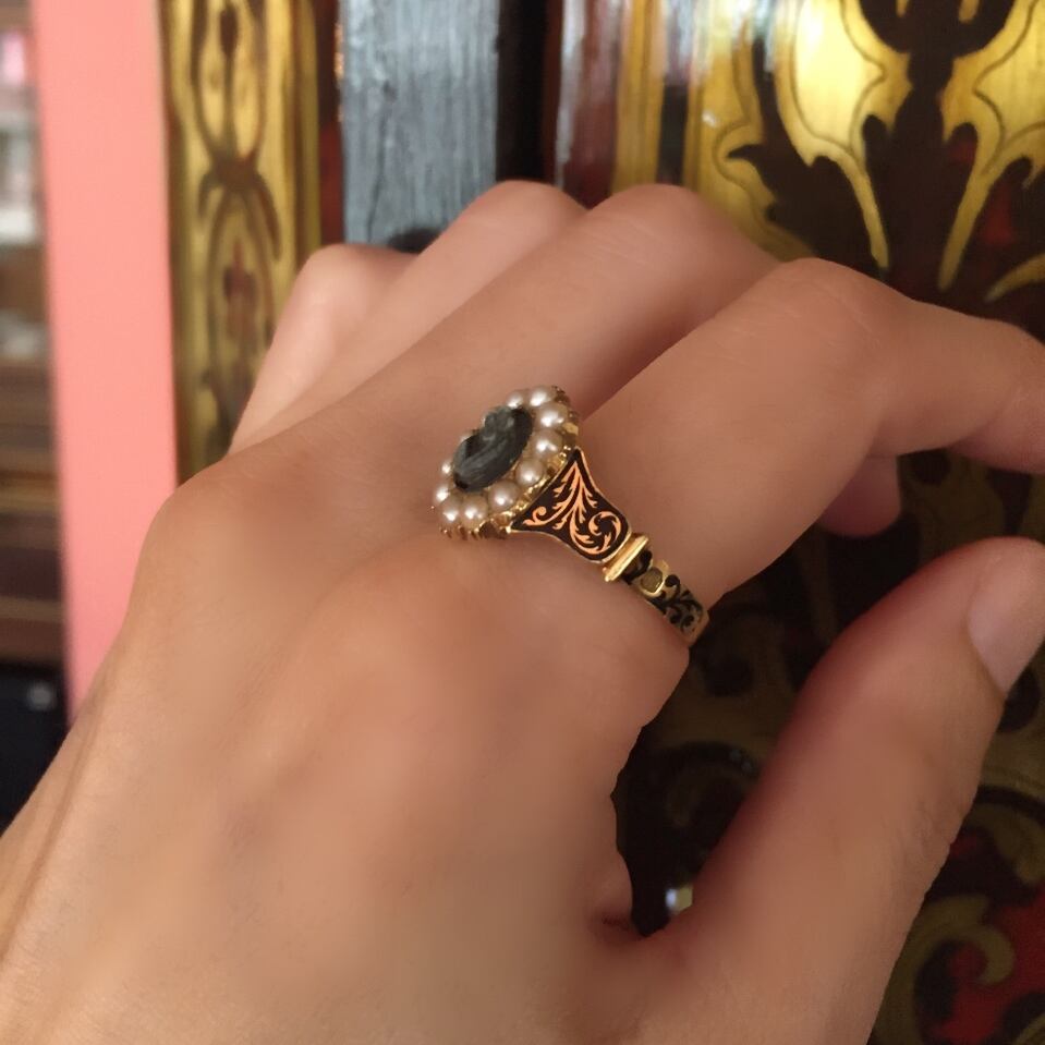 サードニクスにカメオ彫された可憐な勿忘草が愛らしいリングは19世紀半ば頃のお品になります。