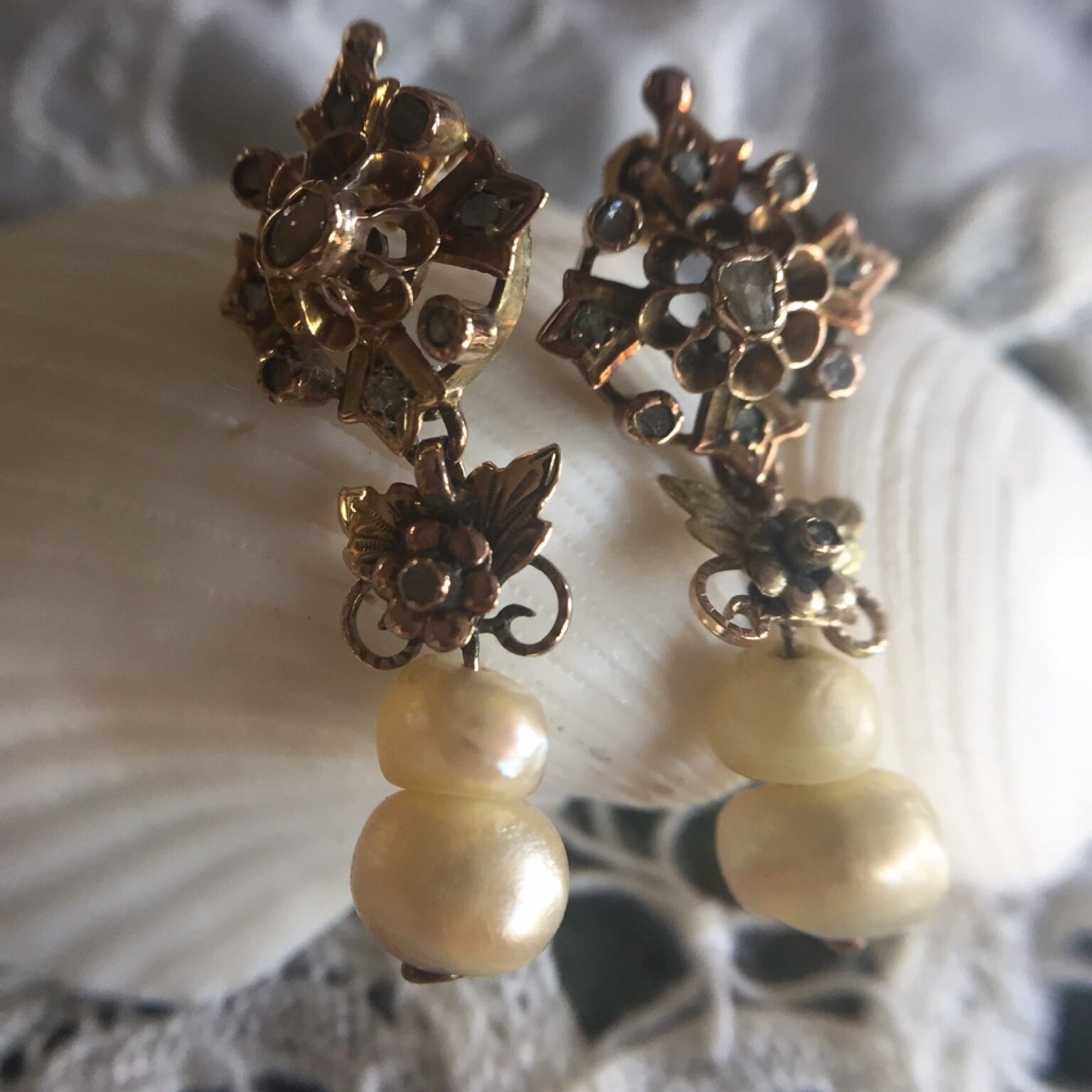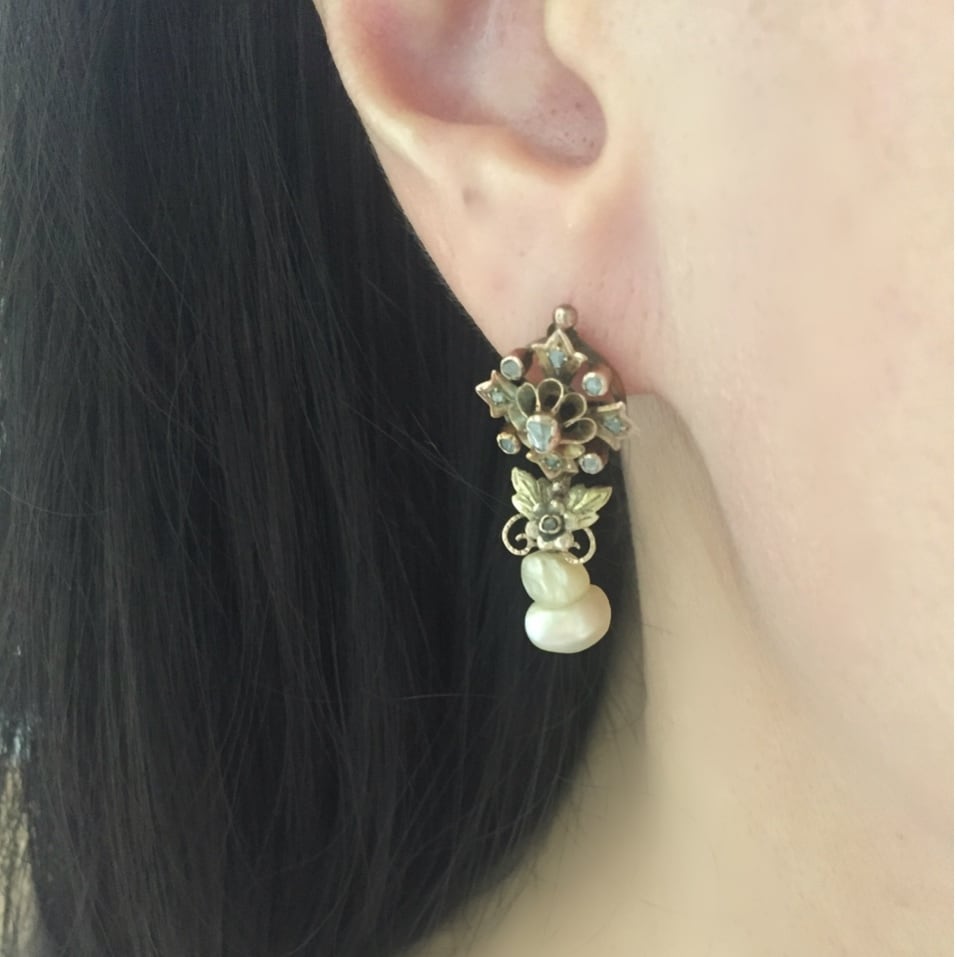 一番下で揺れるバロックパールが、滴る雫のようで、気品があり華やかで、そして長い年月を経た穏やかさを感じさせ、20世紀以降のピアスにはない風格とおもむきがあります。