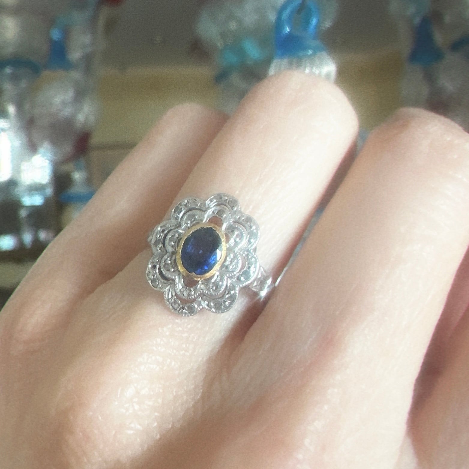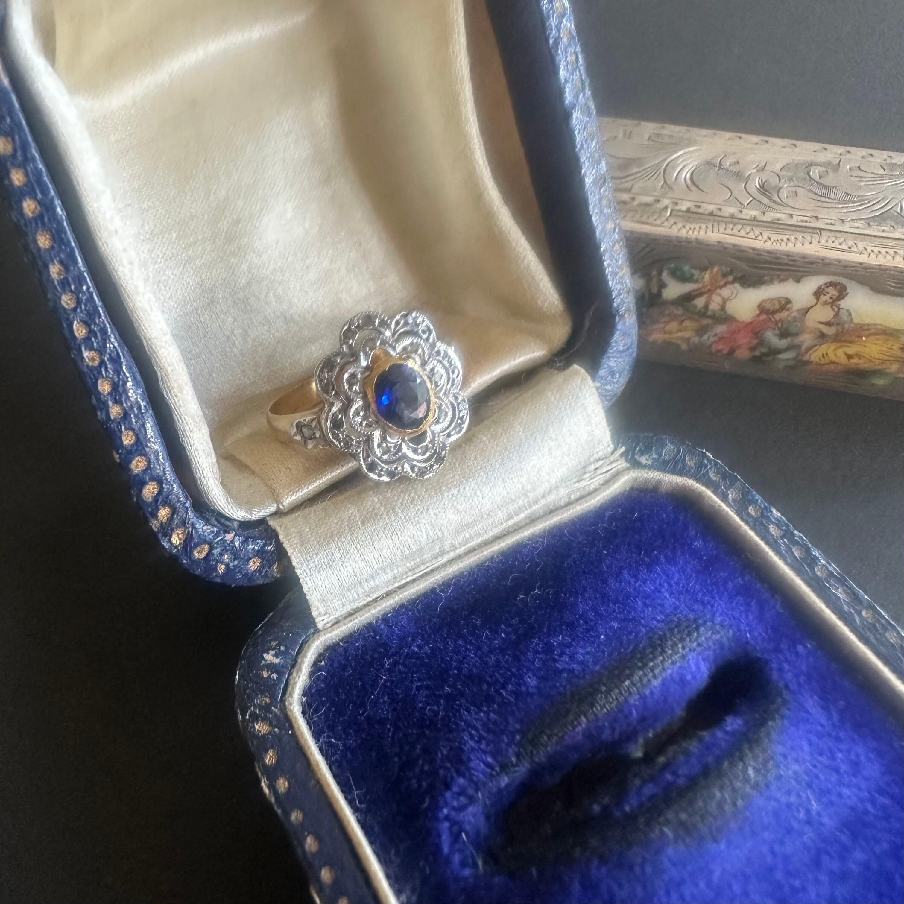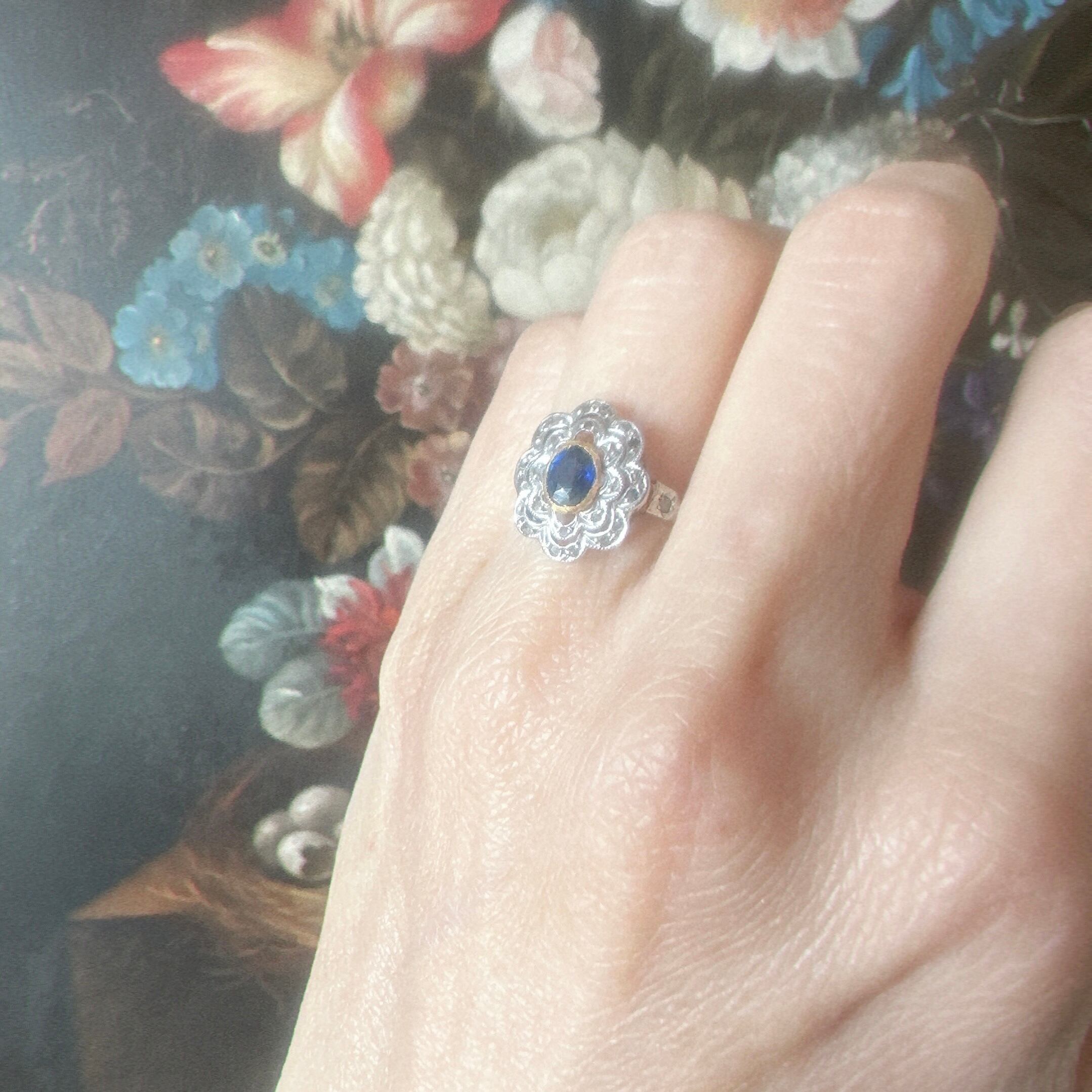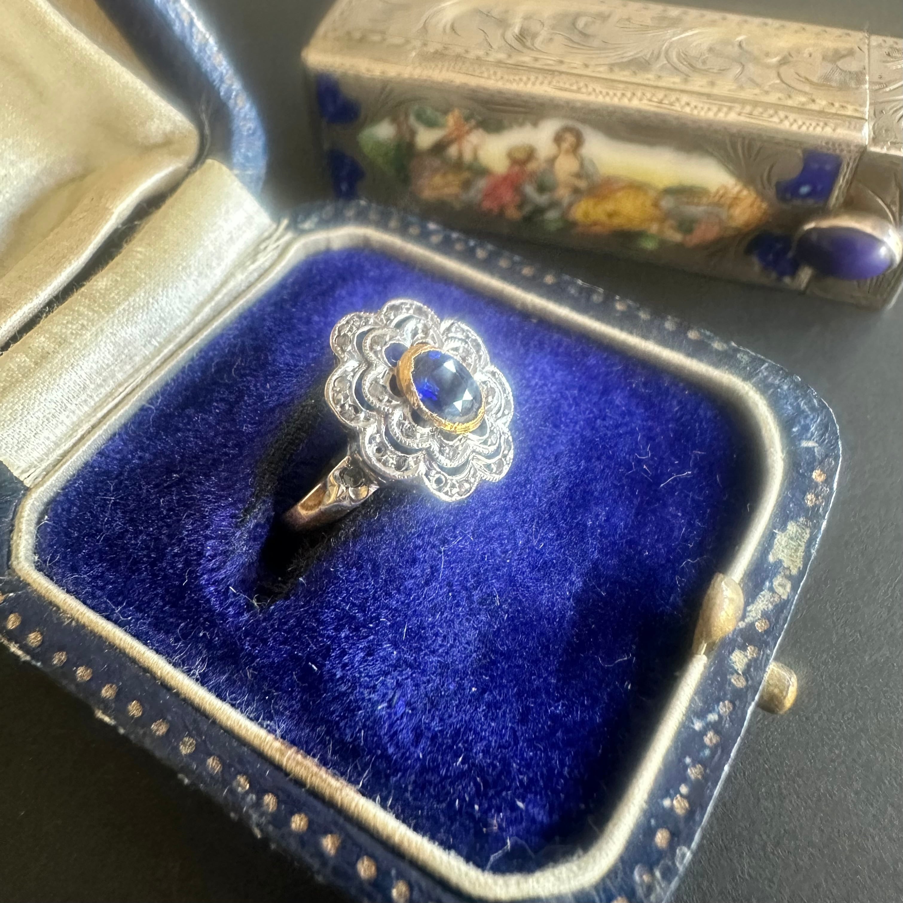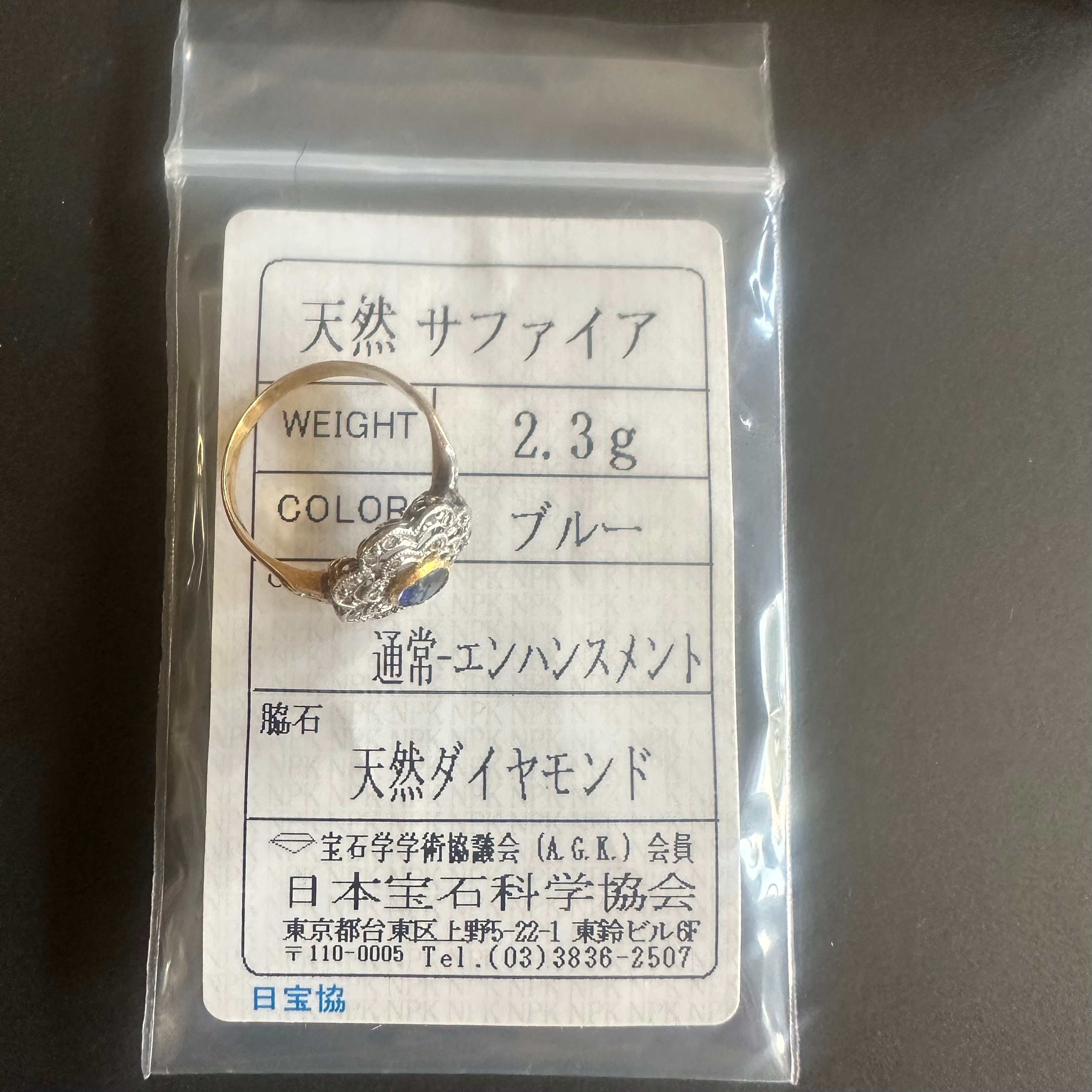 ※ 100年以上前の古いお品になりますので、経年によるアンティーク品特有の微小なスレなどルーペで見てわかる程度にございます。サファイアはルーペでのぞくと内包物はありますが、肉眼でみえるものではなく、瑞々しい輝きを楽しませてくれます。カケや目立つキズはございません。