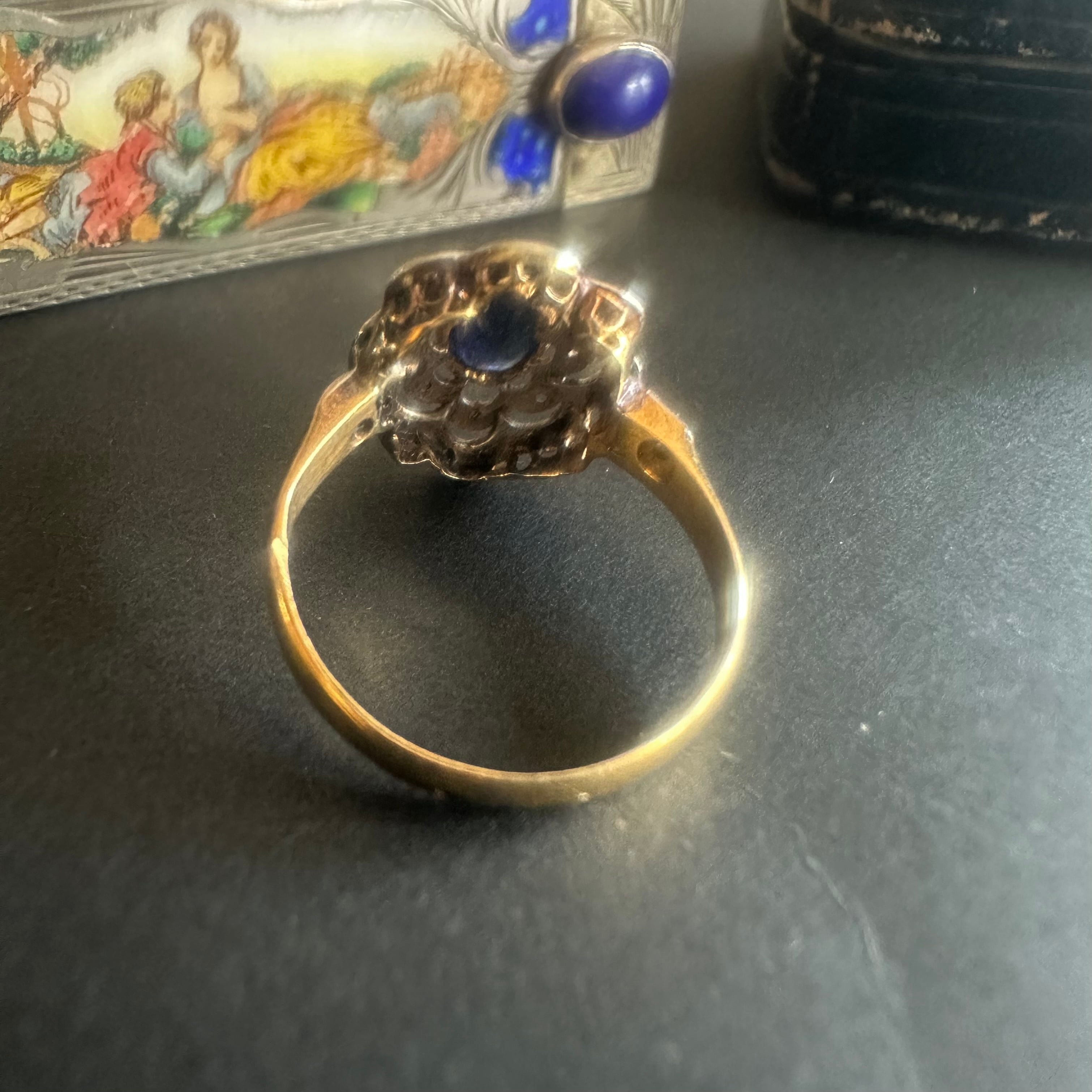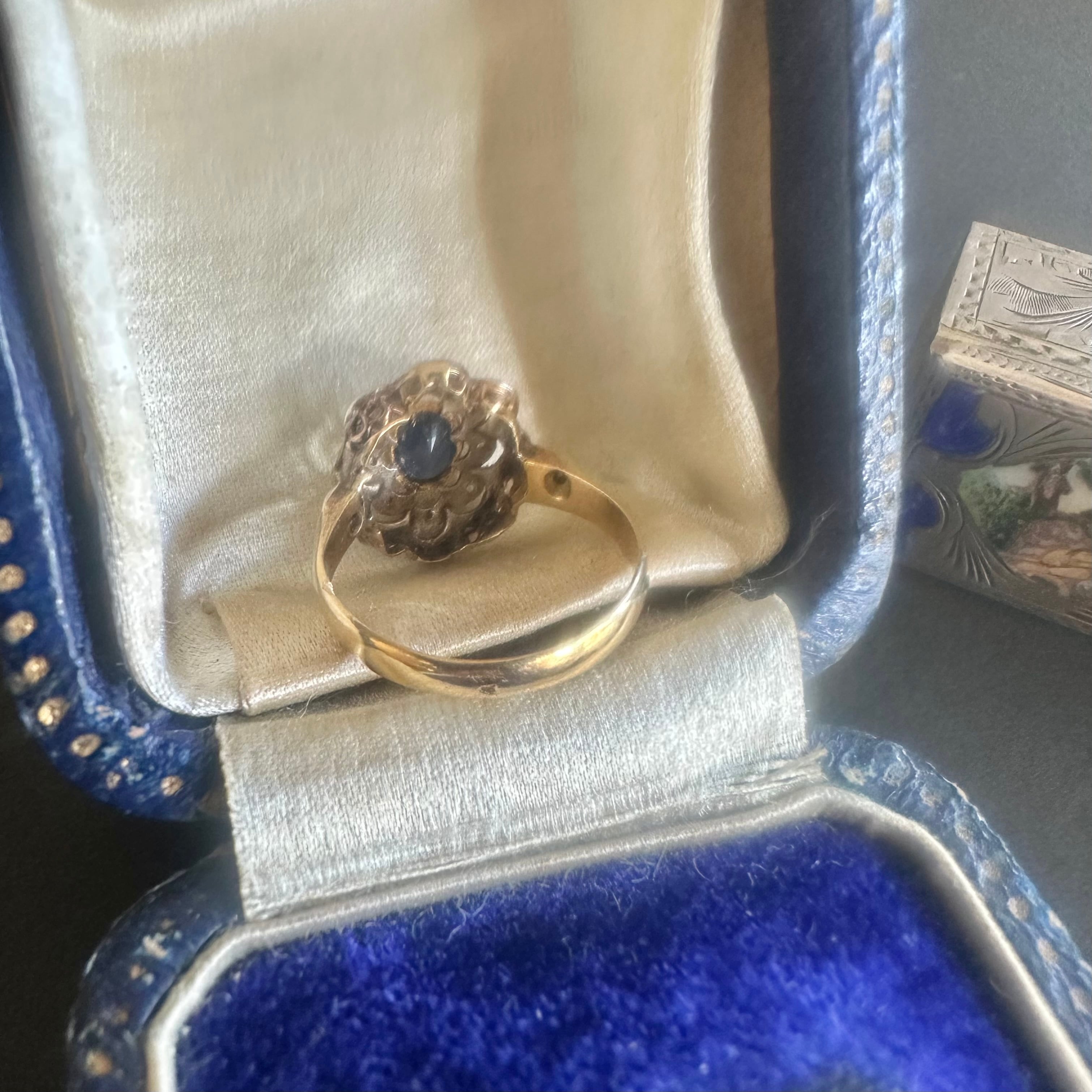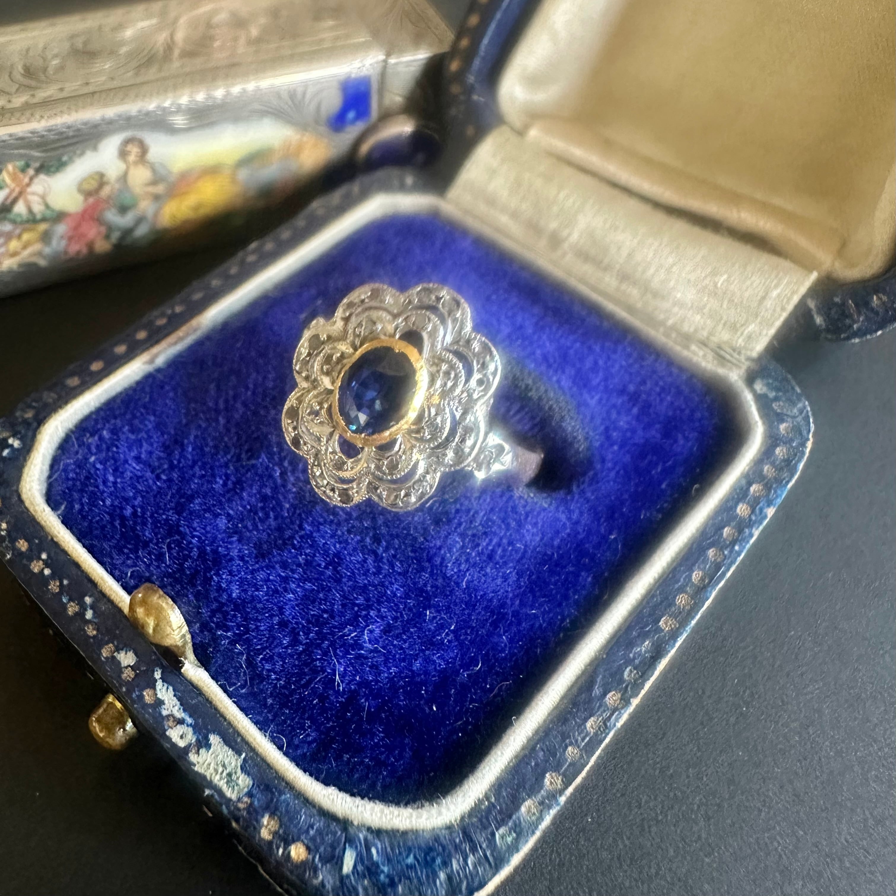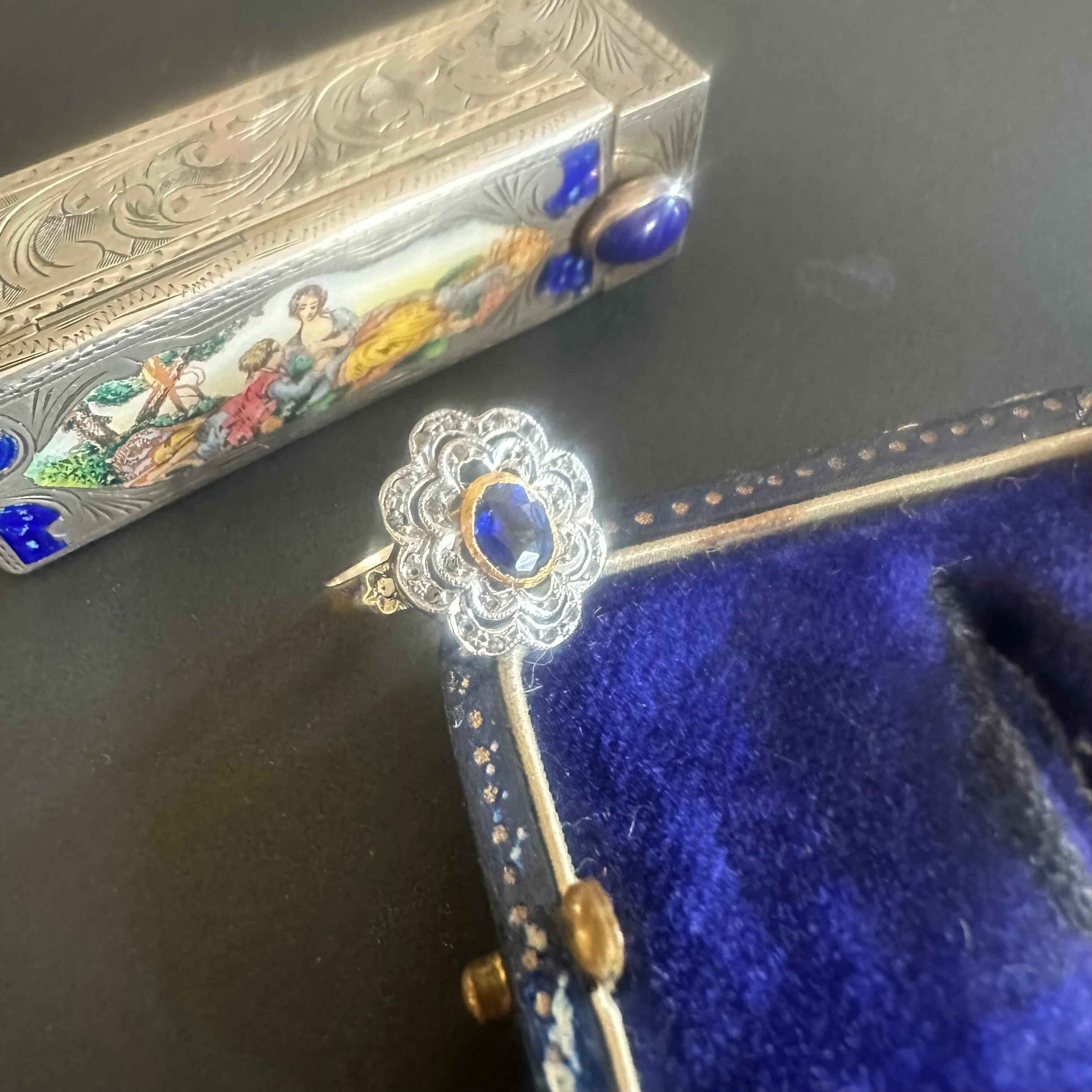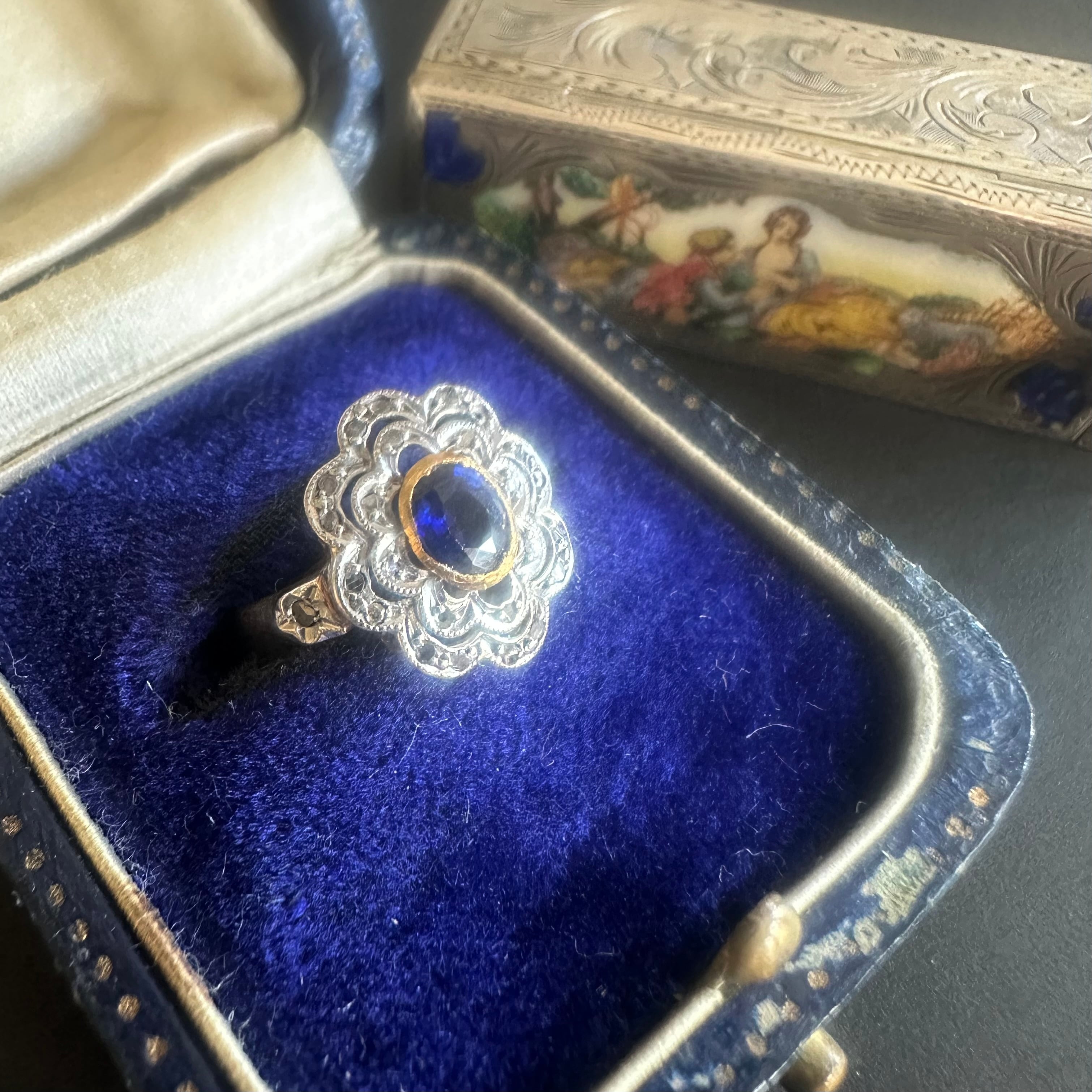 ※ 100年以上前の古いお品になりますので、経年によるアンティーク品特有の微小なスレなどルーペで見てわかる程度にございます。サファイアはルーペでのぞくと内包物はありますが、肉眼でみえるものではなく、瑞々しい輝きを楽しませてくれます。カケや目立つキズはございません。