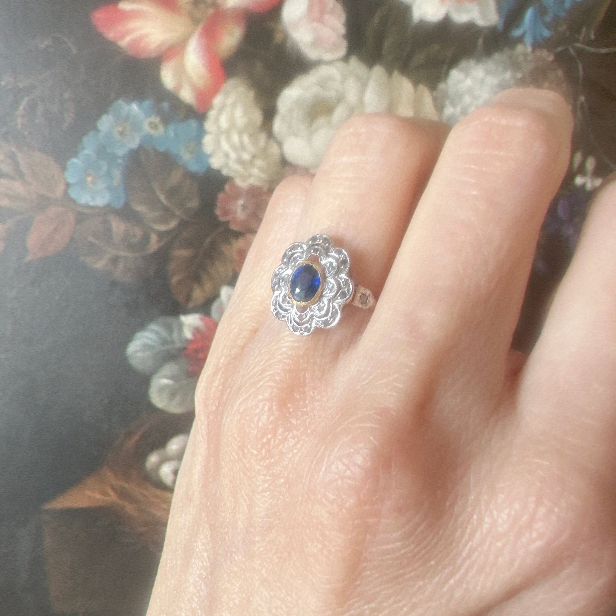 深く吸い込まれるようなロイヤルブルーのサファイアを中心に、ダイヤモンドが二重の花びらとなって取り巻く、可憐さと格調をあわせ持つクラスターリング。