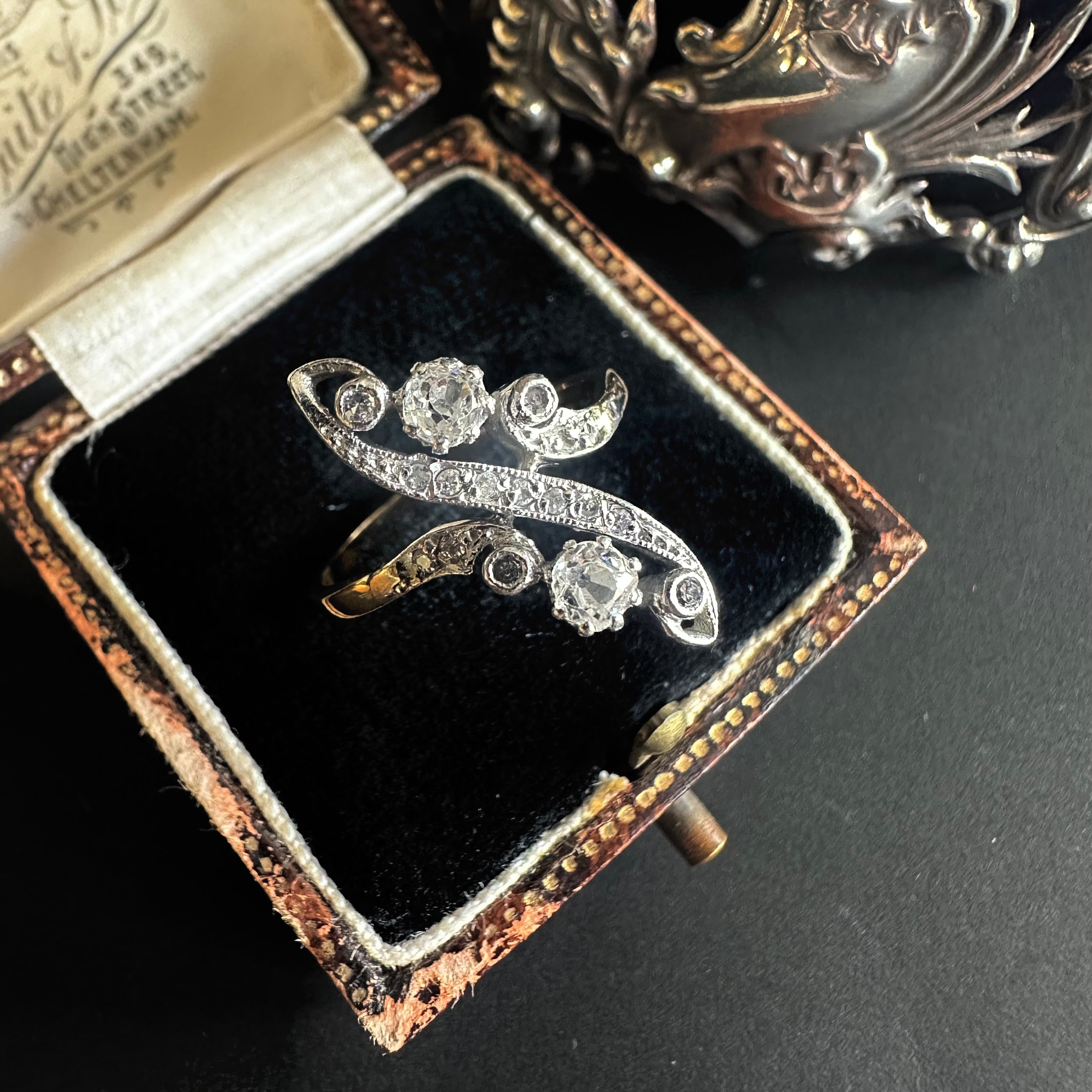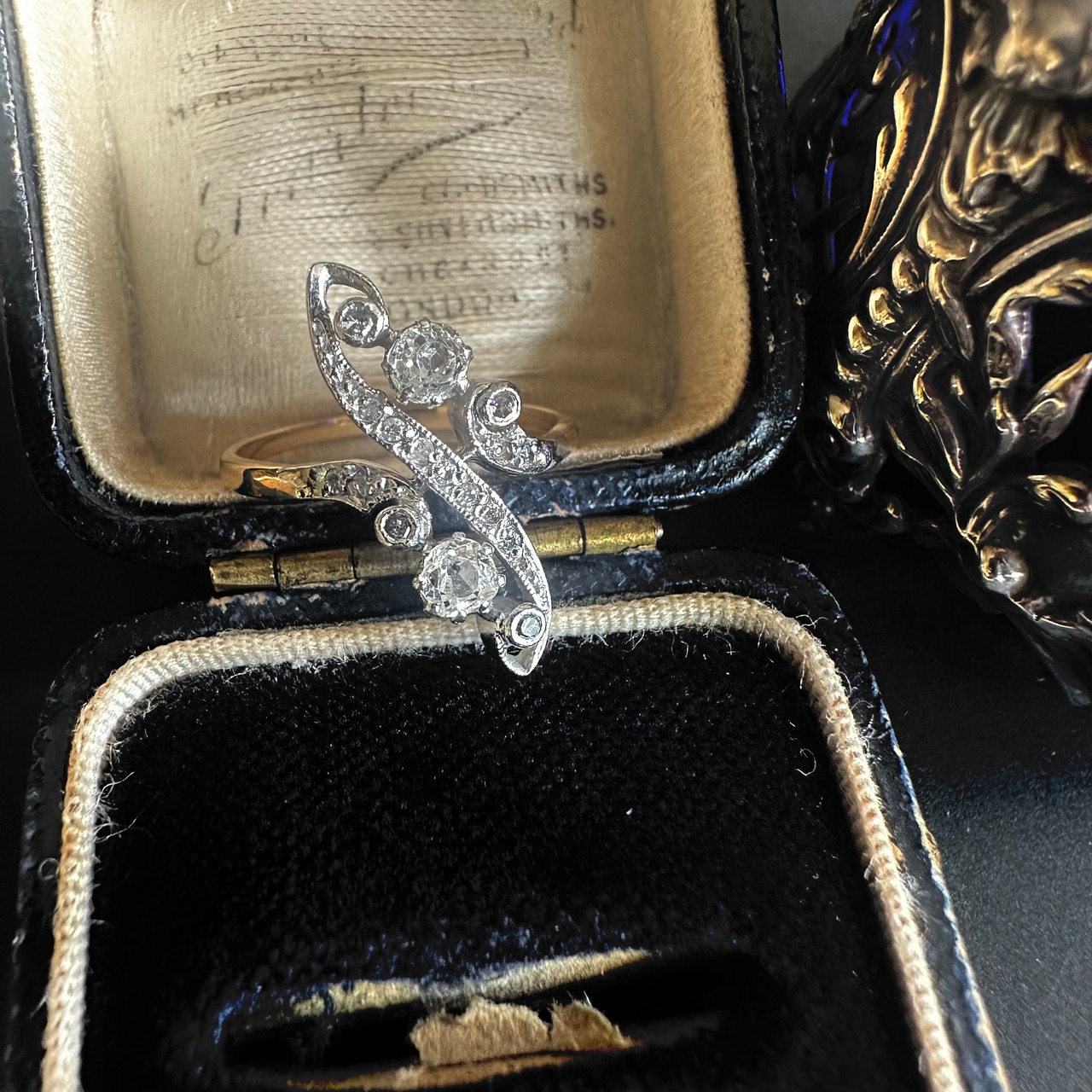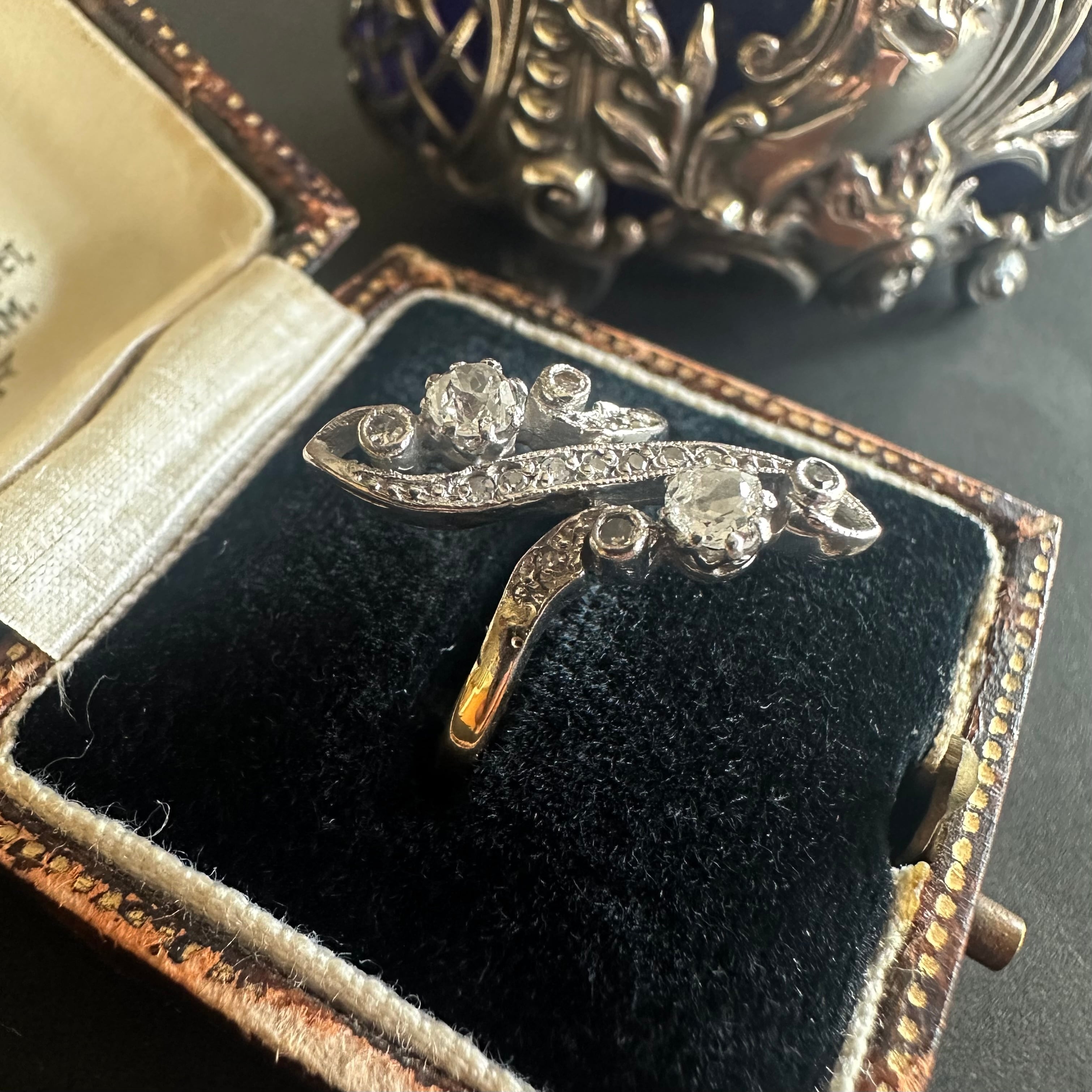 中央にセットされた2粒のオールドカットダイヤモンドは、オープンキュレットを持ち、現代のダイヤモンドとは異なる、やわらかく奥行きのある輝きを放ちます。その光はどこか朝露のように静かで、時を経た宝石ならではの穏やかな表情を感じさせます。