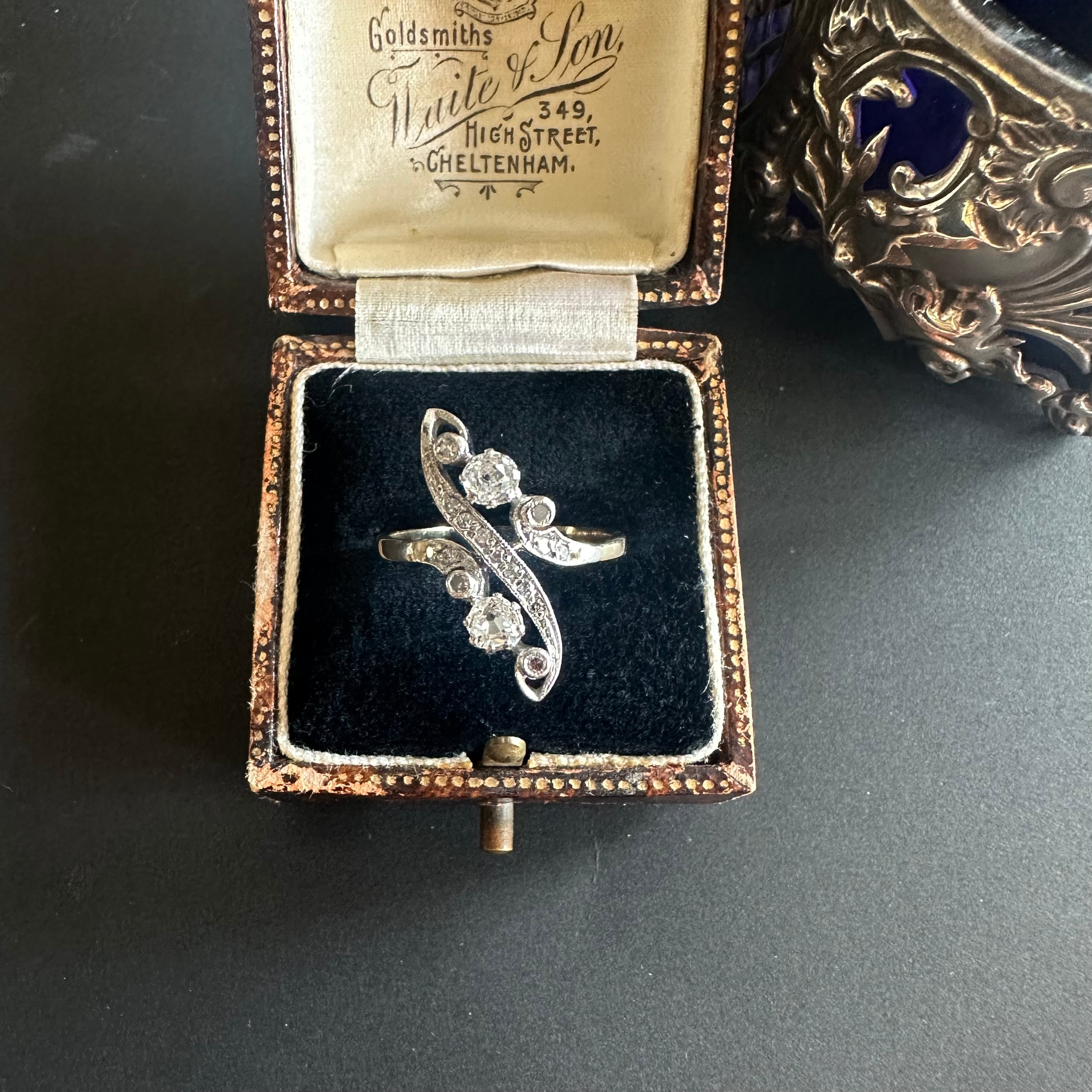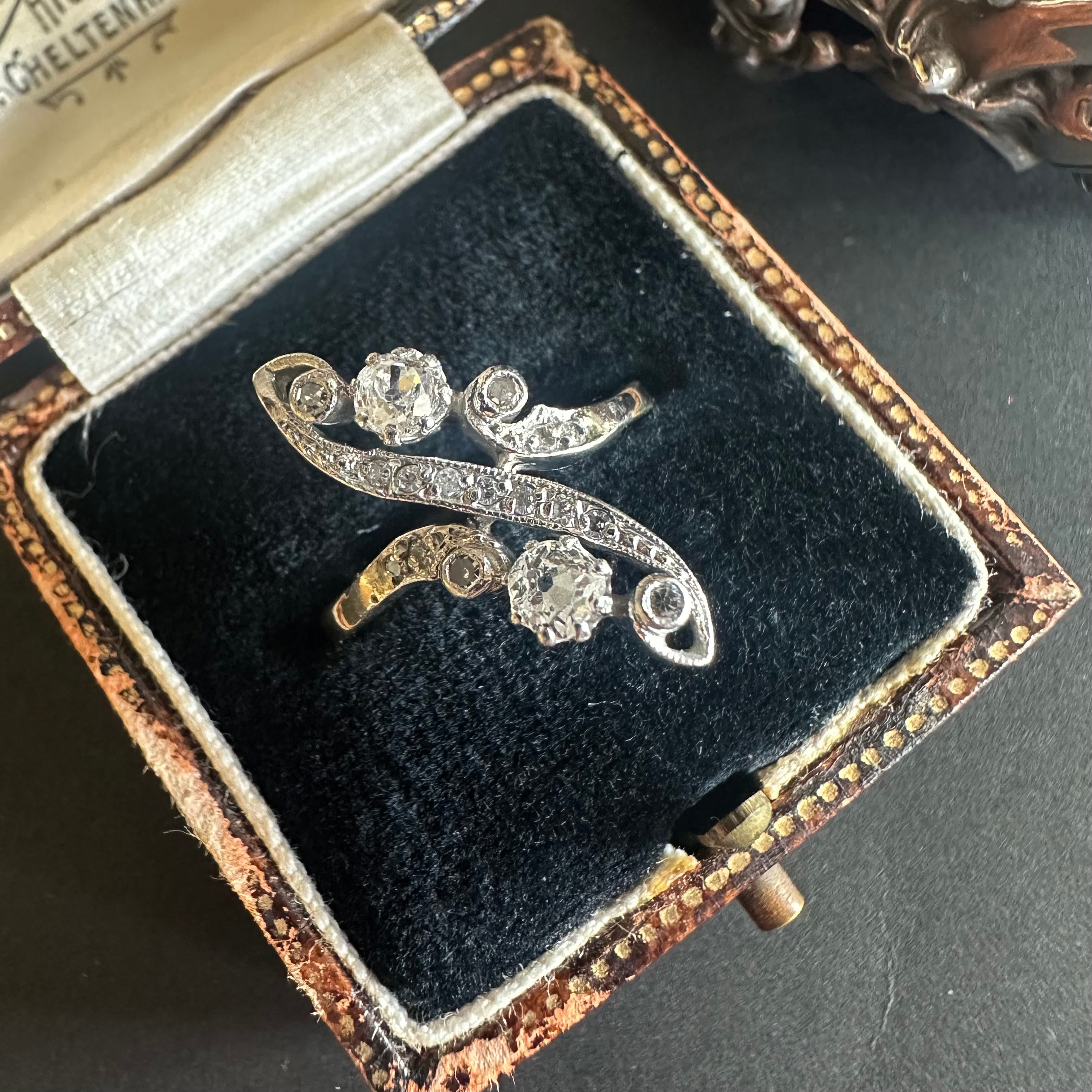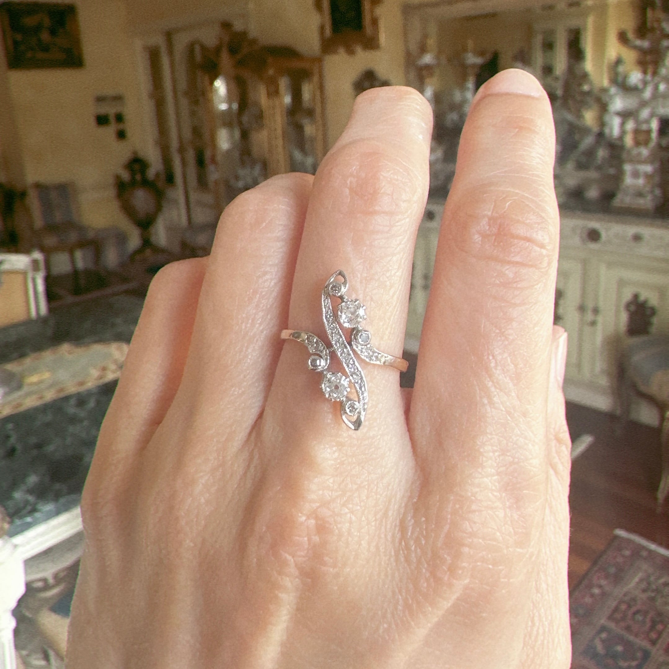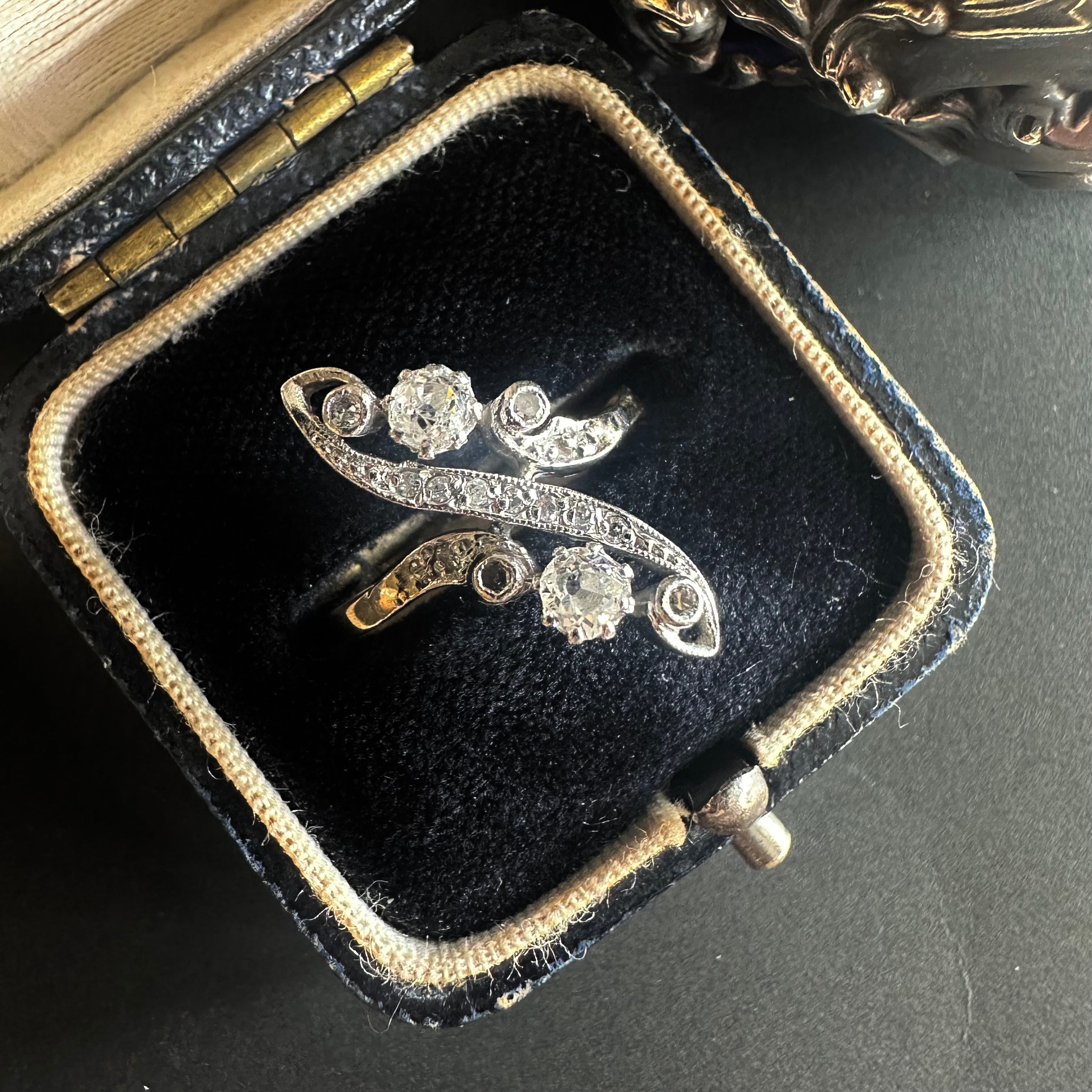 中央にセットされた2粒のオールドカットダイヤモンドは、オープンキュレットを持ち、現代のダイヤモンドとは異なる、やわらかく奥行きのある輝きを放ちます。その光はどこか朝露のように静かで、時を経た宝石ならではの穏やかな表情を感じさせます。