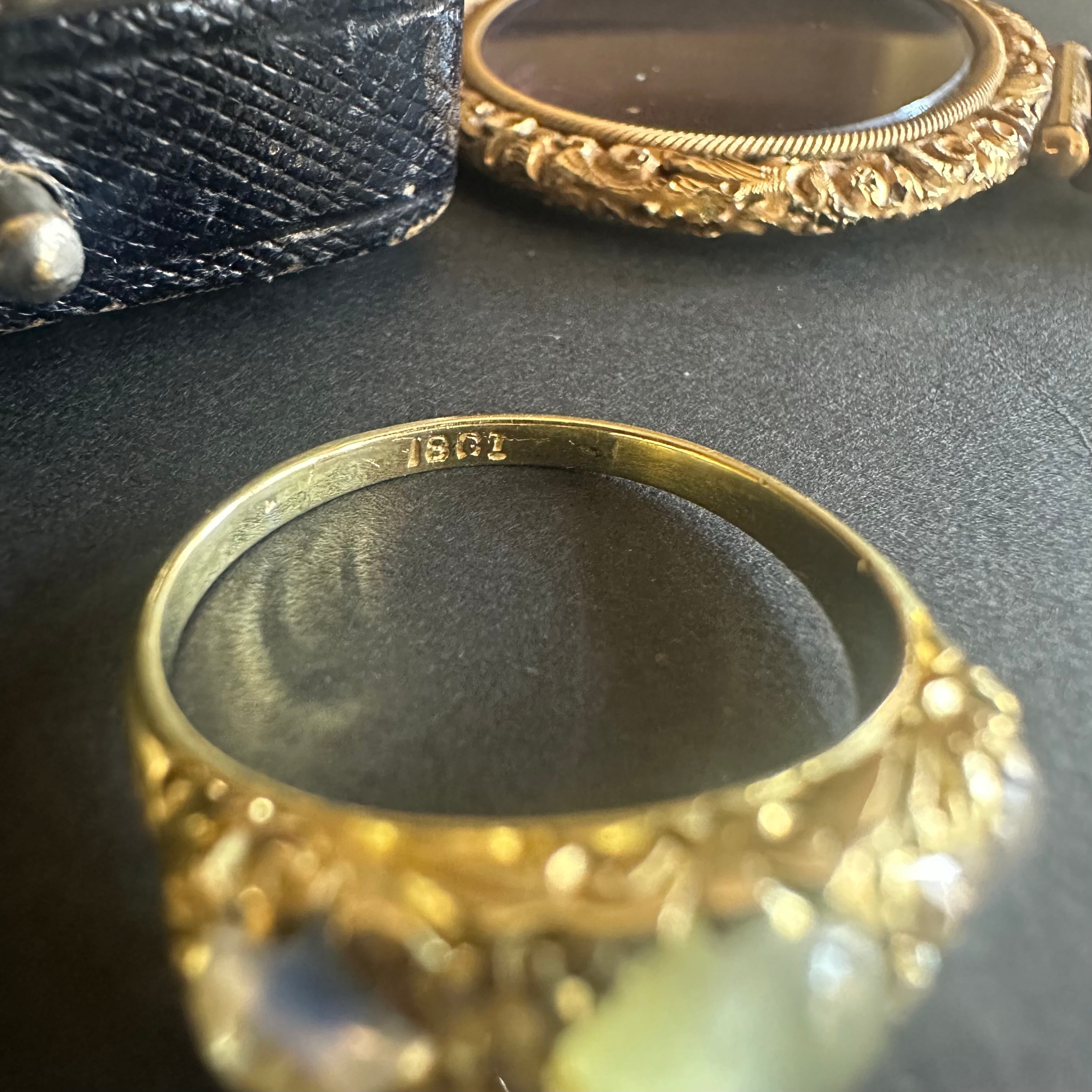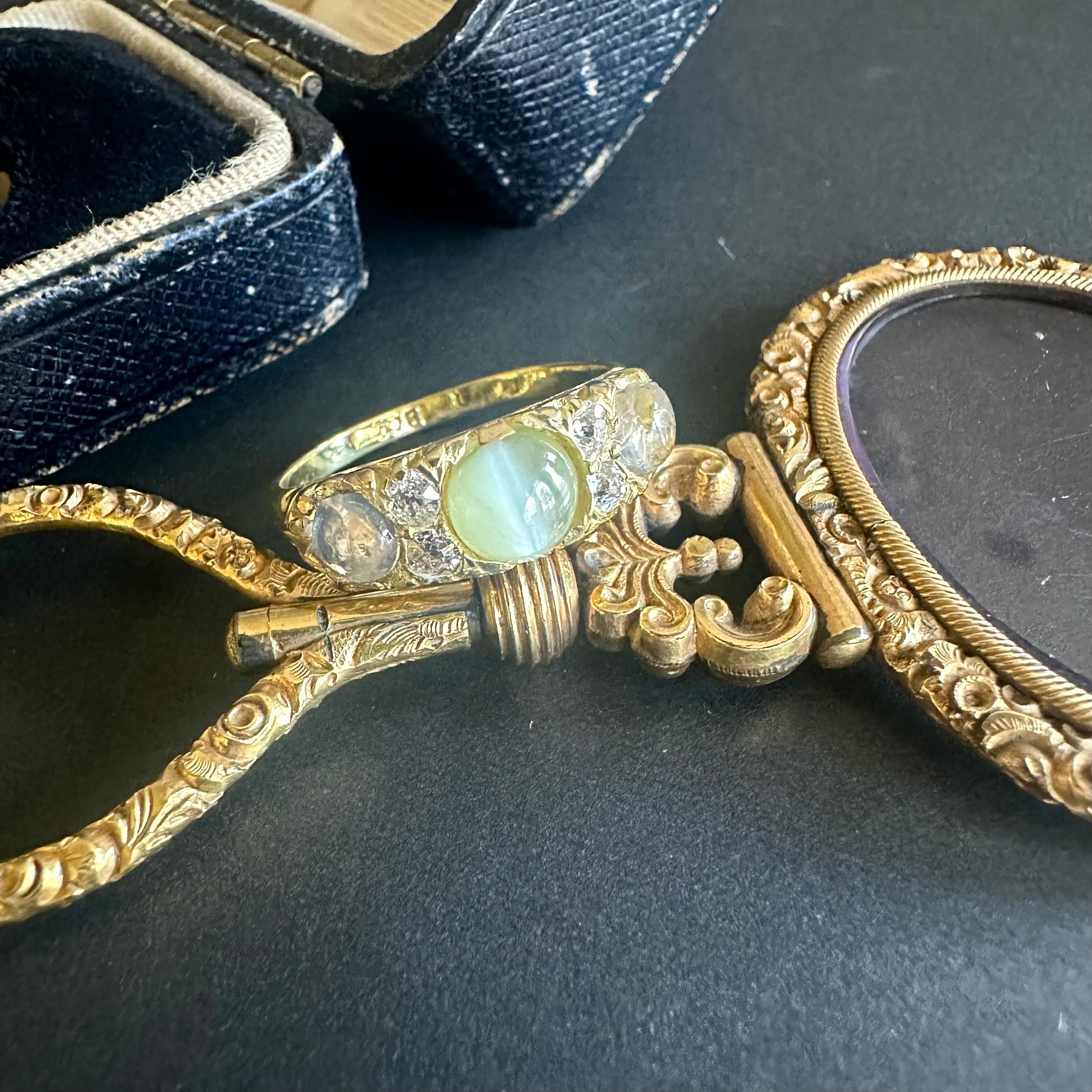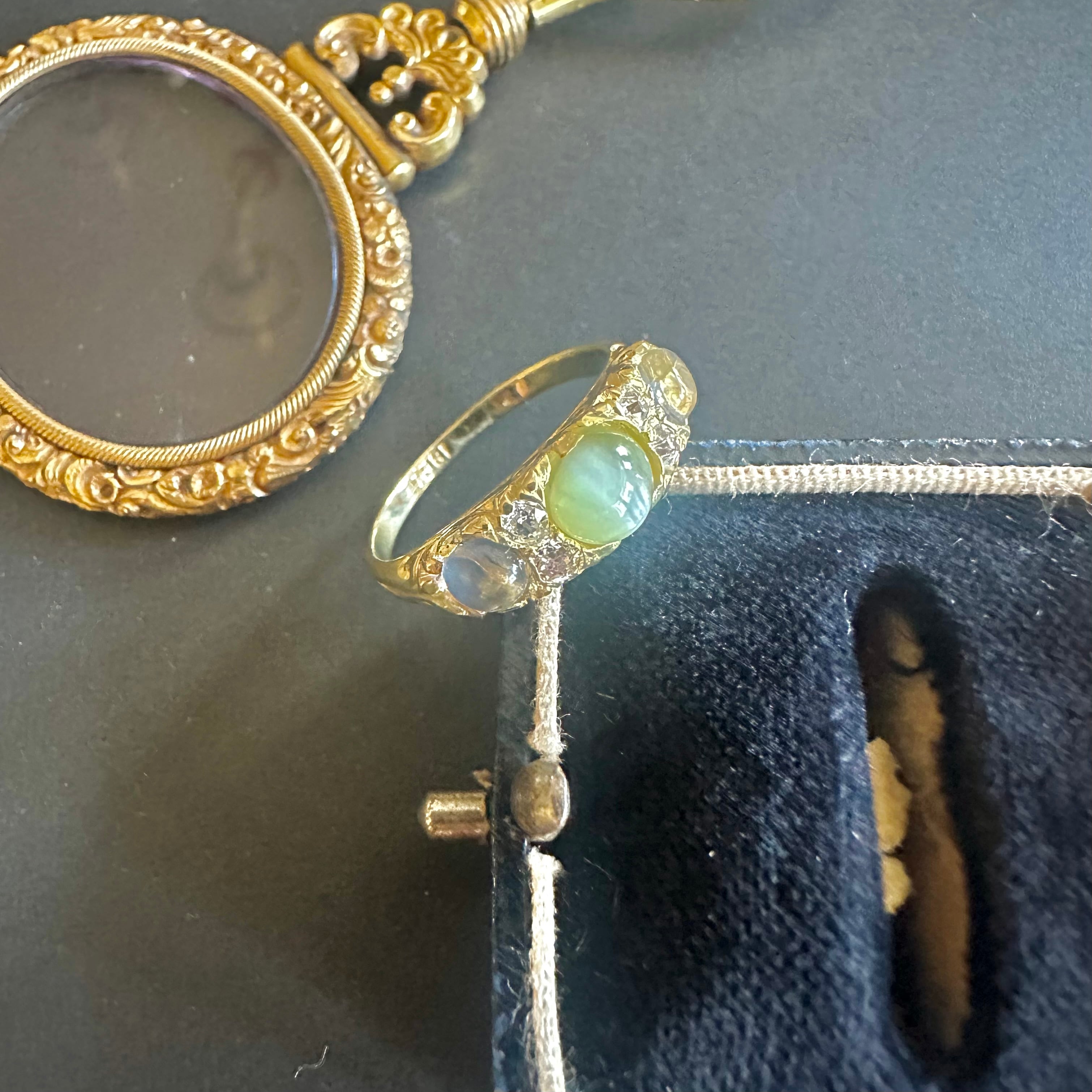 ※ 100年以上前の古いお品になりますので、経年によるアンティーク品特有の微小なスレなどルーペで見てわかる程度にございます。石は内包物はありますが、肉眼で気になるものではなく、内に秘めた輝きを楽しませてくれます。カケや目立つキズはございません。