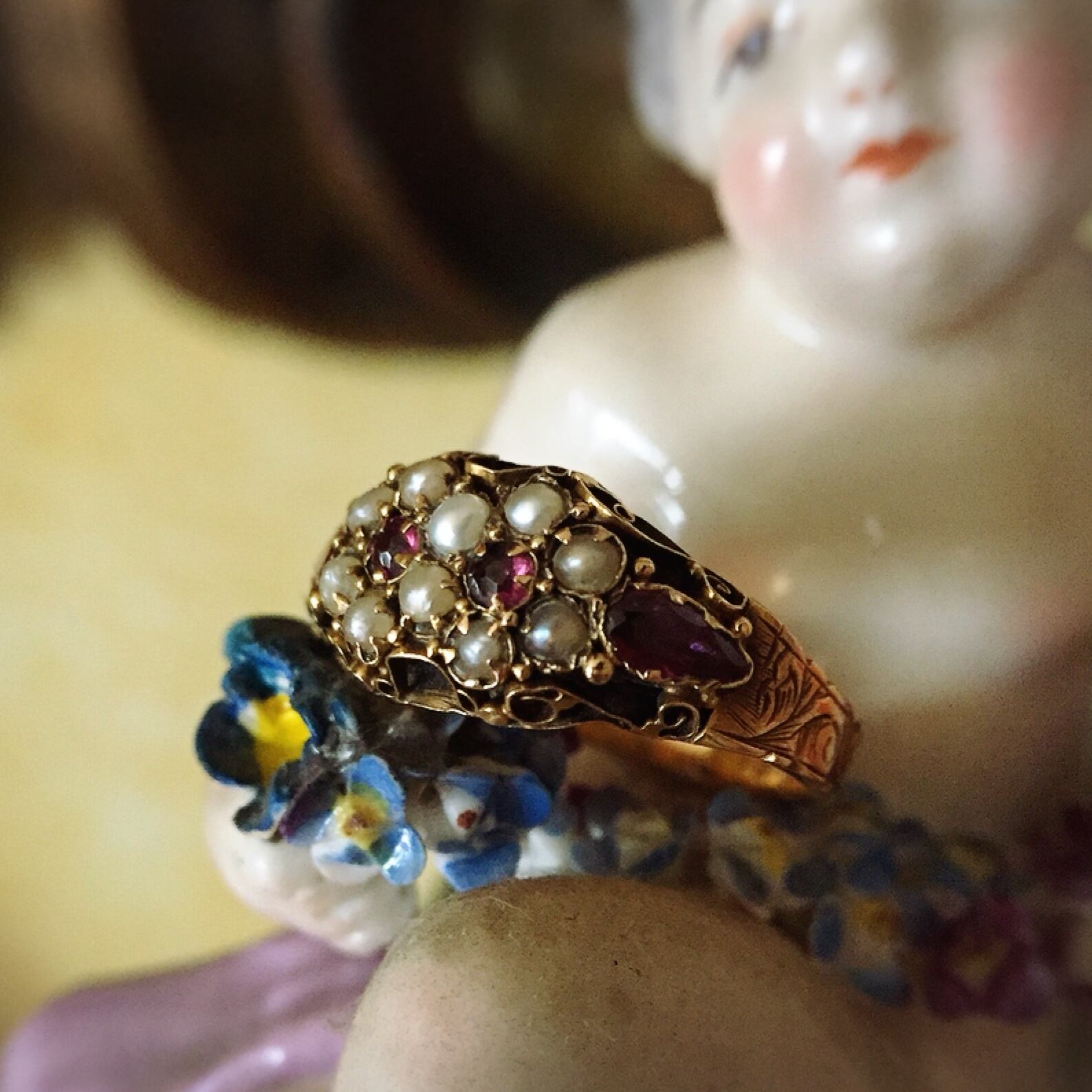 両脇のショルダー部分と花芯にはパープルピンク色した透明感のあるロードライトガーネットがセットされ、ほんの少し大きさと一粒一粒の色味のグラデーションが若干のみ違うシードパールにアンティーク特有の温かみと落ち着きを感じます。