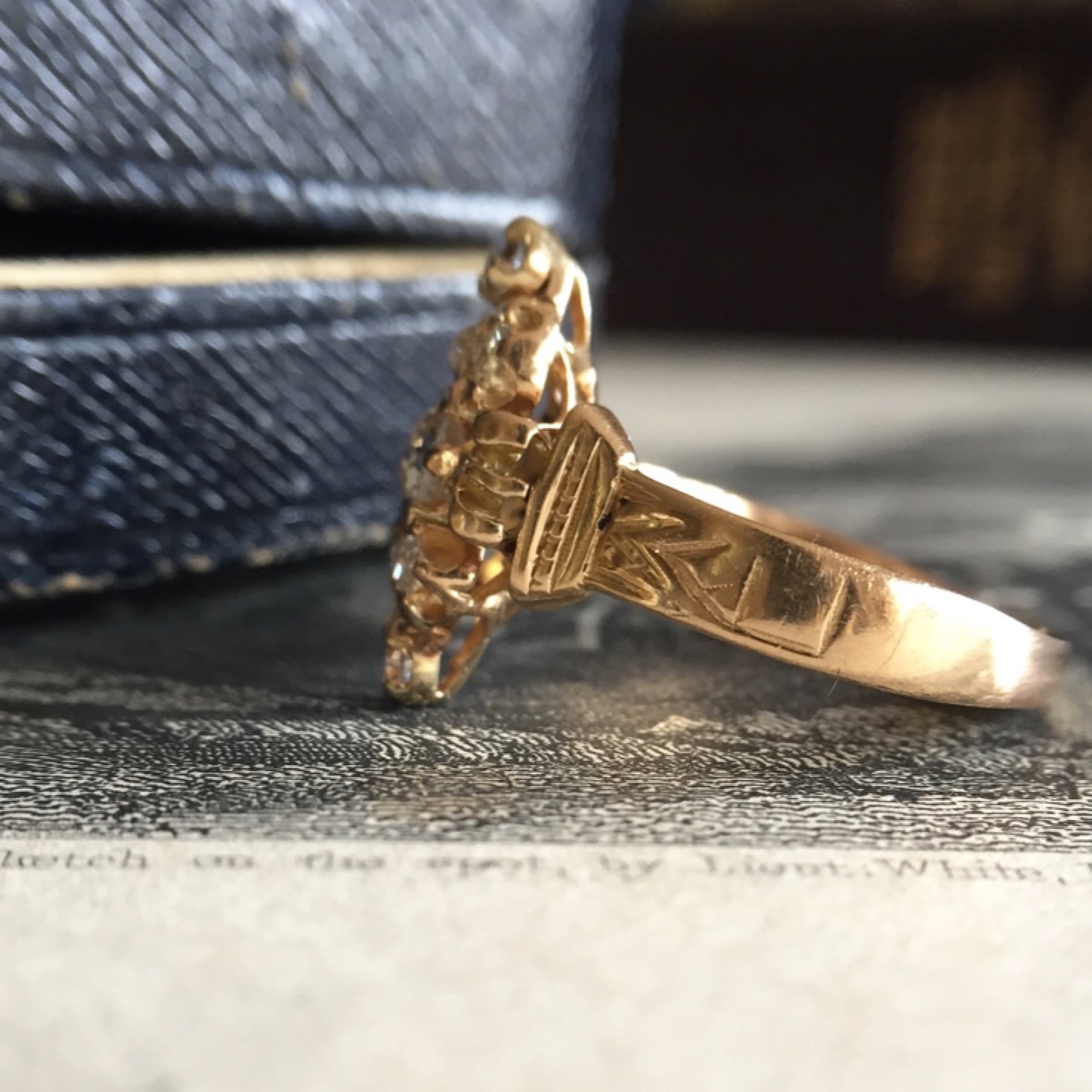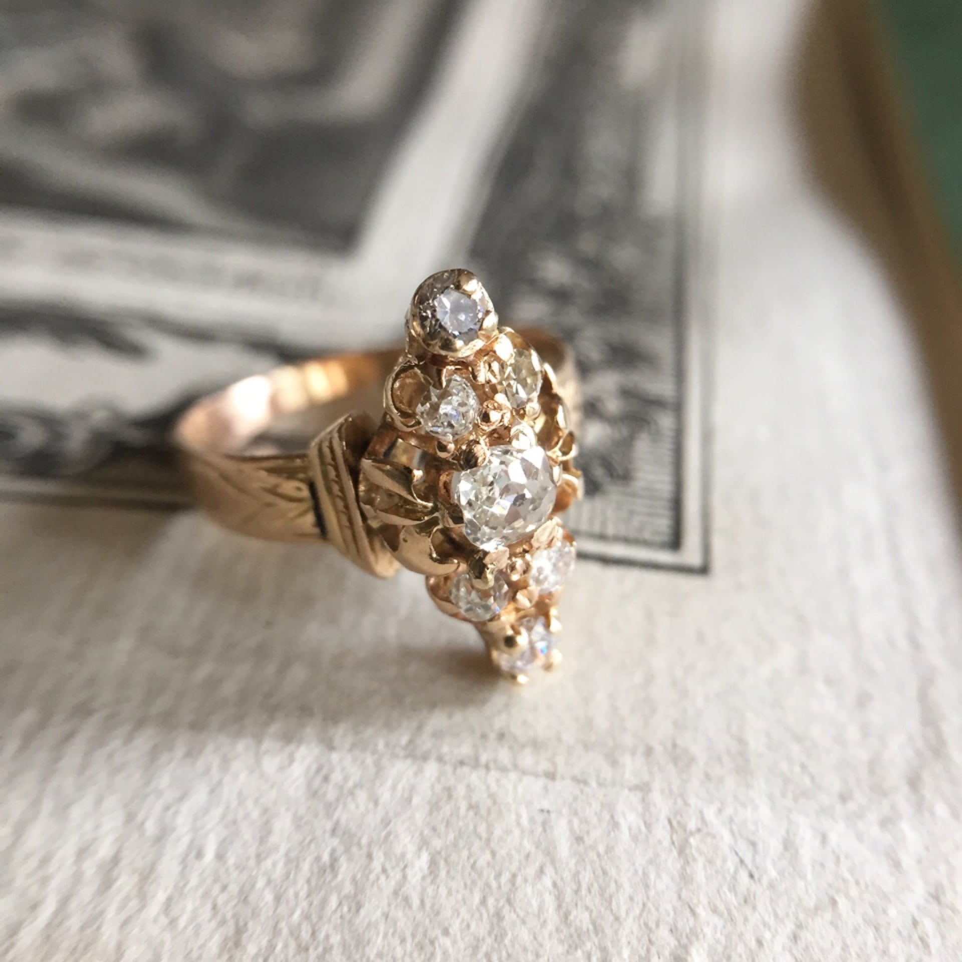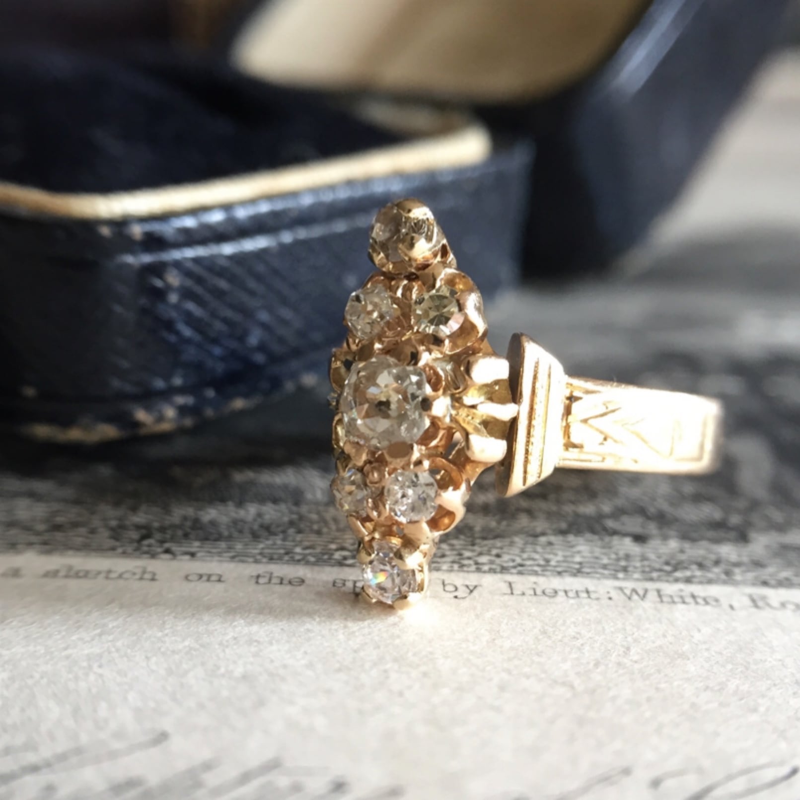 中心に透明度の高いオールドマインカットダイヤモンドと、その上下に3粒づつセットされたオールドヨーロピアンカットダイヤモンドがK14イエローゴールドのボートシェイプ、または少しオリジナルなマーキースシェイプのような台座に敷き詰められた19世紀後半のリングです。
